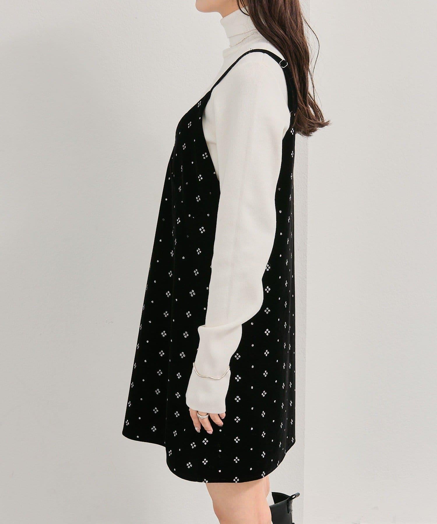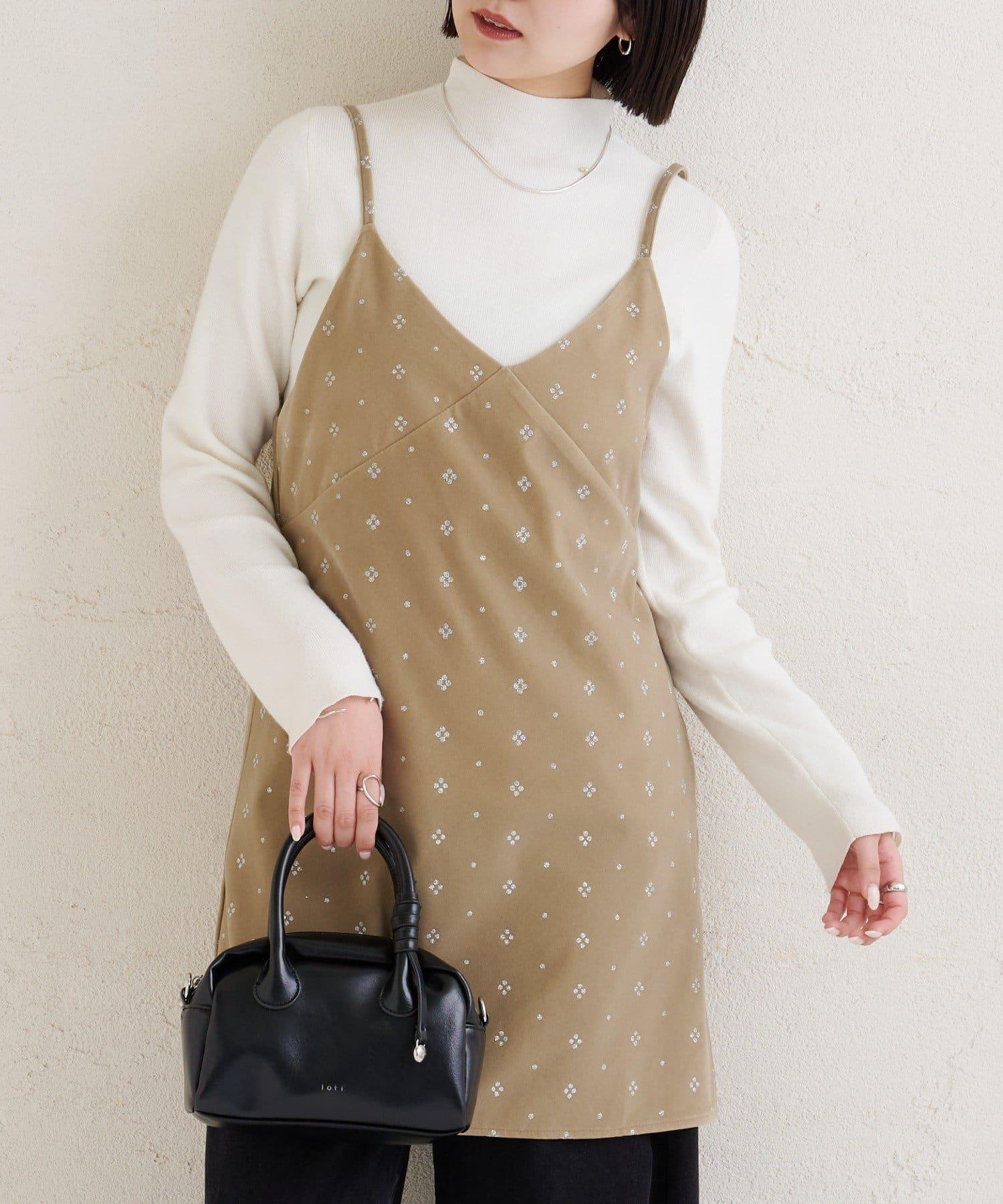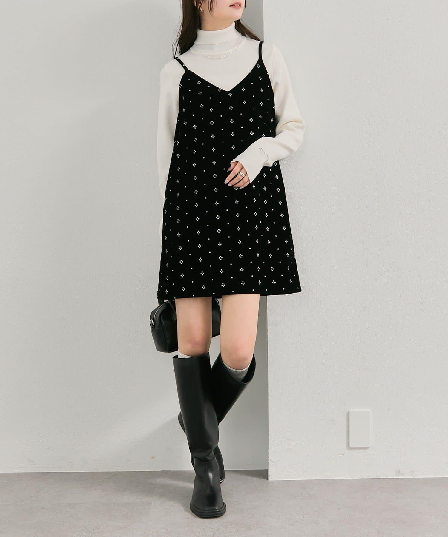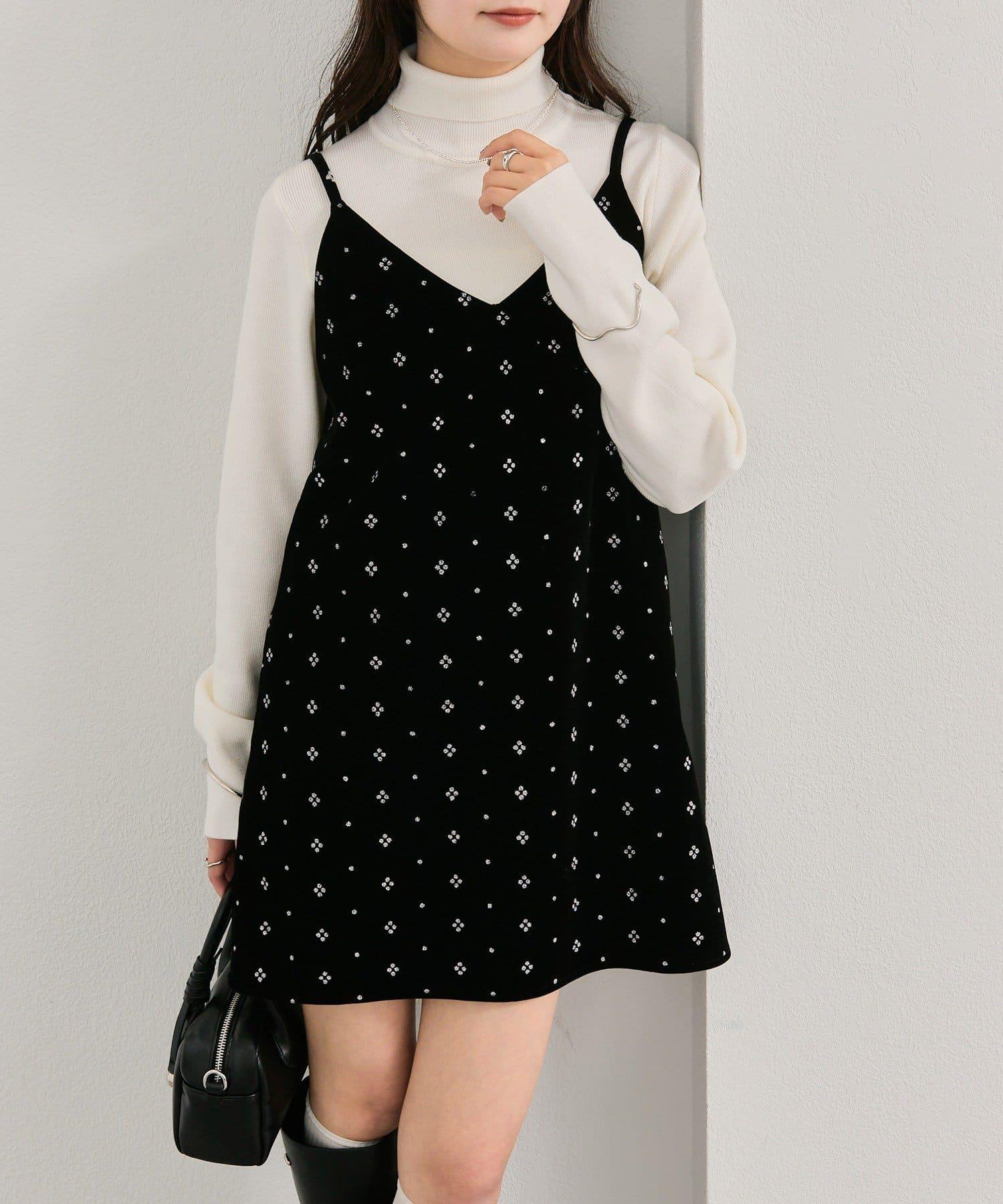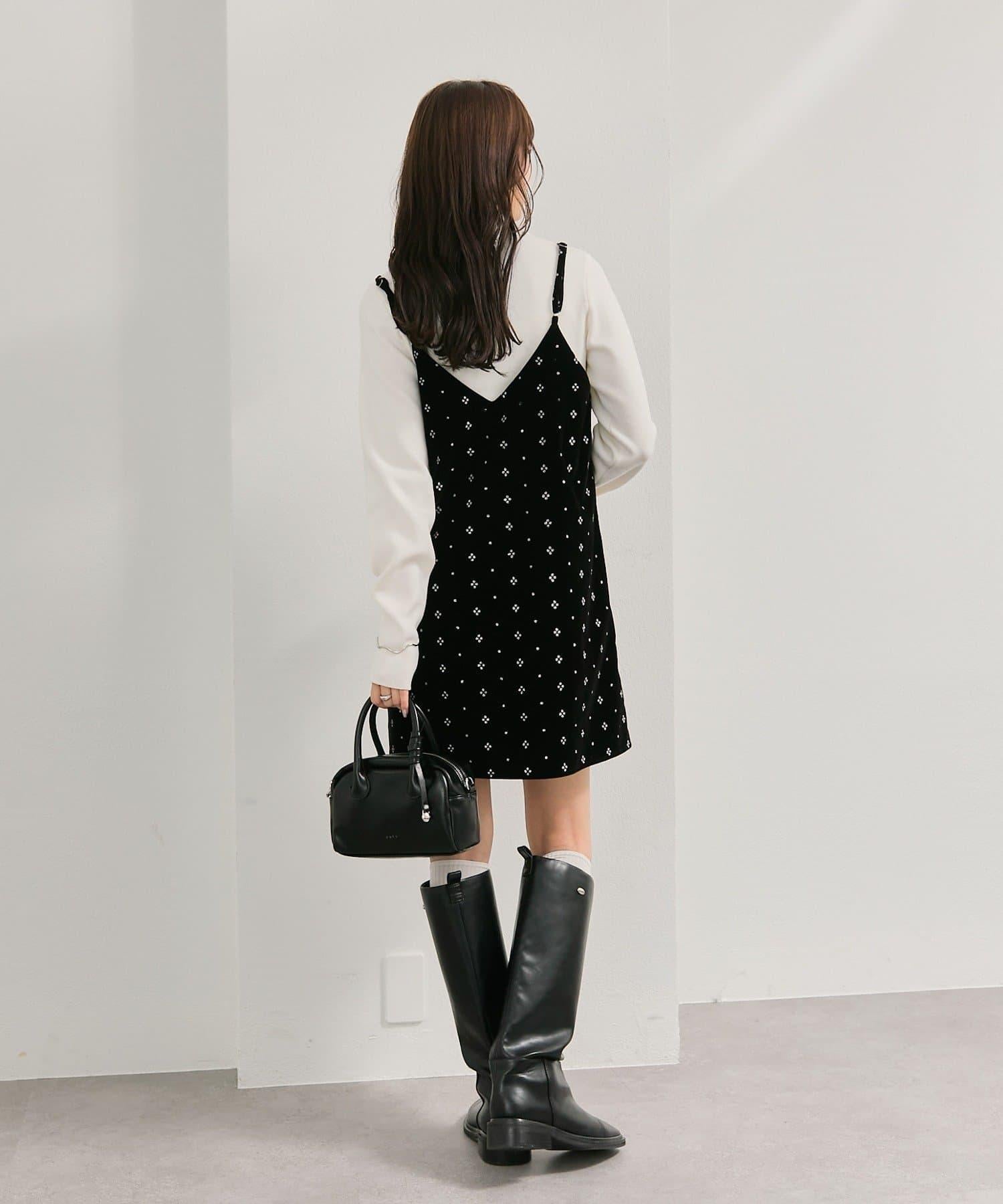 這款迷你吊帶連衣裙由天鵝絨製成,上面散佈著細小的薄片,在光線下反射出微妙的光芒。