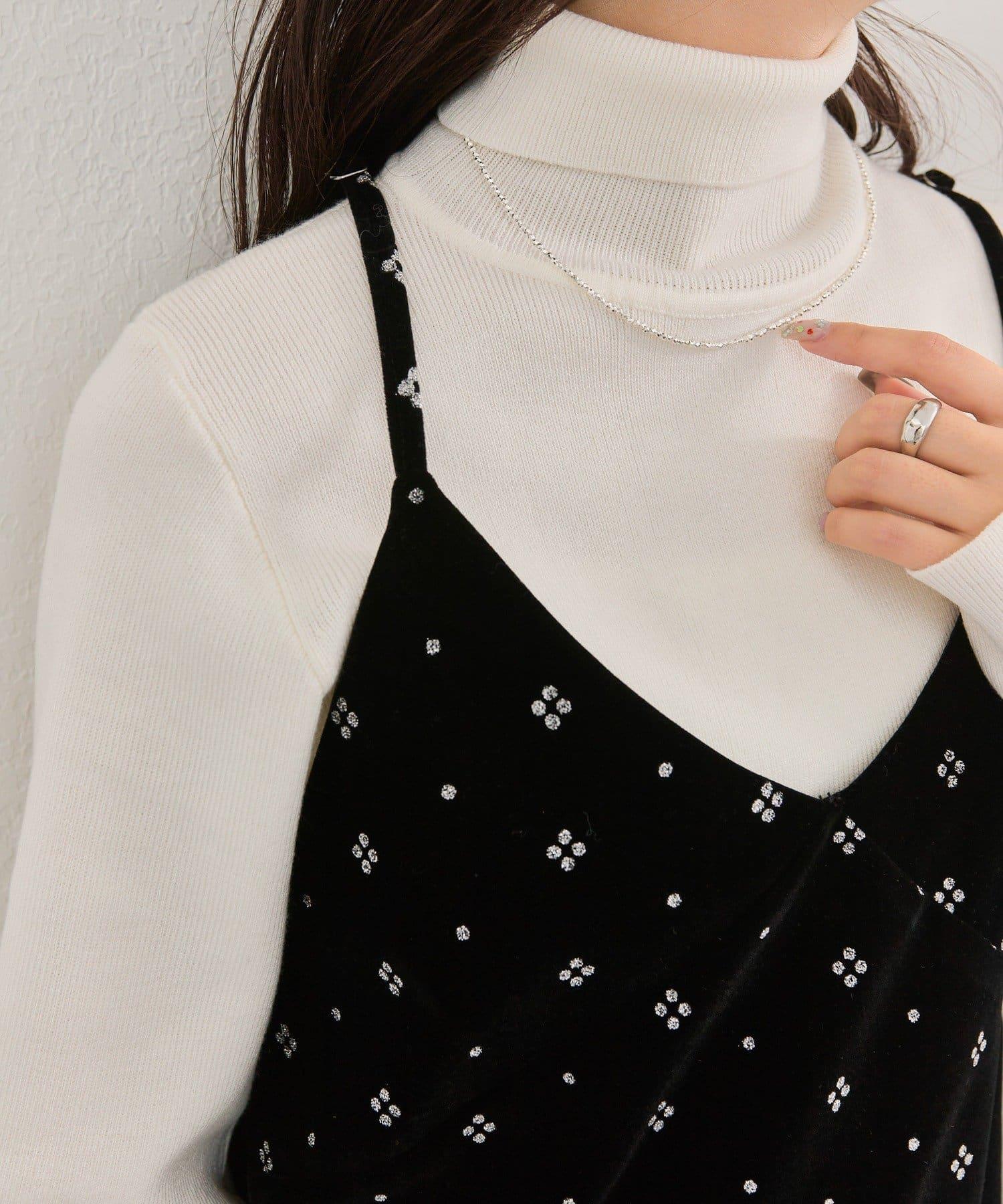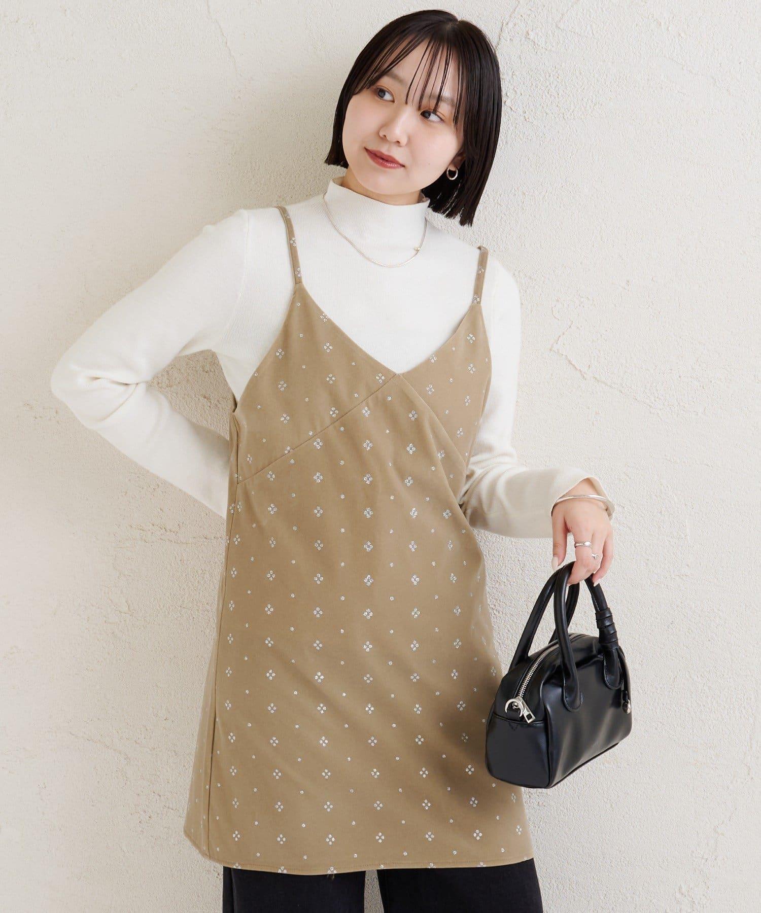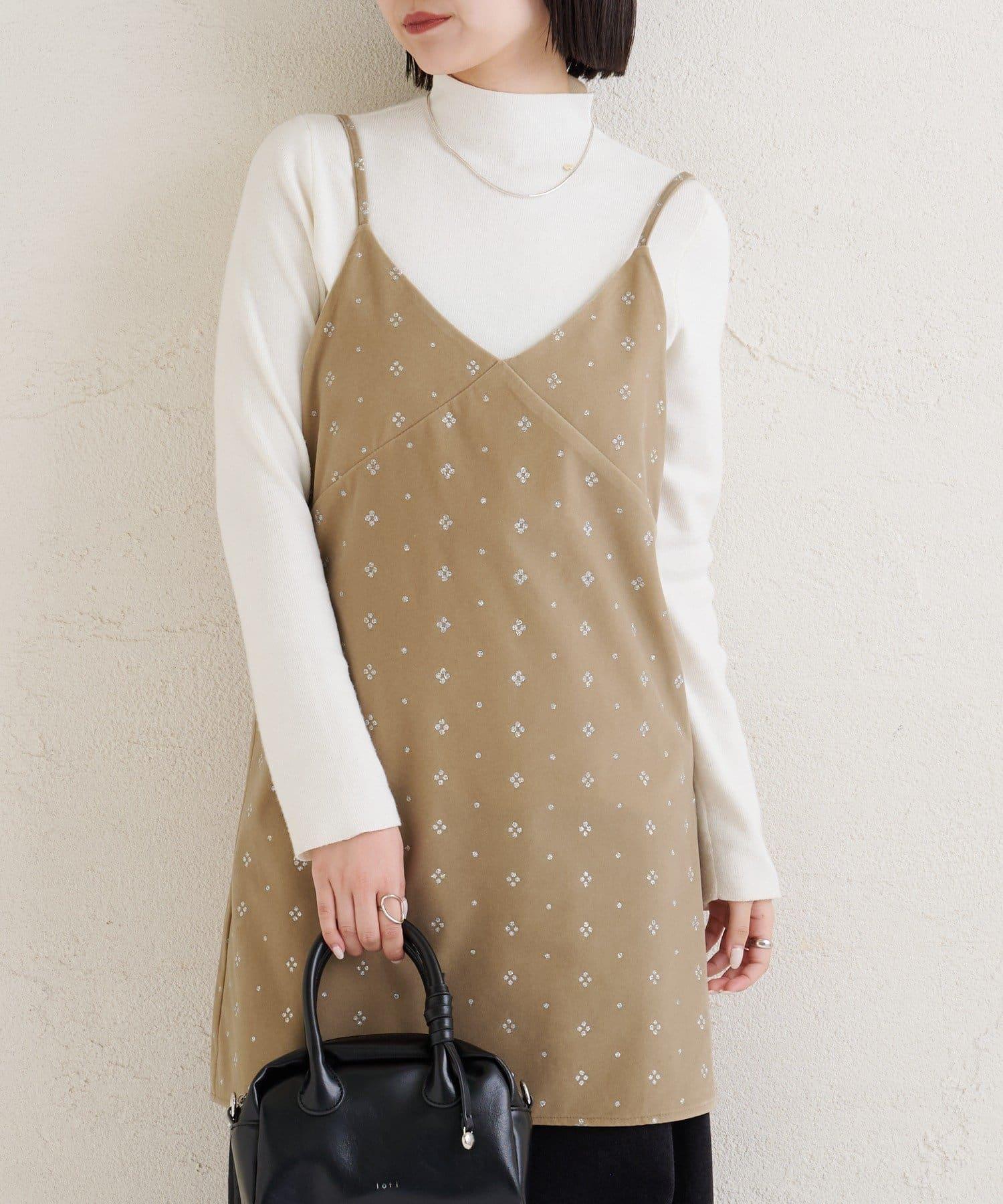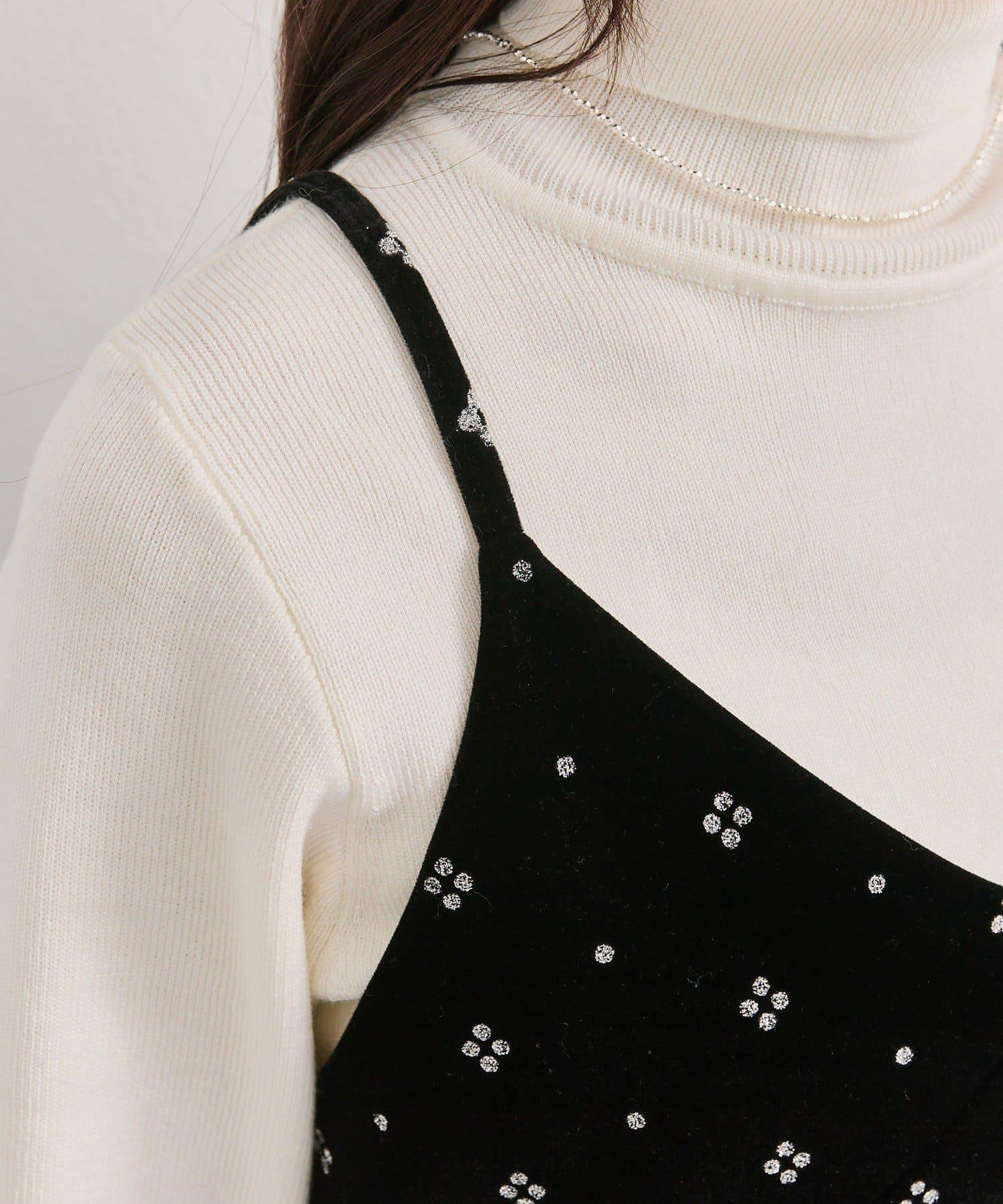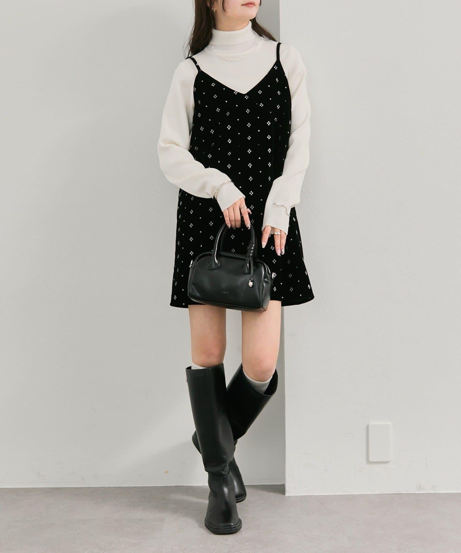 這款迷你吊帶連衣裙由天鵝絨製成,上面散佈著細小的薄片,在光線下反射出微妙的光芒。