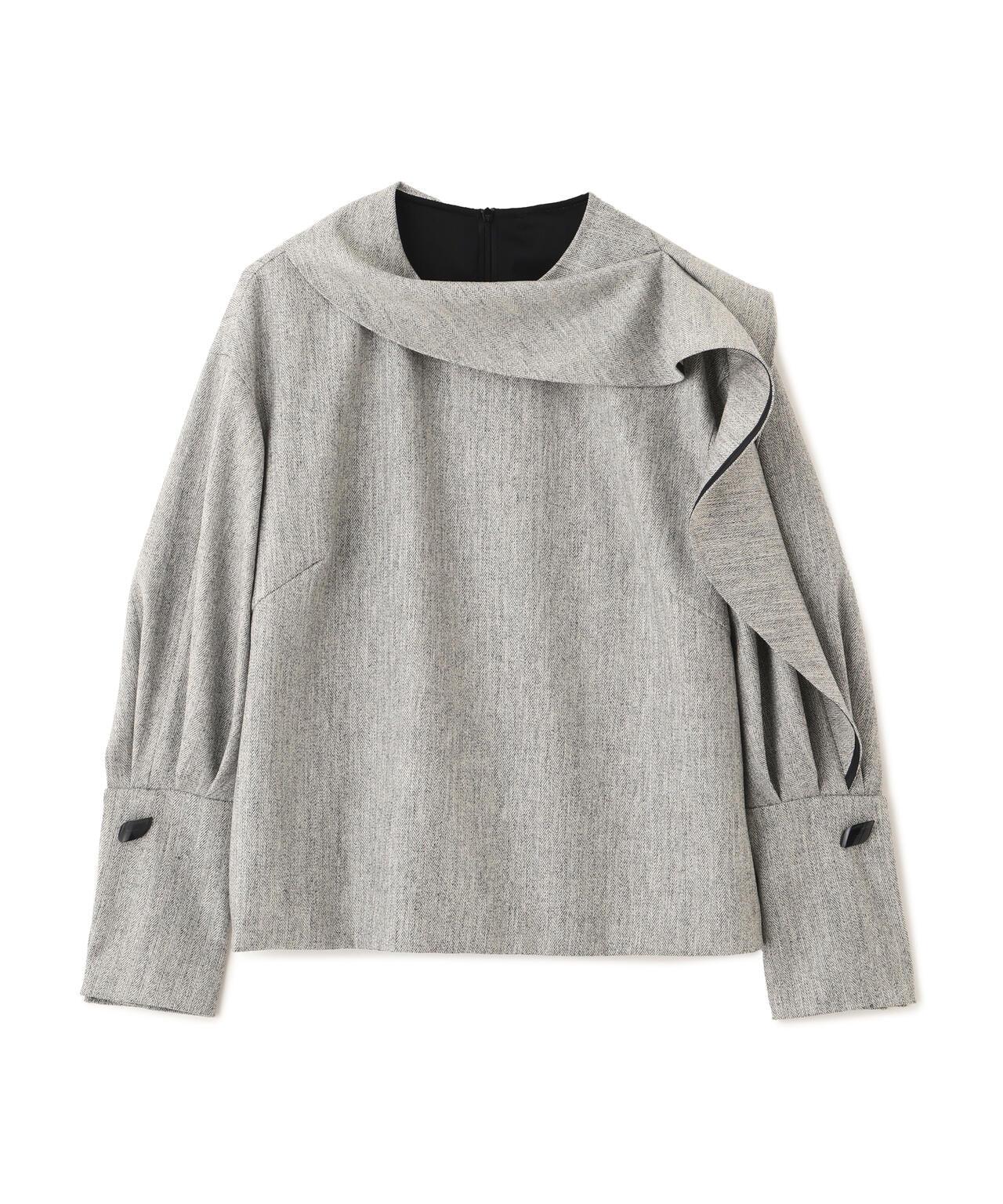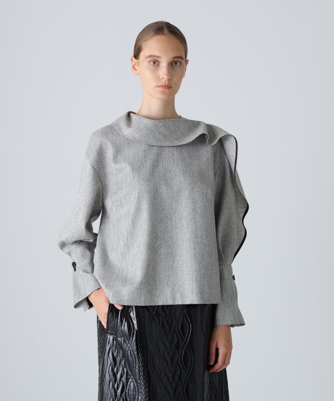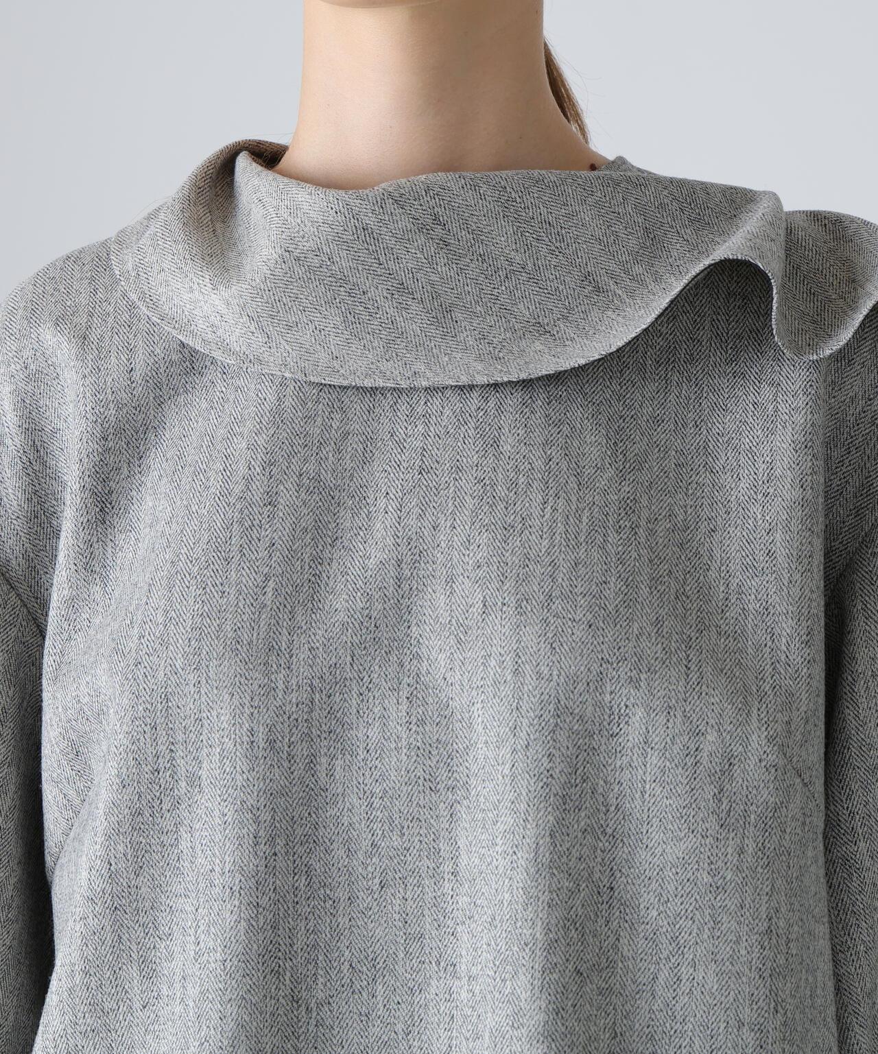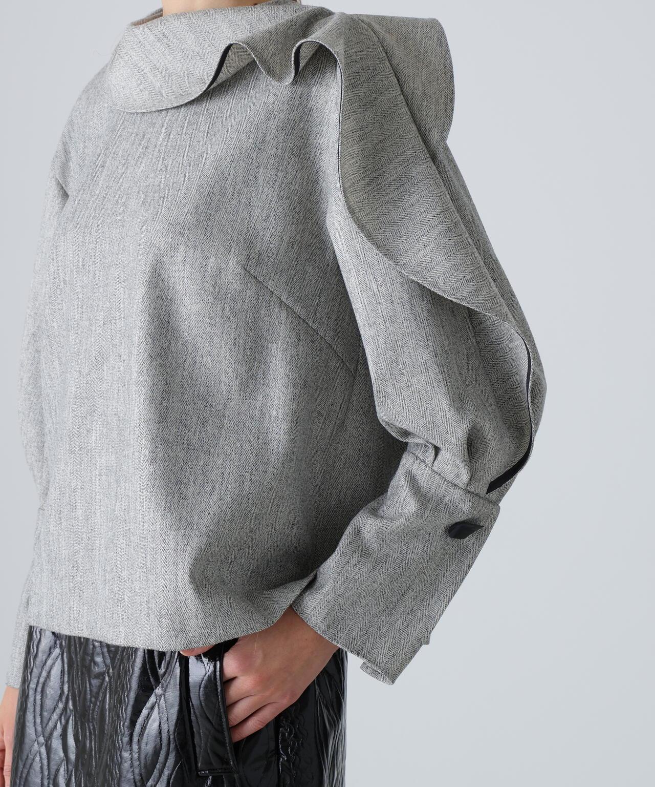 華麗的人字形上衣此款上衣採用不對稱設計,領口卷邊,一側袖子採用荷葉邊設計,使臉部顯得華麗。與同類設計的後背緞面喬其紗上衣(貨號:531-5210126)不同,它可以穿出略帶休閒的氛圍。採用人字形結構的輕薄斜紋軟呢面料,使用羊毛,但與聚酯纖維交織在一起,因此不會變得厚重。