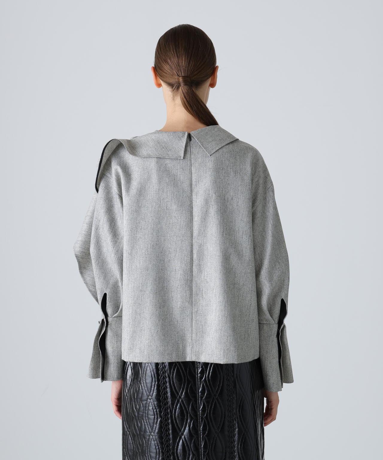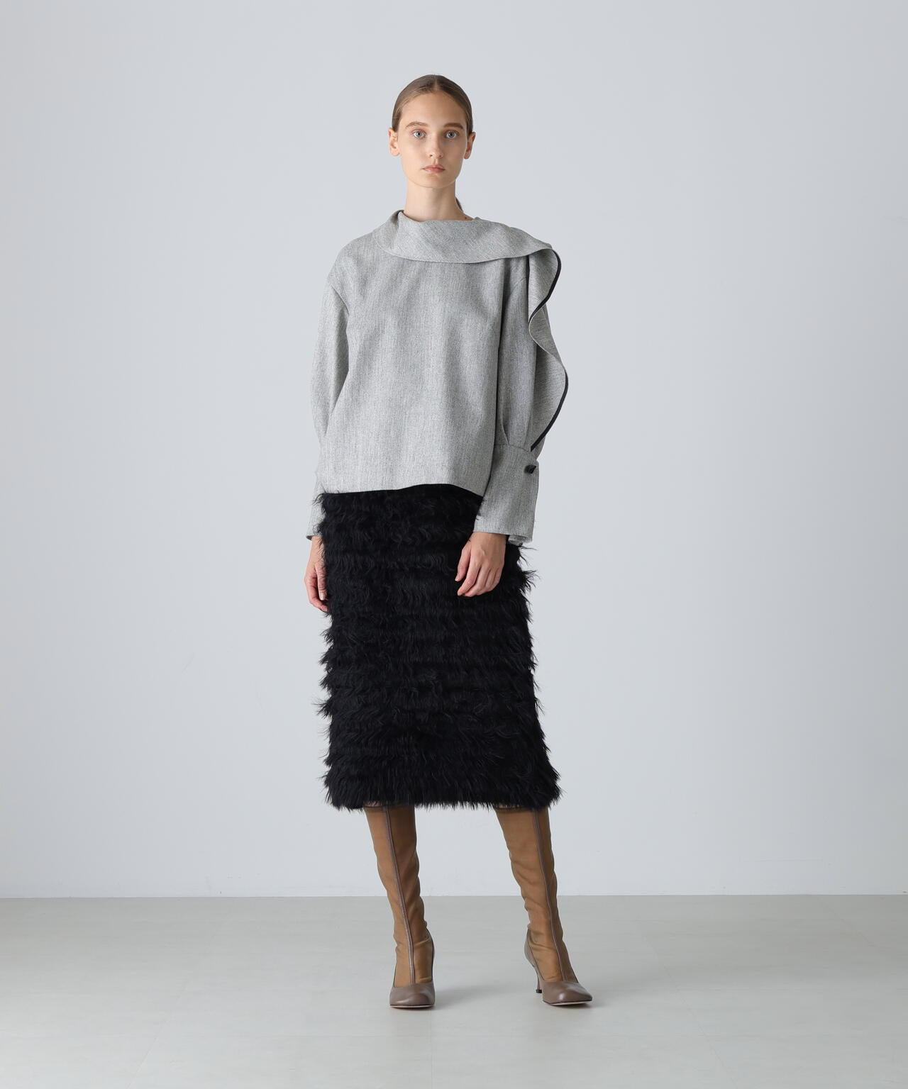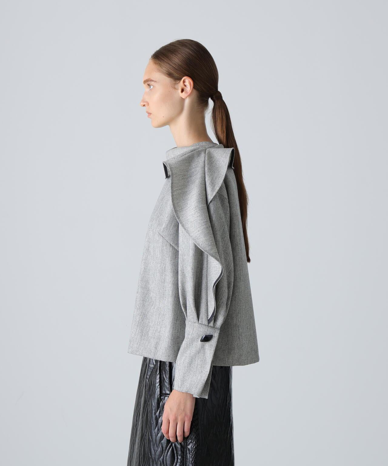 華麗的人字形上衣此款上衣採用不對稱設計,領口卷邊,一側袖子採用荷葉邊設計,使臉部顯得華麗。與同類設計的後背緞面喬其紗上衣(貨號:531-5210126)不同,它可以穿出略帶休閒的氛圍。採用人字形結構的輕薄斜紋軟呢面料,使用羊毛,但與聚酯纖維交織在一起,因此不會變得厚重。