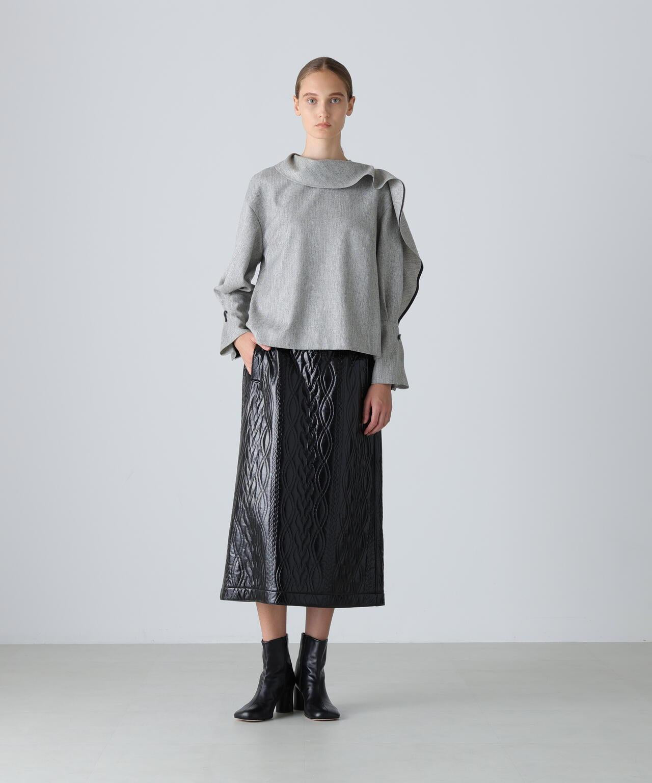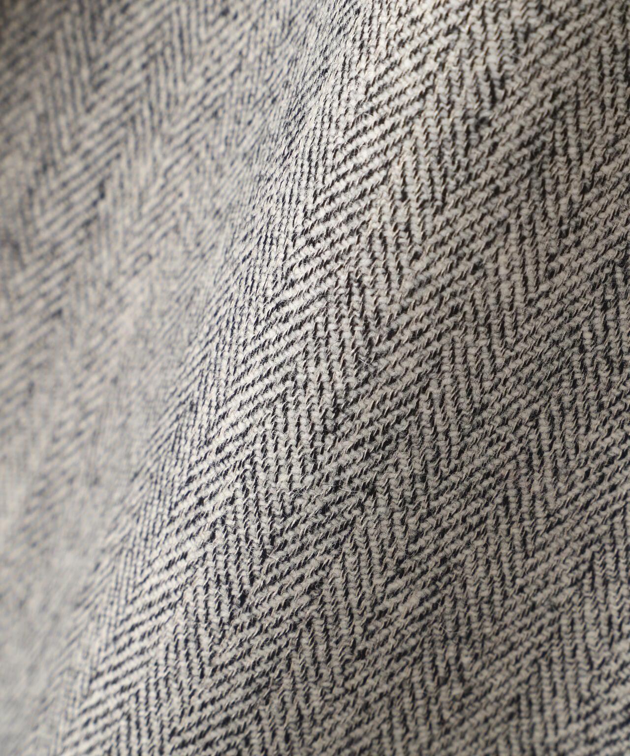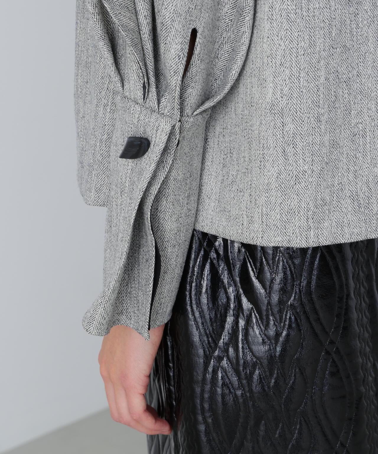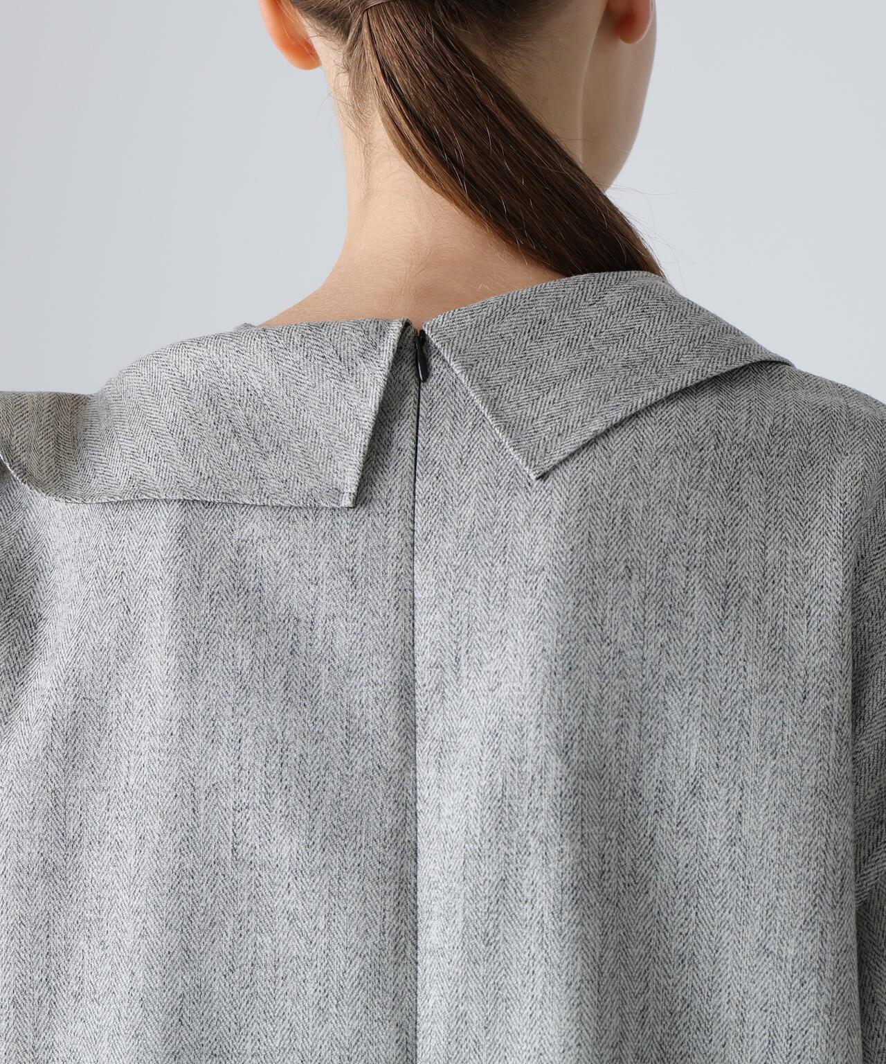 華麗的人字形上衣此款上衣採用不對稱設計,領口卷邊,一側袖子採用荷葉邊設計,使臉部顯得華麗。與同類設計的後背緞面喬其紗上衣(貨號:531-5210126)不同,它可以穿出略帶休閒的氛圍。採用人字形結構的輕薄斜紋軟呢面料,使用羊毛,但與聚酯纖維交織在一起,因此不會變得厚重。