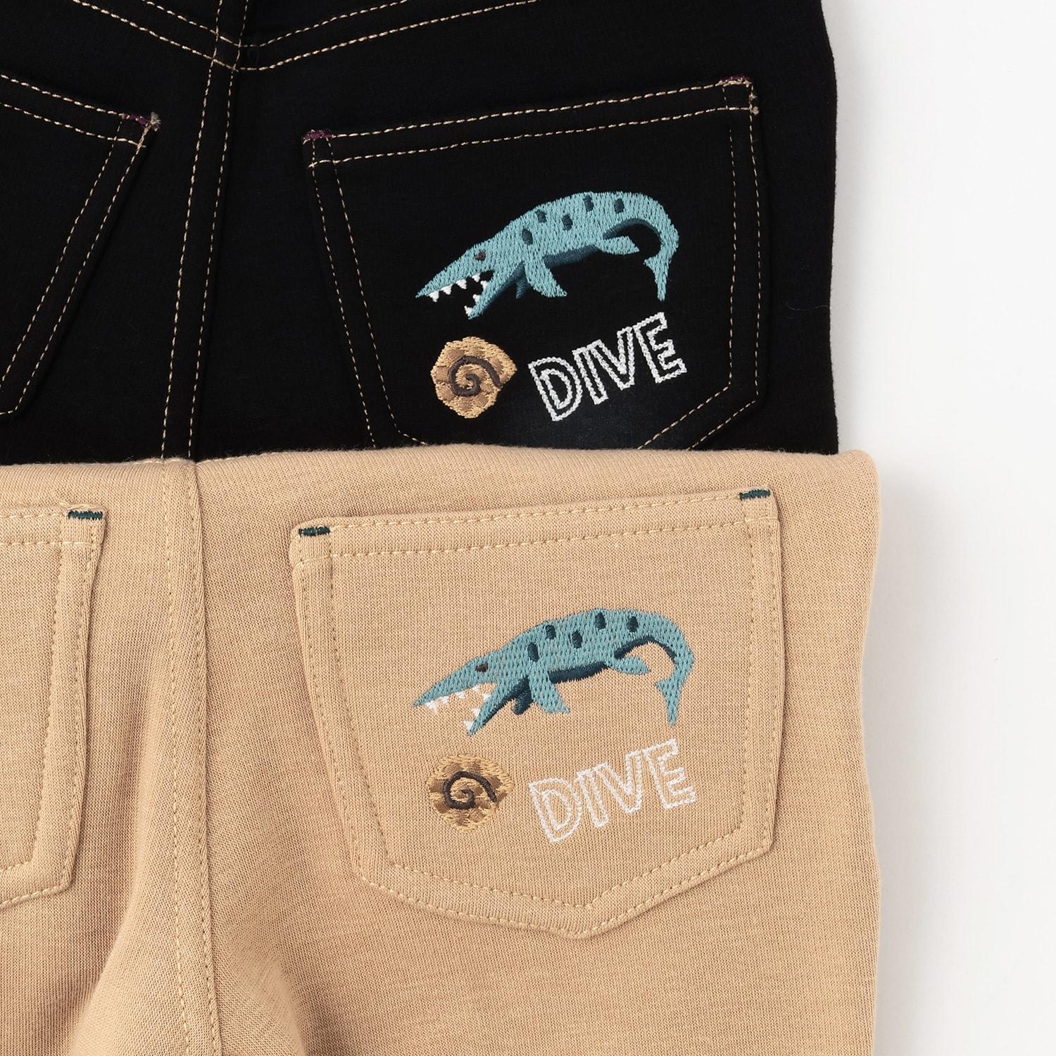 左前口袋和右後口袋上繡有各種恐龍圖案。