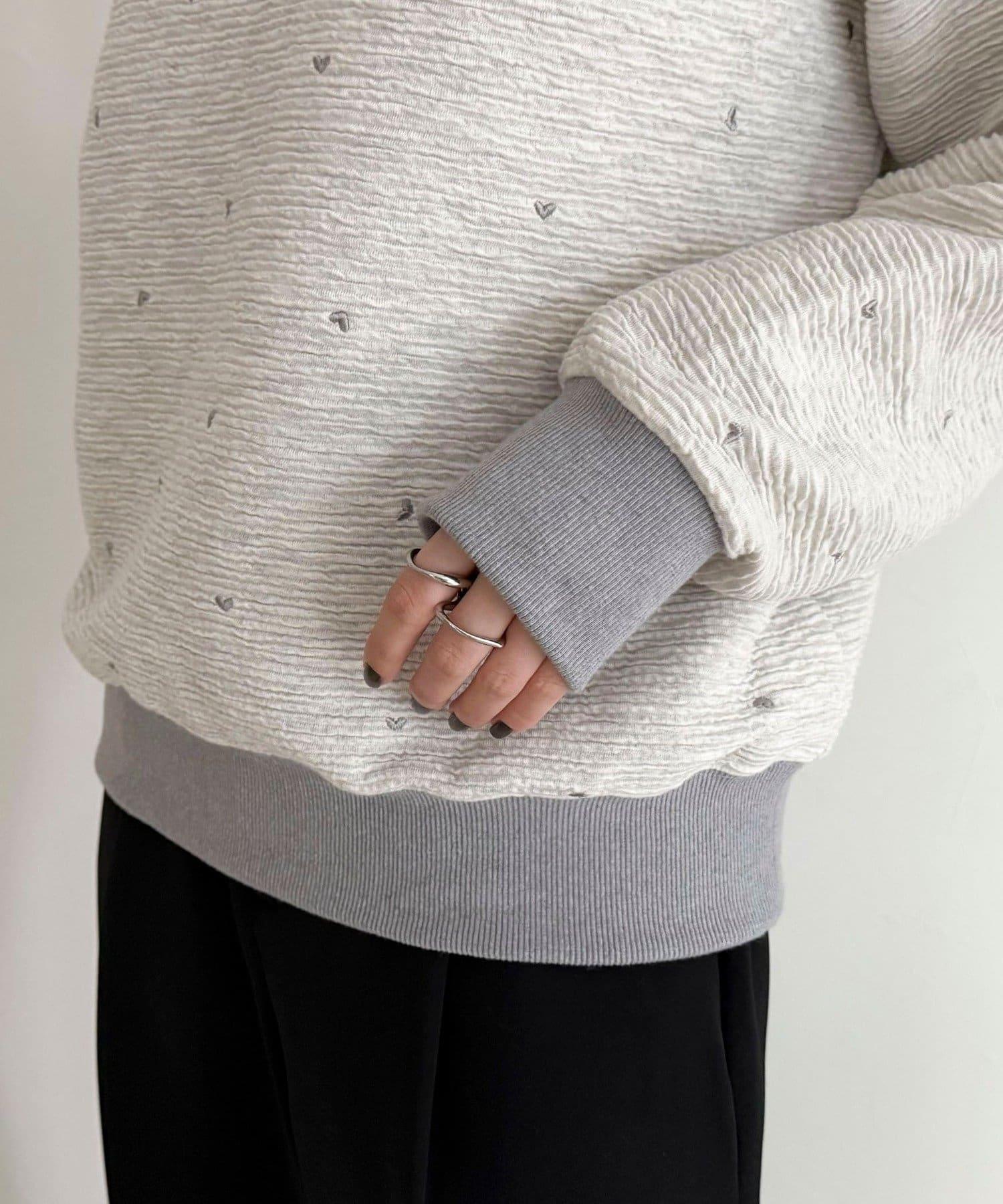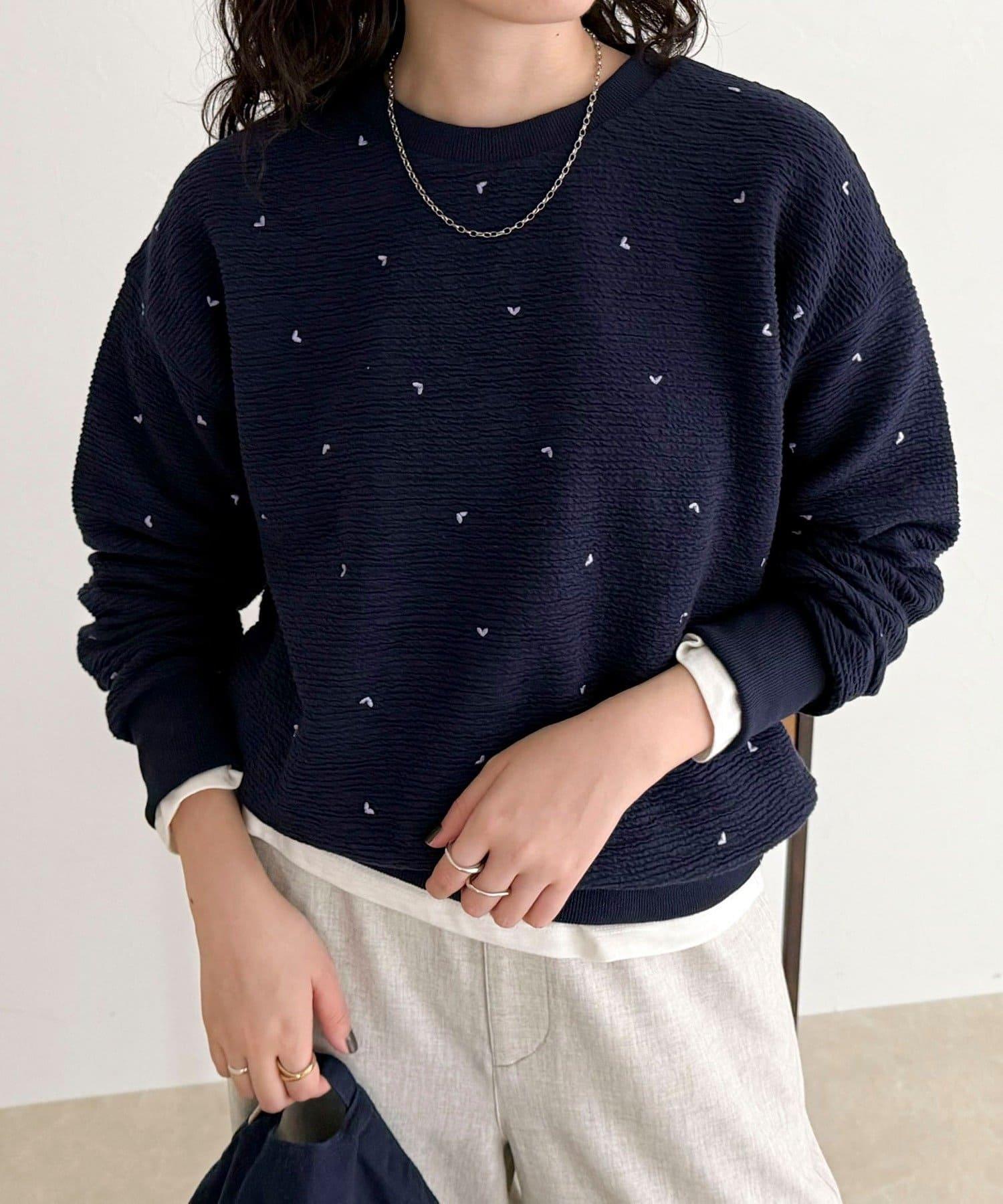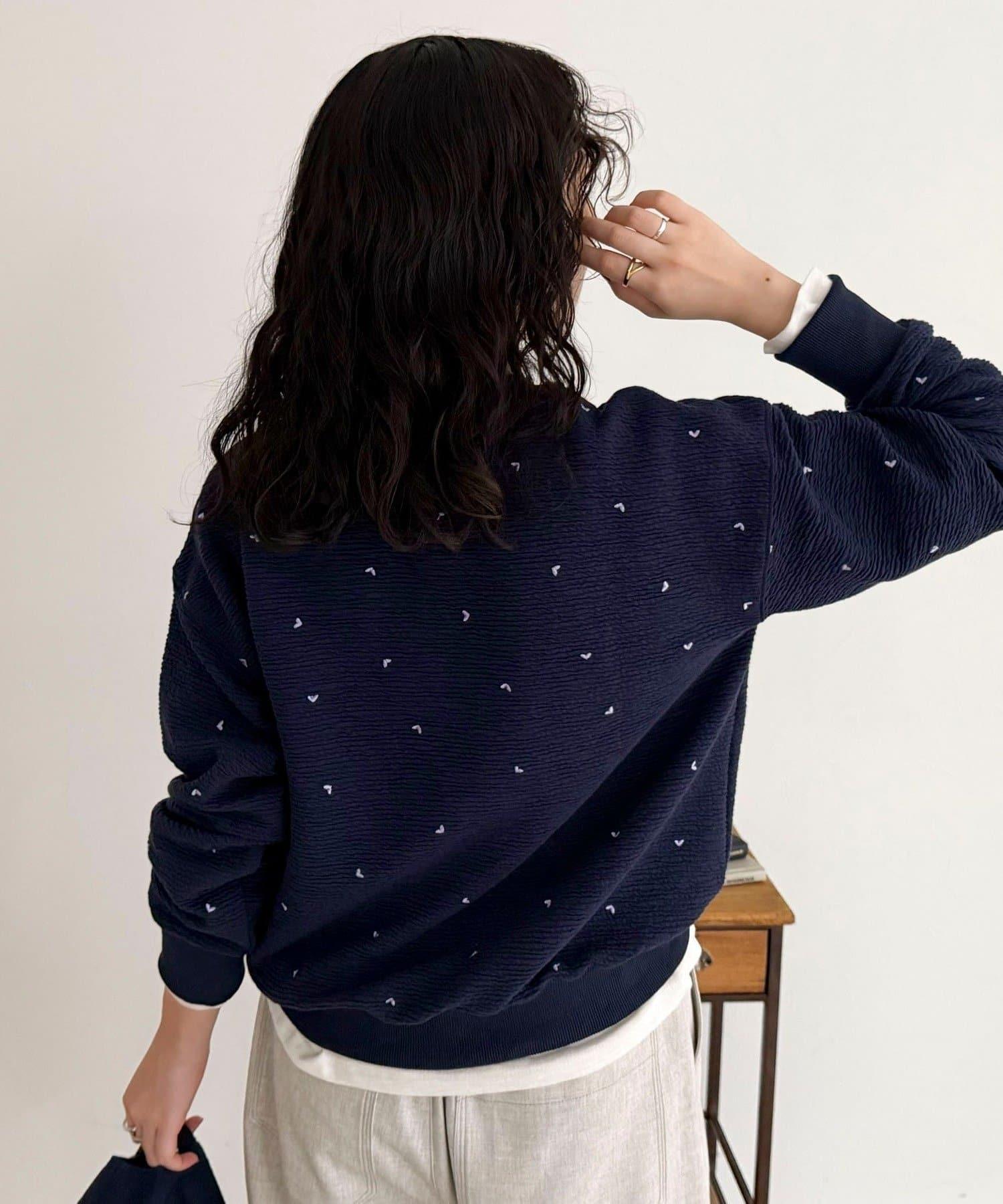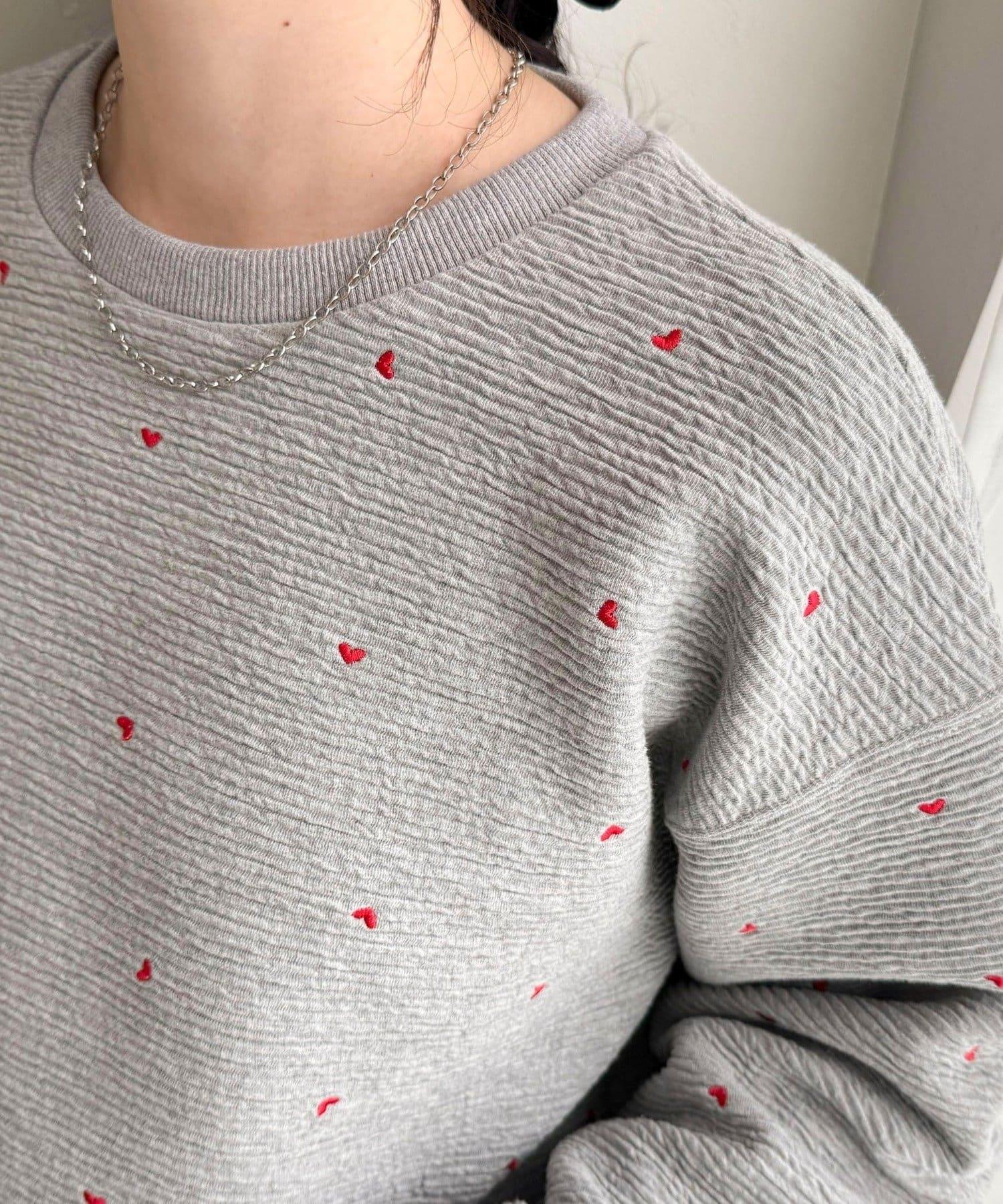 這是一款可愛的套頭衫,上面散佈著小巧的心形刺繡。
