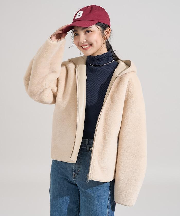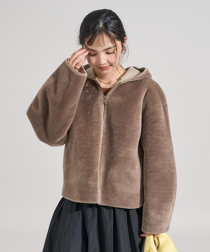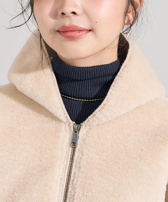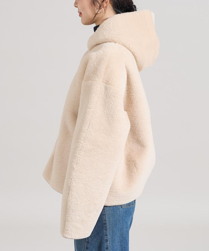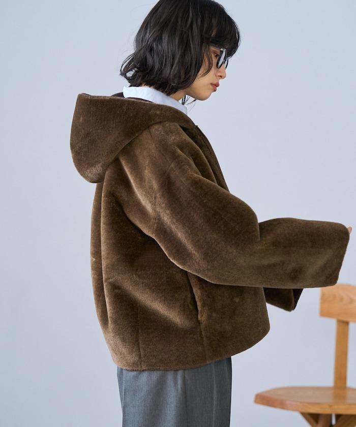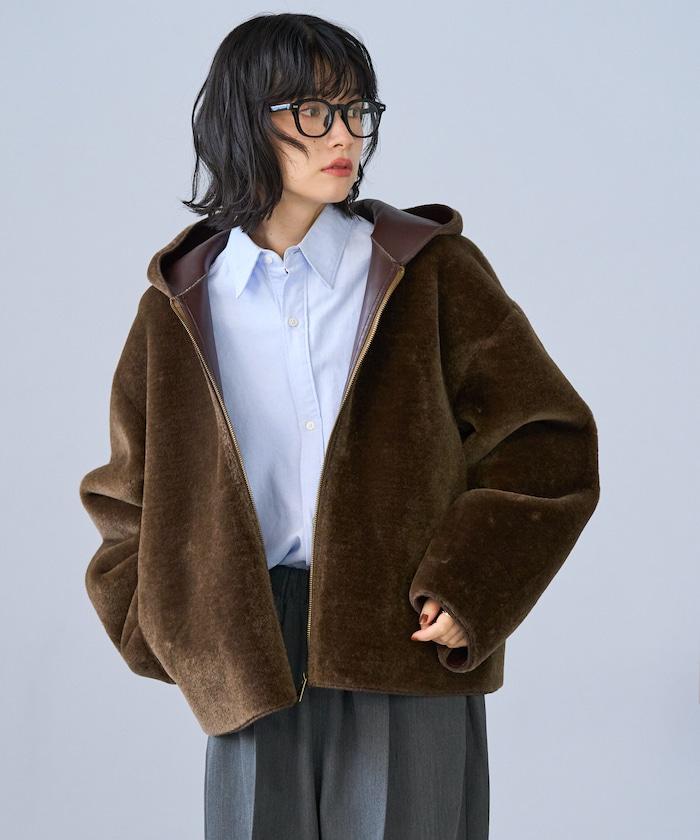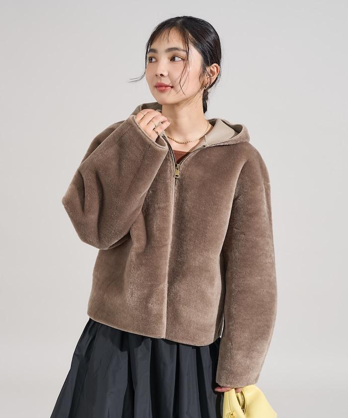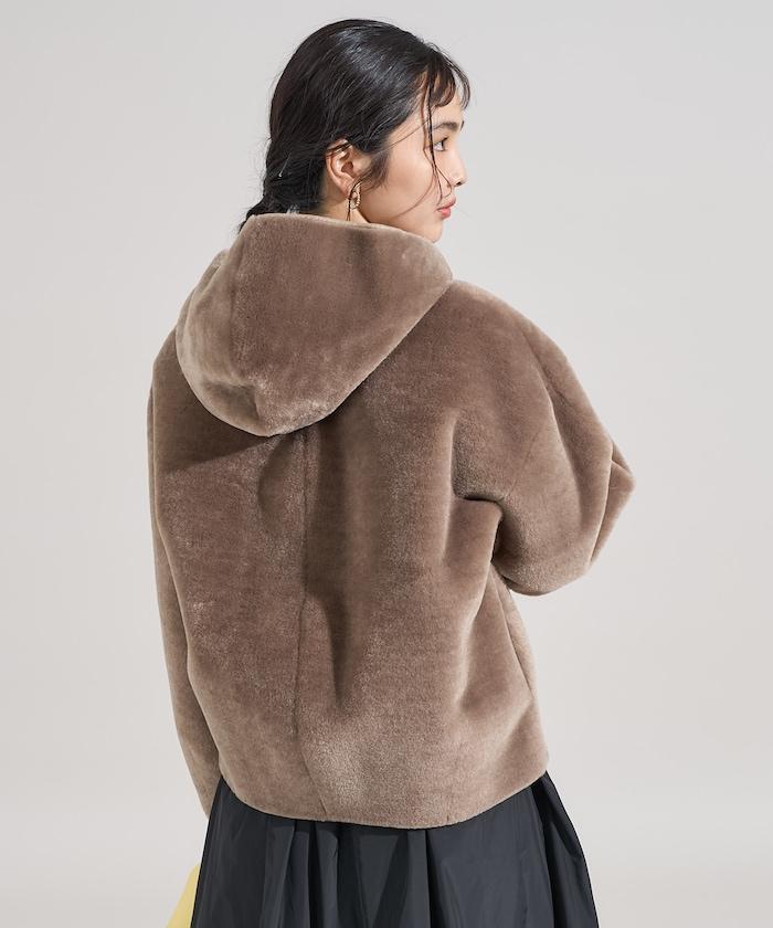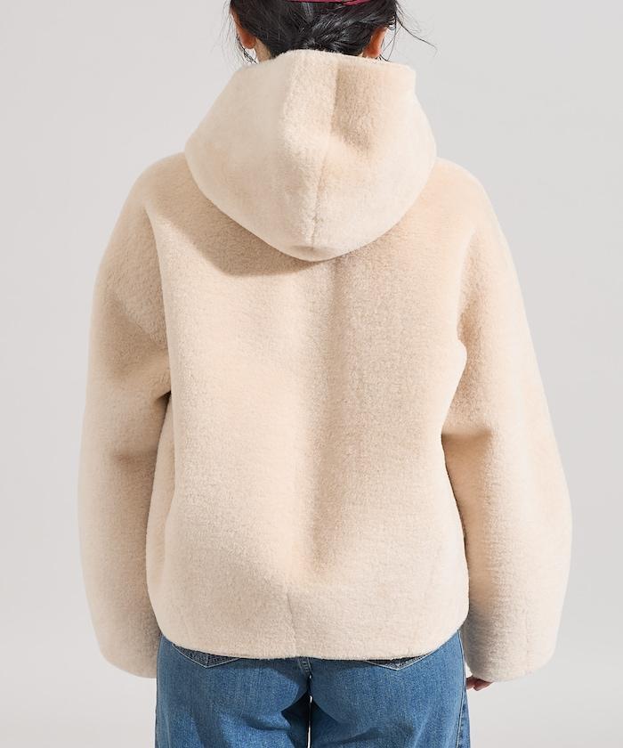 拉鍊風帽夾克表面為光滑皮草,內襯為合成皮革。