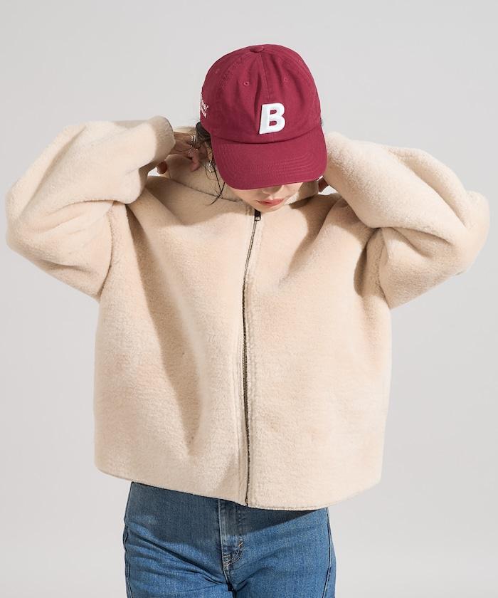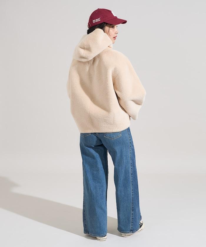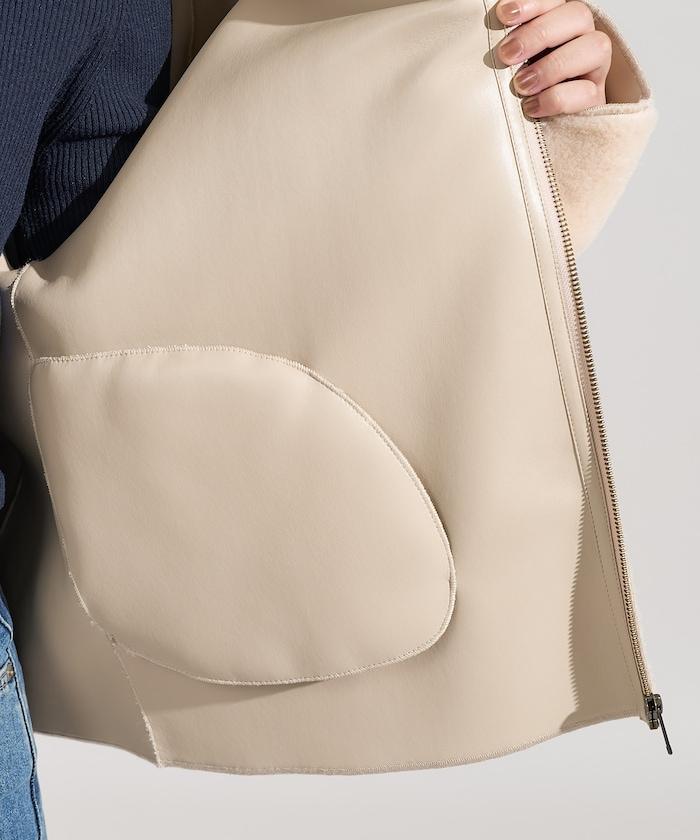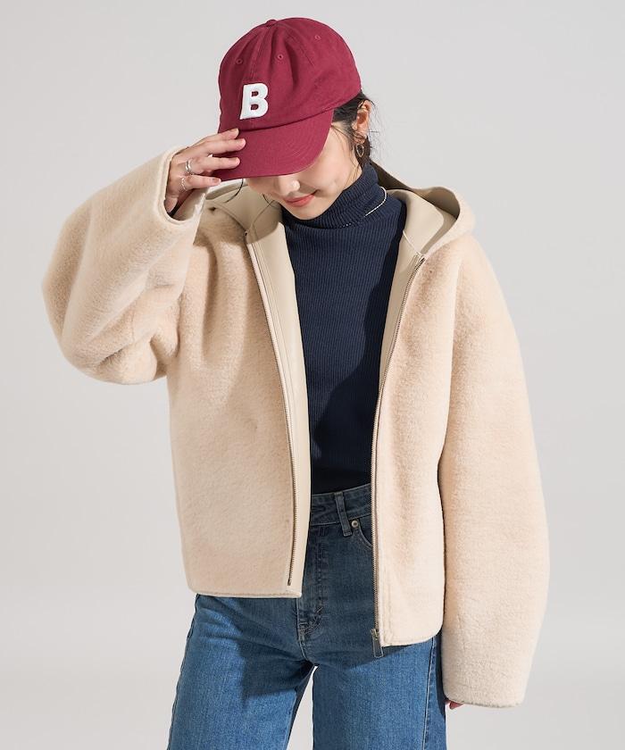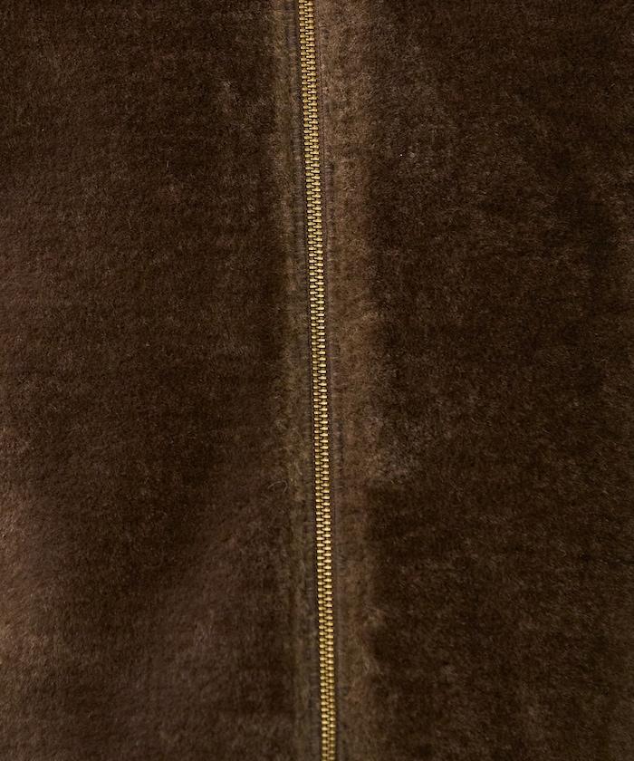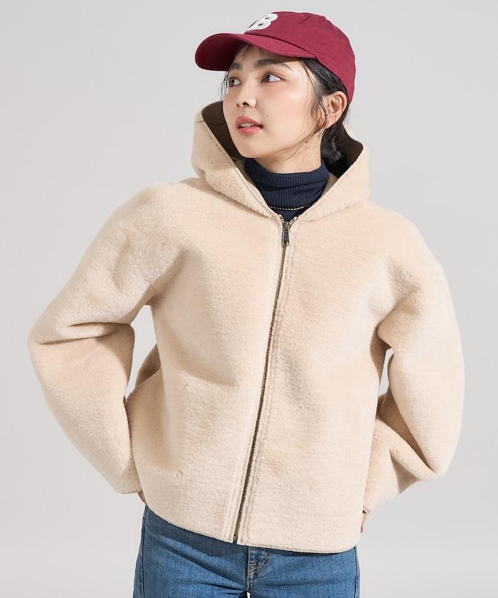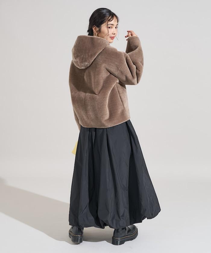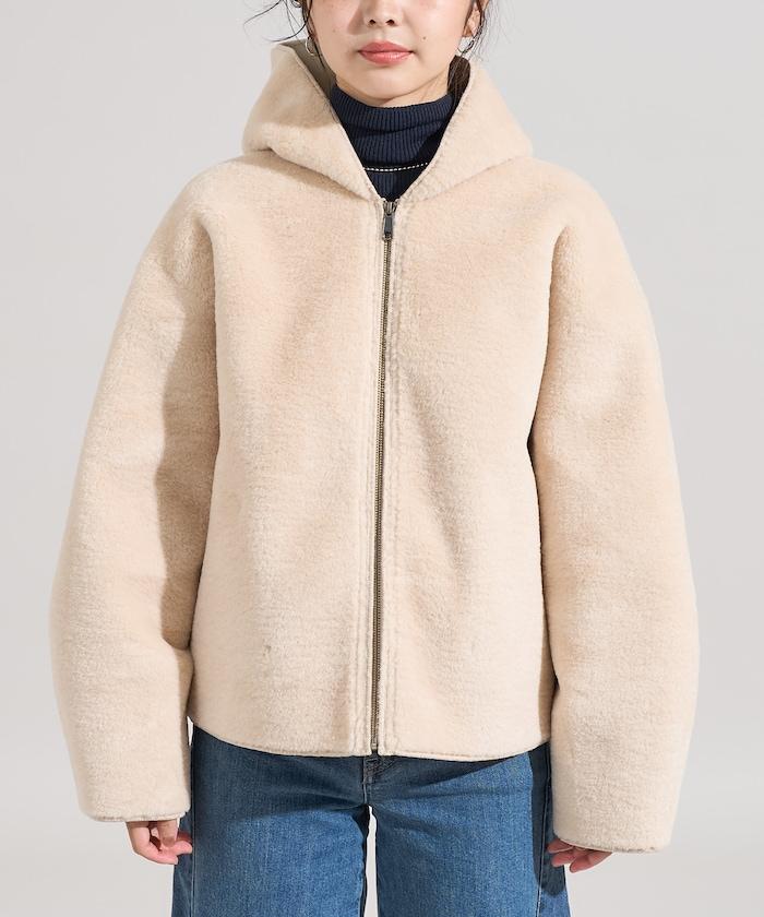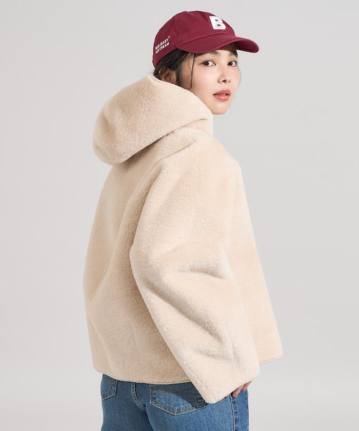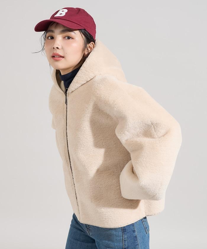 拉鍊風帽夾克表面為光滑皮草,內襯為合成皮革。