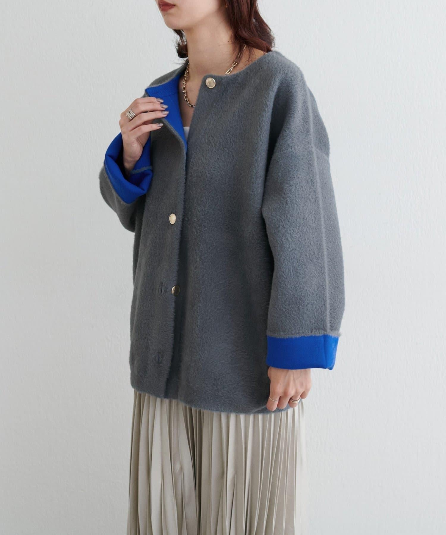 無領、簡潔的領口和圓潤的繭形輪廓營造出女性的柔美印象。