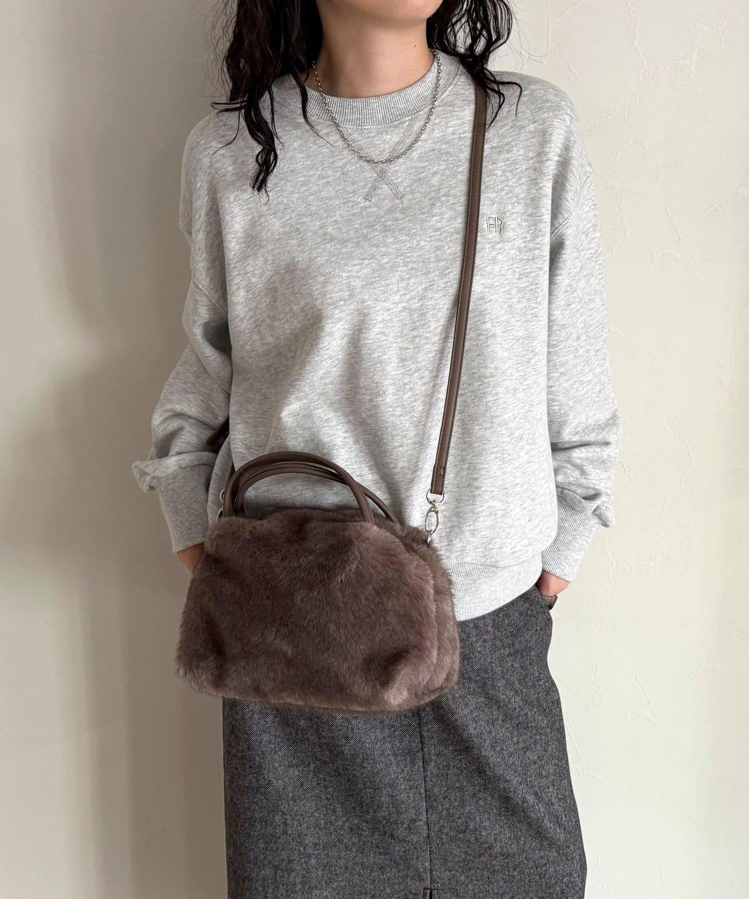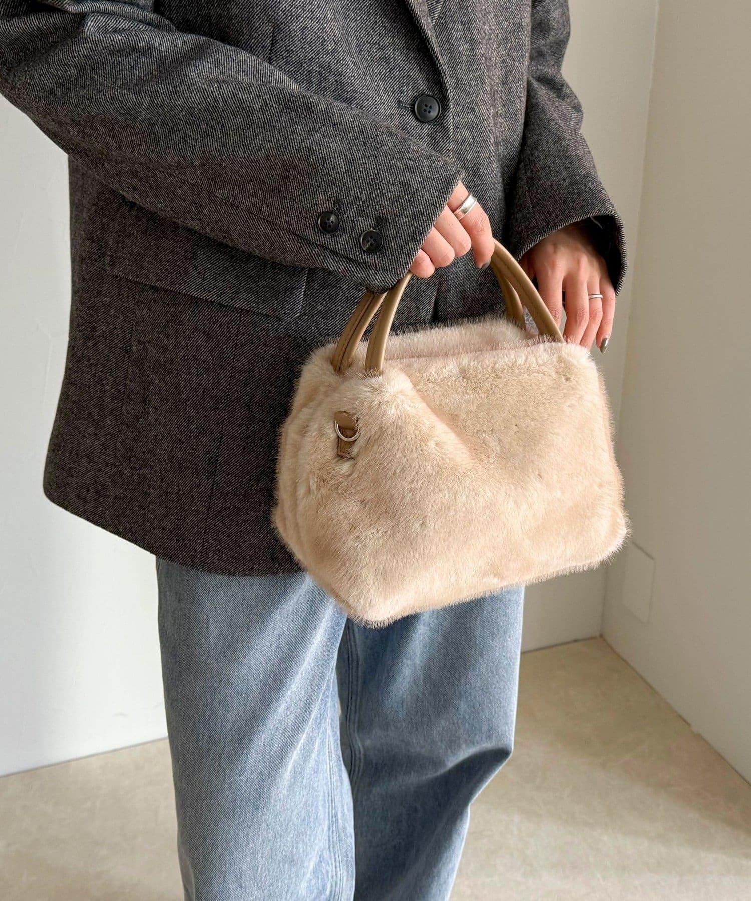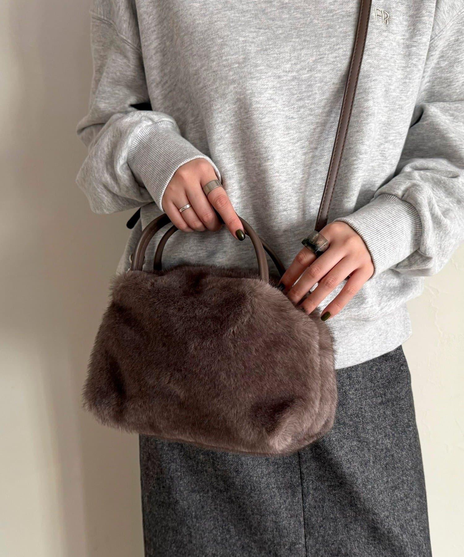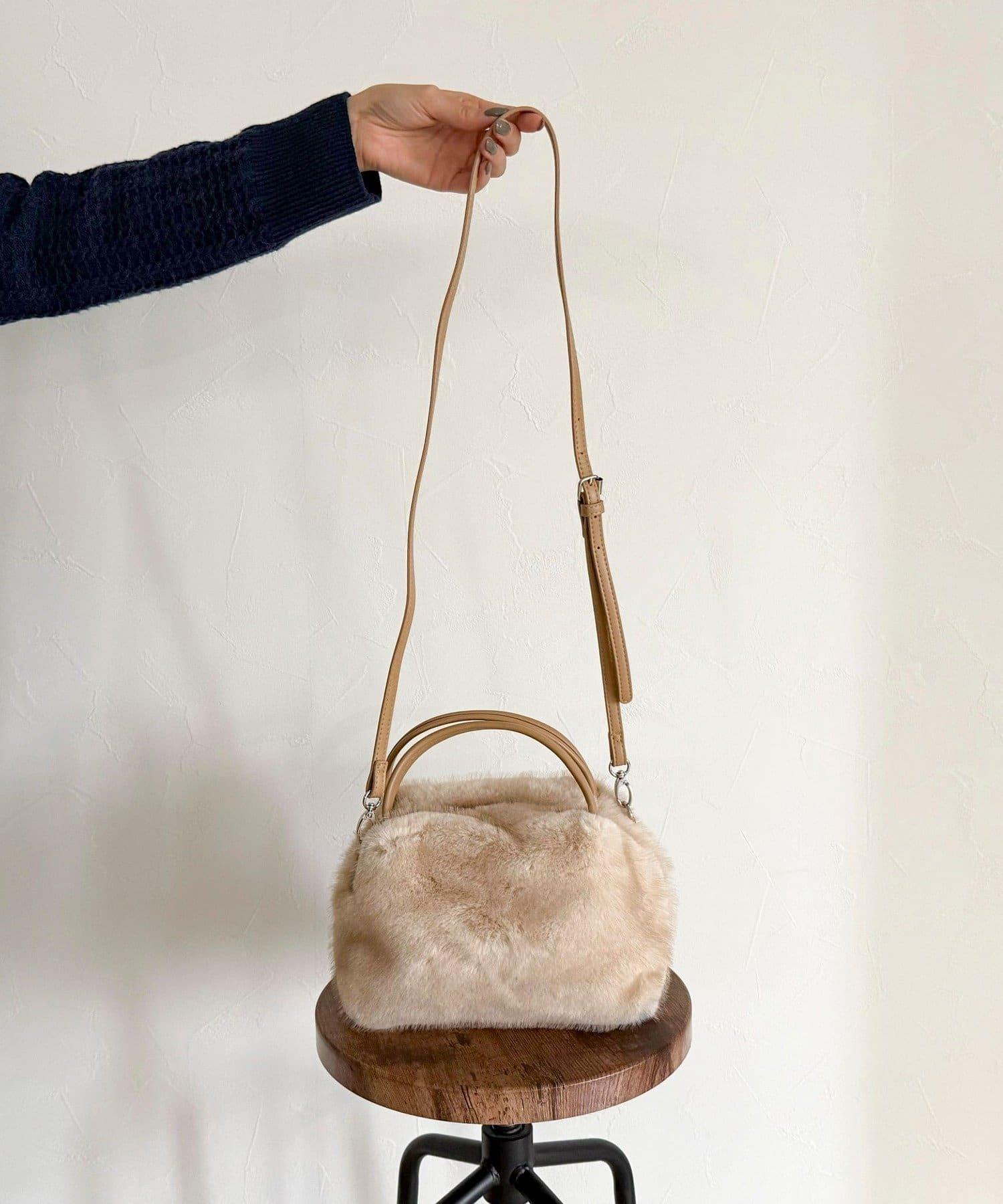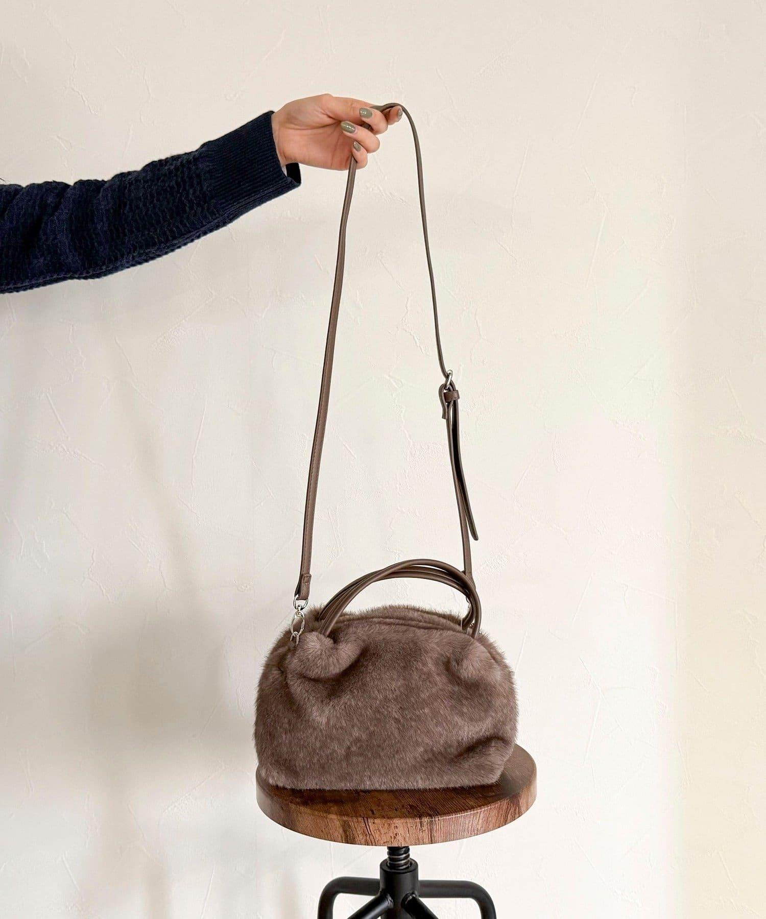 這是一款小巧的皮草包,採用圓形輪廓和肩帶設計。
