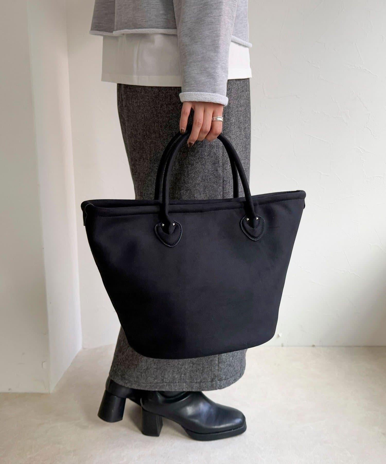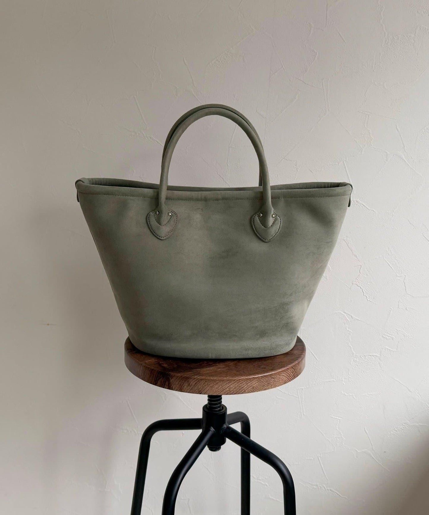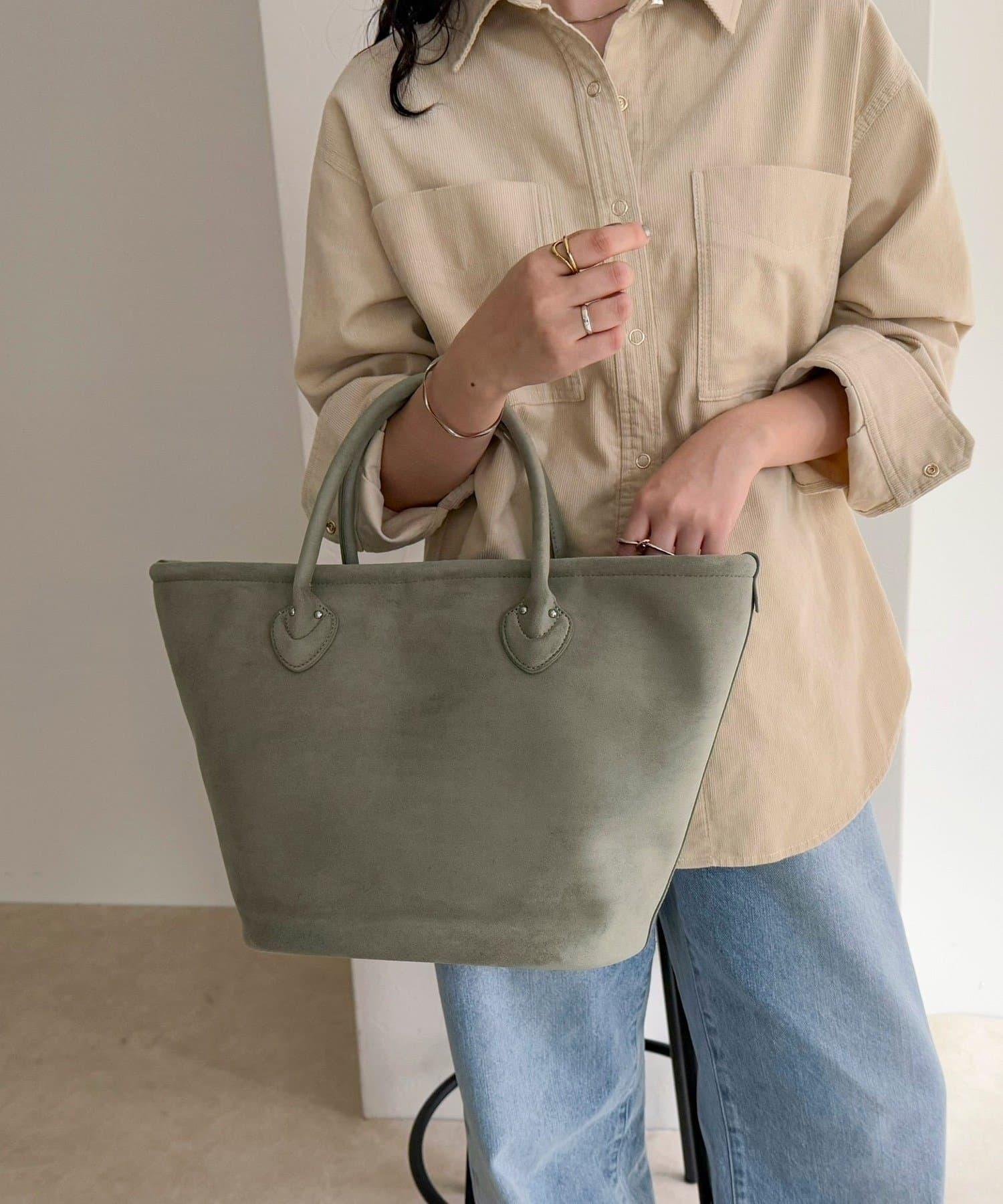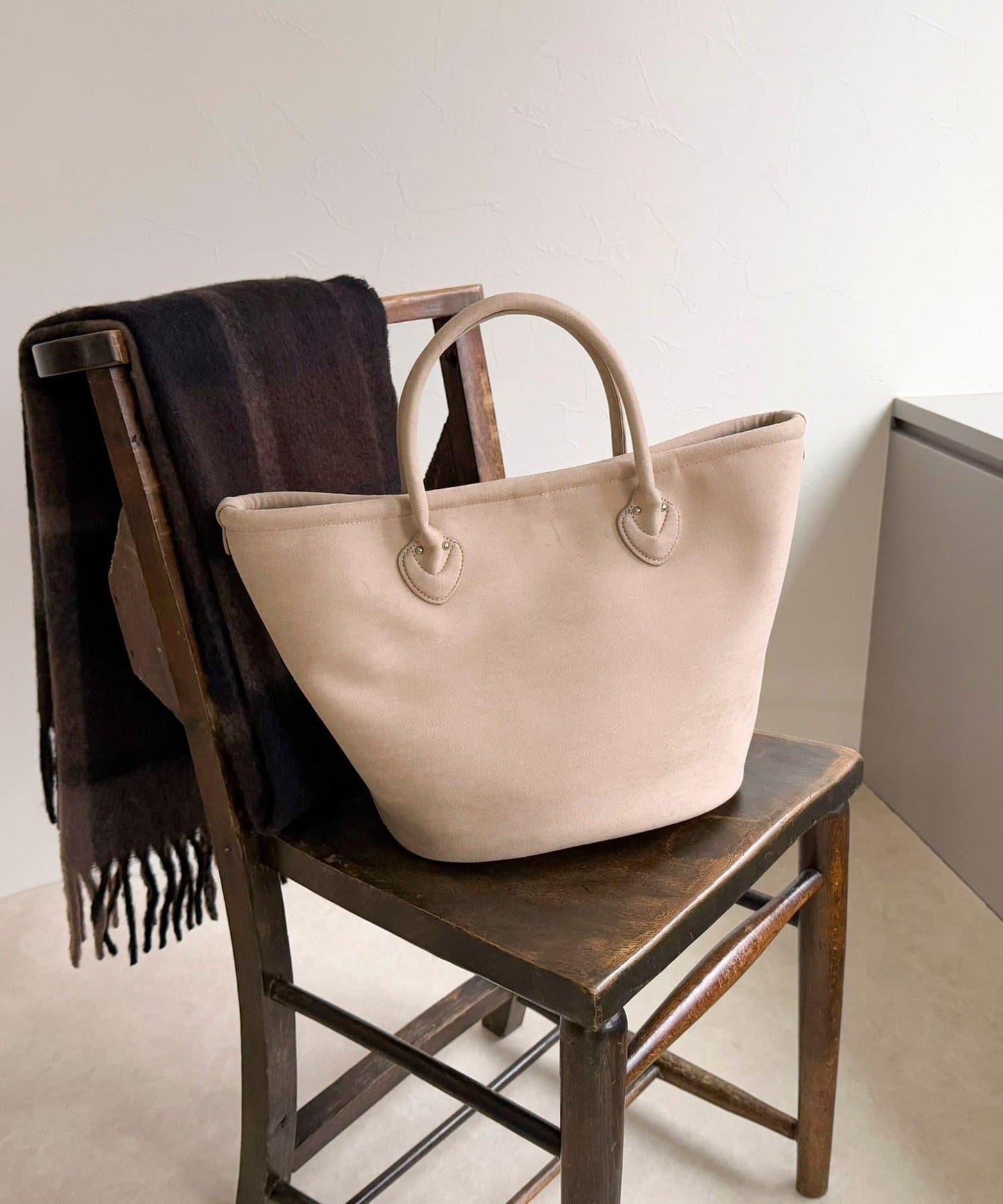 這款優雅的手提包由柔軟的仿麂皮製成。