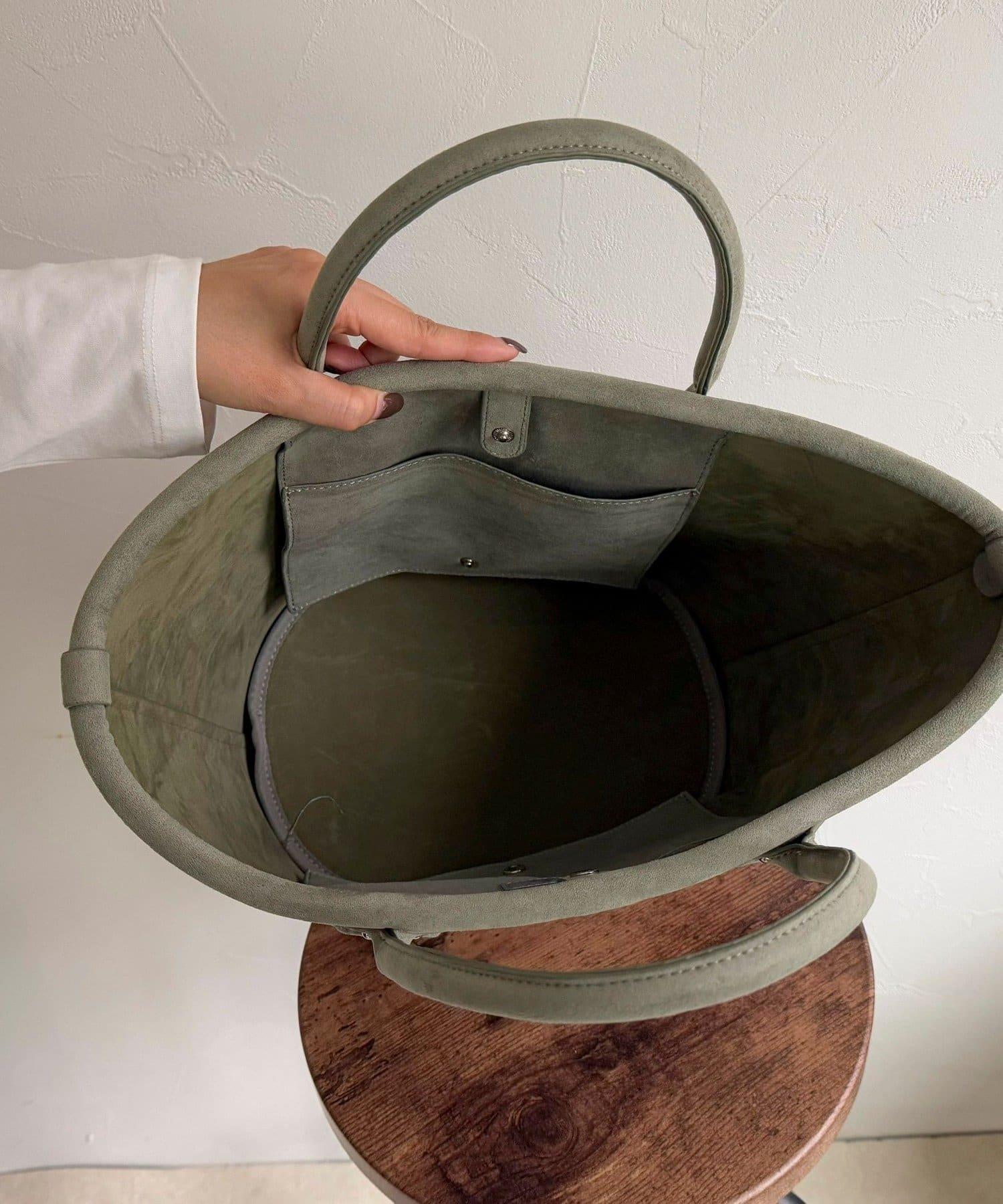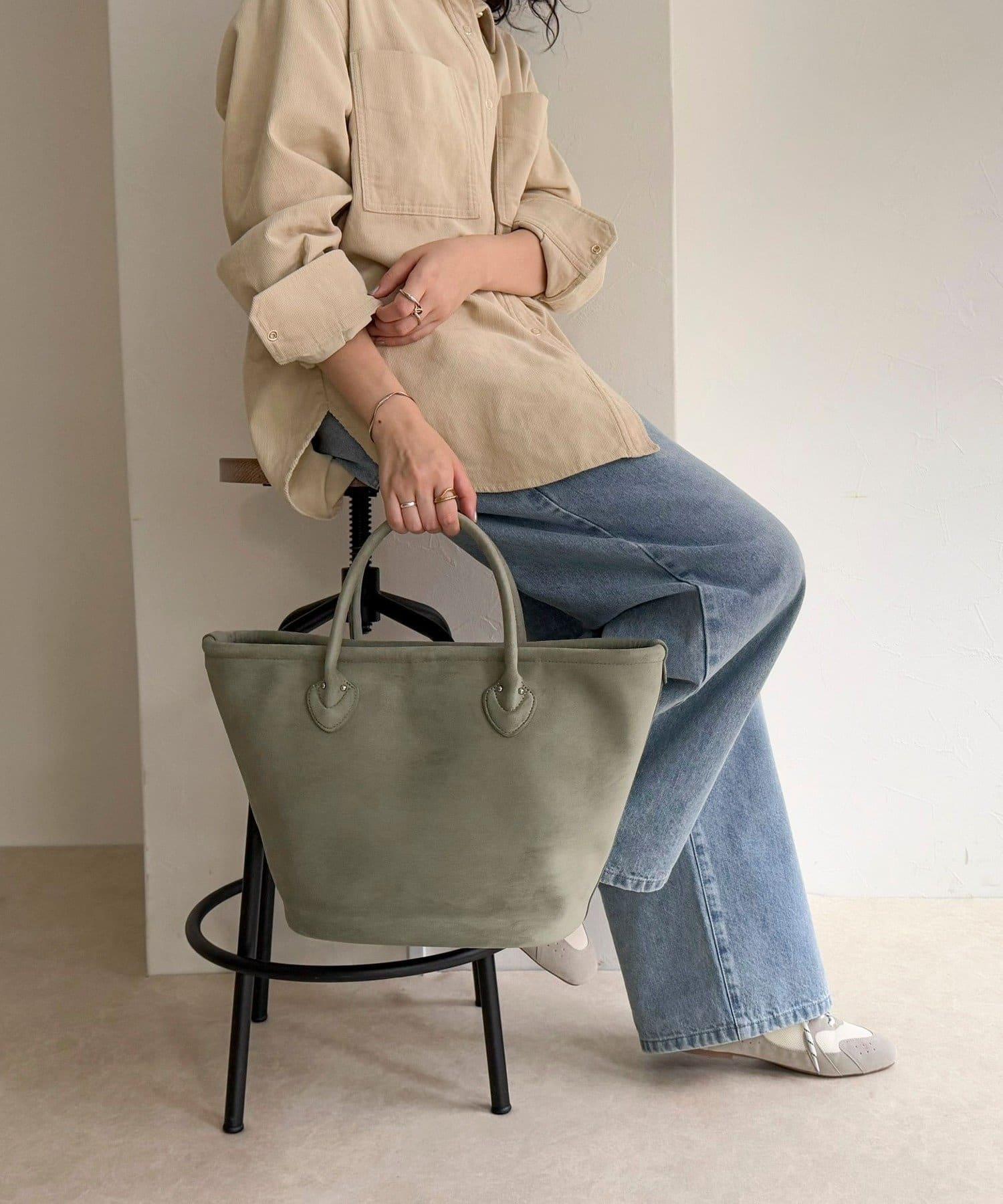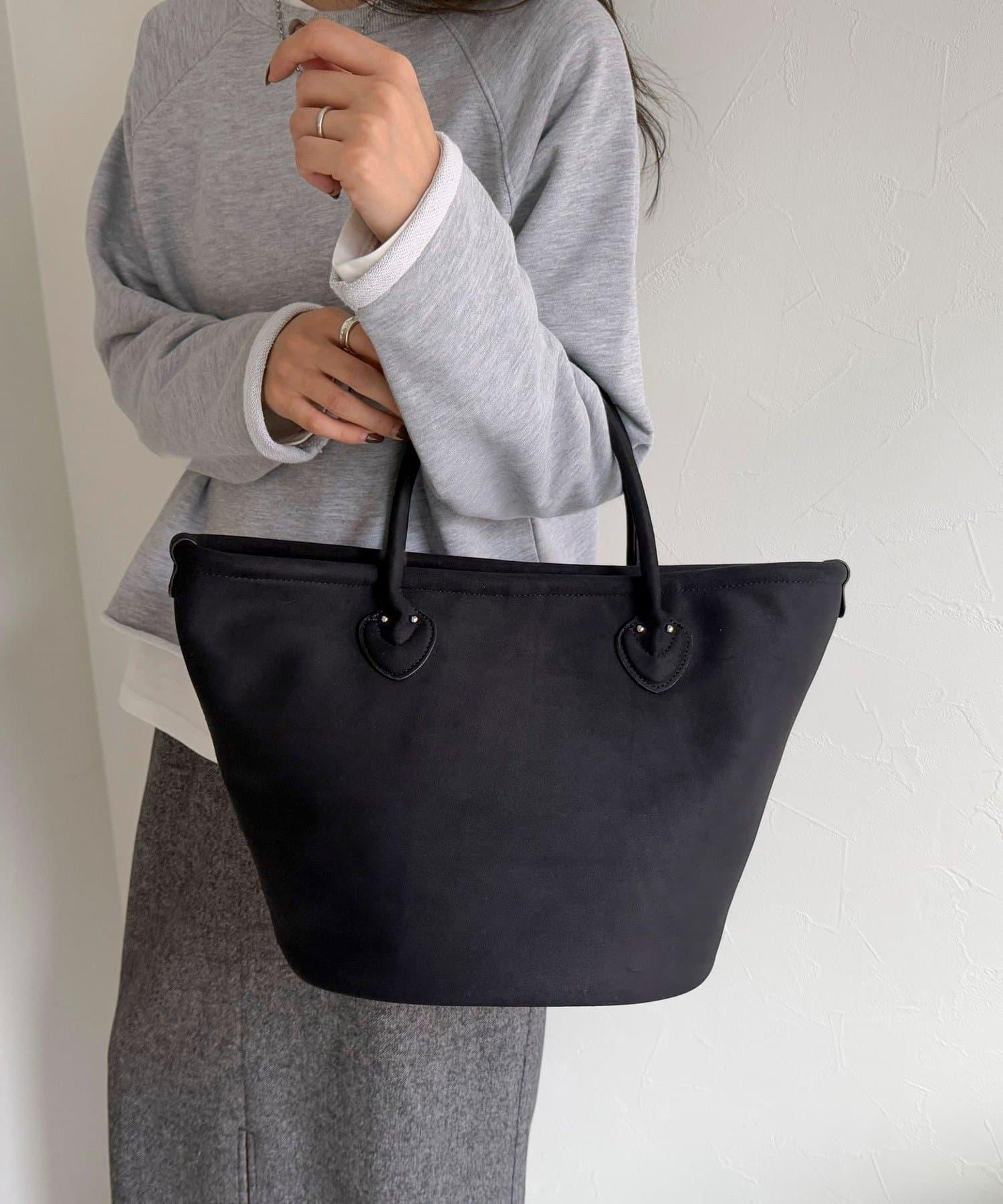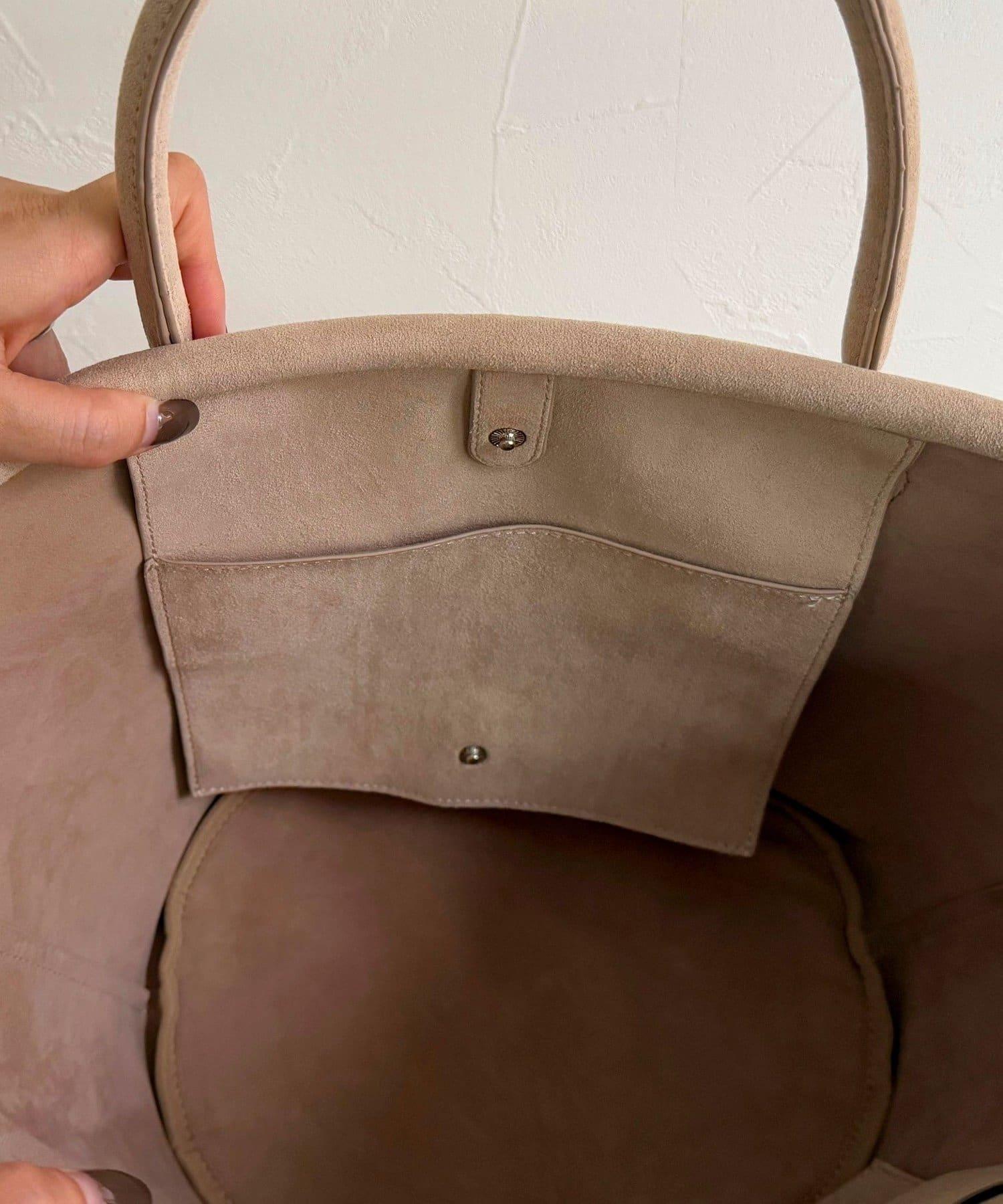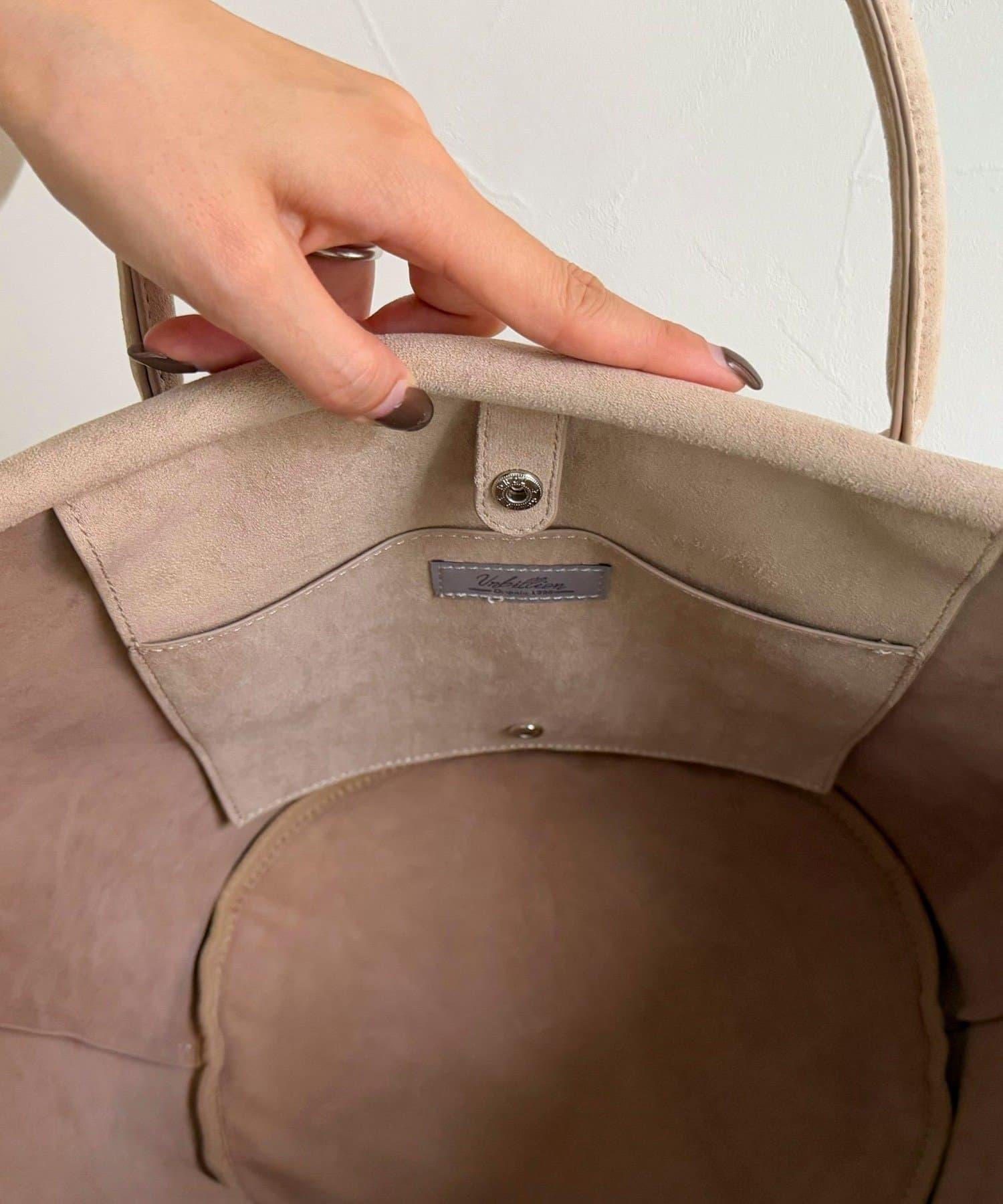 這款優雅的手提包由柔軟的仿麂皮製成。