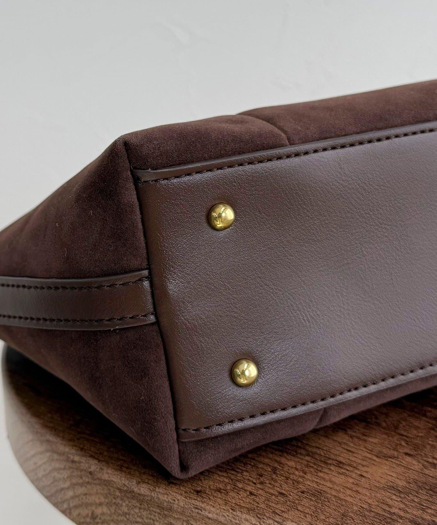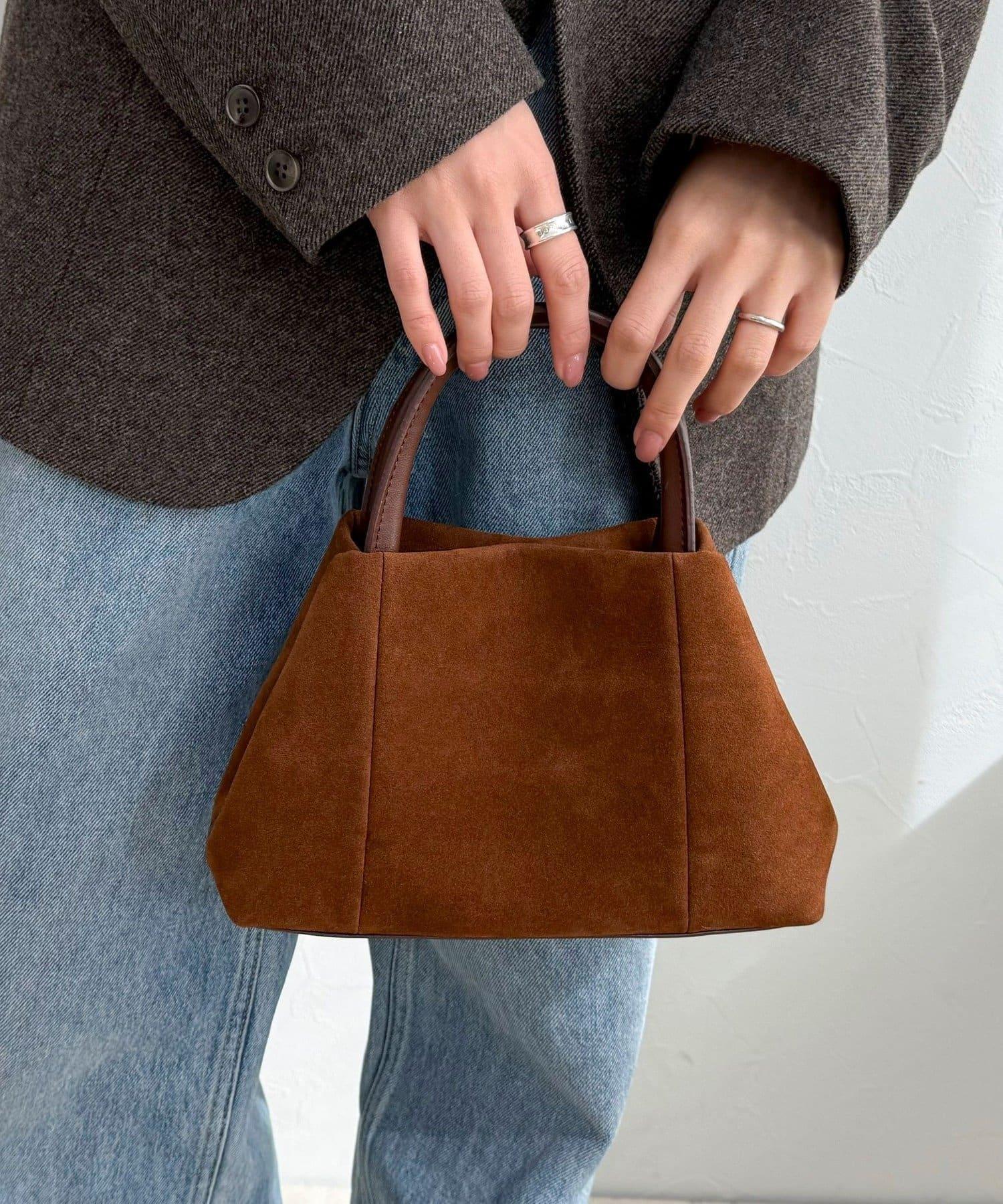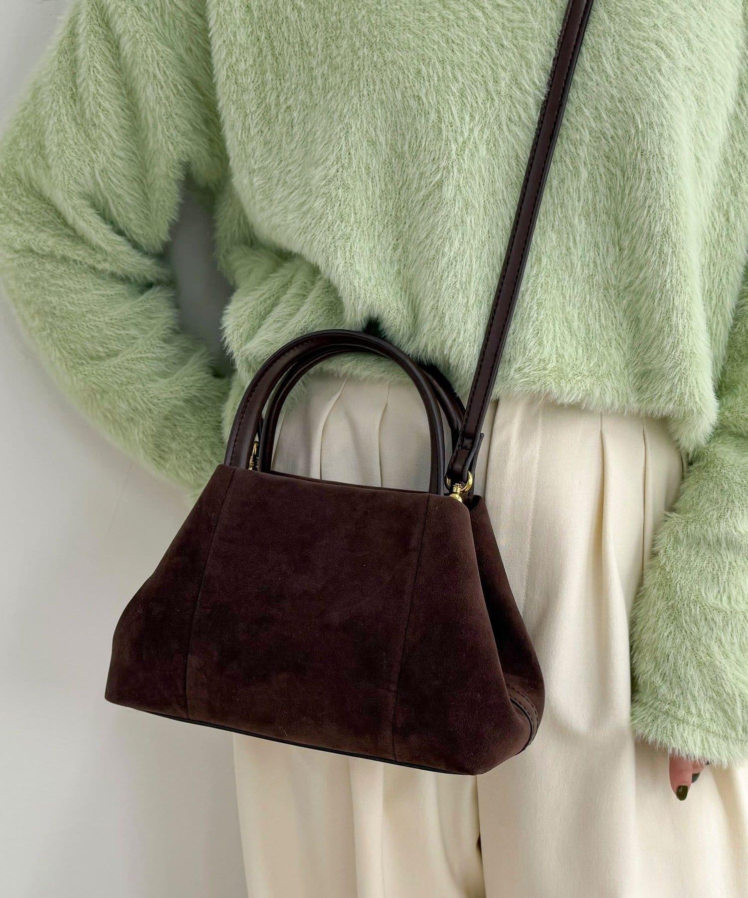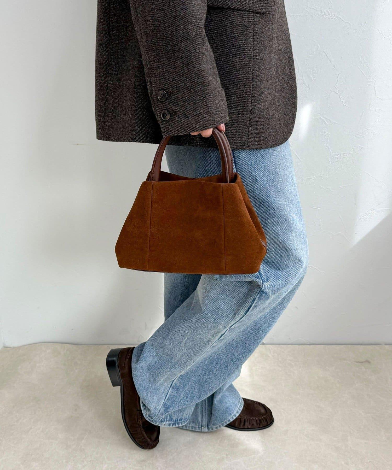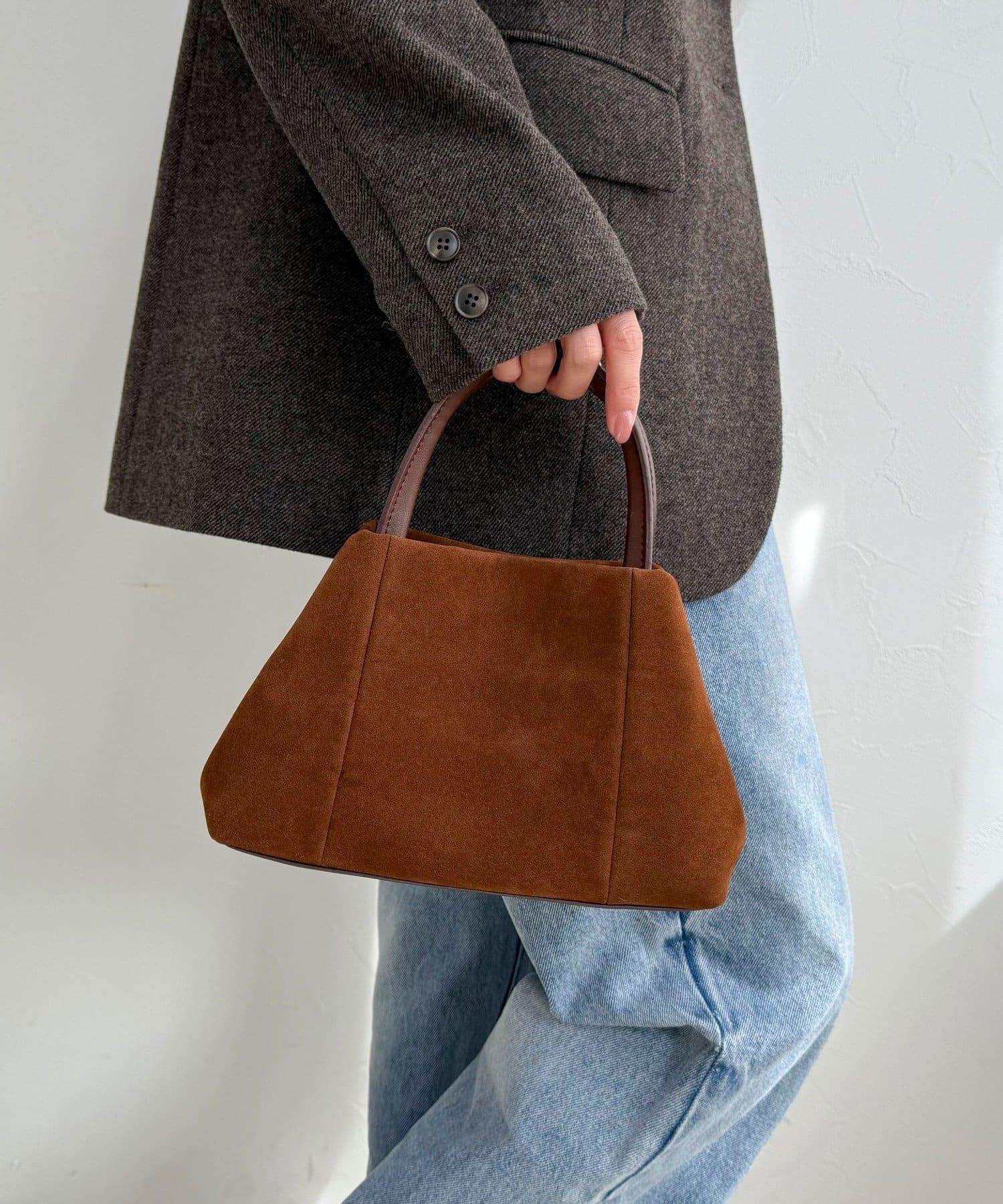 這款手提包採用人造麂皮製成,外形呈橫向長條狀。