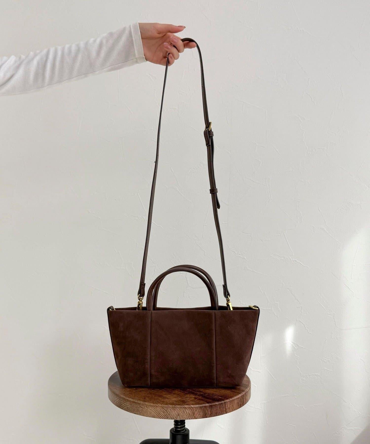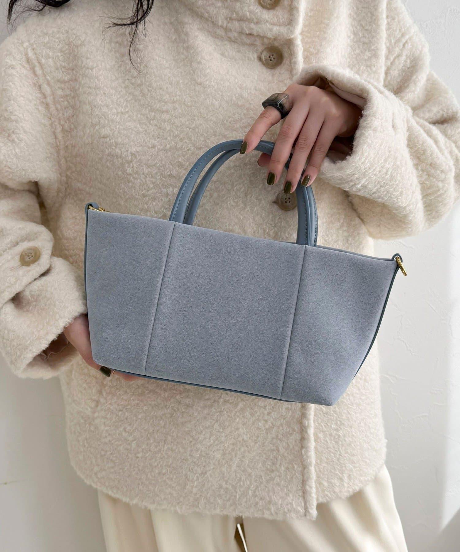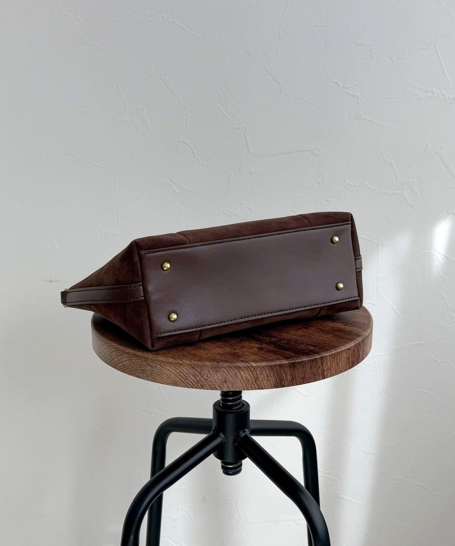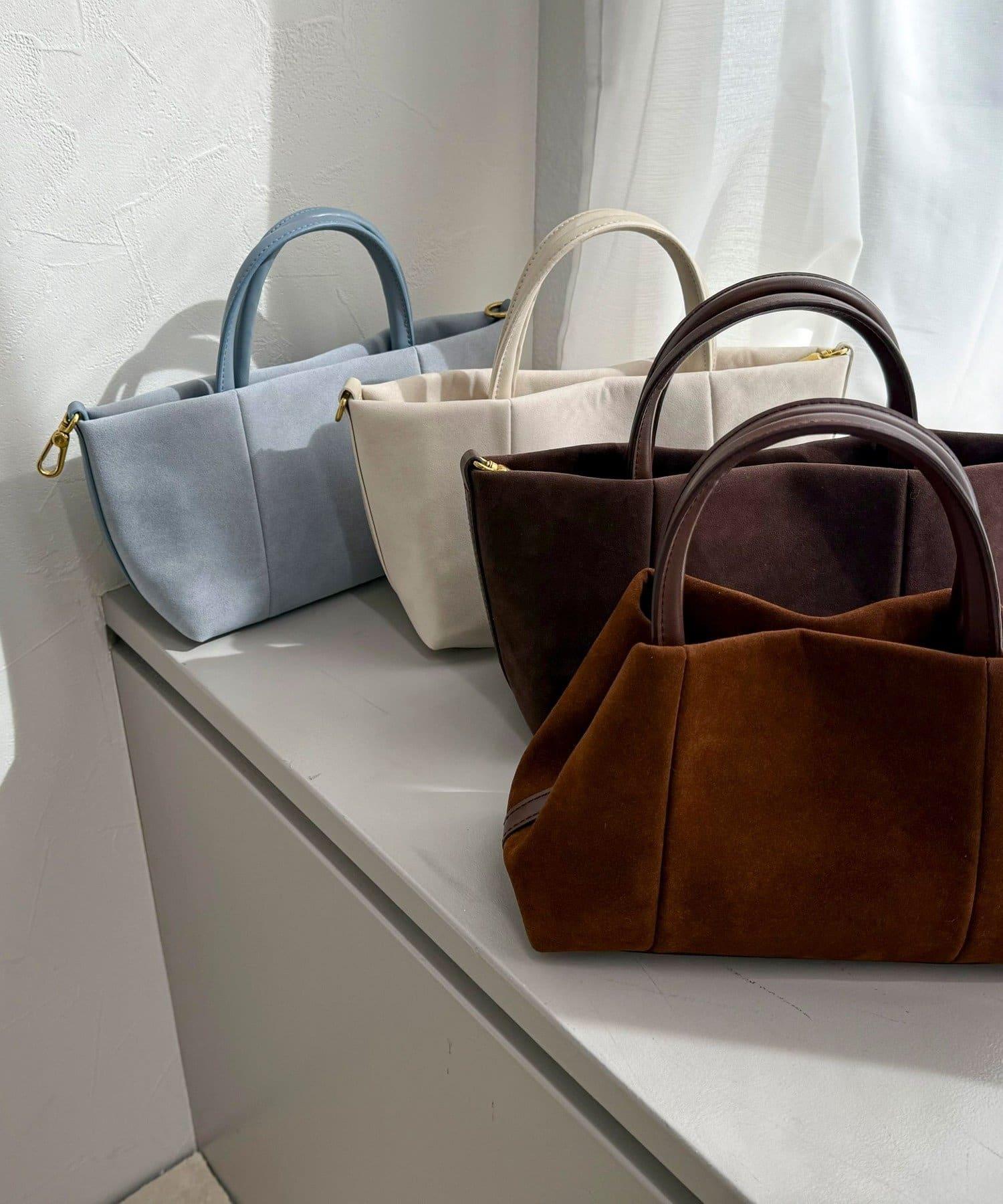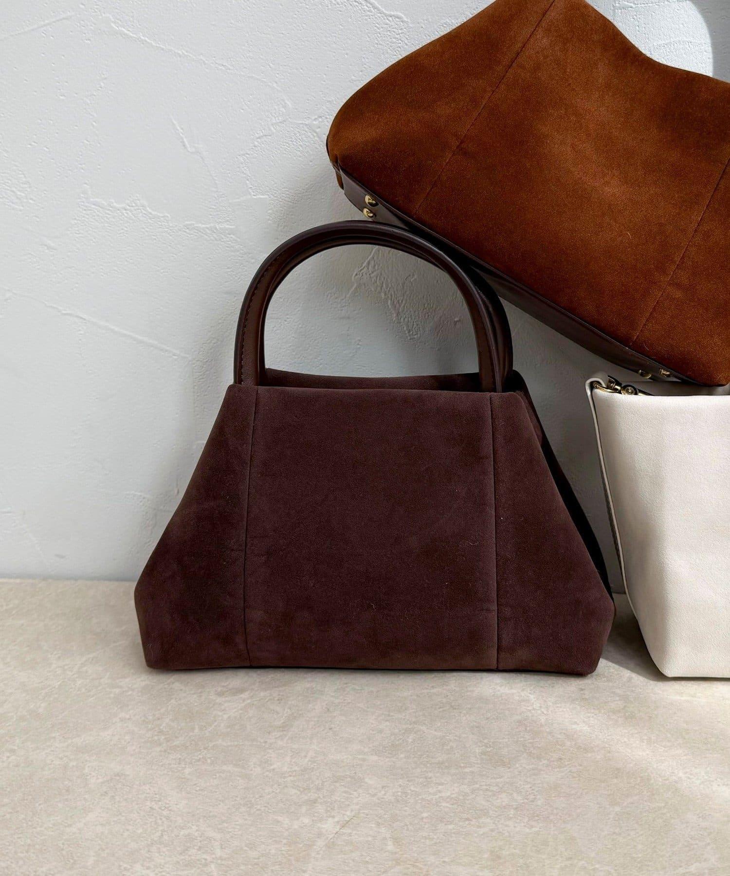 這款手提包採用人造麂皮製成,外形呈橫向長條狀。