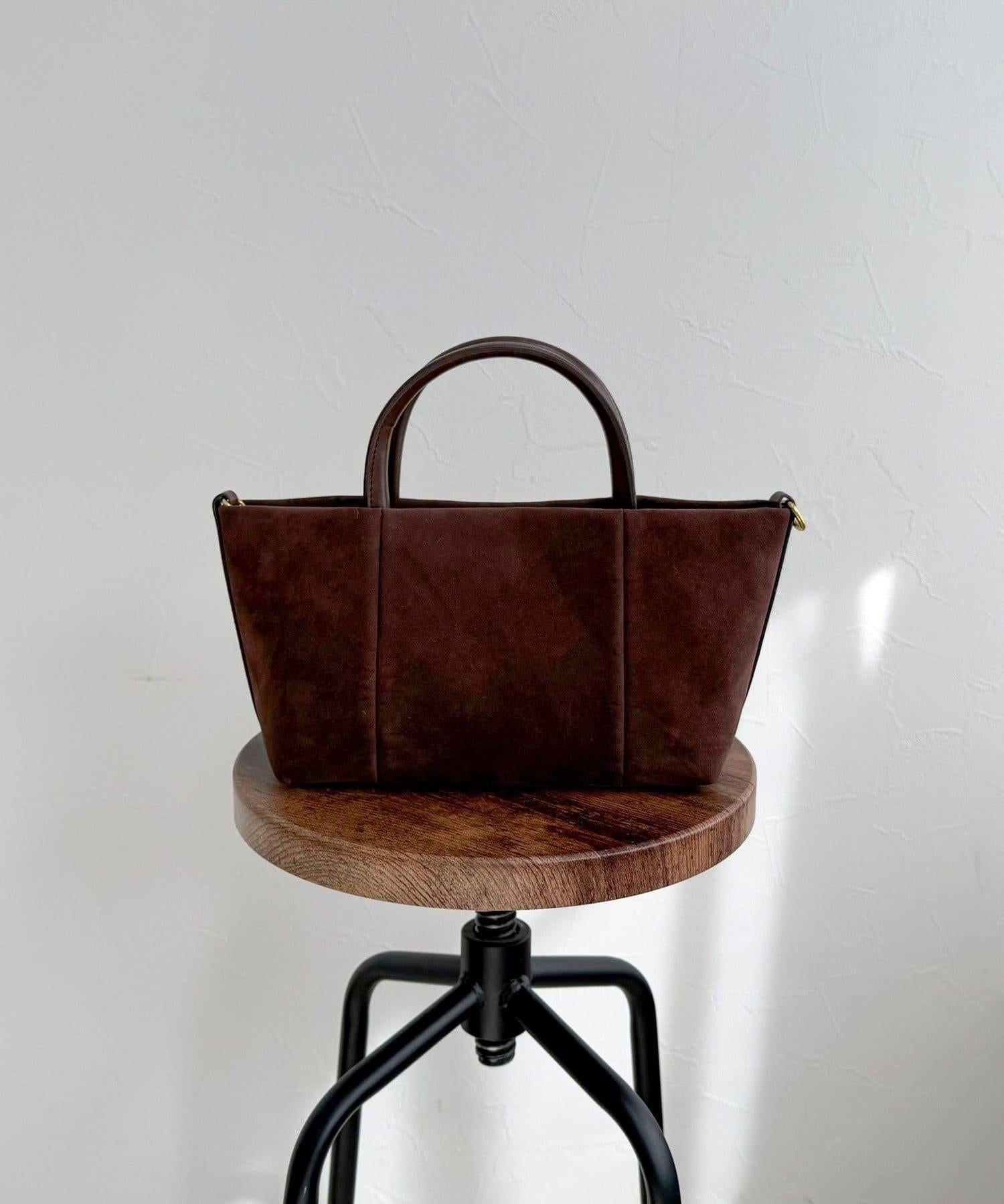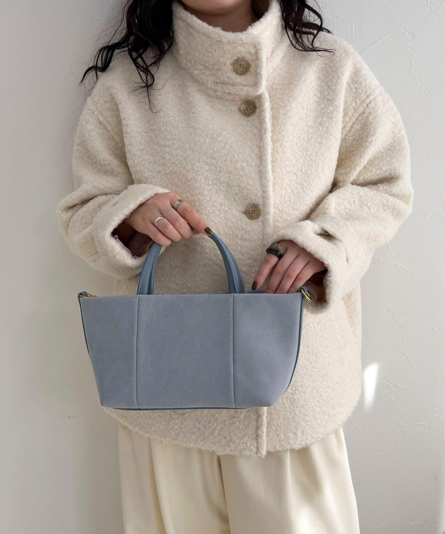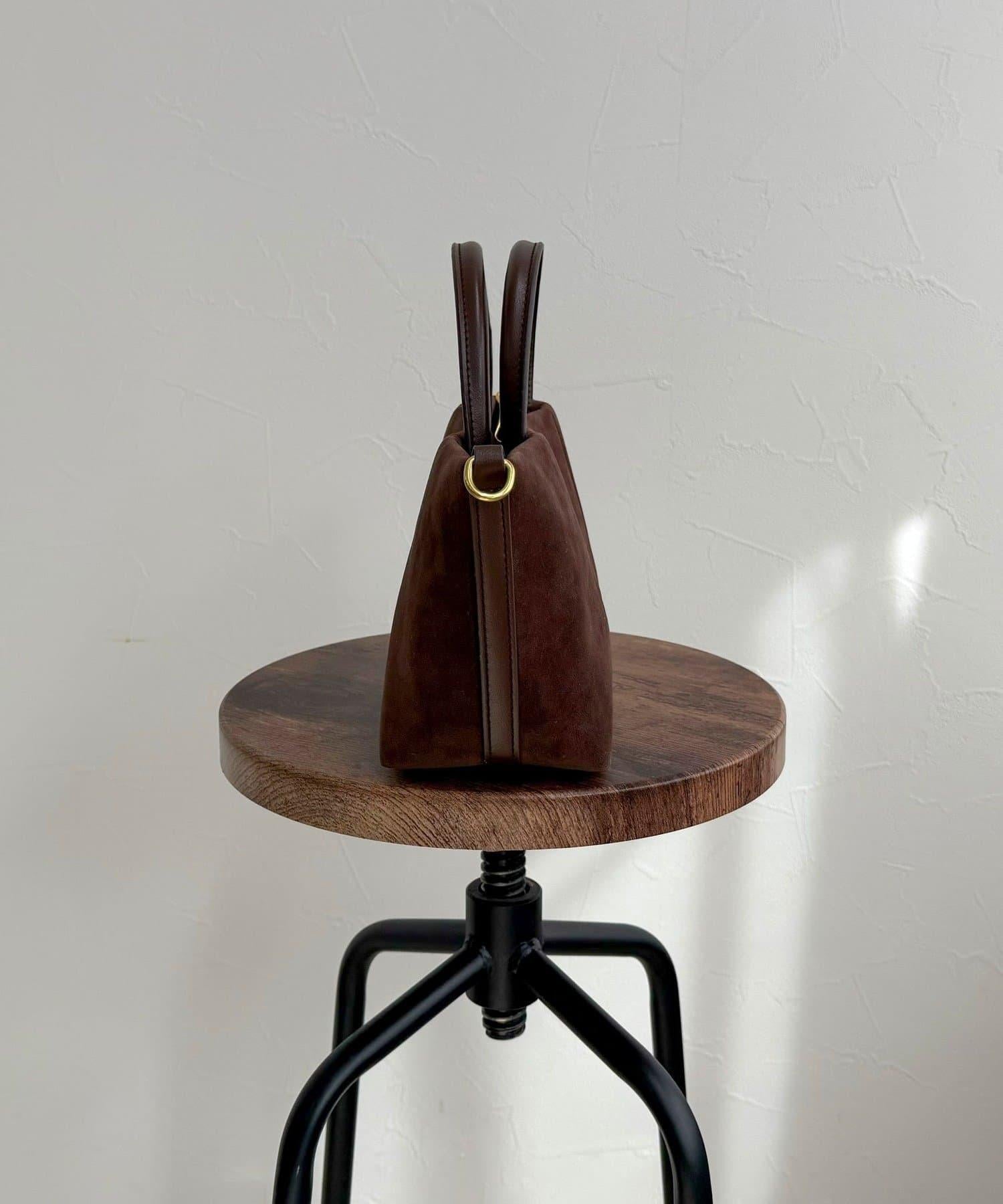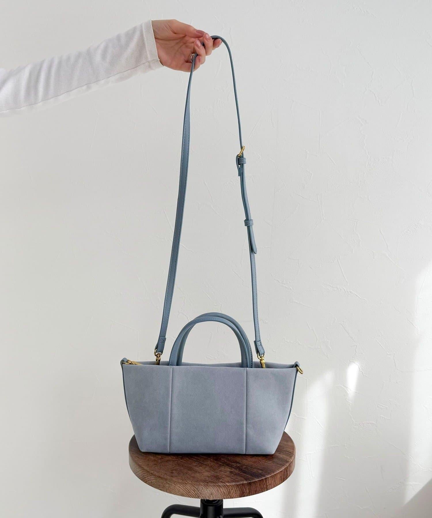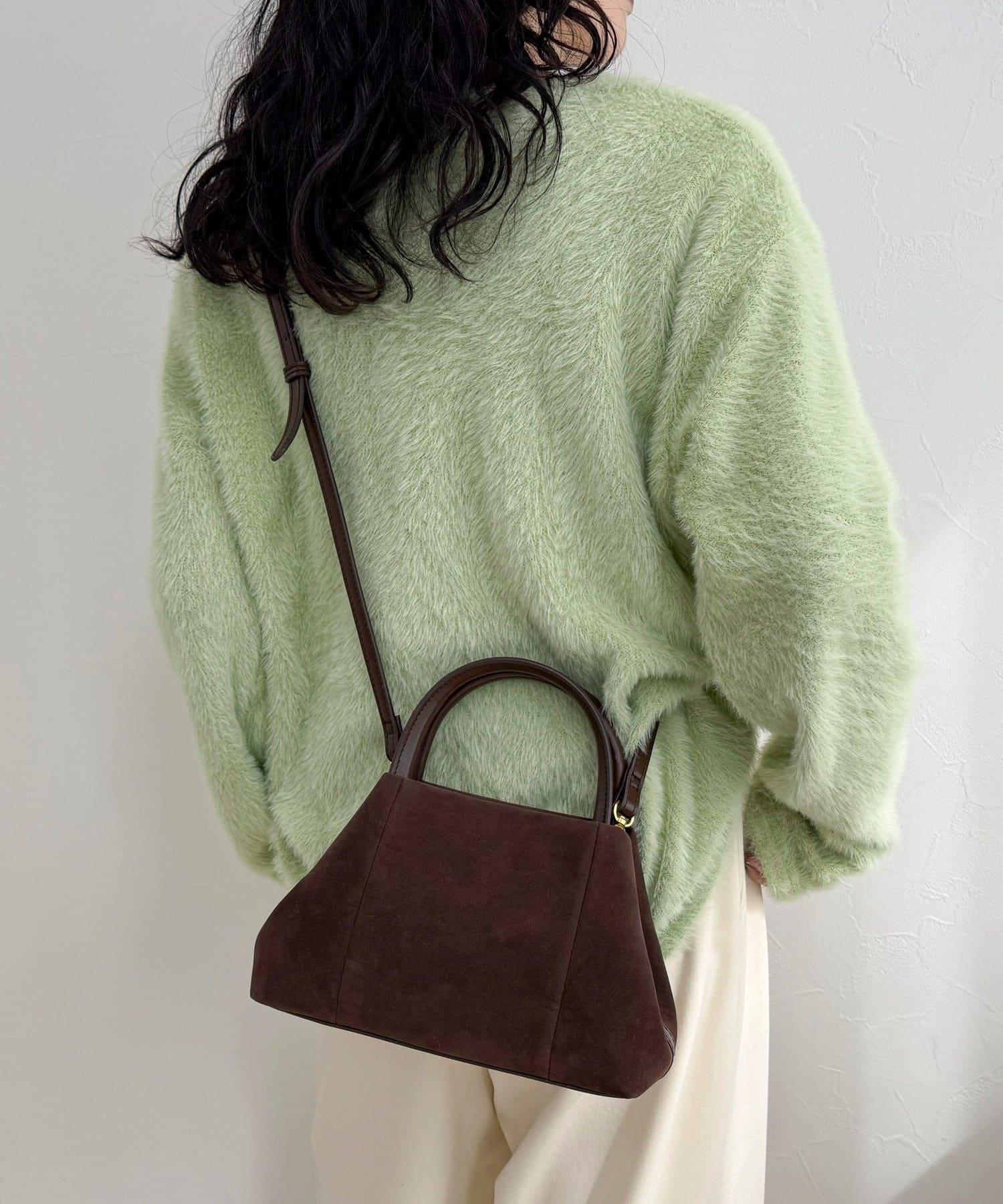 這款手提包採用人造麂皮製成,外形呈橫向長條狀。