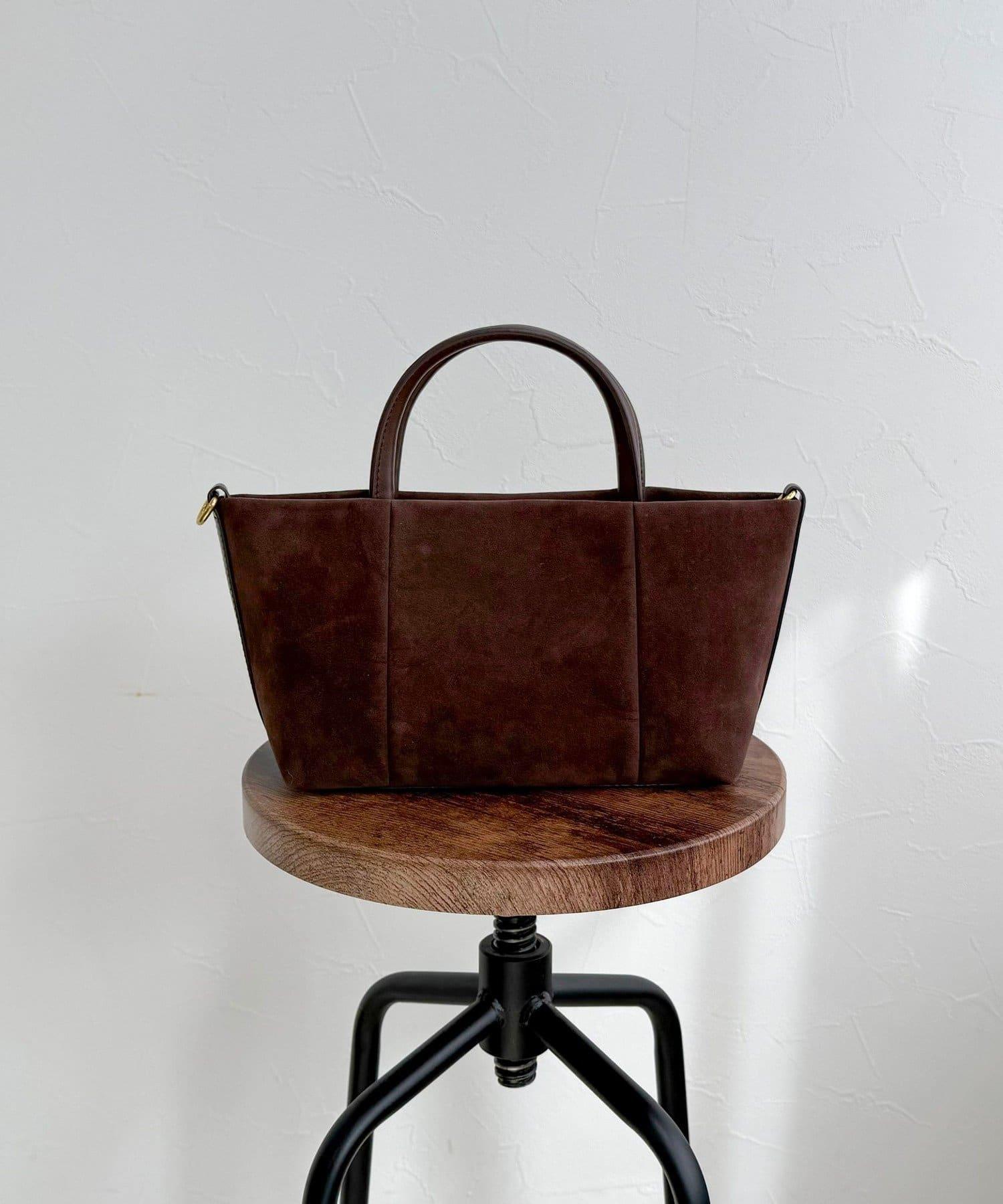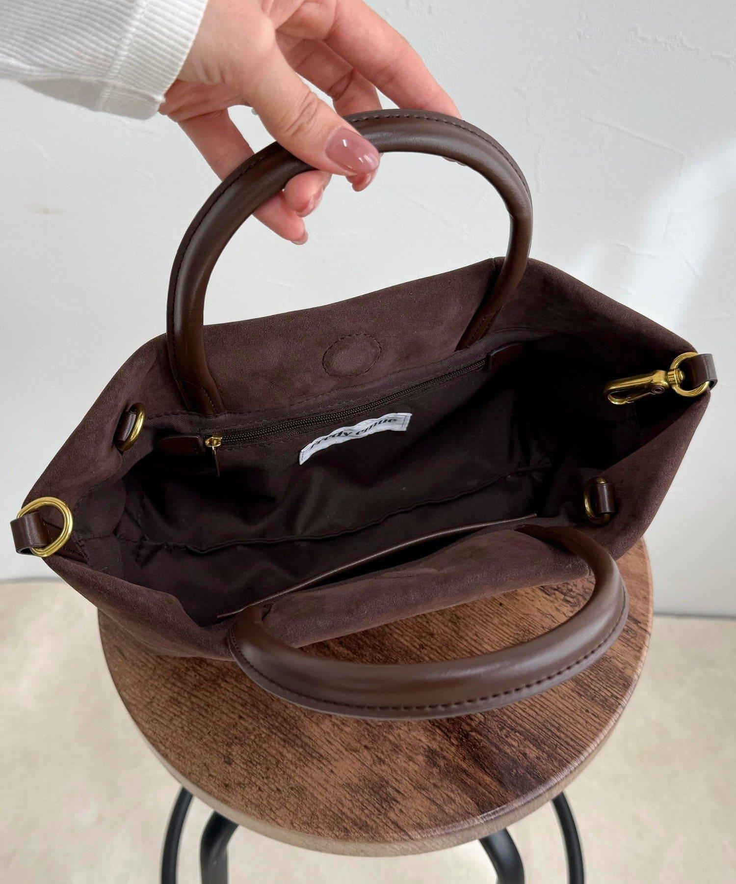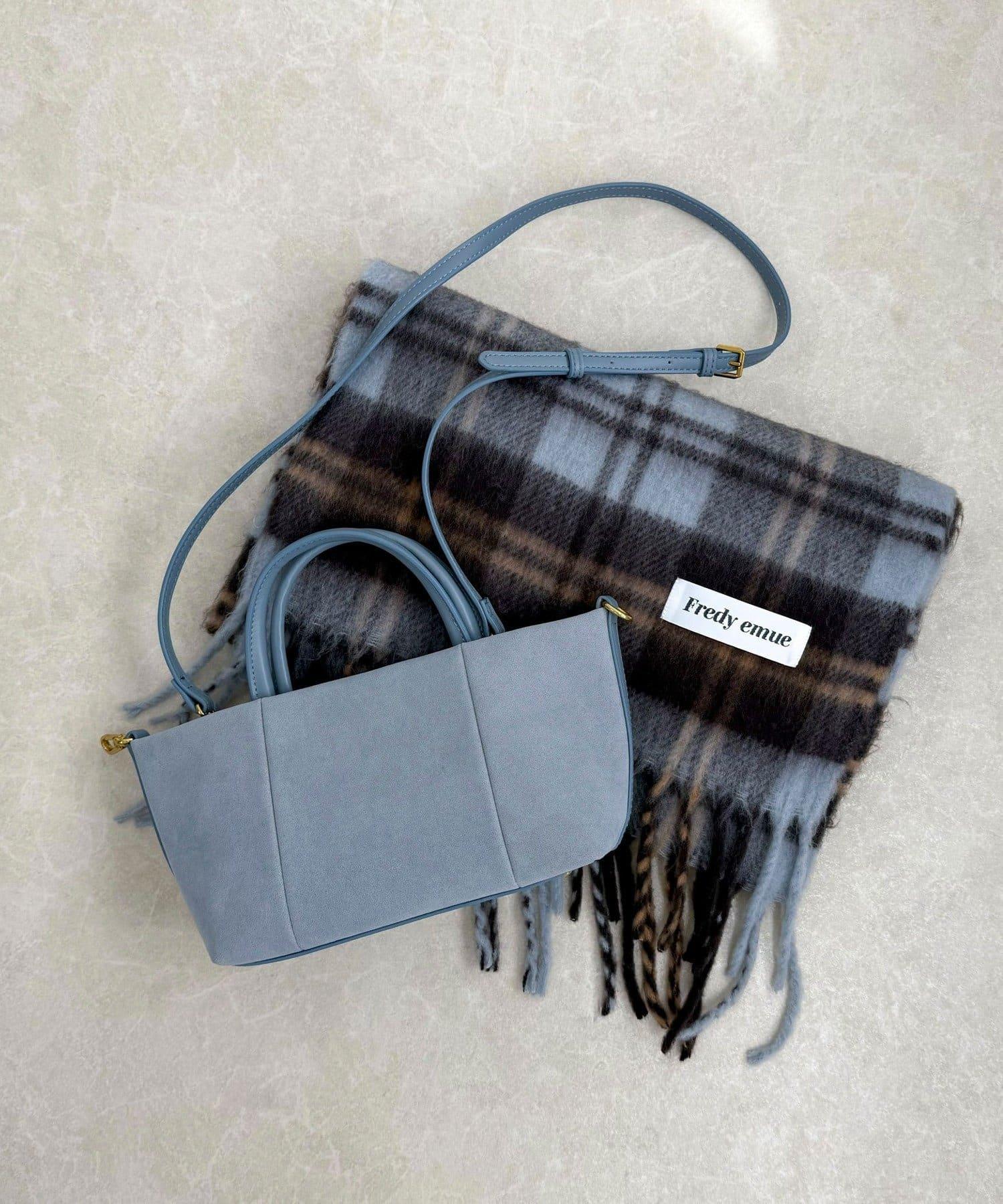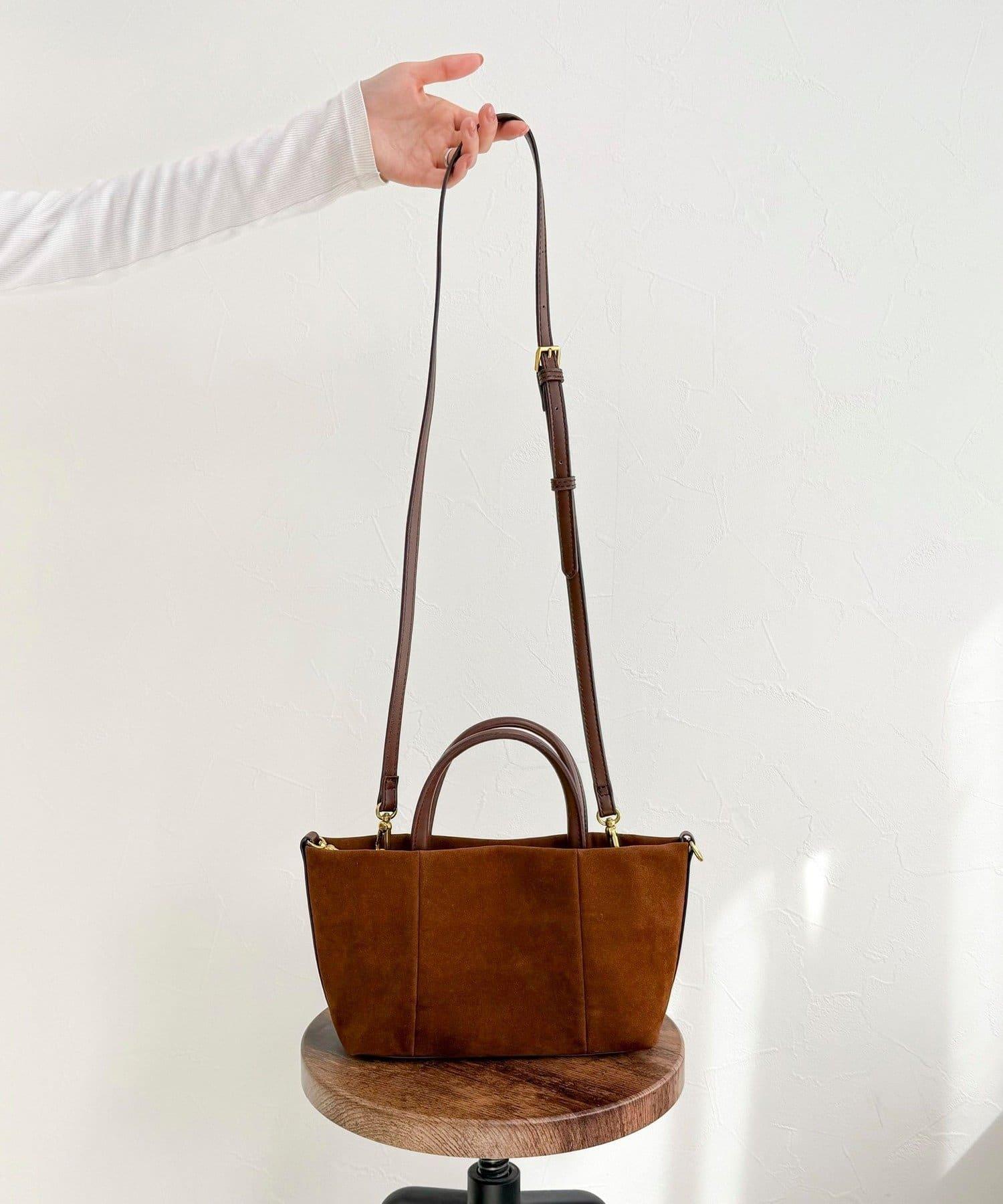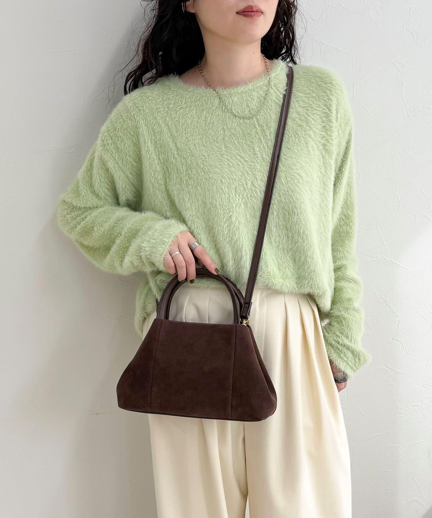 這款手提包採用人造麂皮製成,外形呈橫向長條狀。