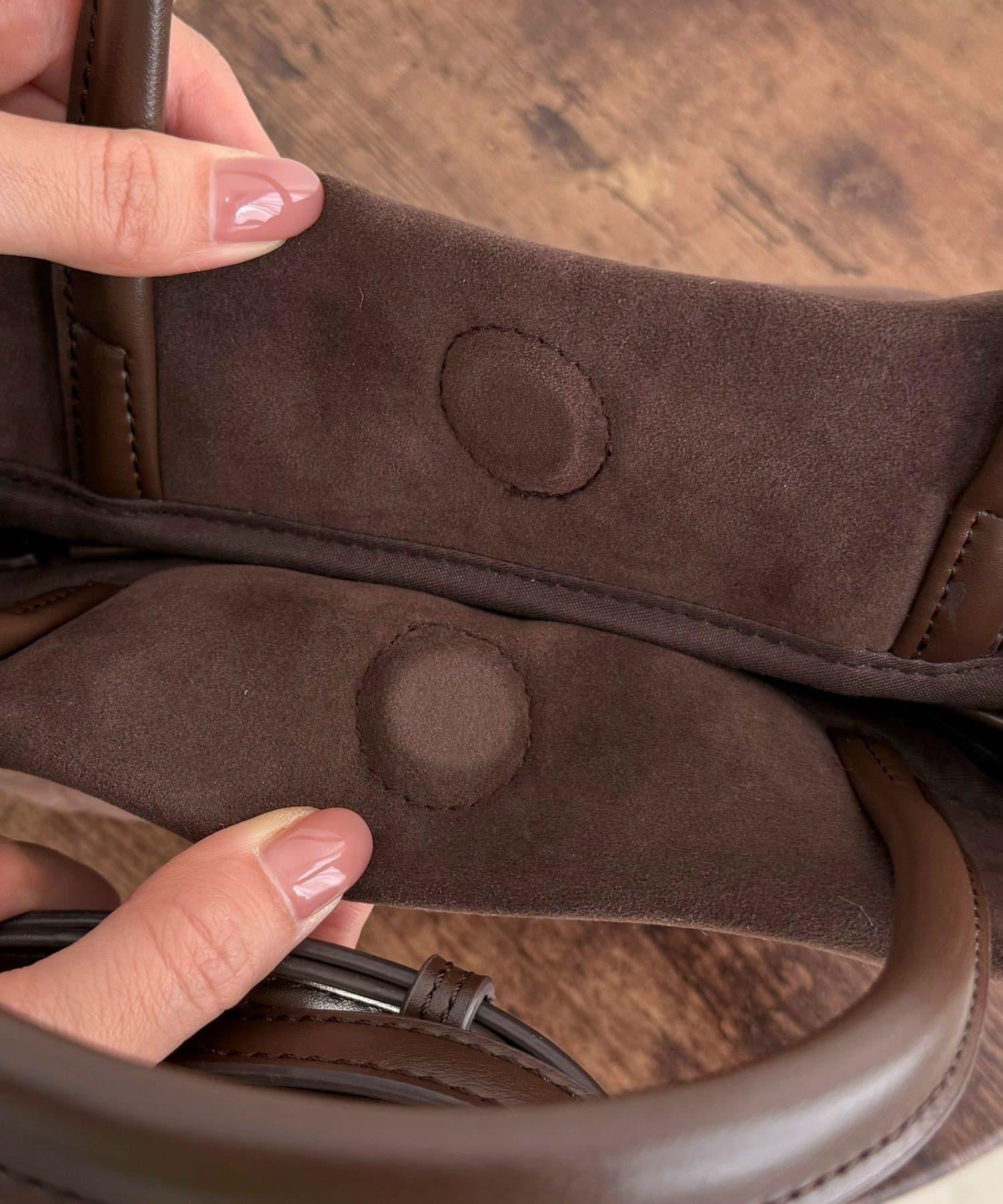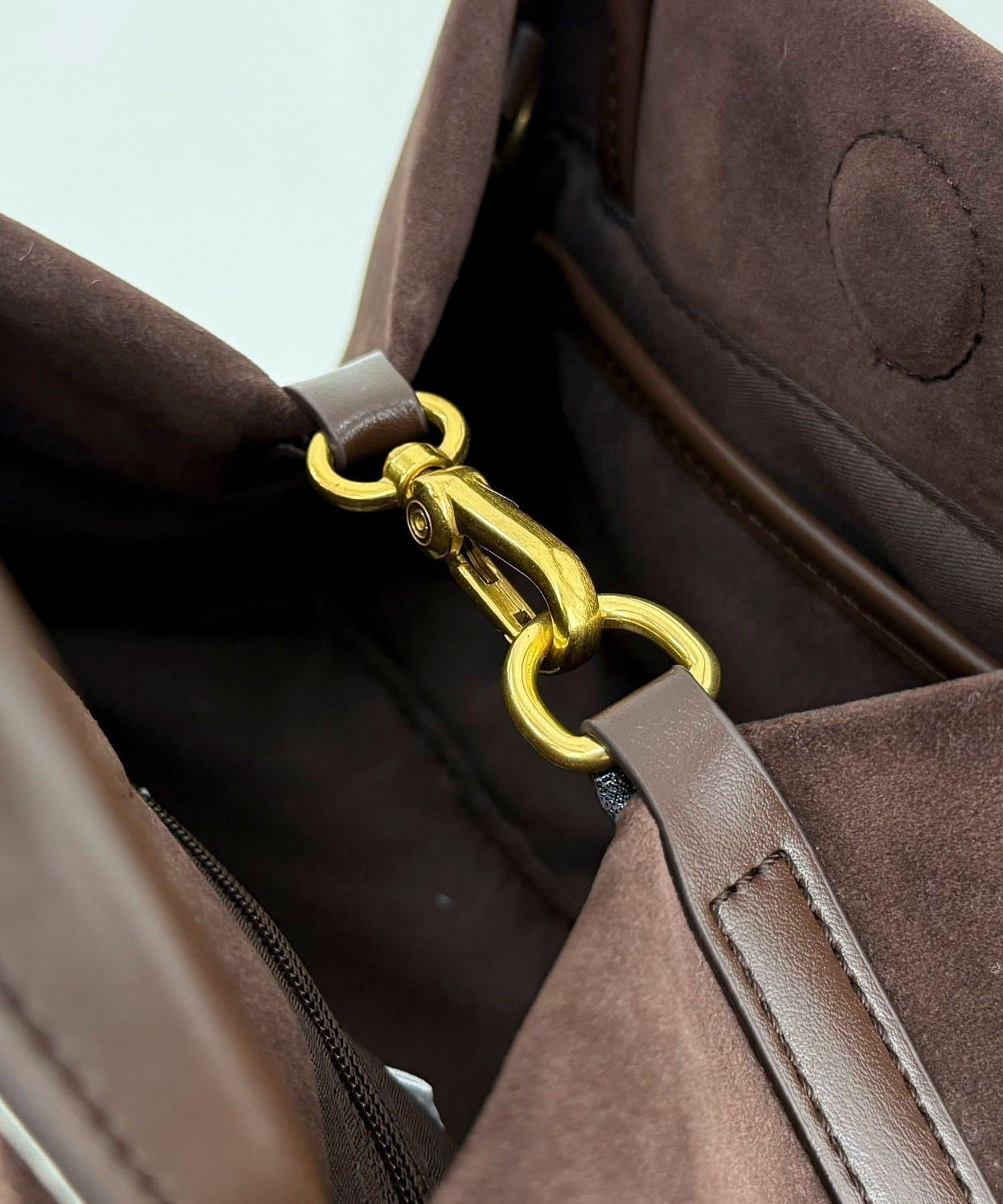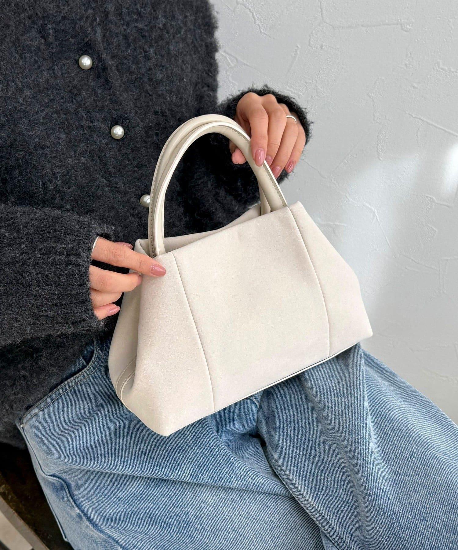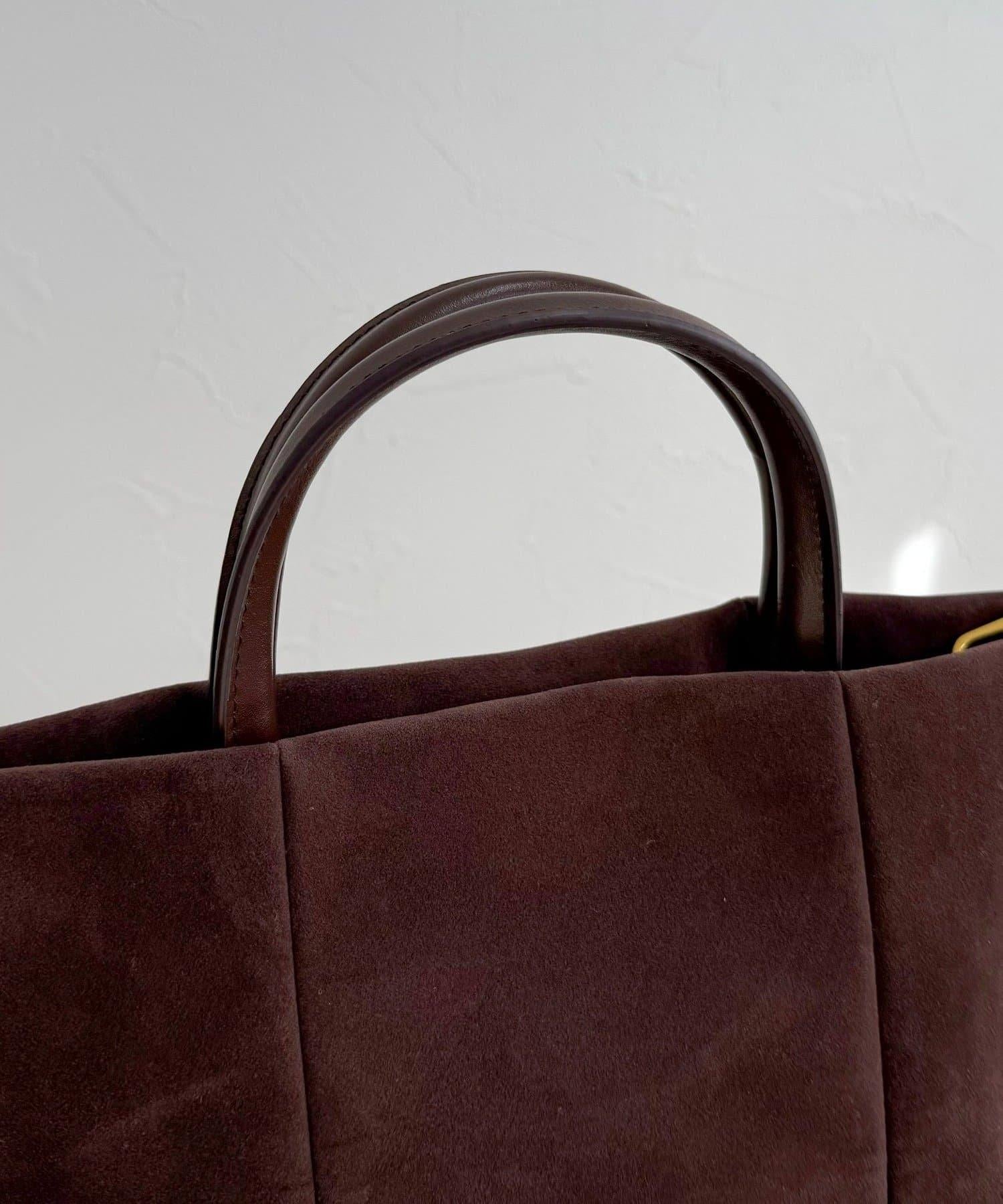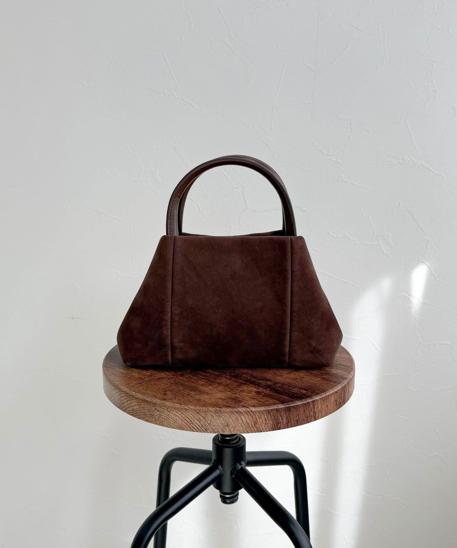 這款手提包採用人造麂皮製成,外形呈橫向長條狀。