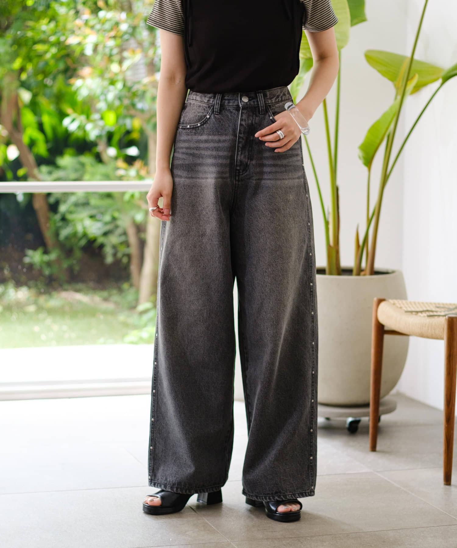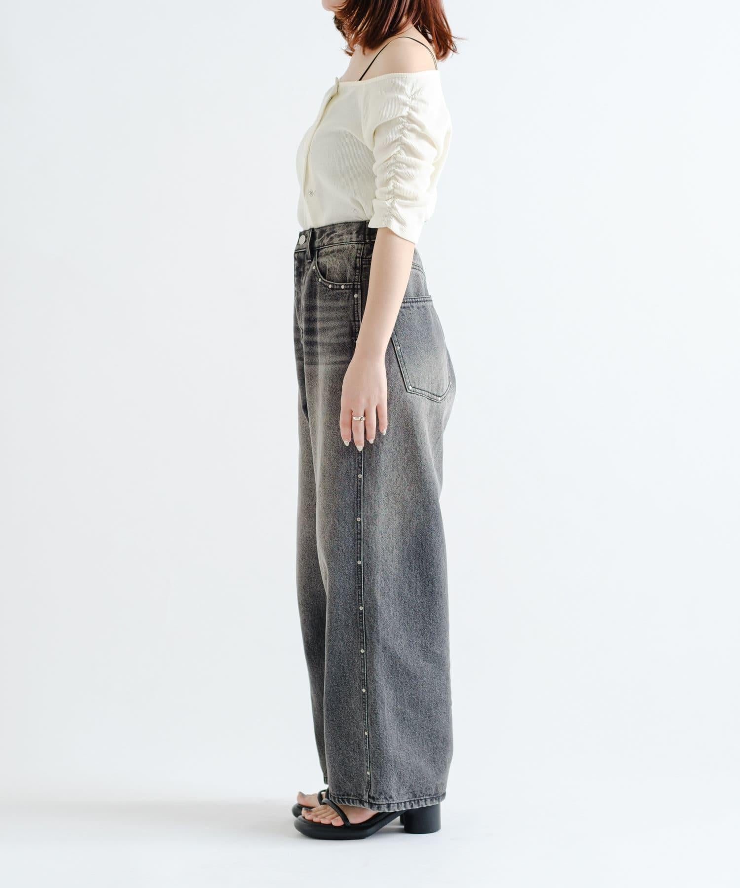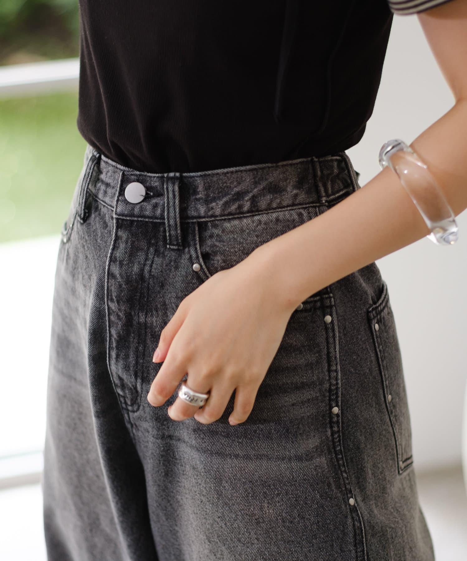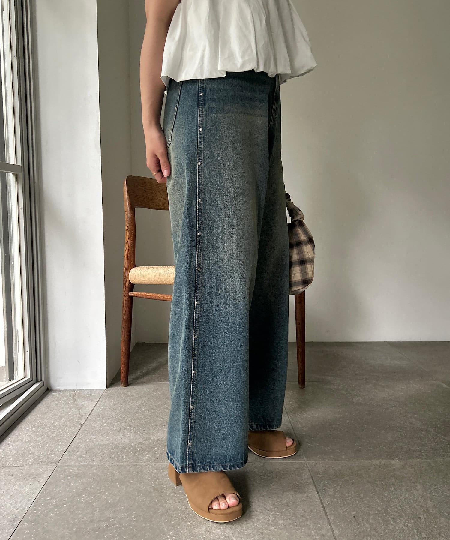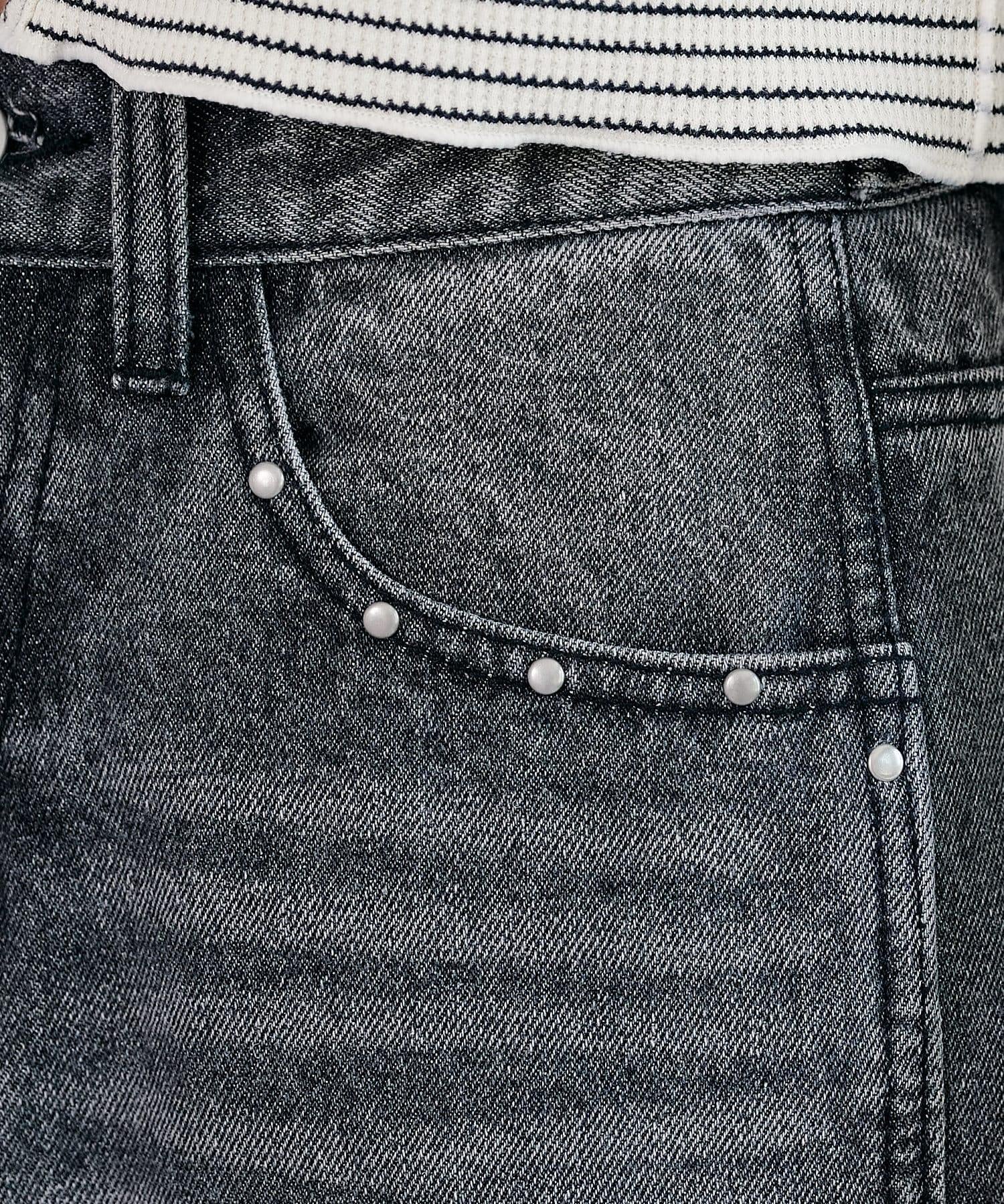 牛仔布料,口袋周圍和兩側有鉚釘。