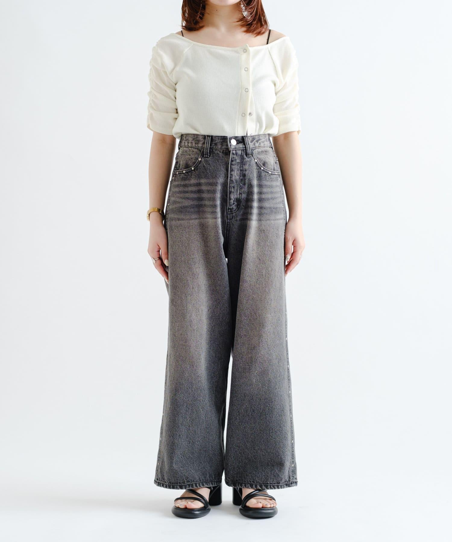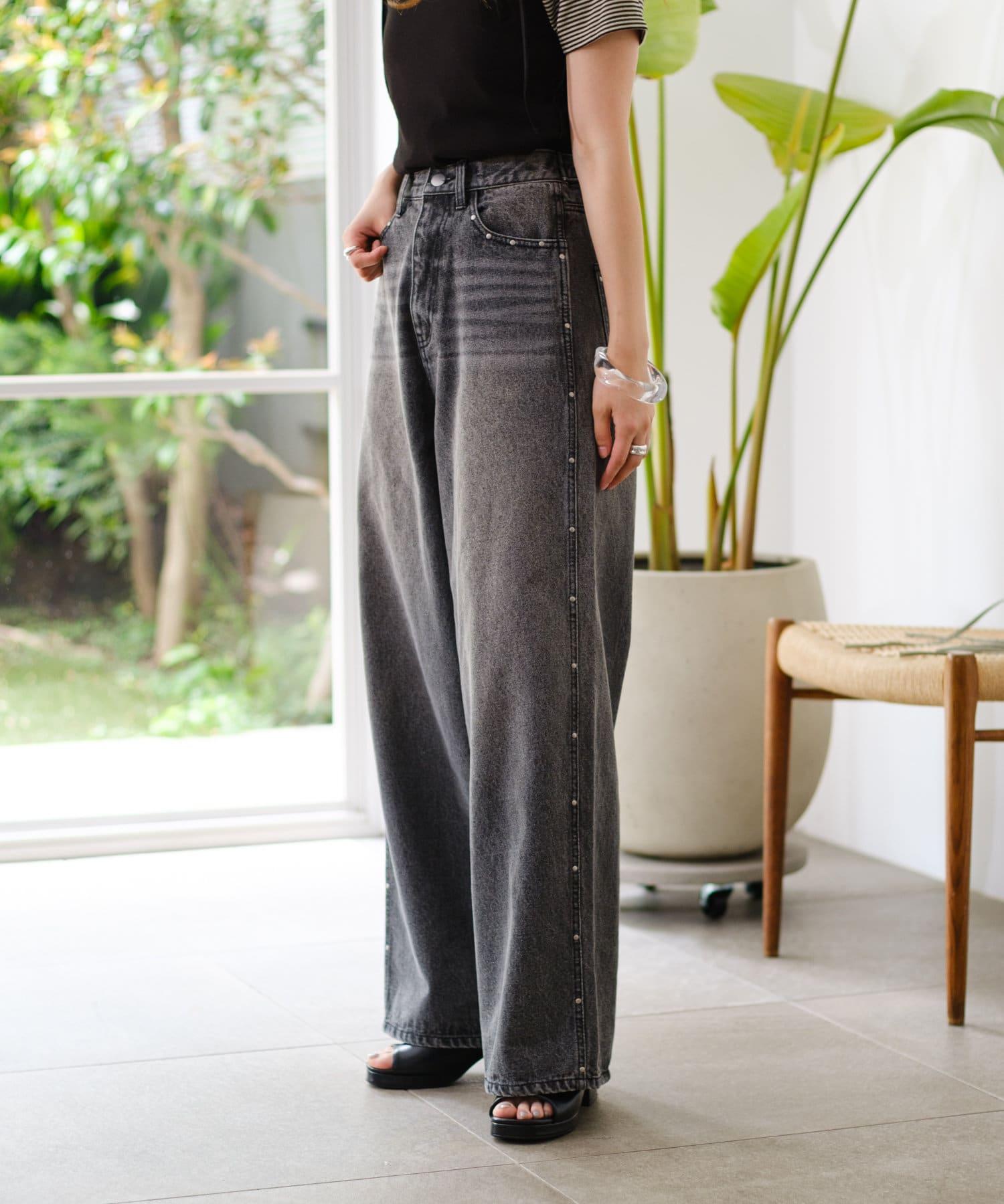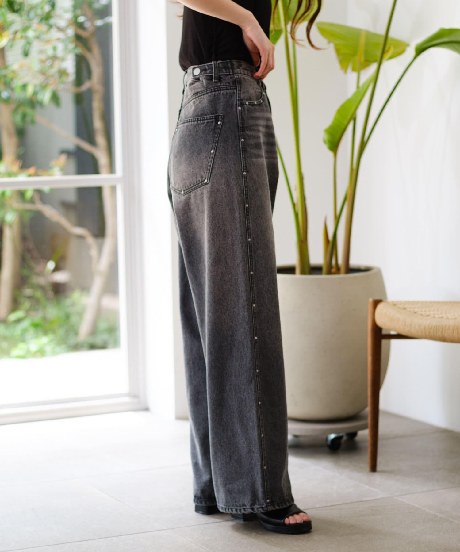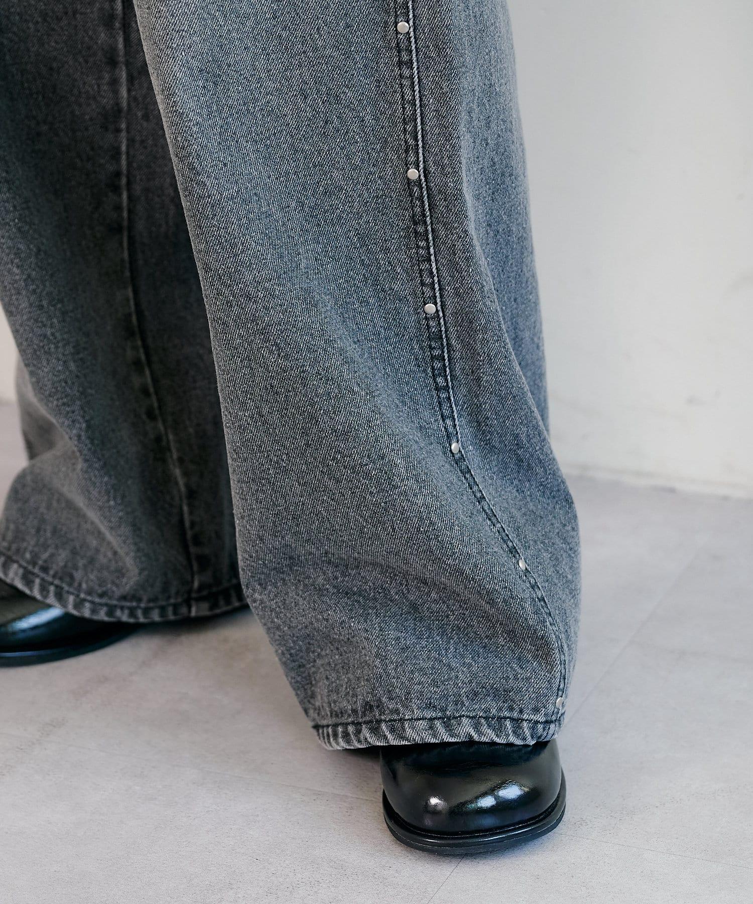 牛仔布料,口袋周圍和兩側有鉚釘。