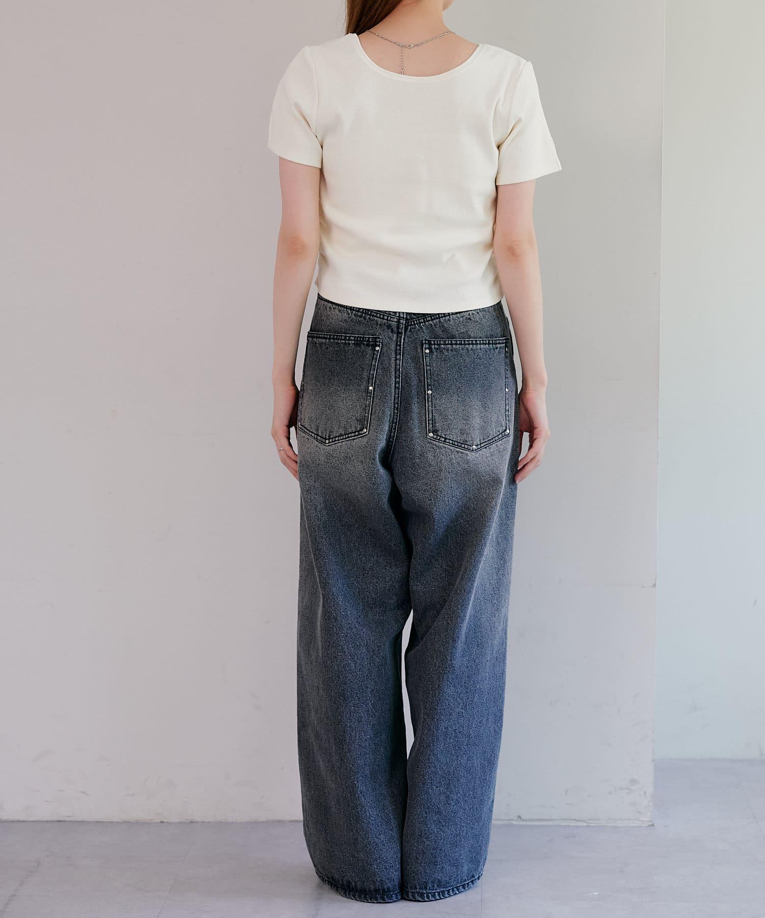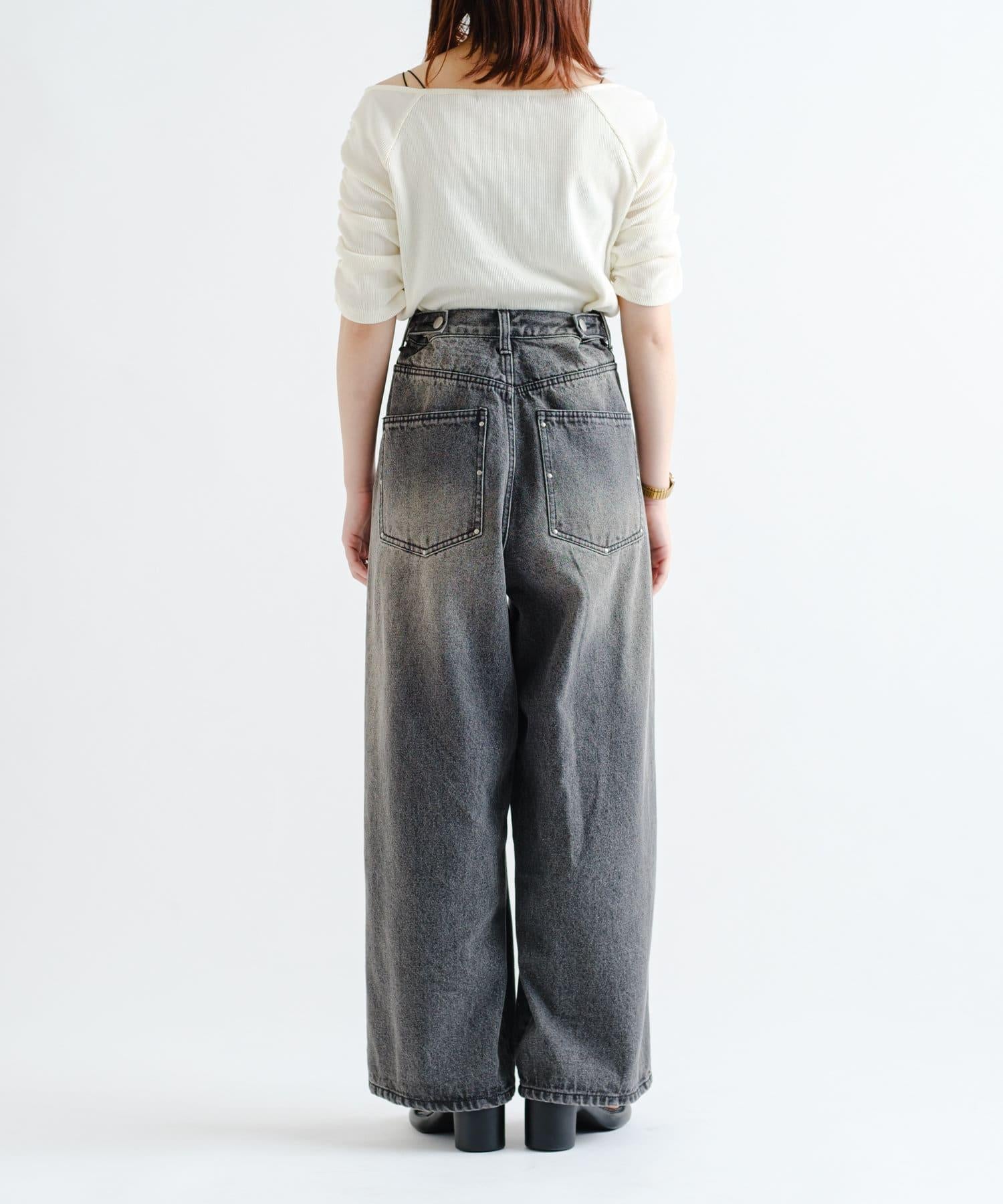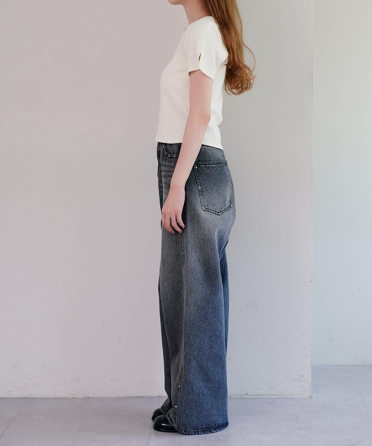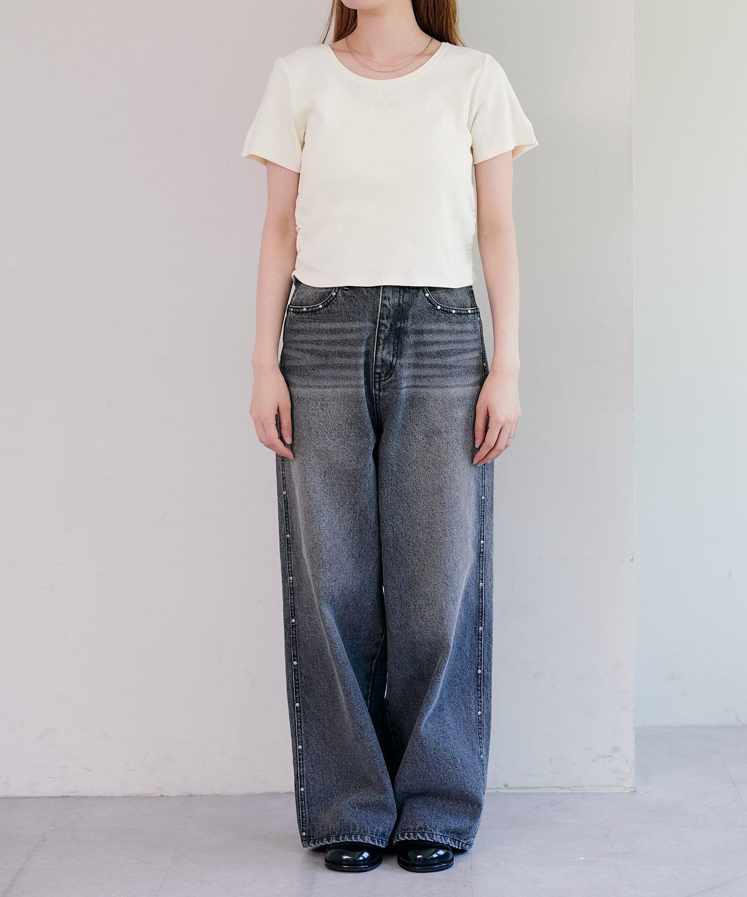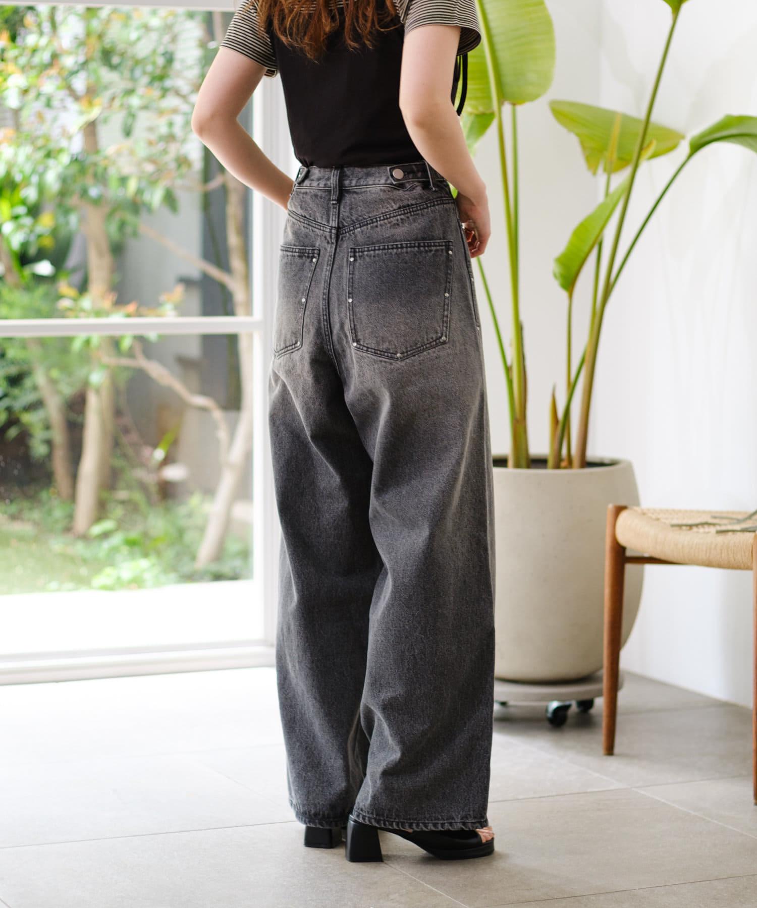 牛仔布料,口袋周圍和兩側有鉚釘。