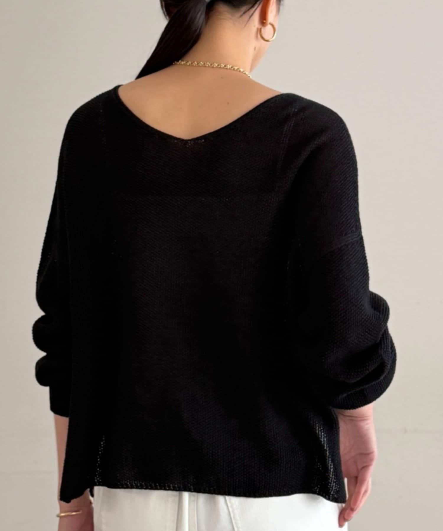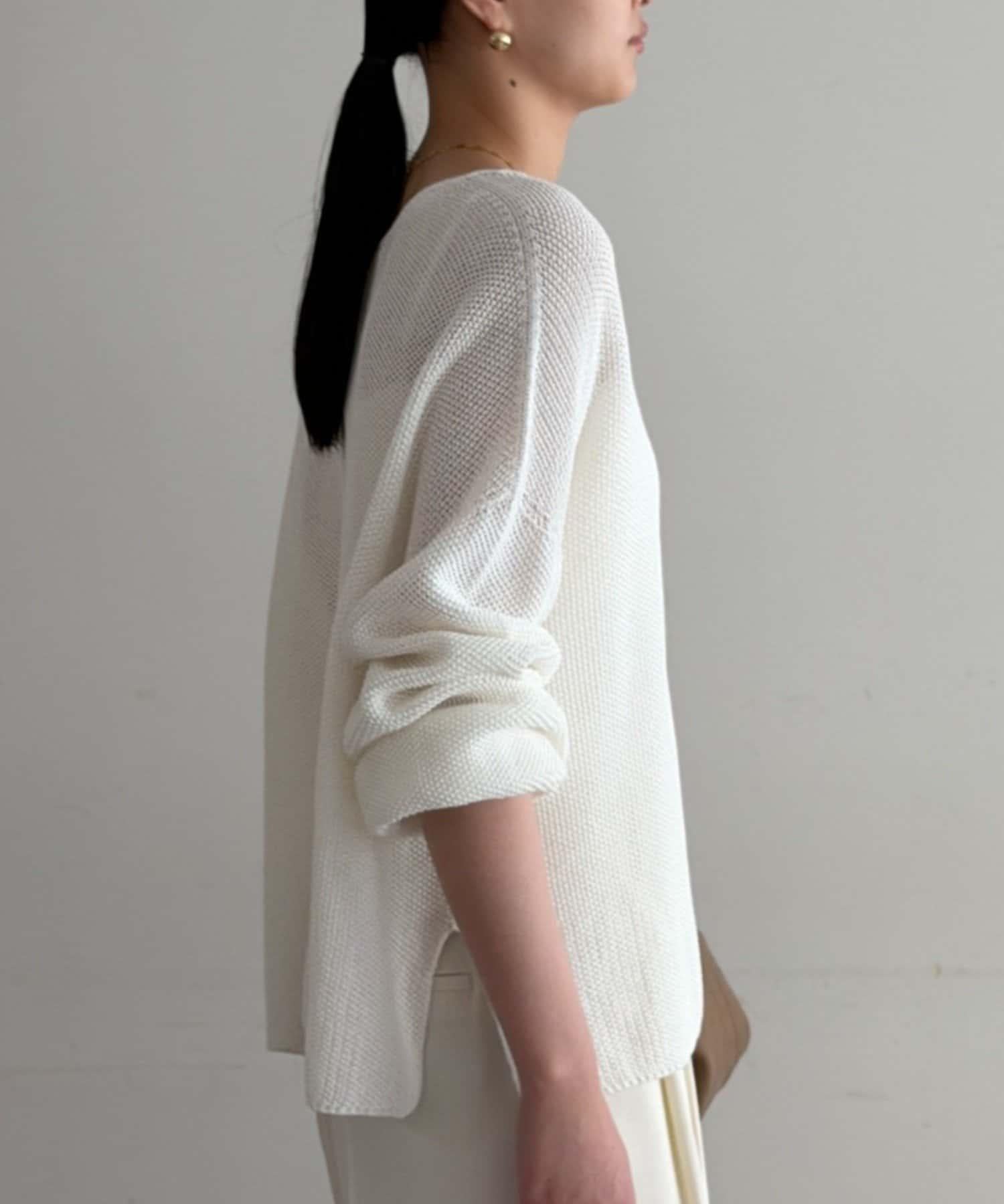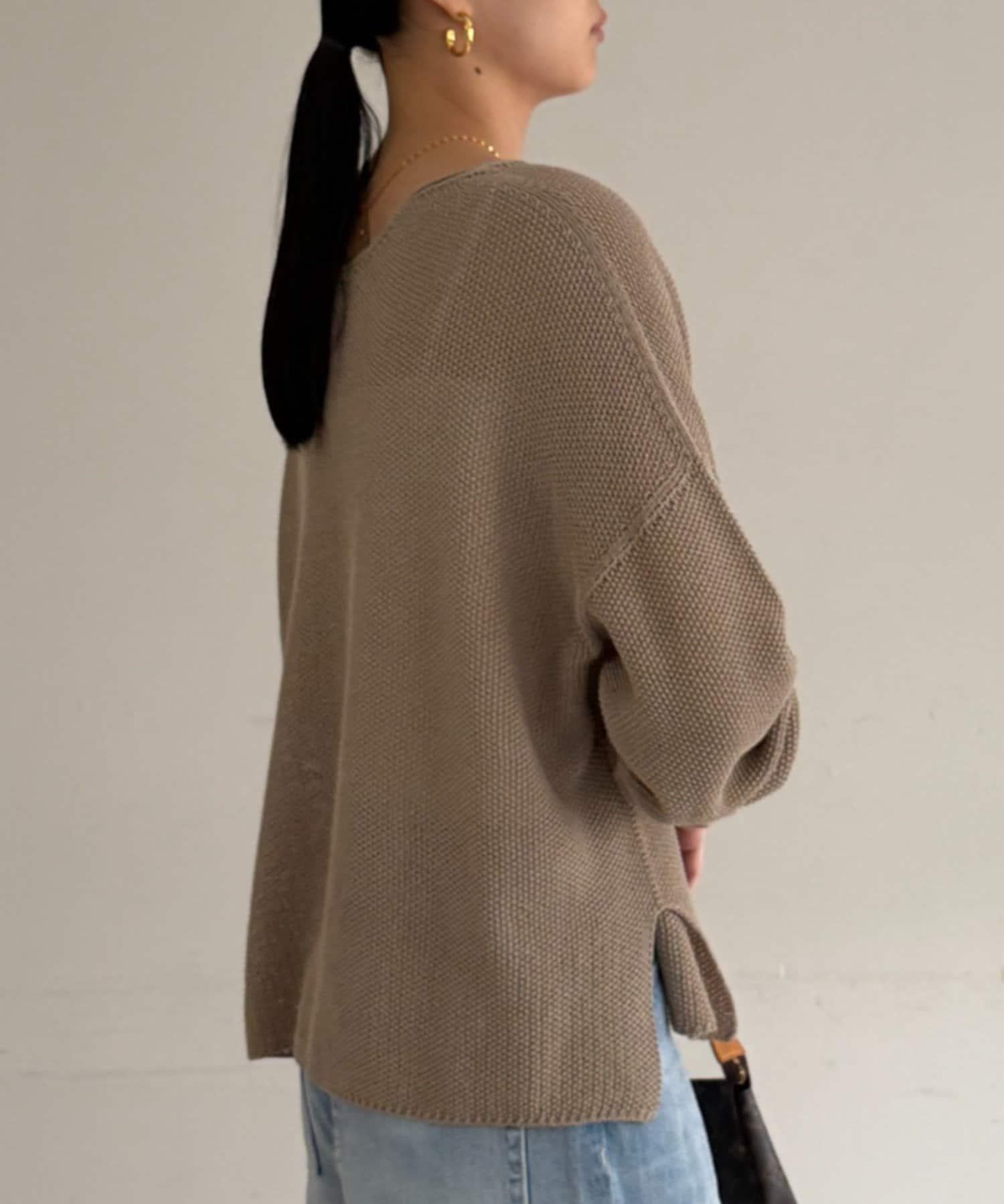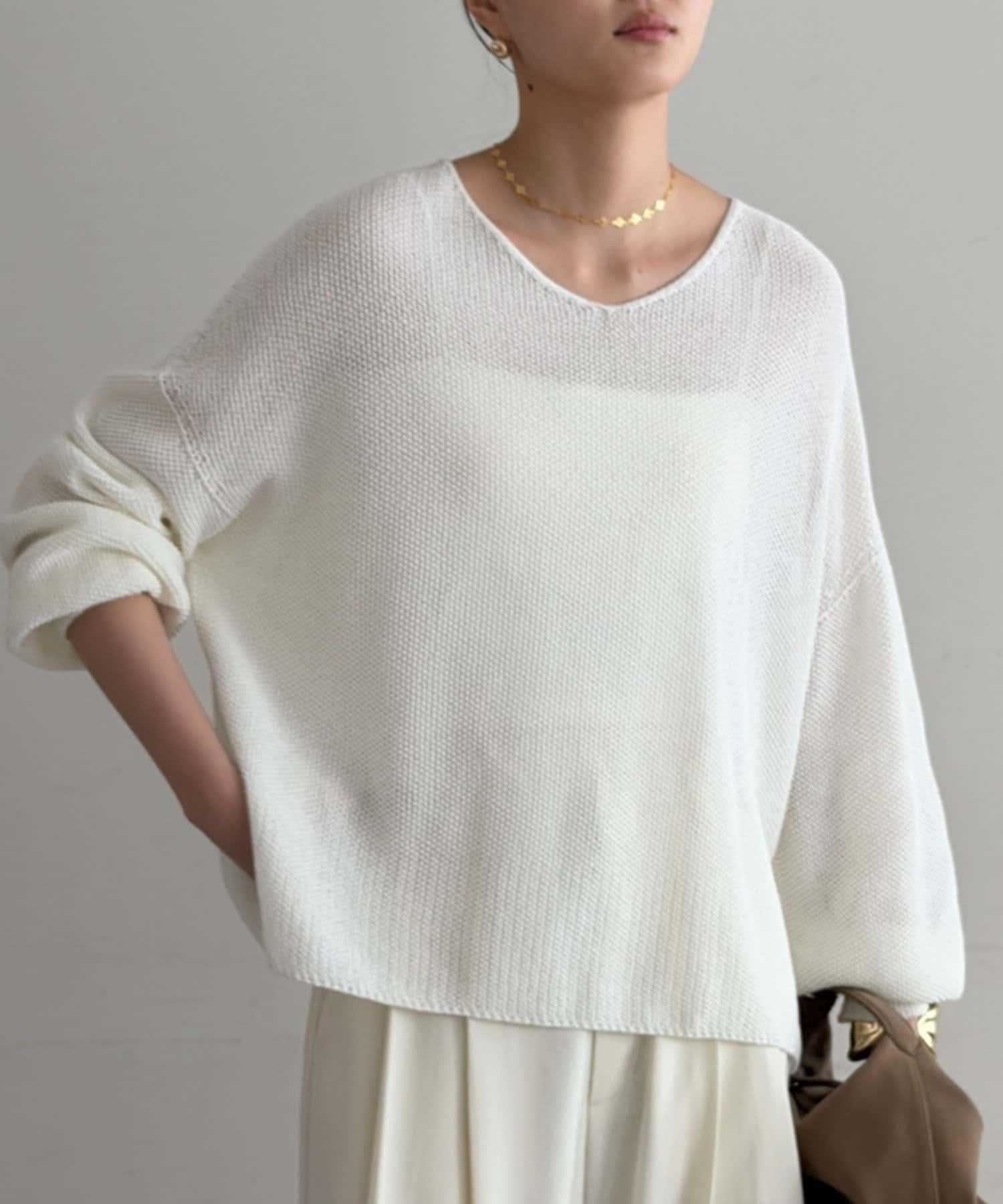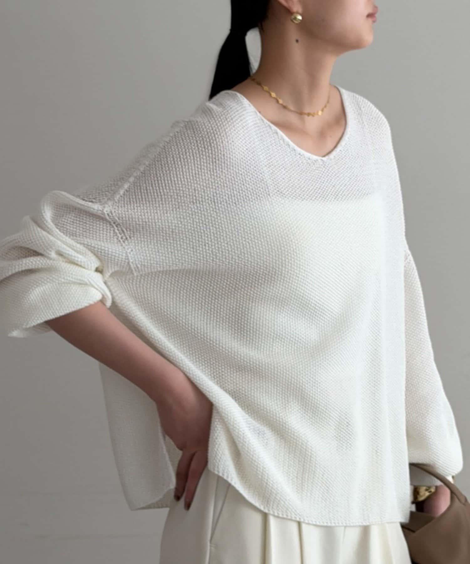 V 領給人簡潔的感覺,圓領則給人優雅的印象。適度寬鬆的版型給人一種輕鬆舒適的感覺,隨意地遮住手臂和腹部。側面開衩的設計,可與任何下裝搭配,打造均衡的造型。