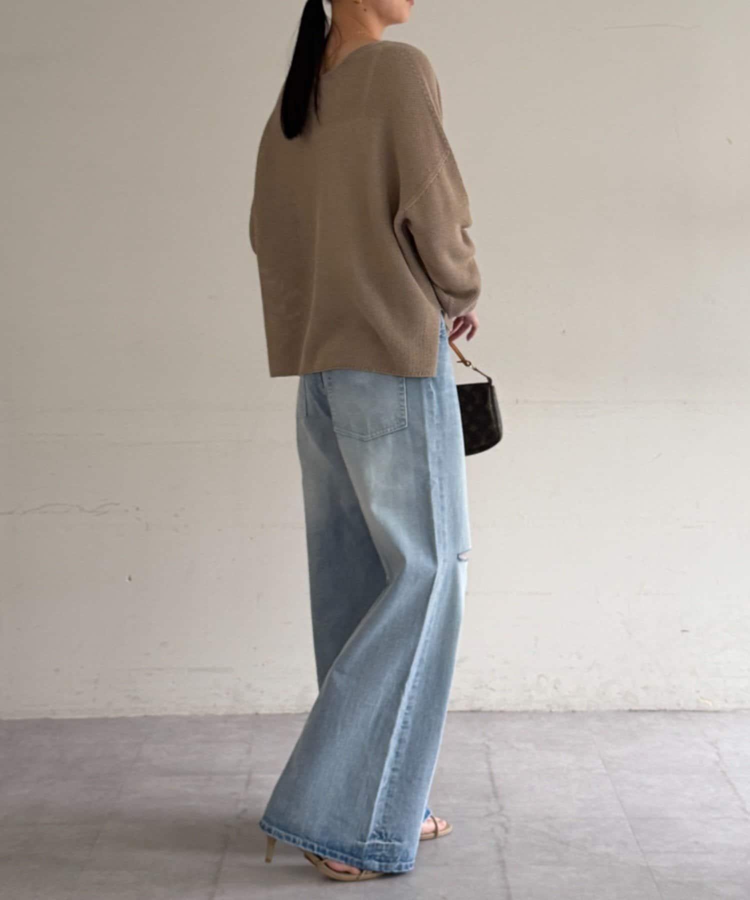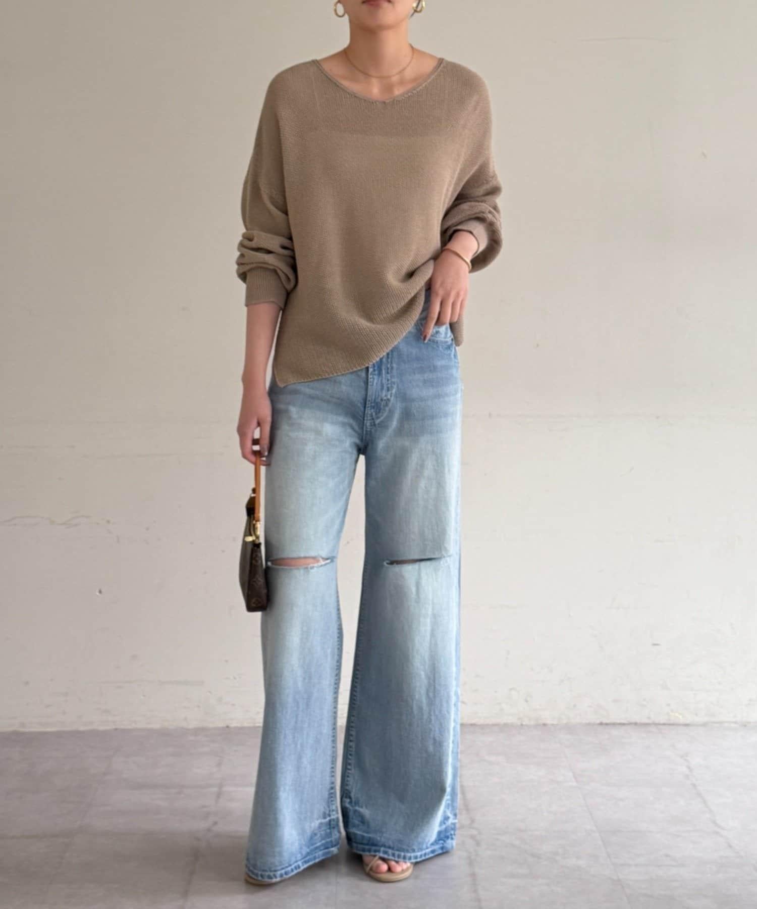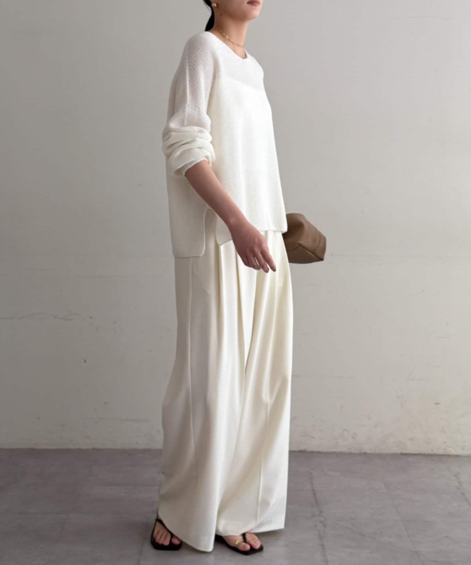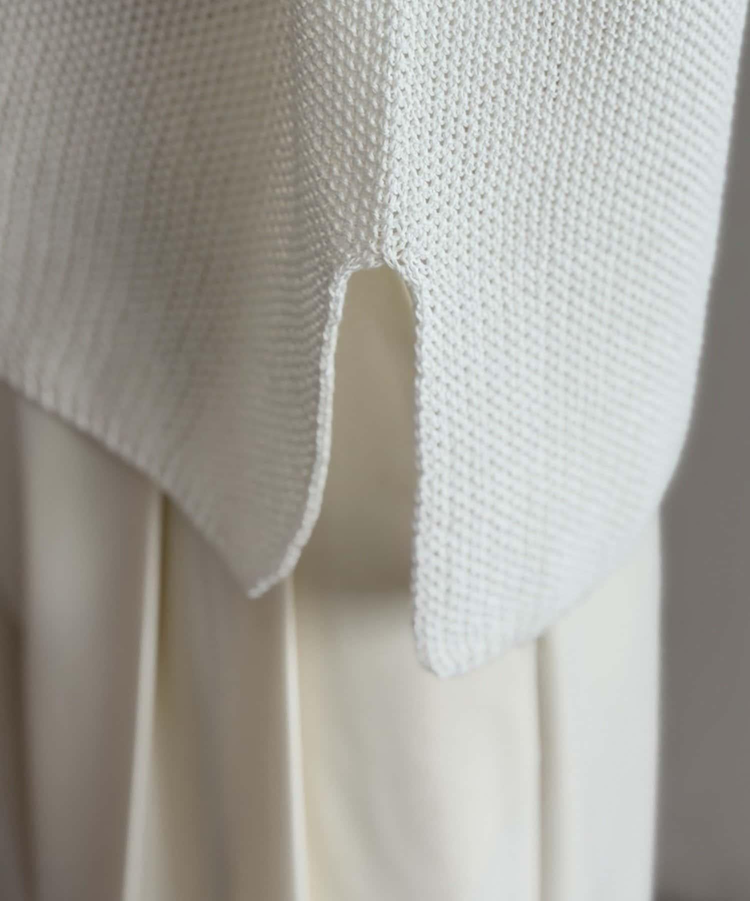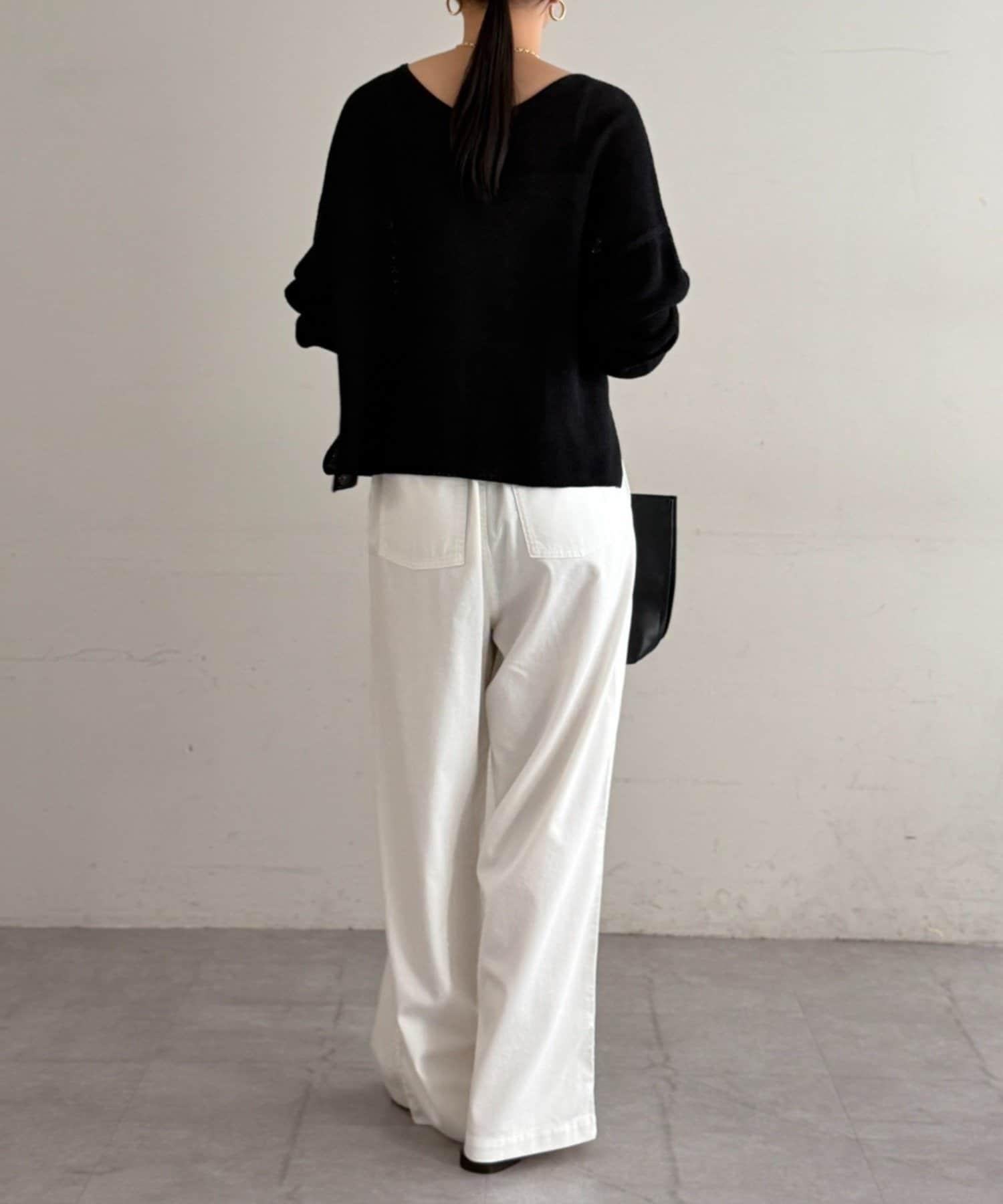 V 領給人簡潔的感覺,圓領則給人優雅的印象。適度寬鬆的版型給人一種輕鬆舒適的感覺,隨意地遮住手臂和腹部。側面開衩的設計,可與任何下裝搭配,打造均衡的造型。
