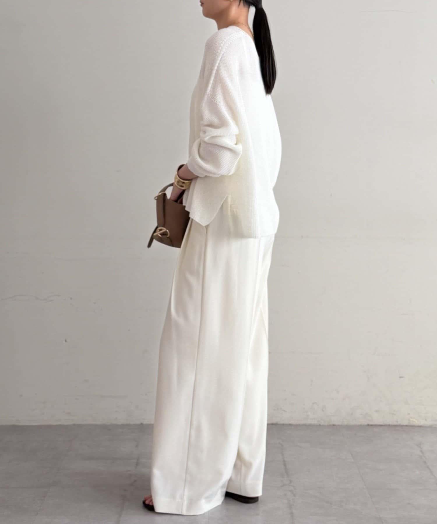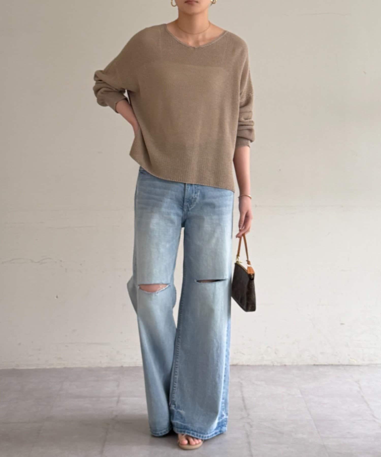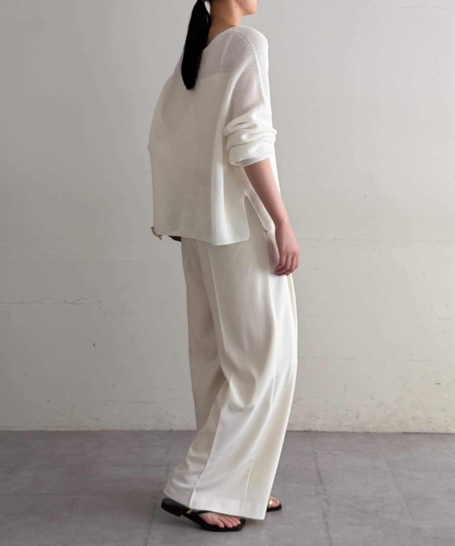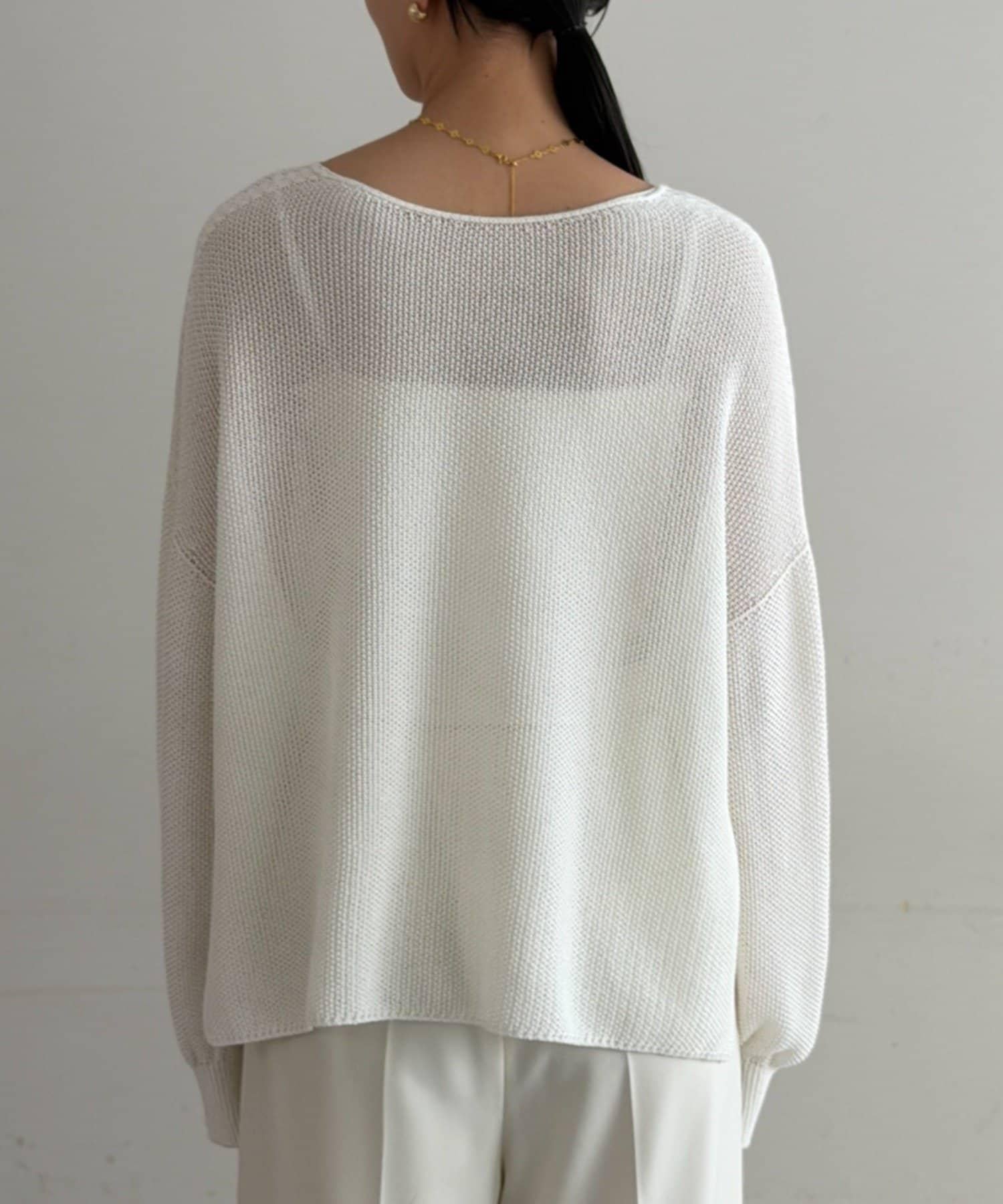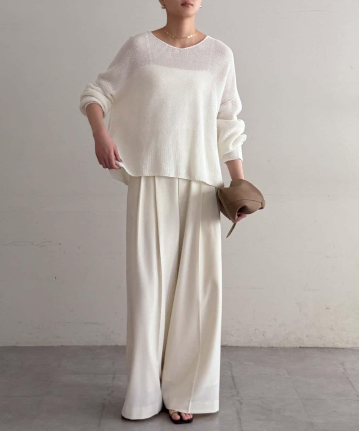 V 領給人簡潔的感覺,圓領則給人優雅的印象。適度寬鬆的版型給人一種輕鬆舒適的感覺,隨意地遮住手臂和腹部。側面開衩的設計,可與任何下裝搭配,打造均衡的造型。