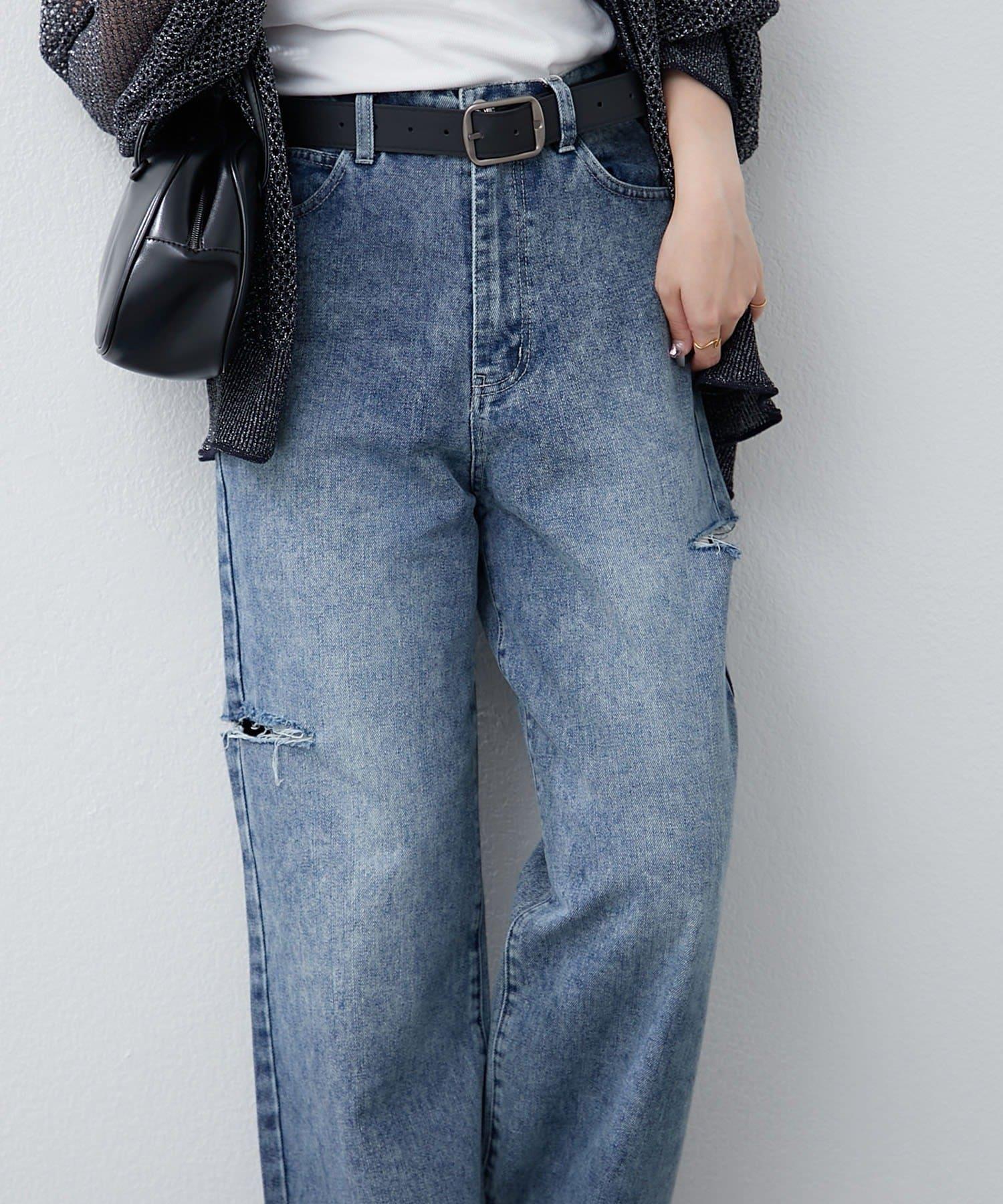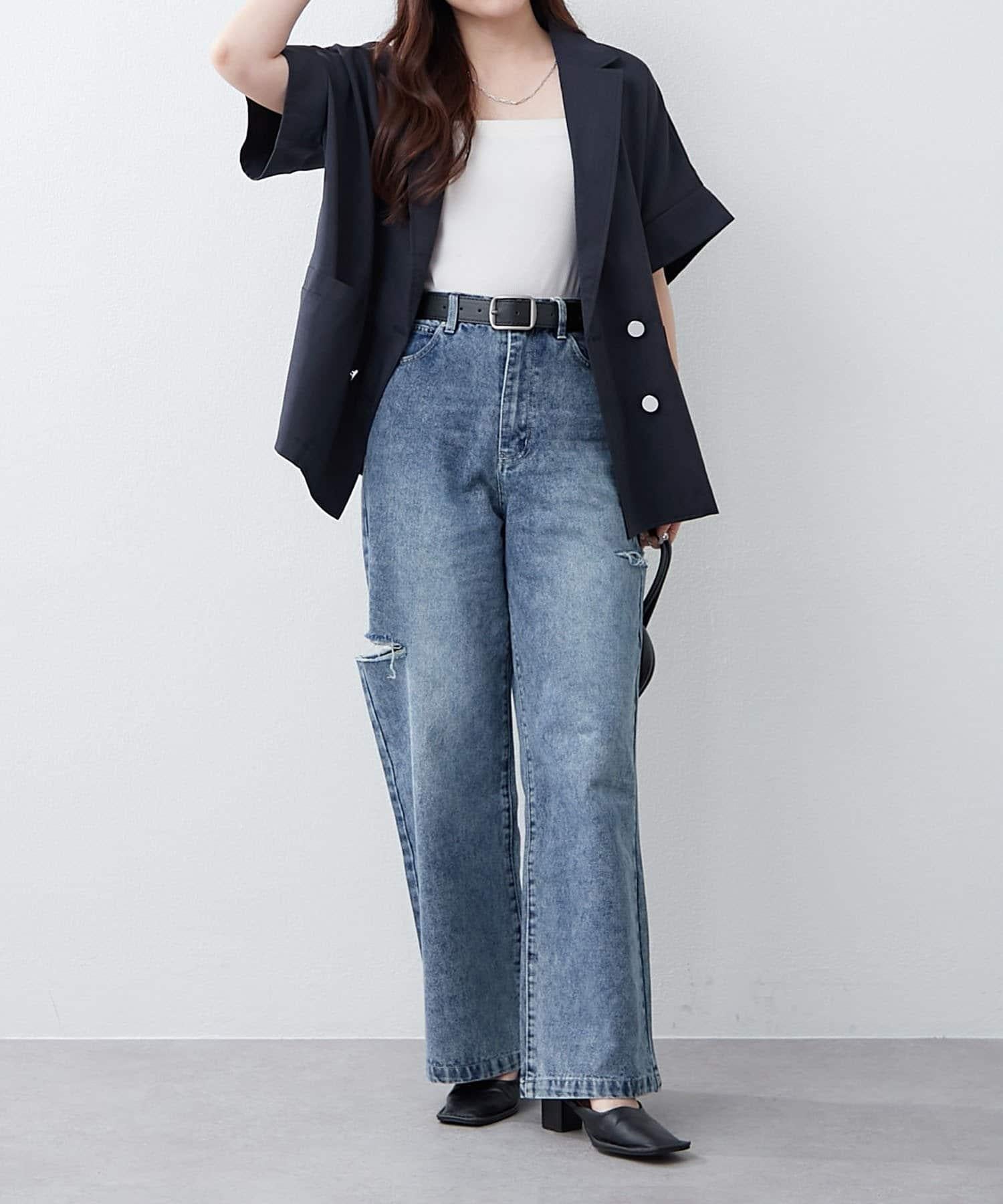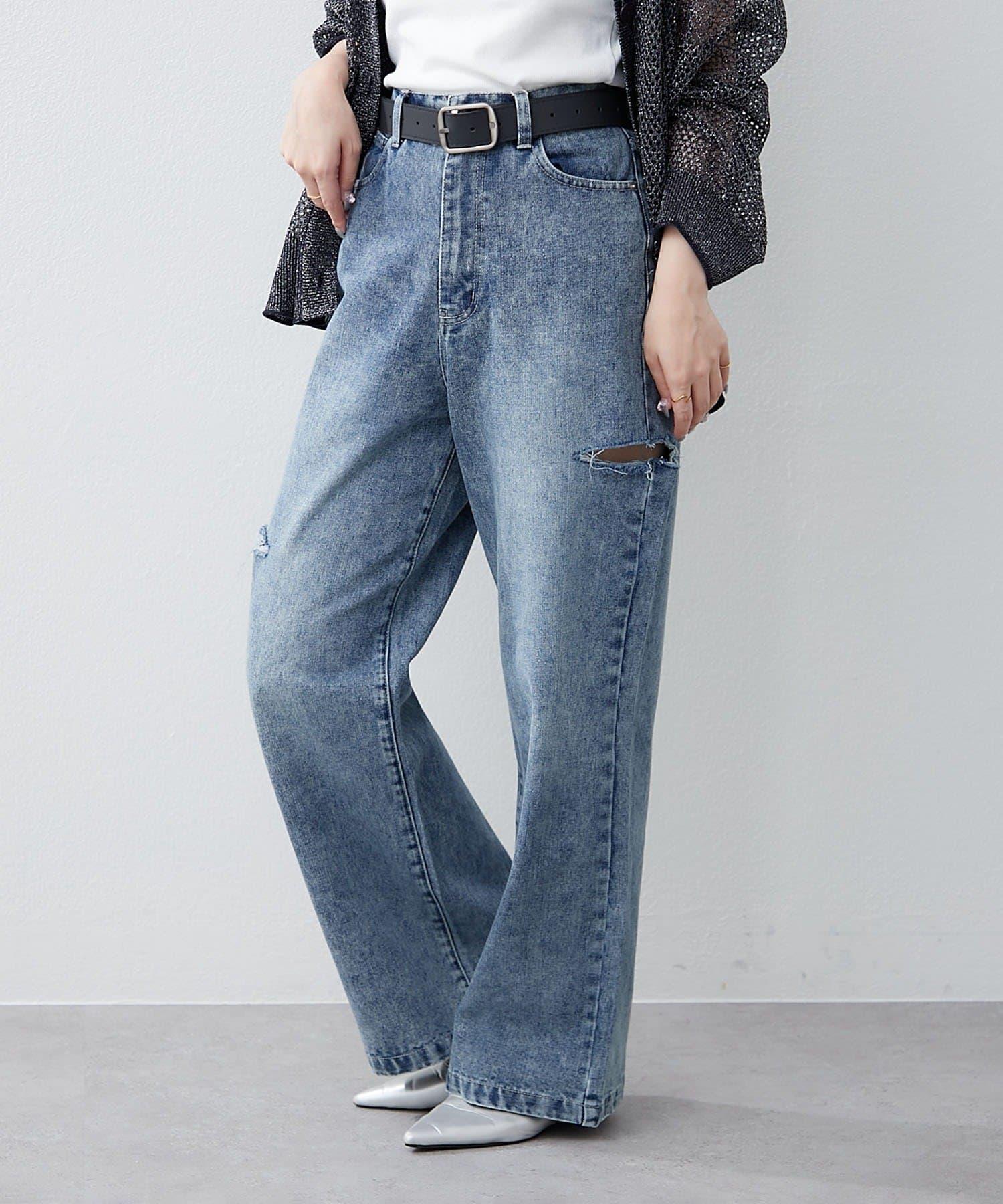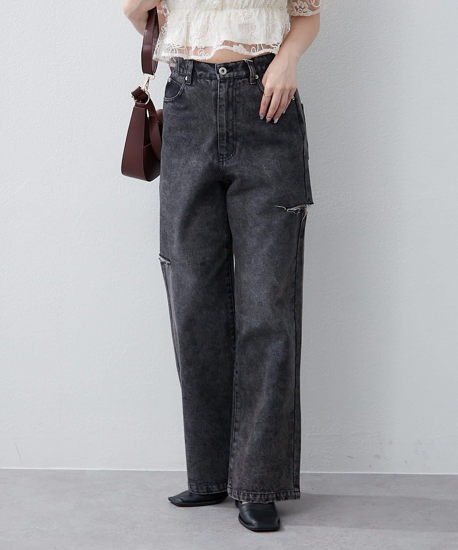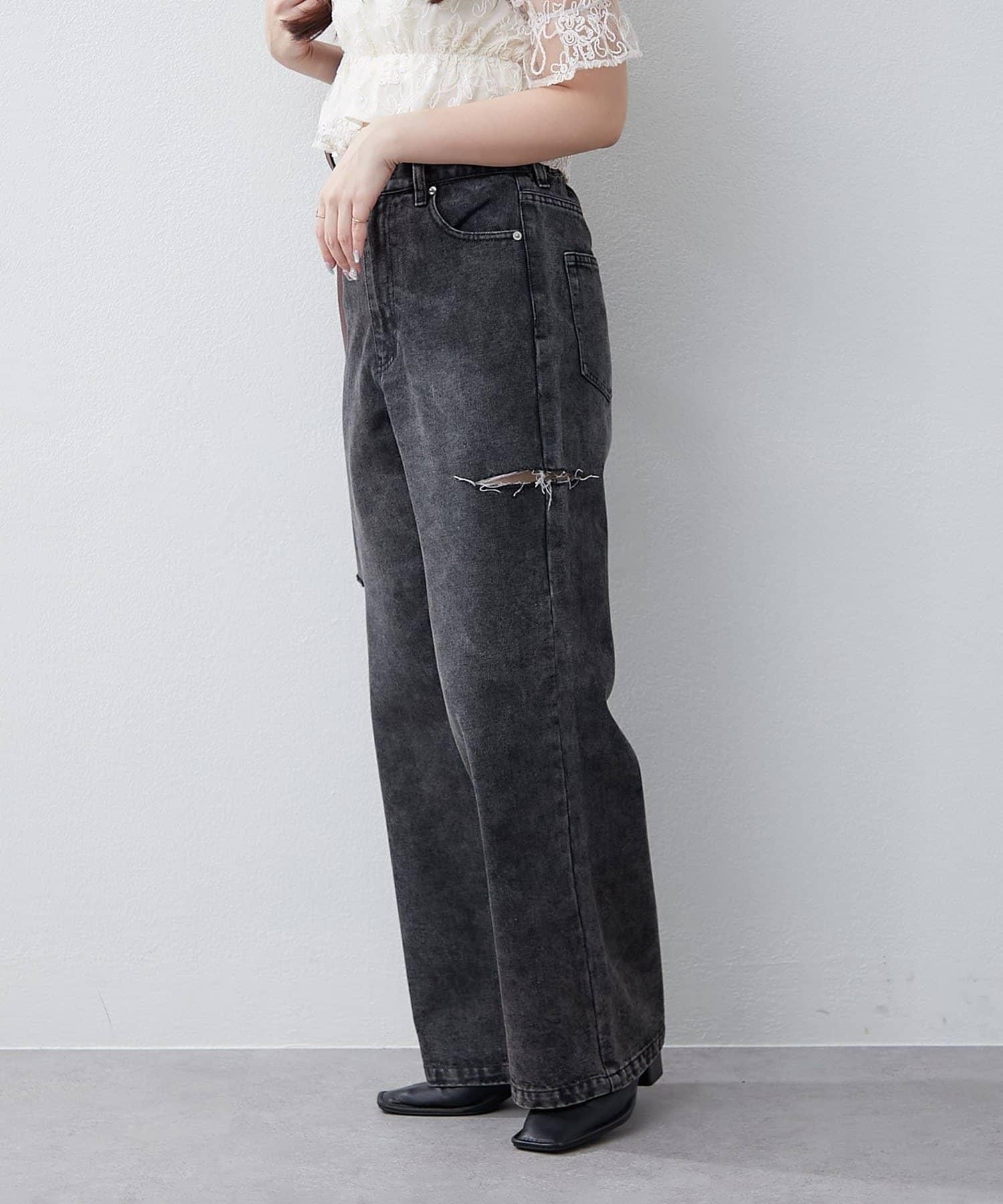 牛仔長褲,左右兩側有不同高度的破損開衩。