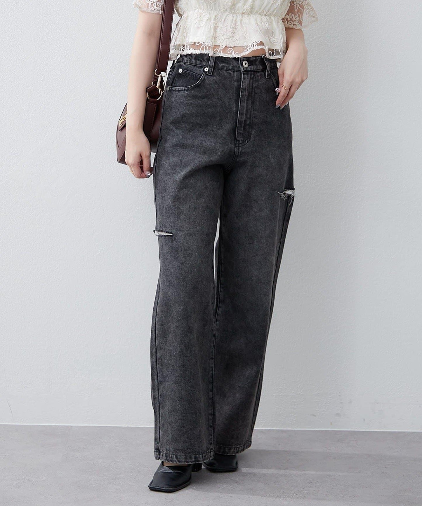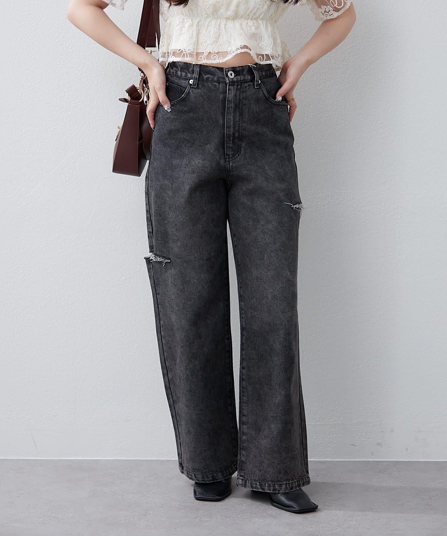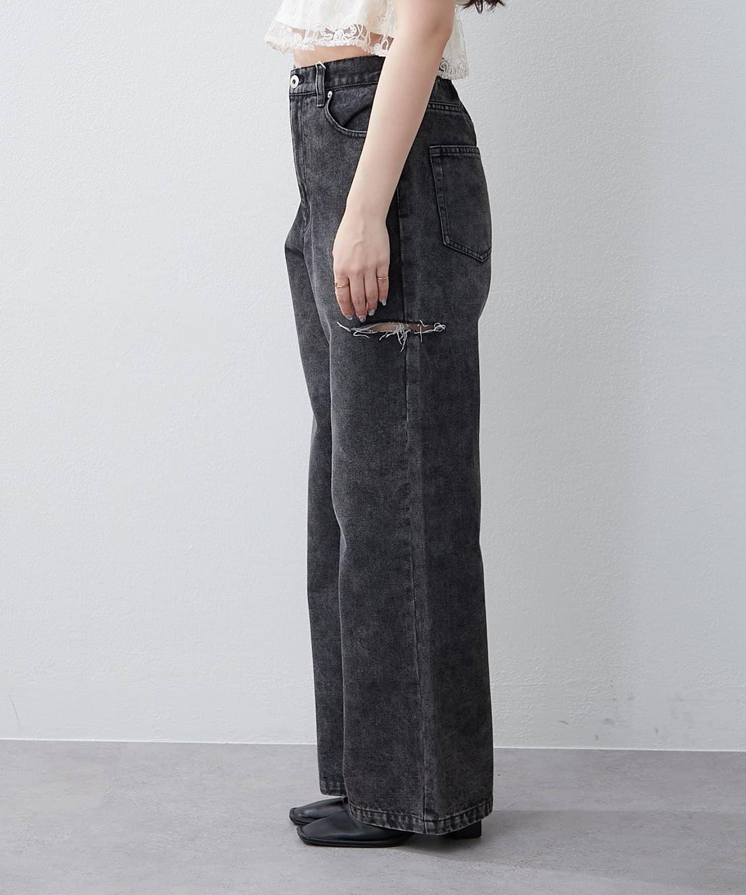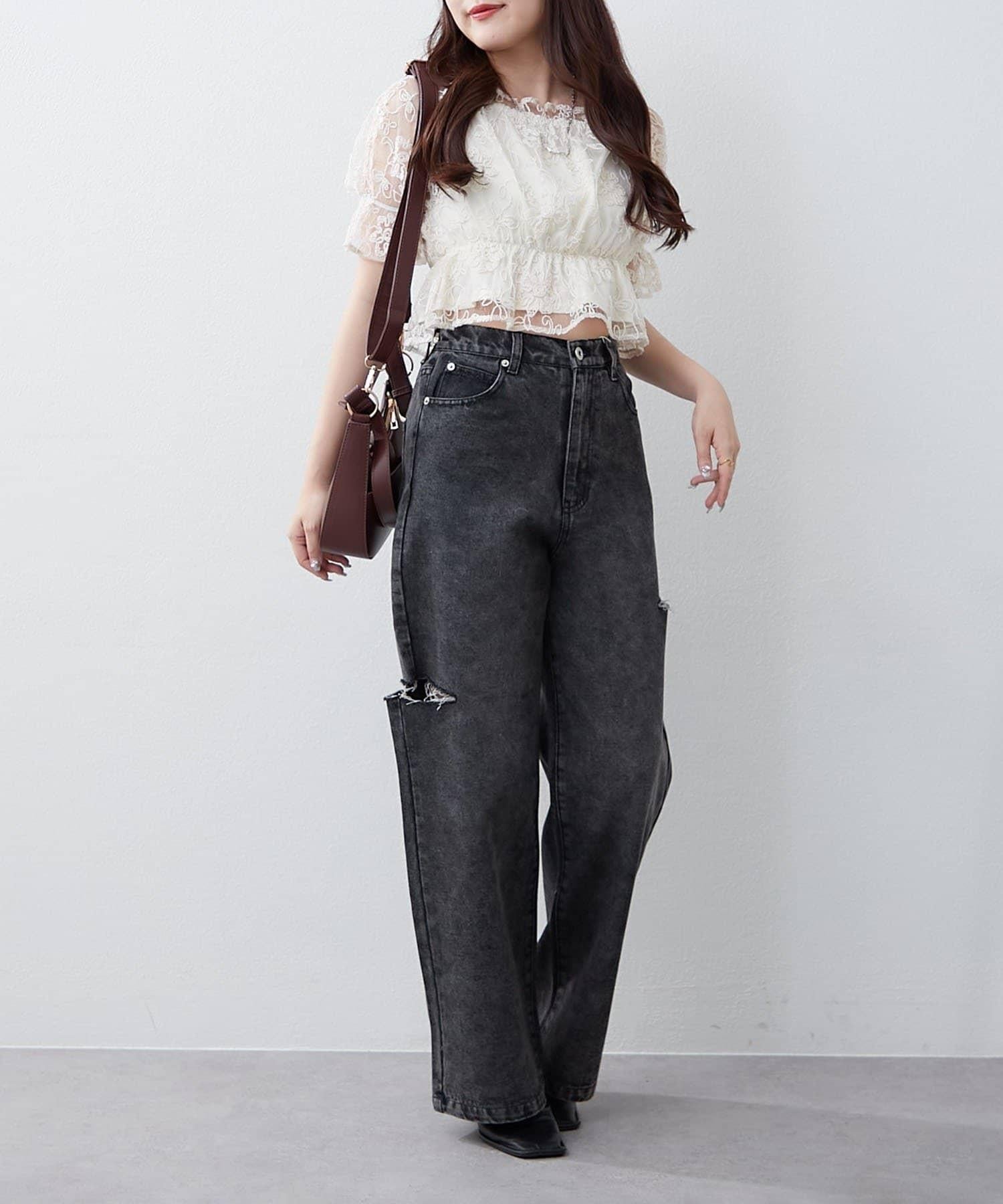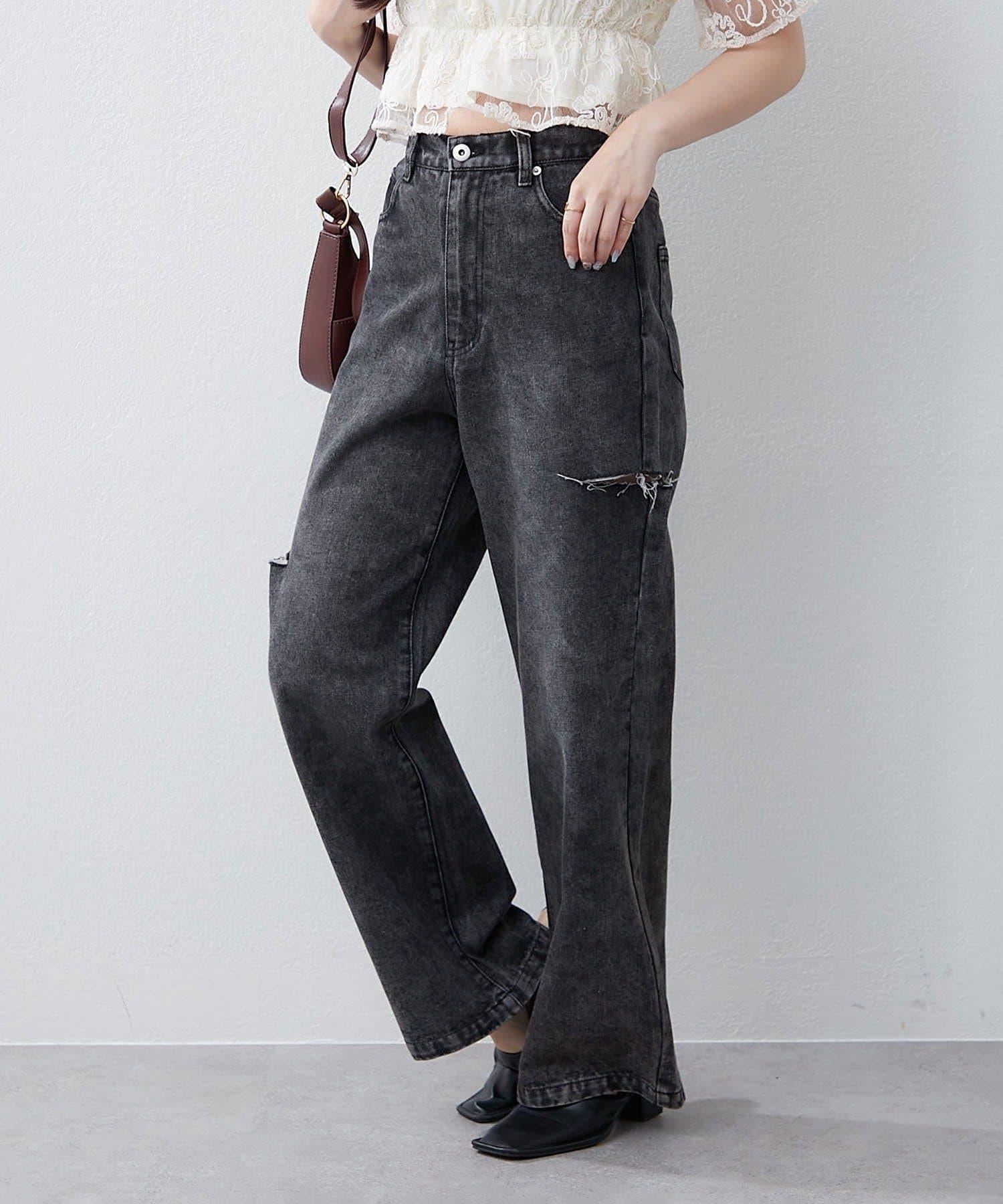 牛仔長褲,左右兩側有不同高度的破損開衩。
