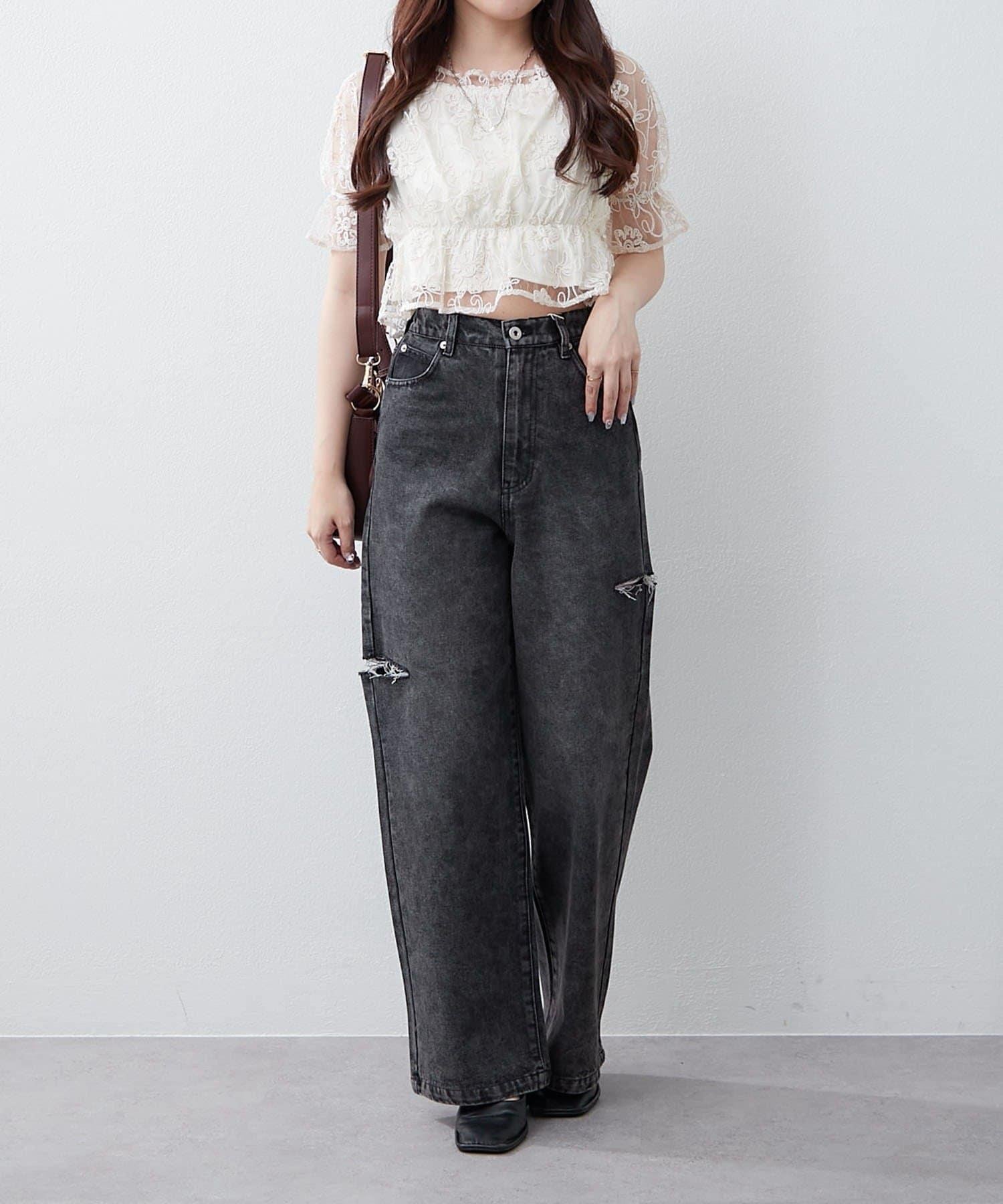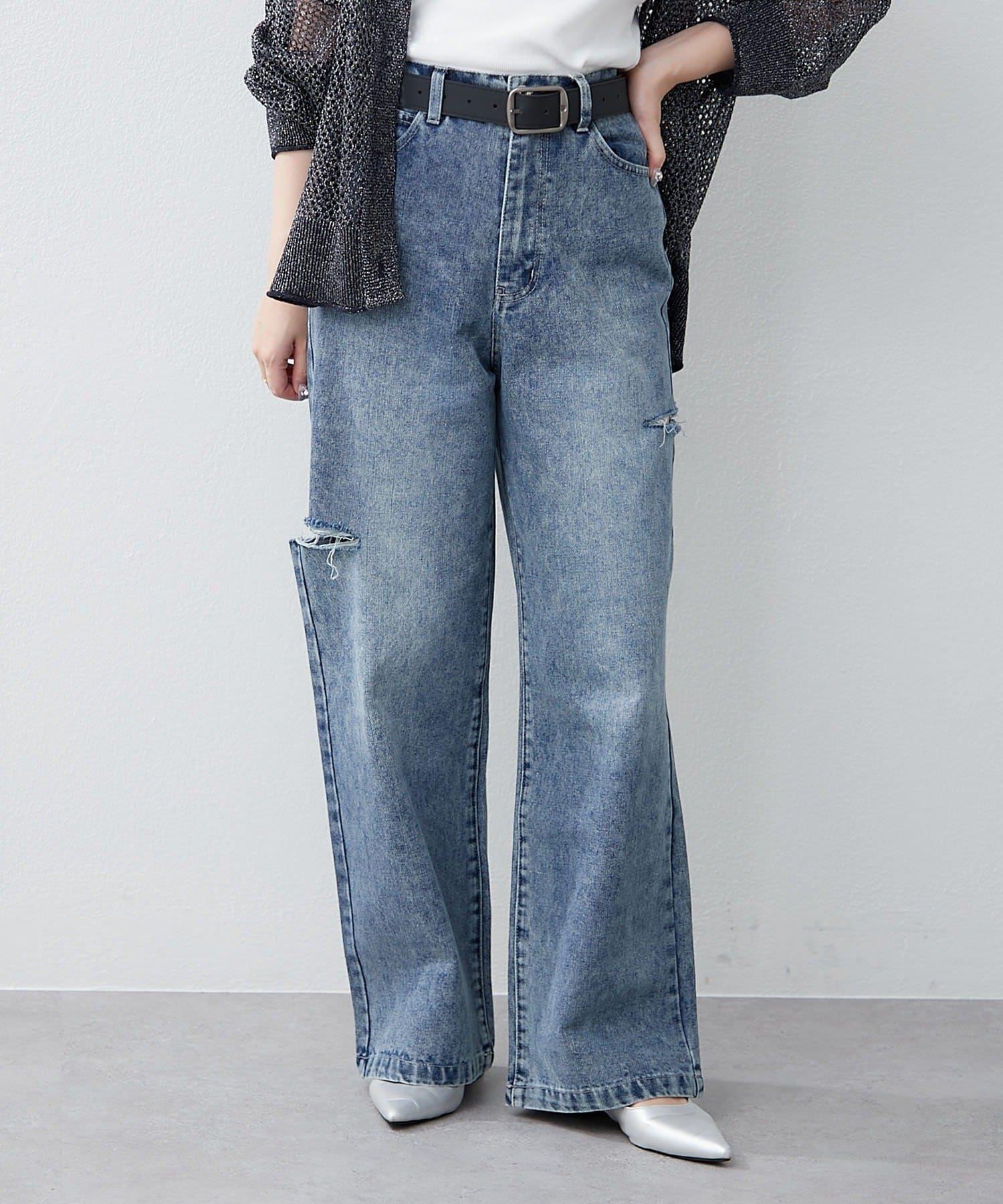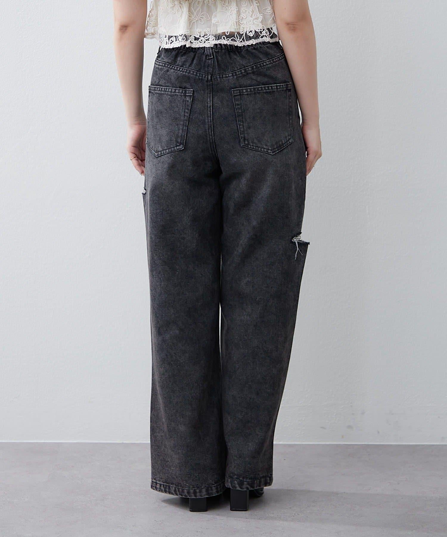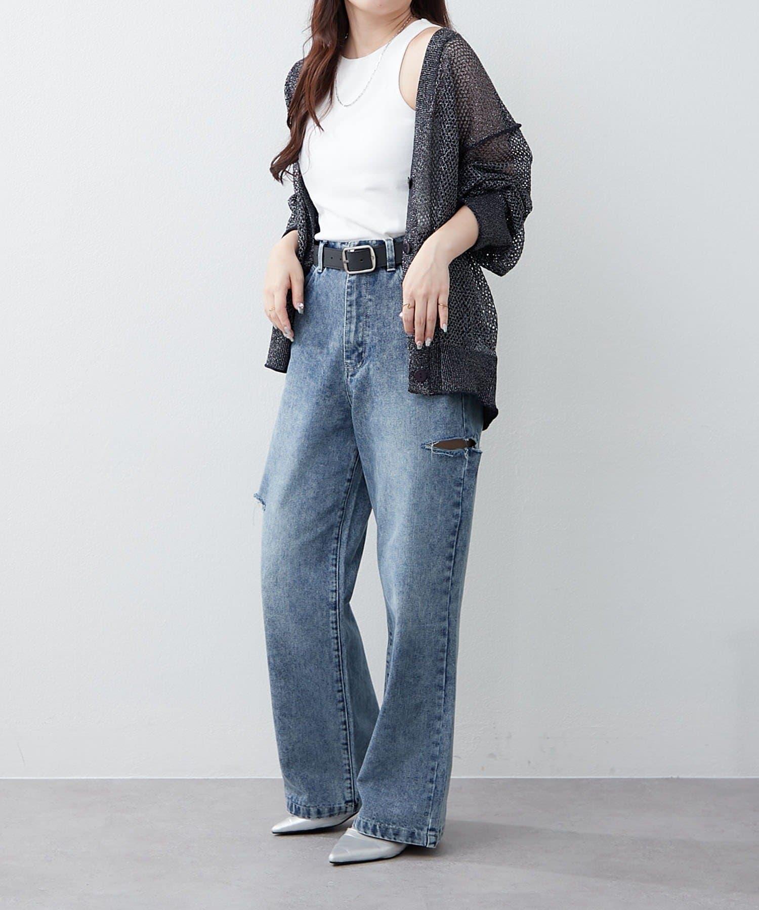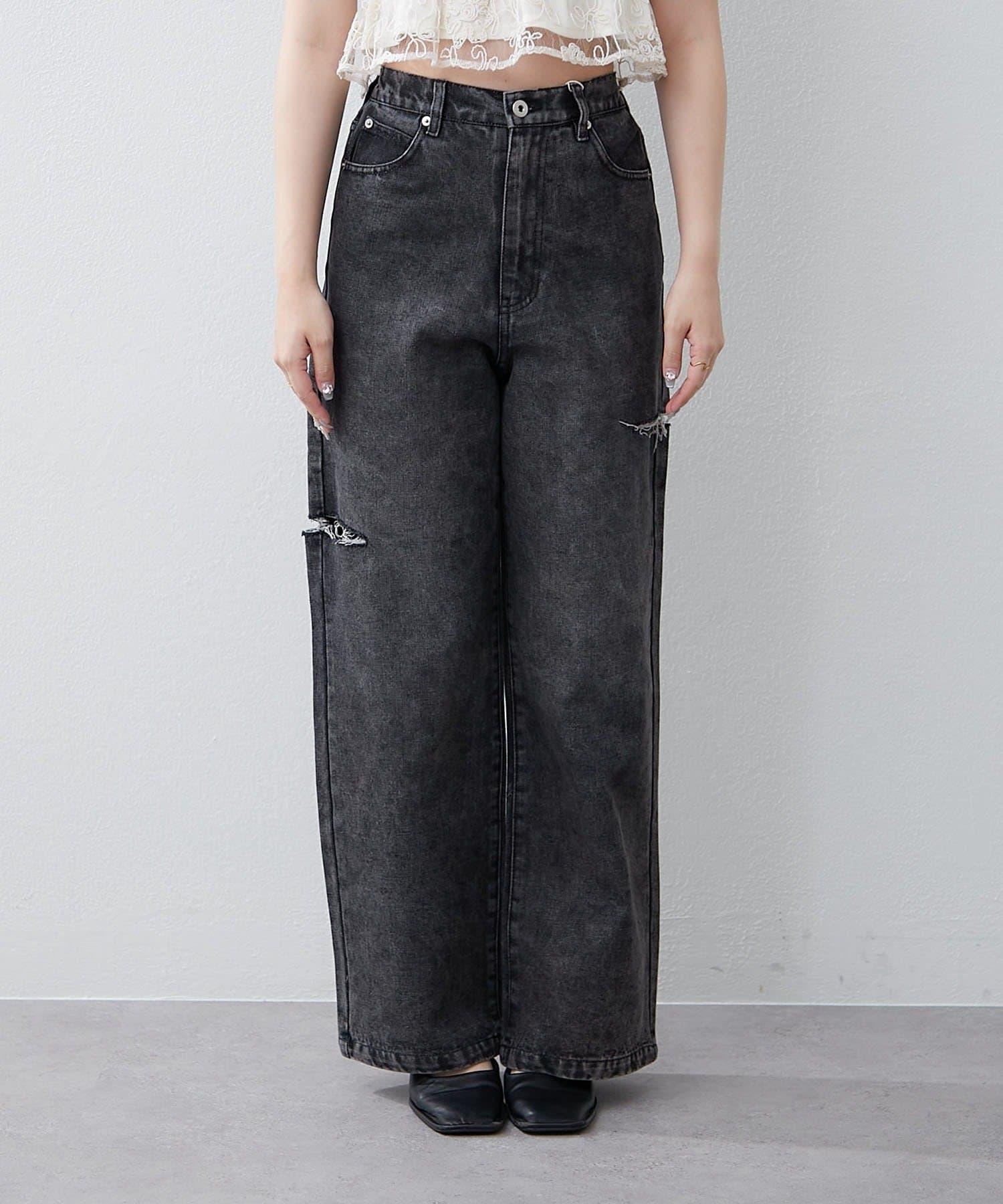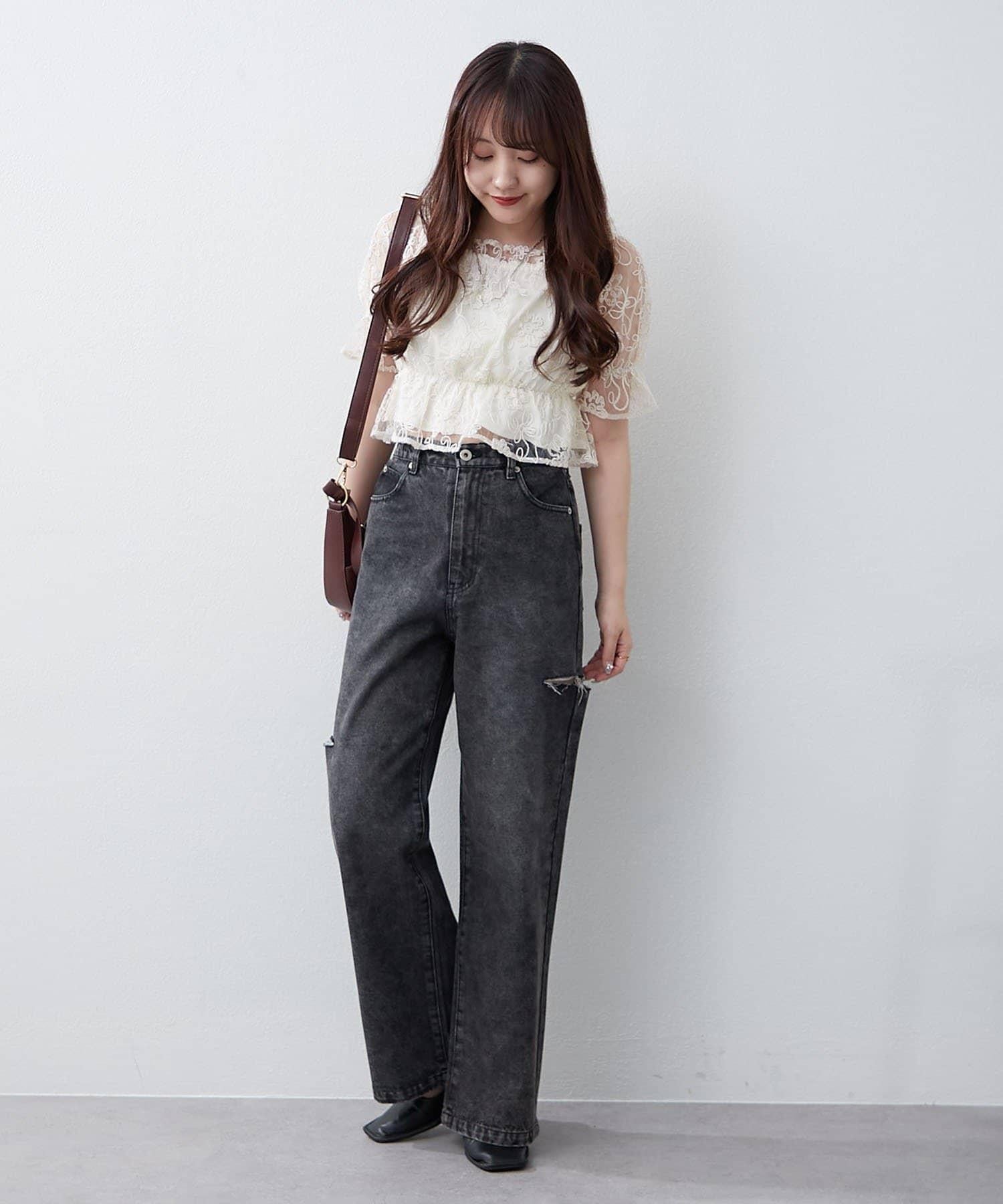牛仔長褲,左右兩側有不同高度的破損開衩。