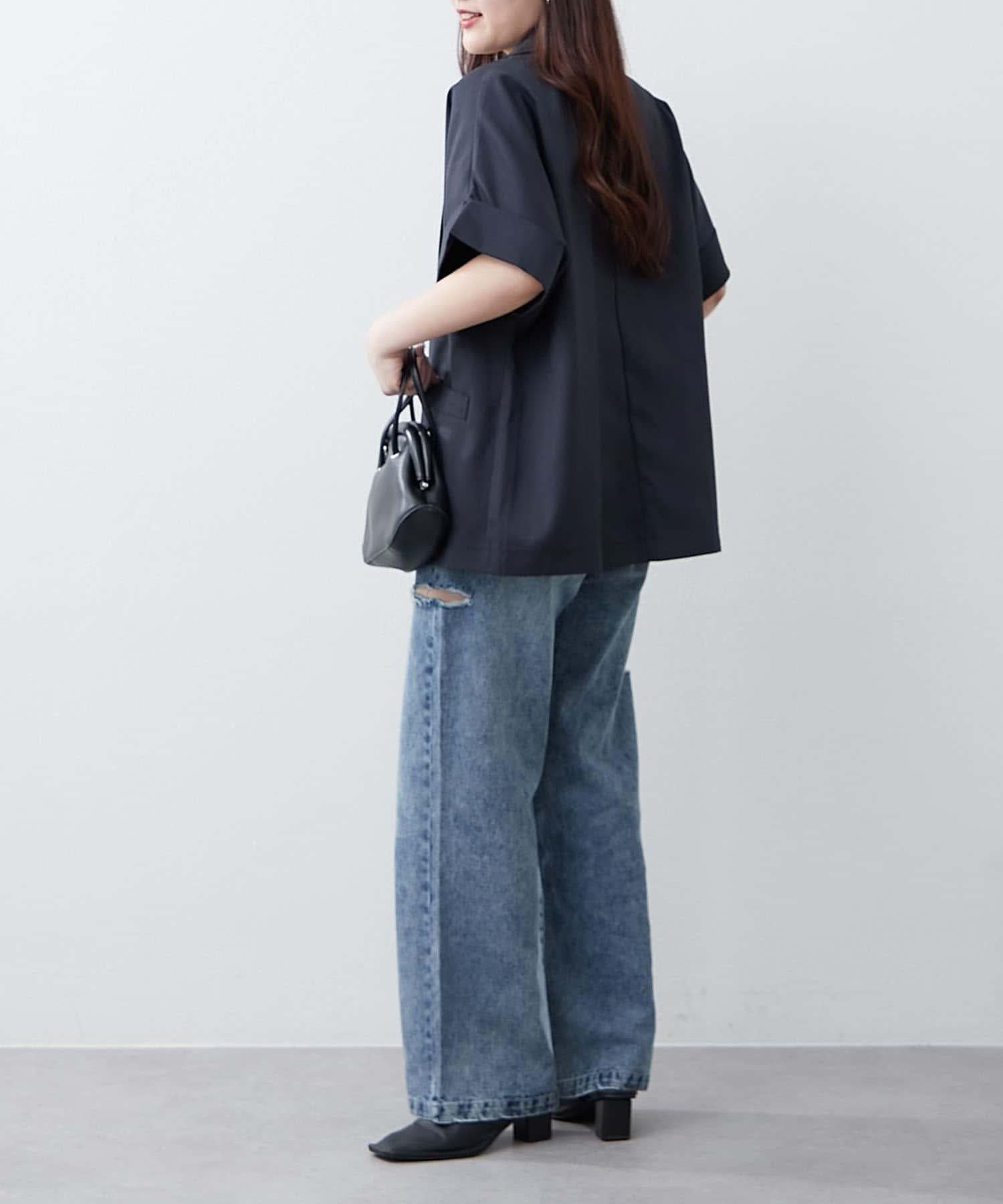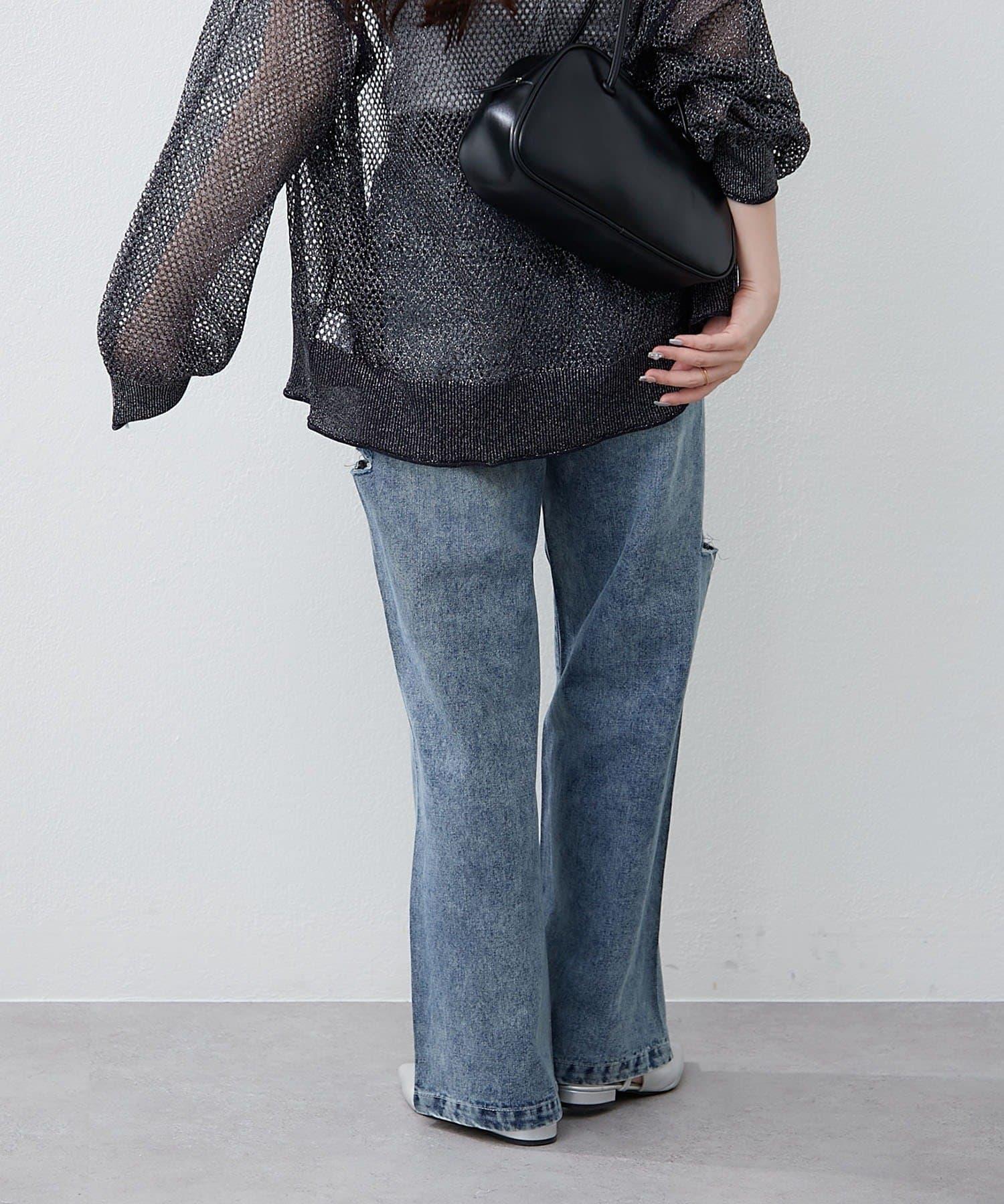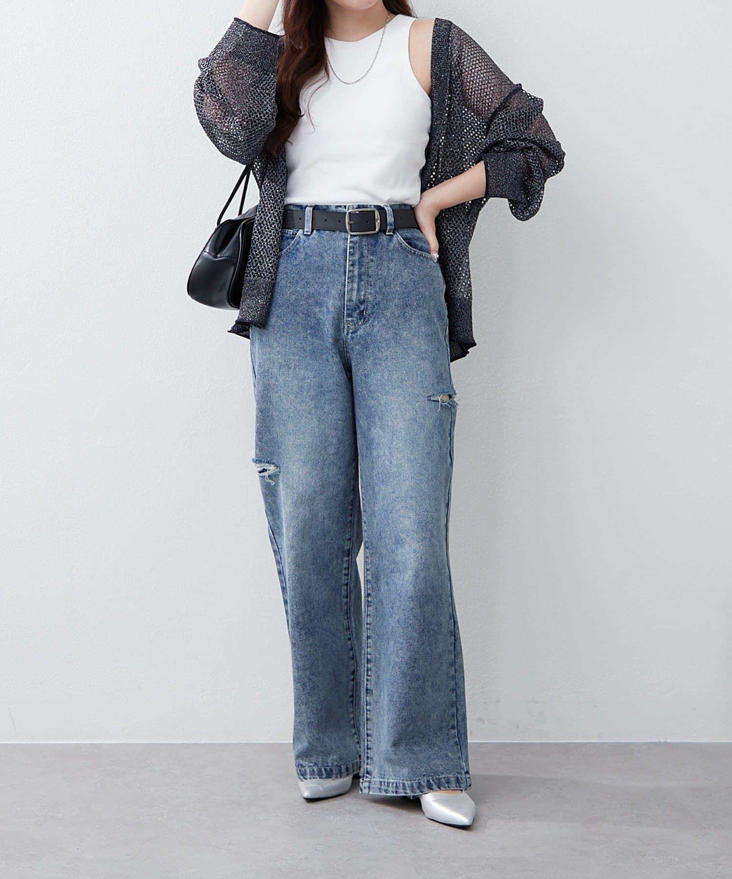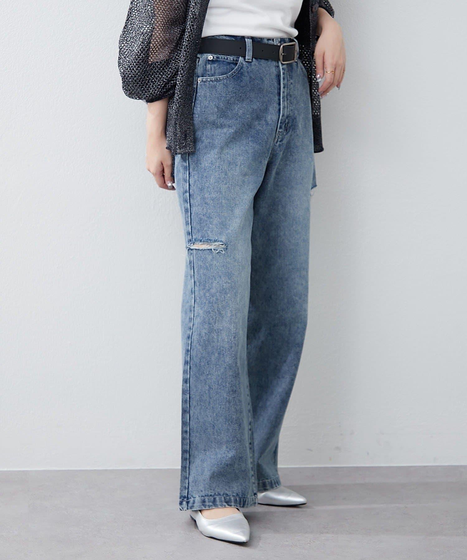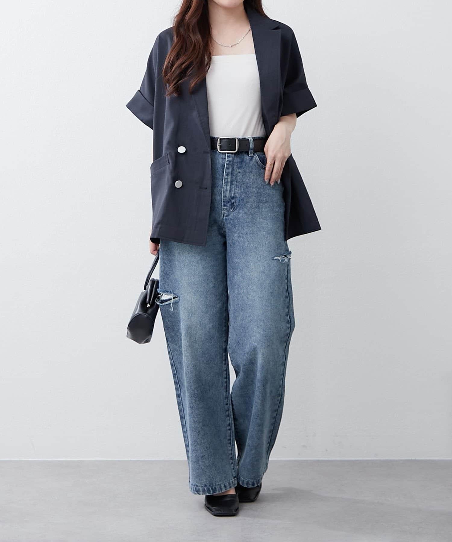 牛仔長褲,左右兩側有不同高度的破損開衩。