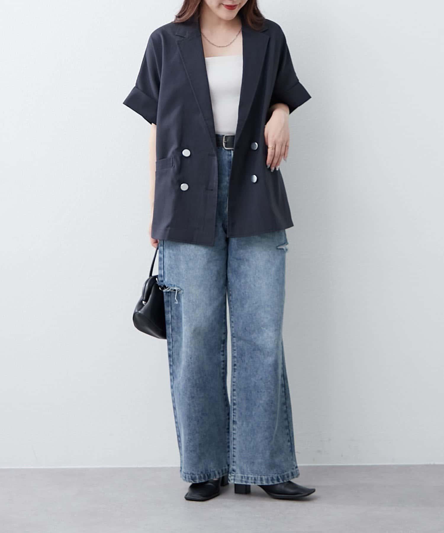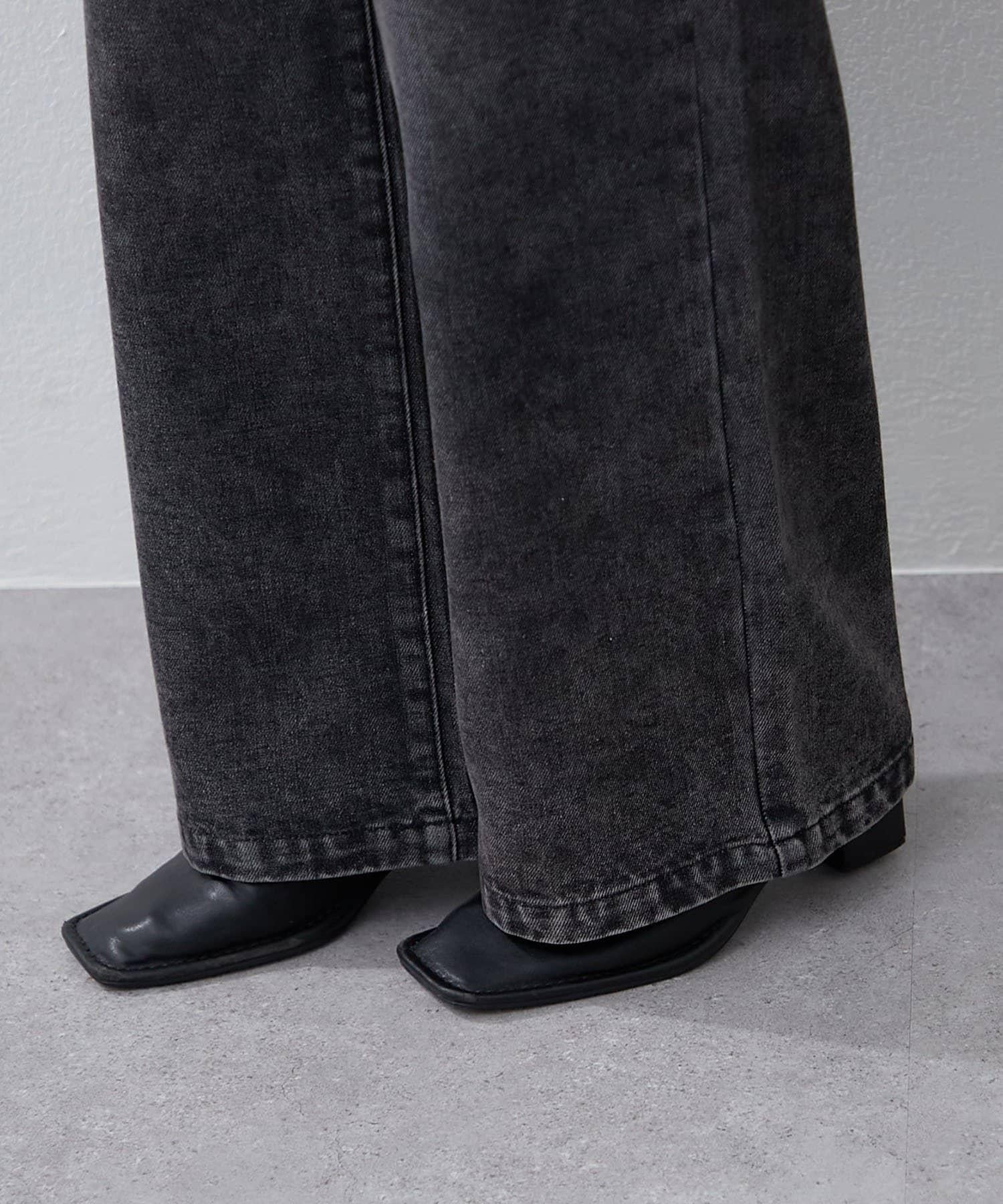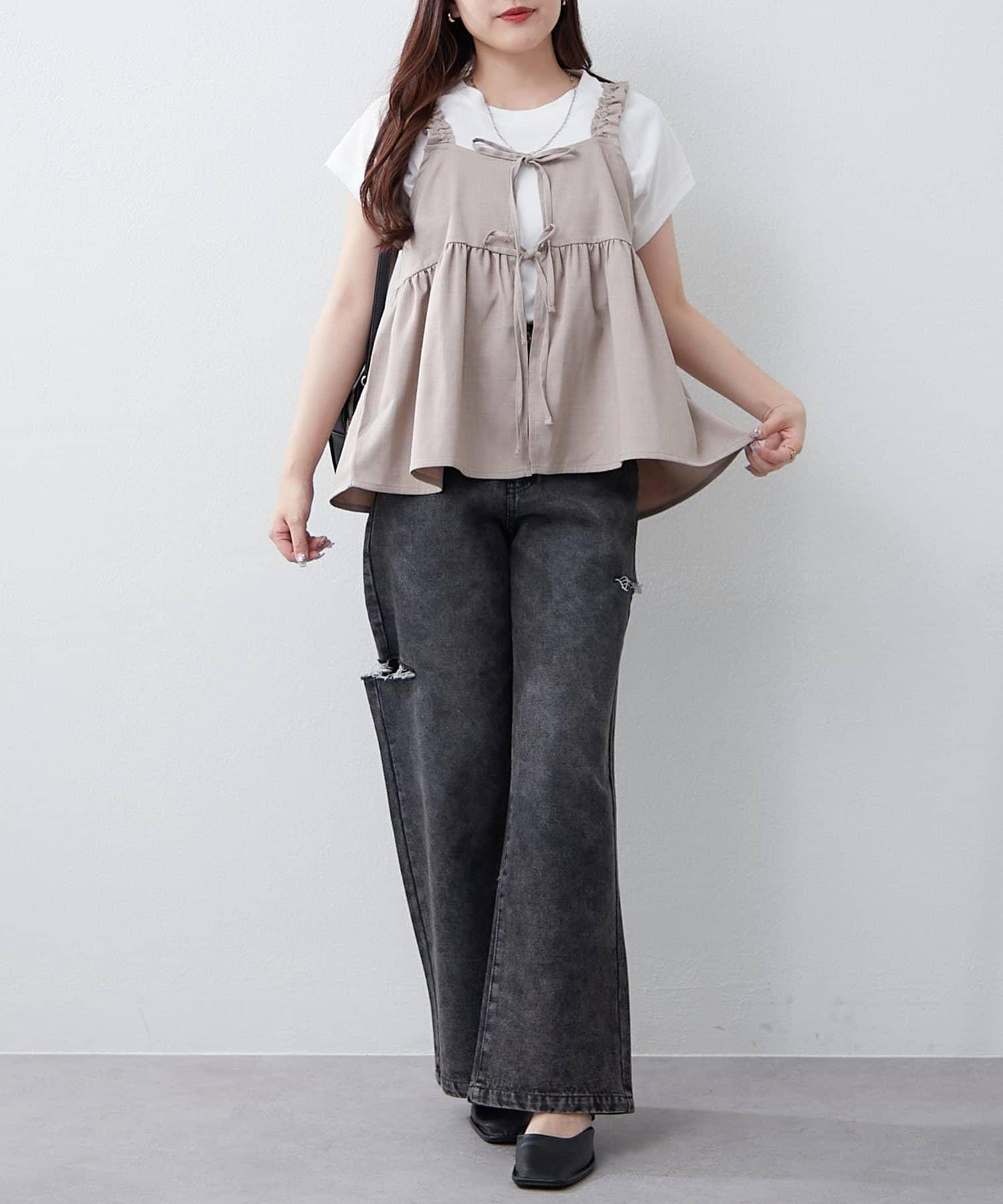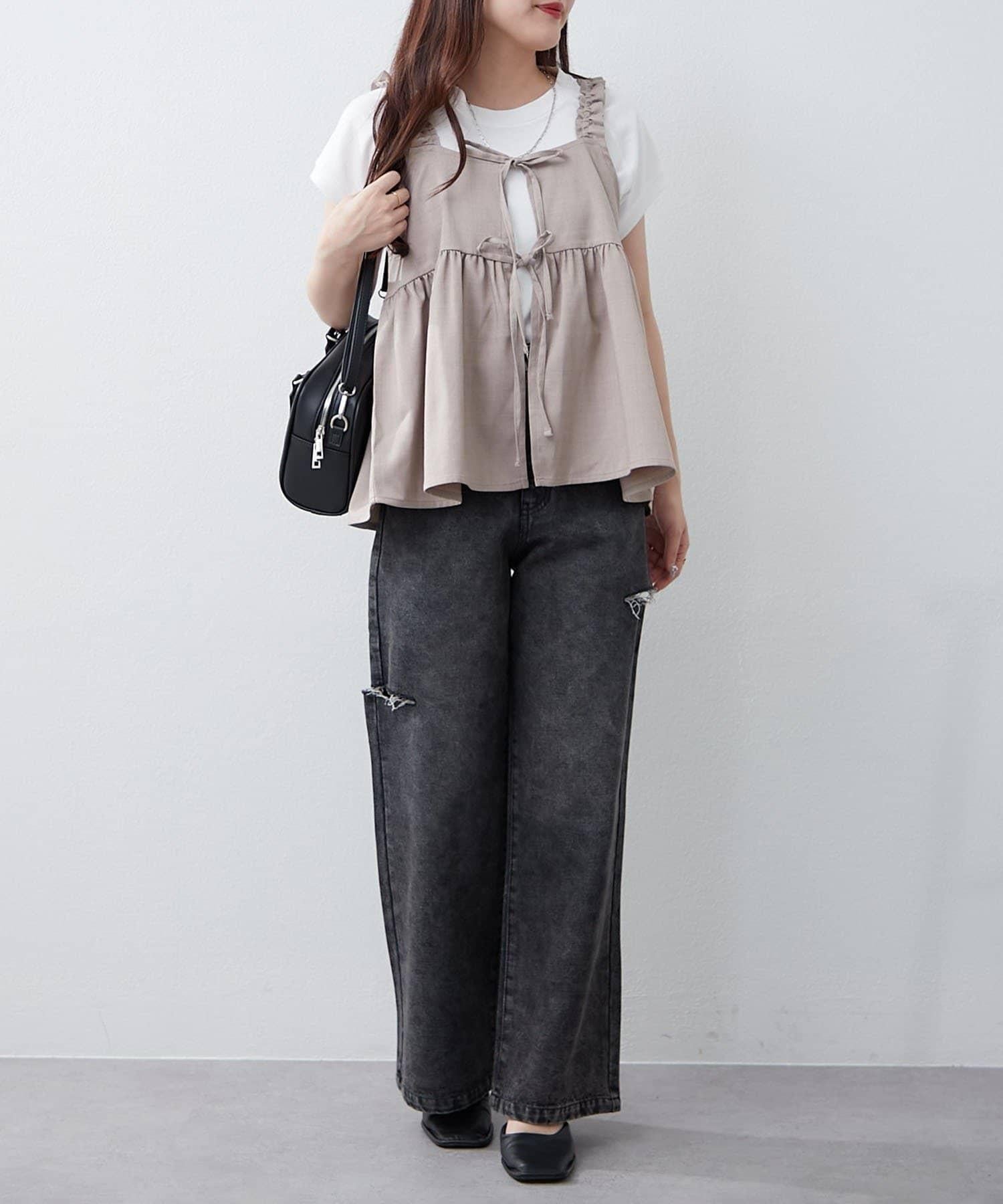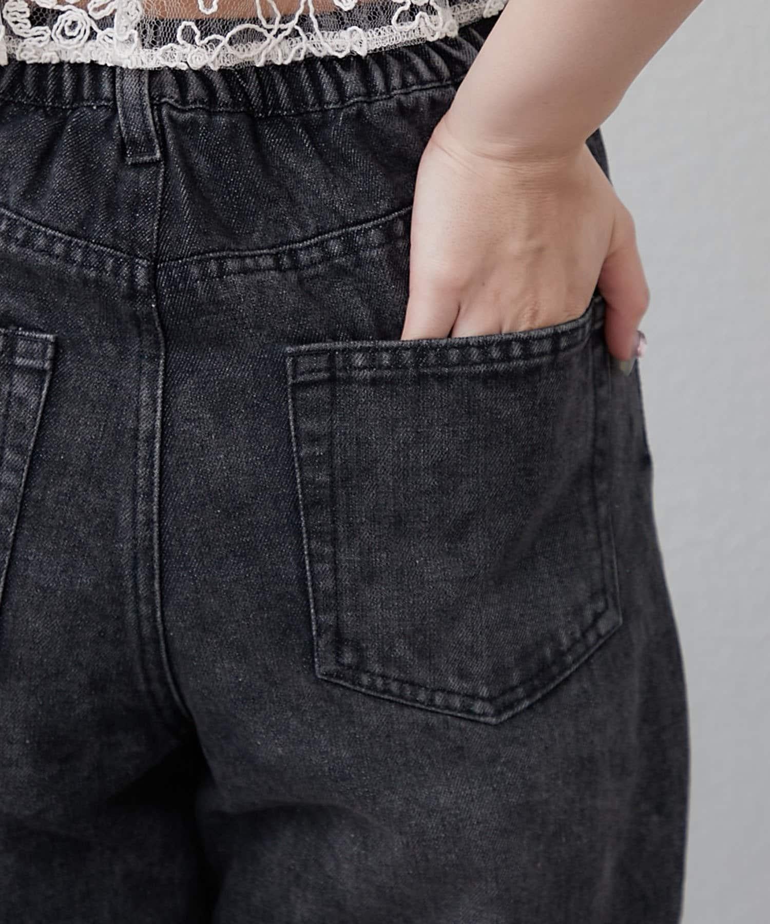 牛仔長褲,左右兩側有不同高度的破損開衩。