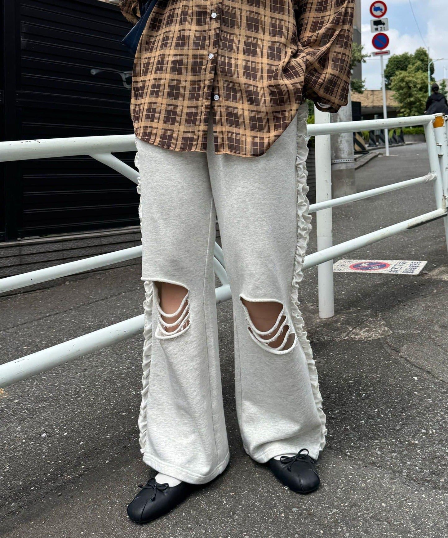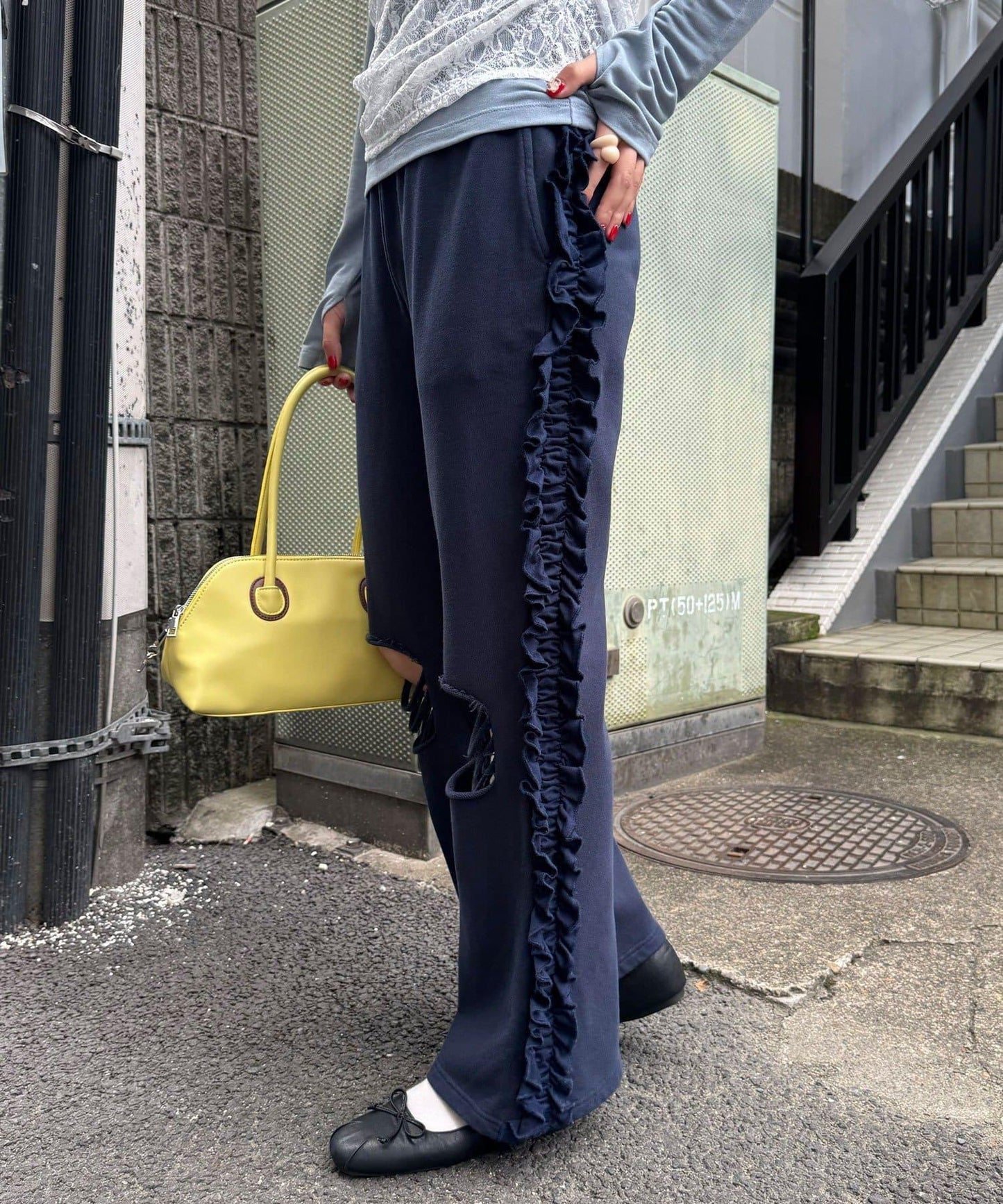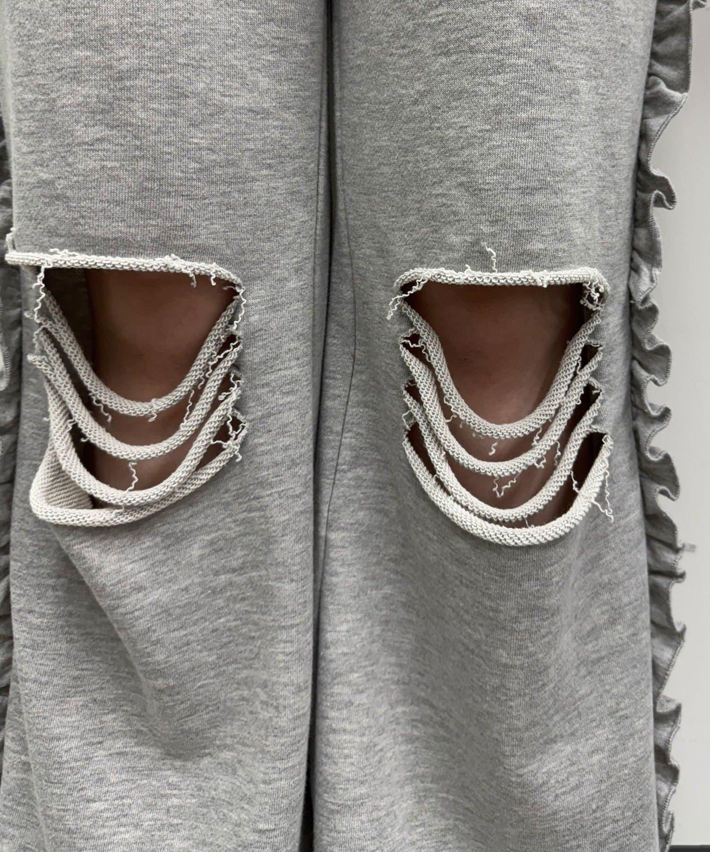 設計運動褲,褶邊帶來甜美感,破損處理帶來寬鬆感。