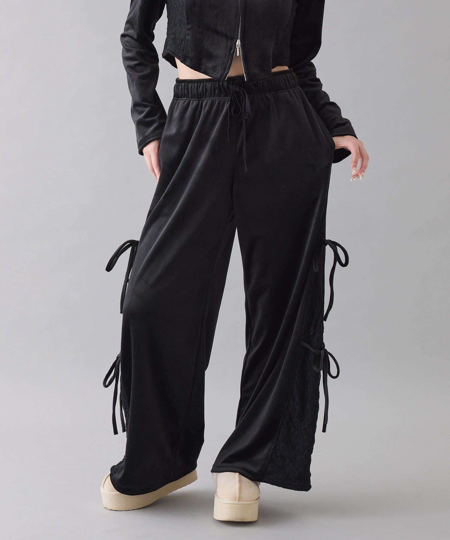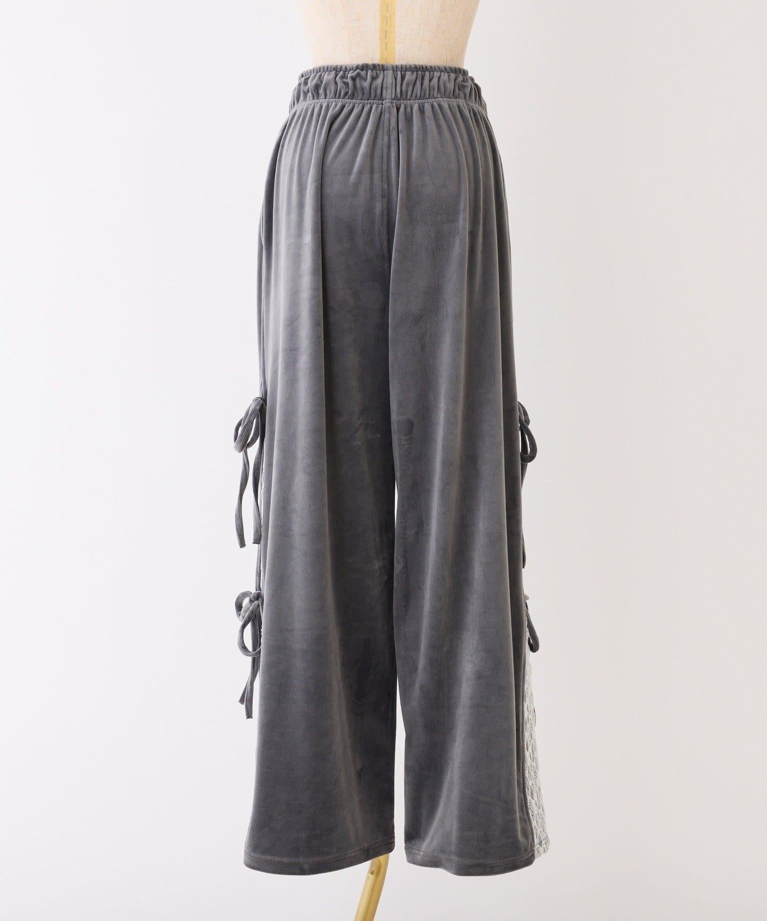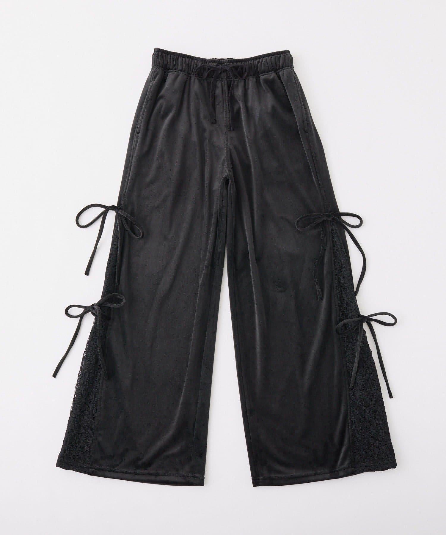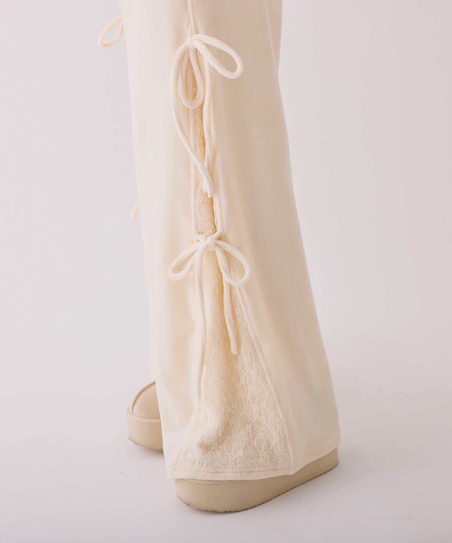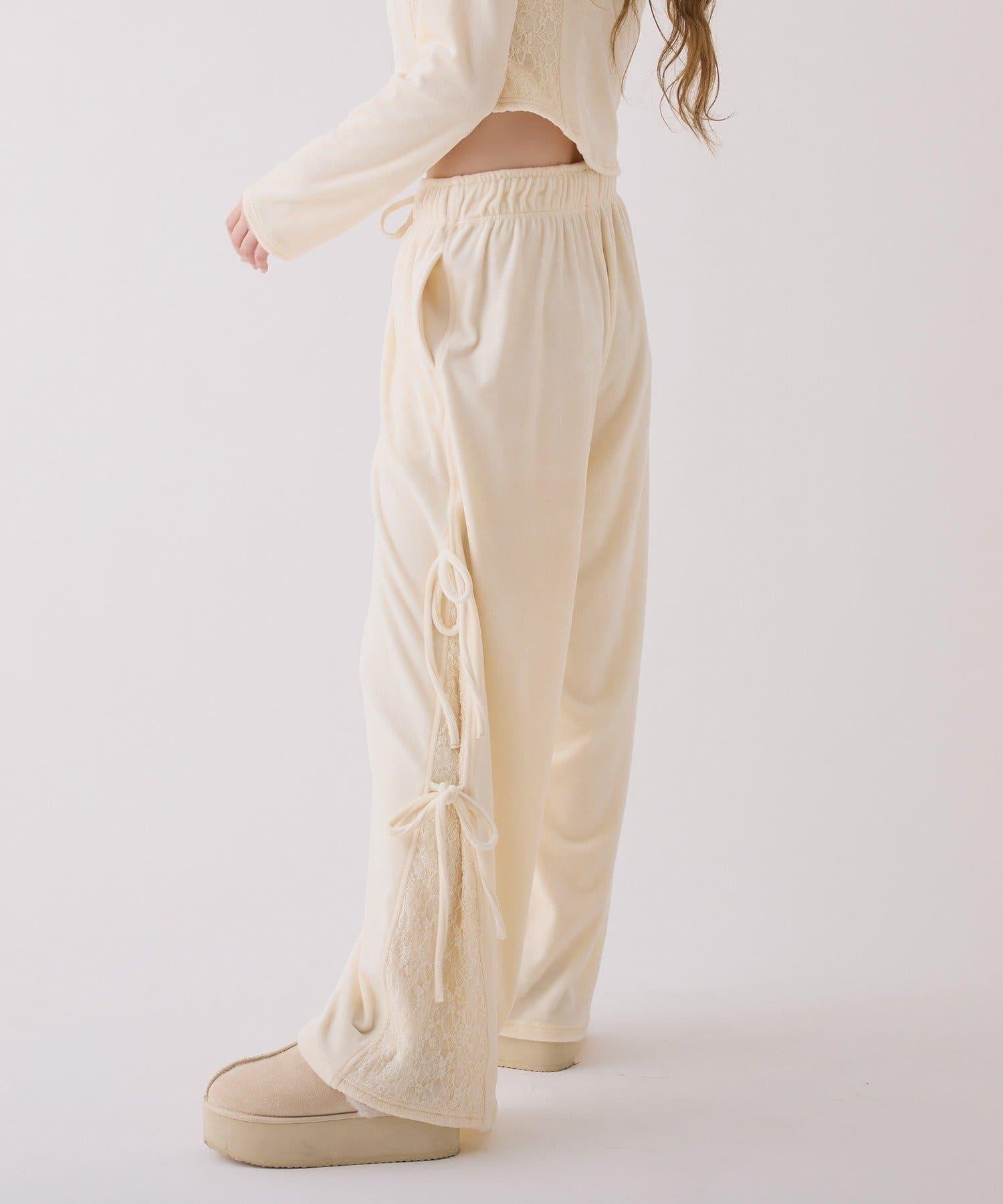 側邊蕾絲天鵝絨蝴蝶結長褲