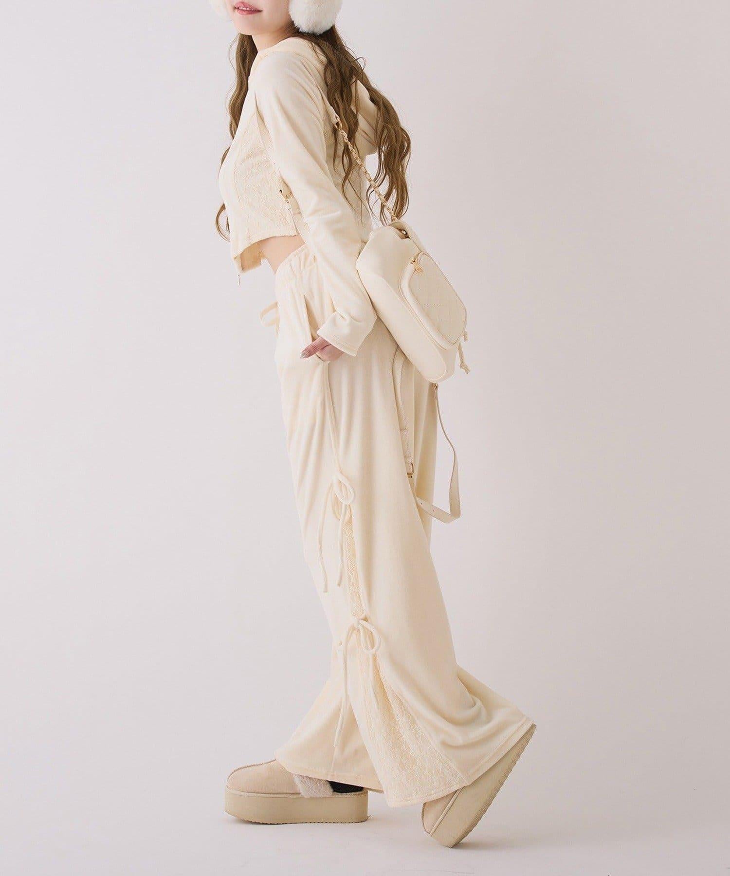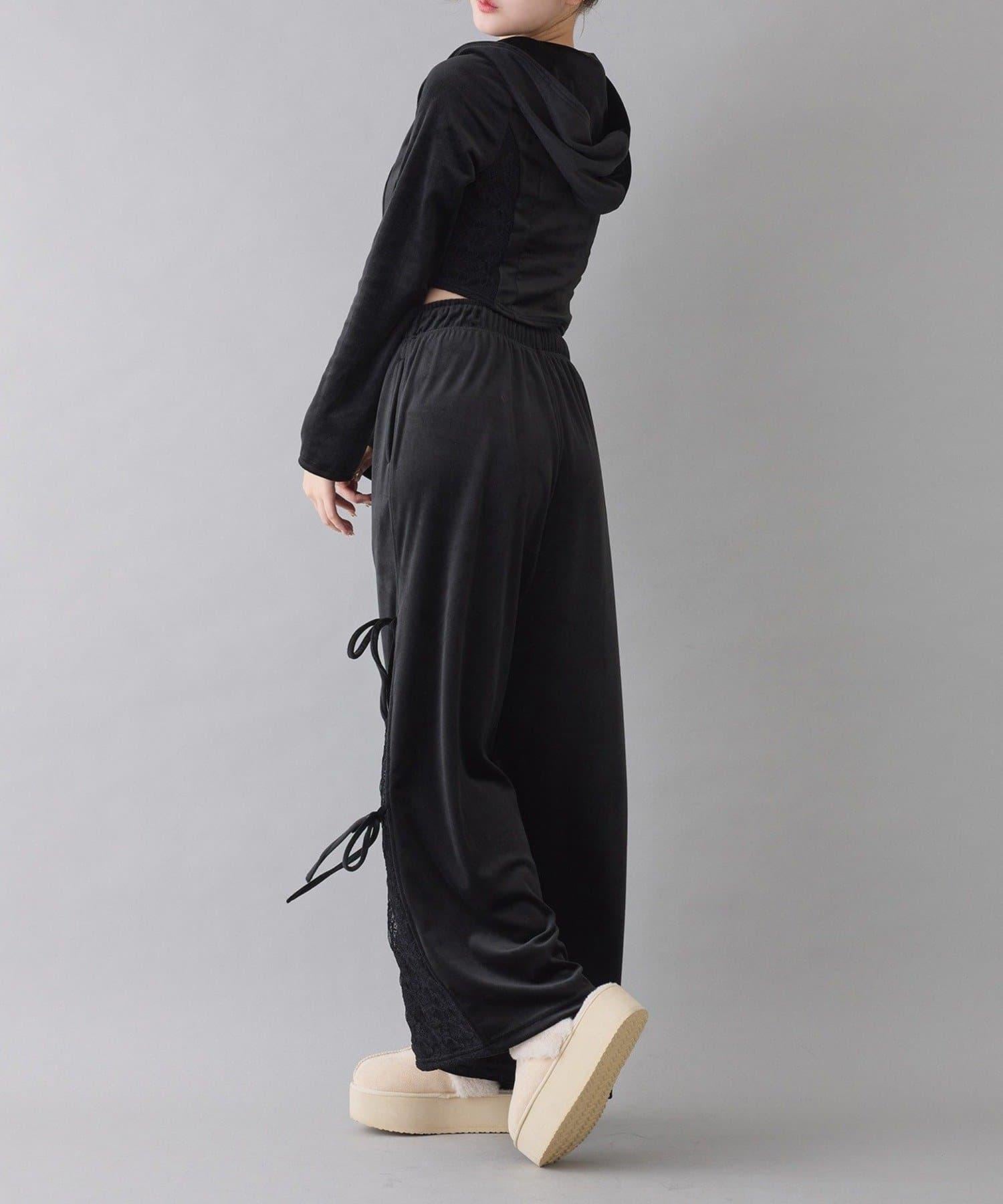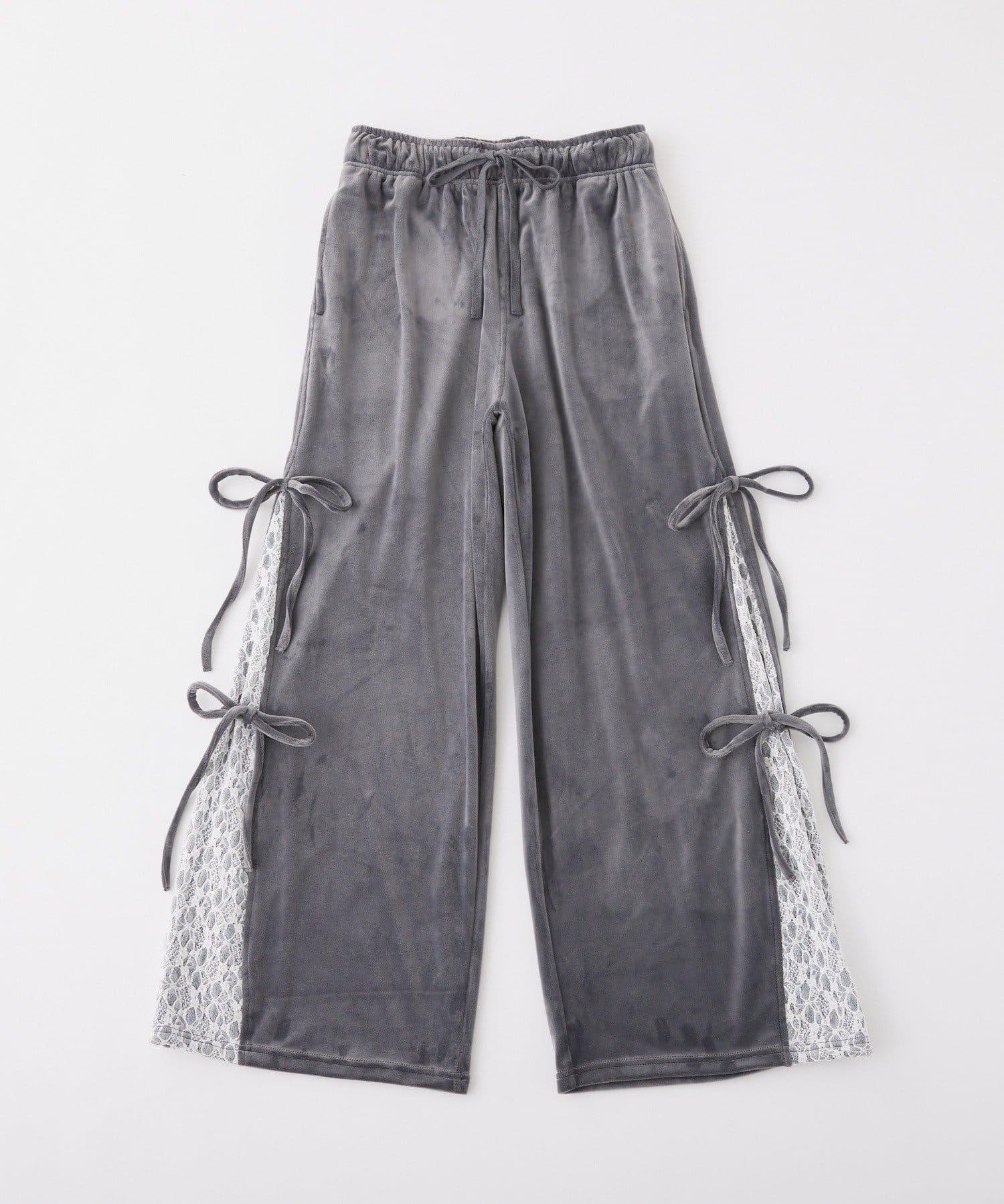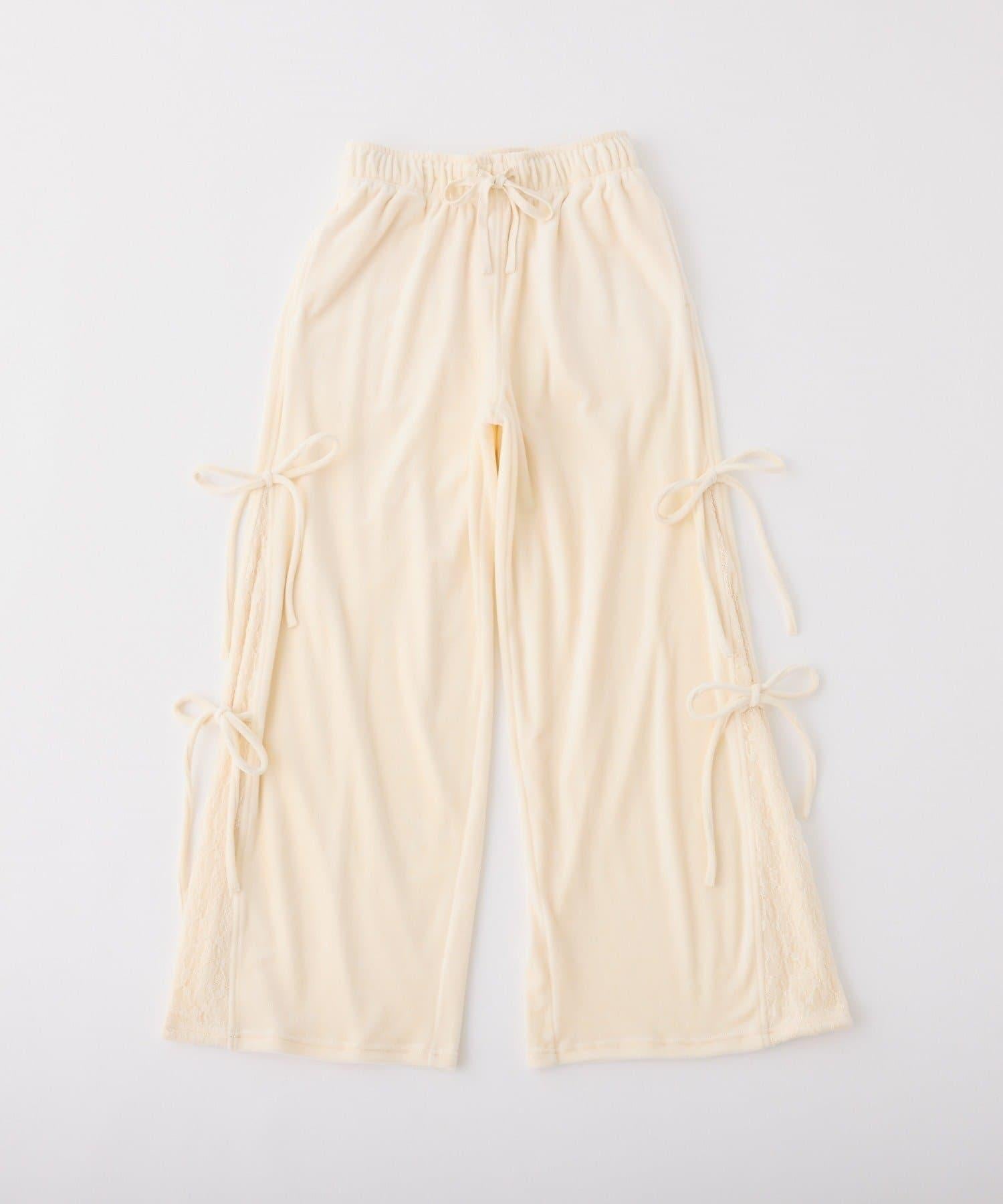 側邊蕾絲天鵝絨蝴蝶結長褲