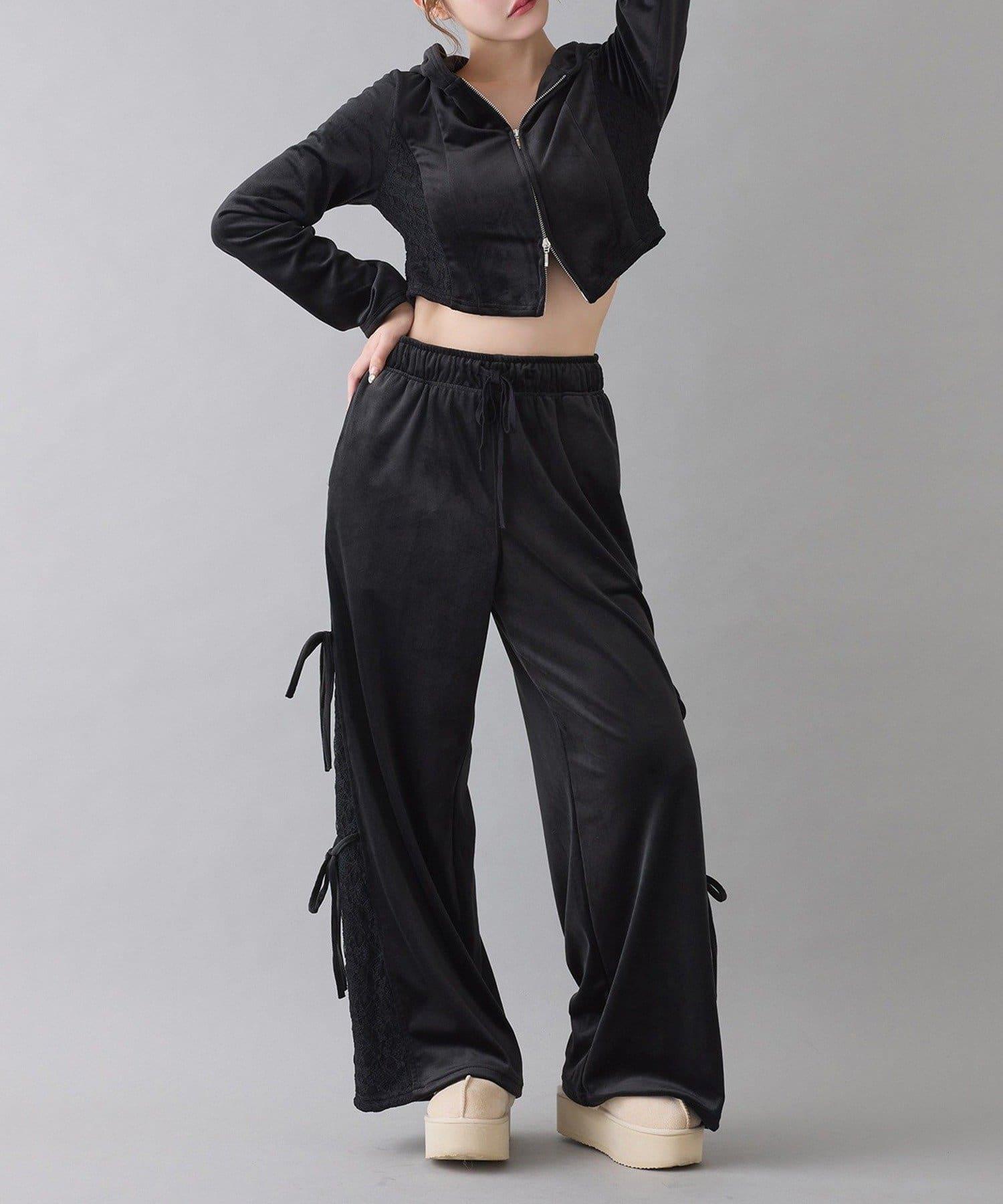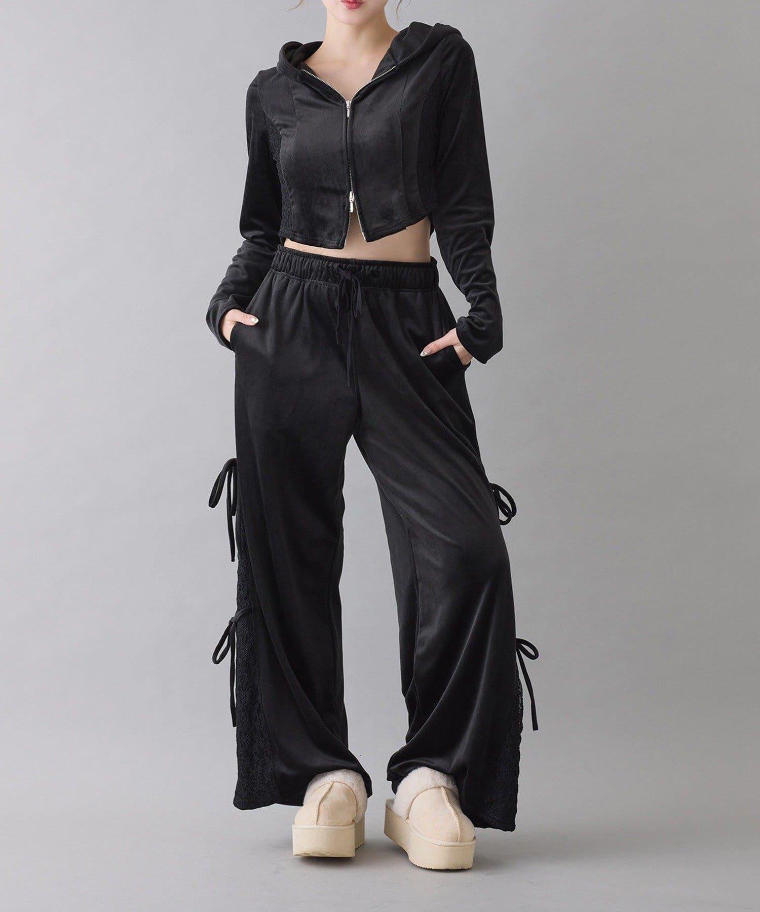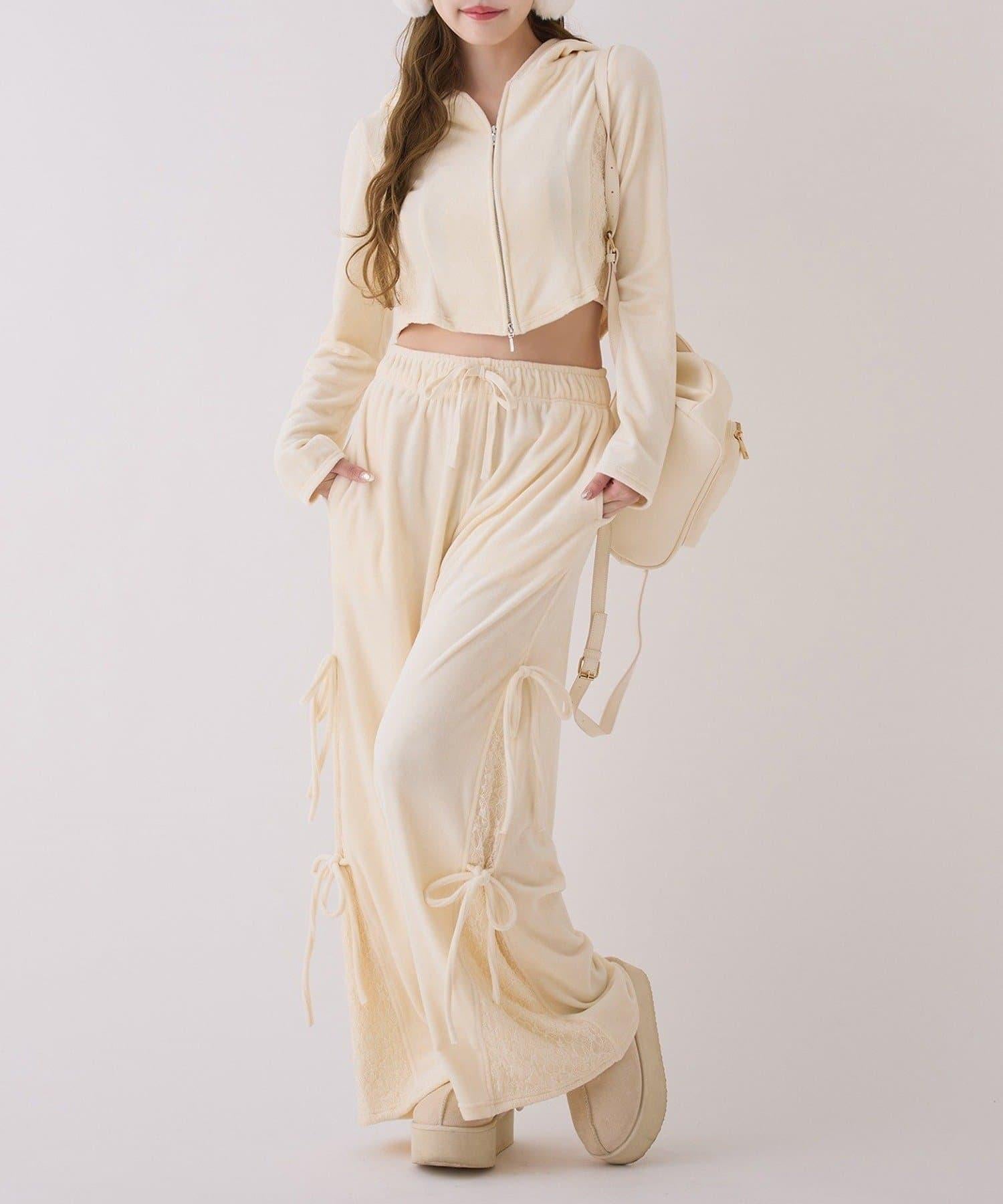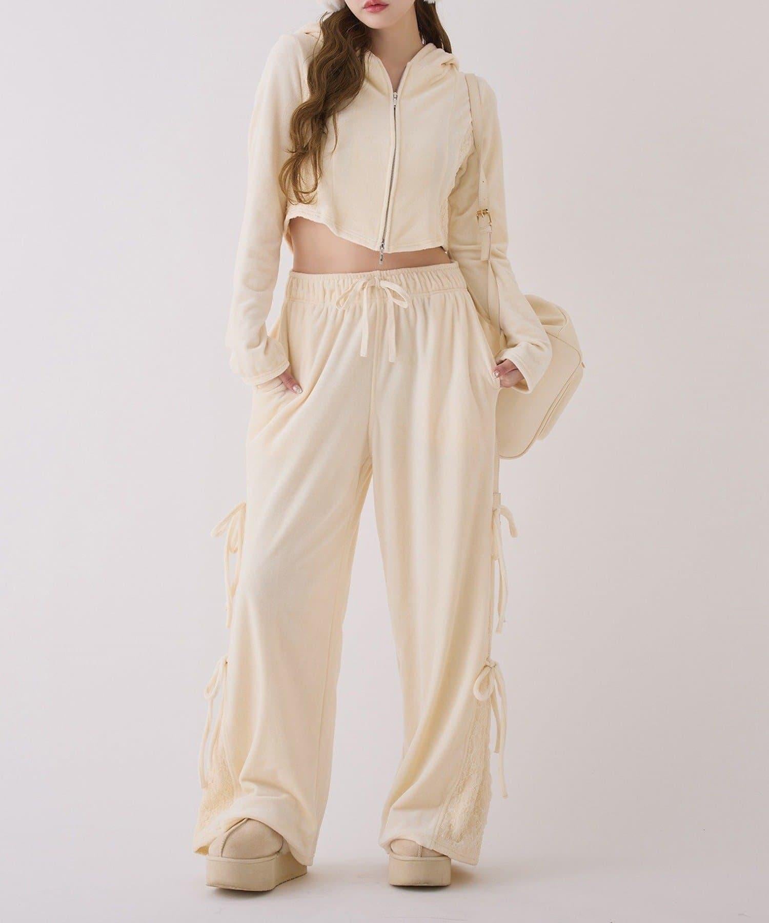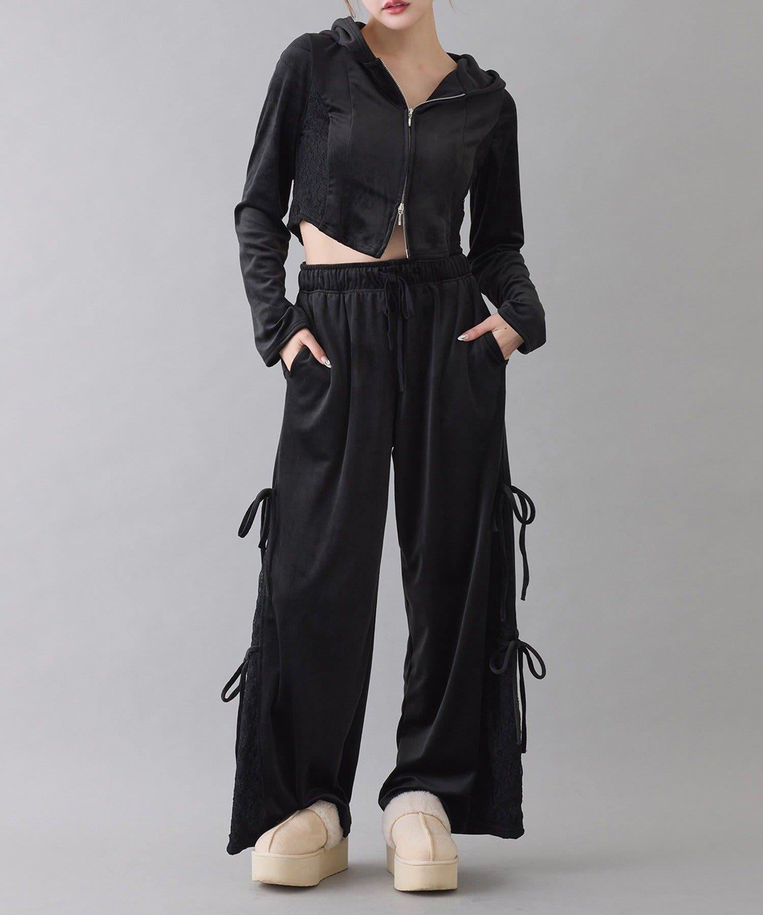 側邊蕾絲天鵝絨蝴蝶結長褲