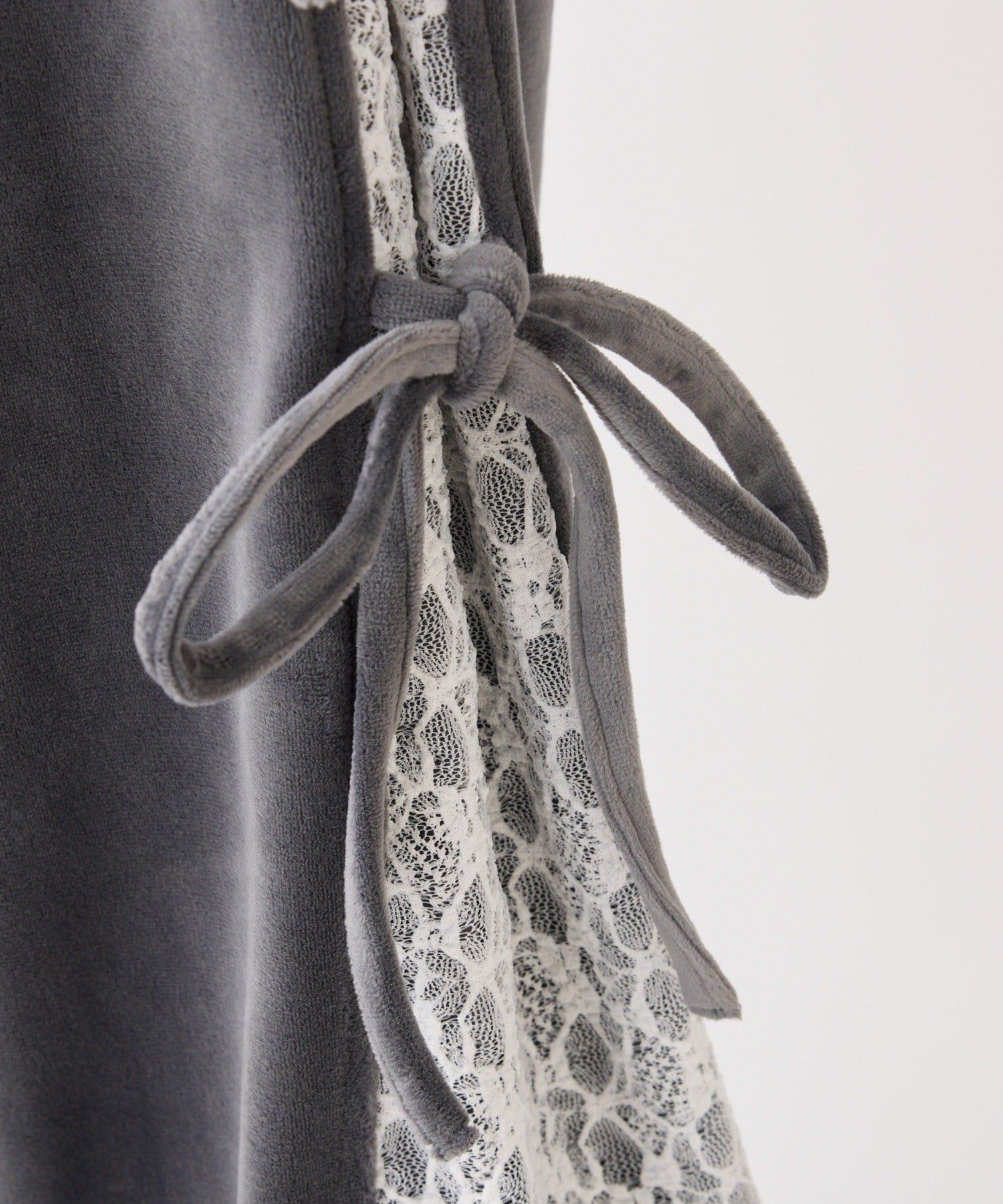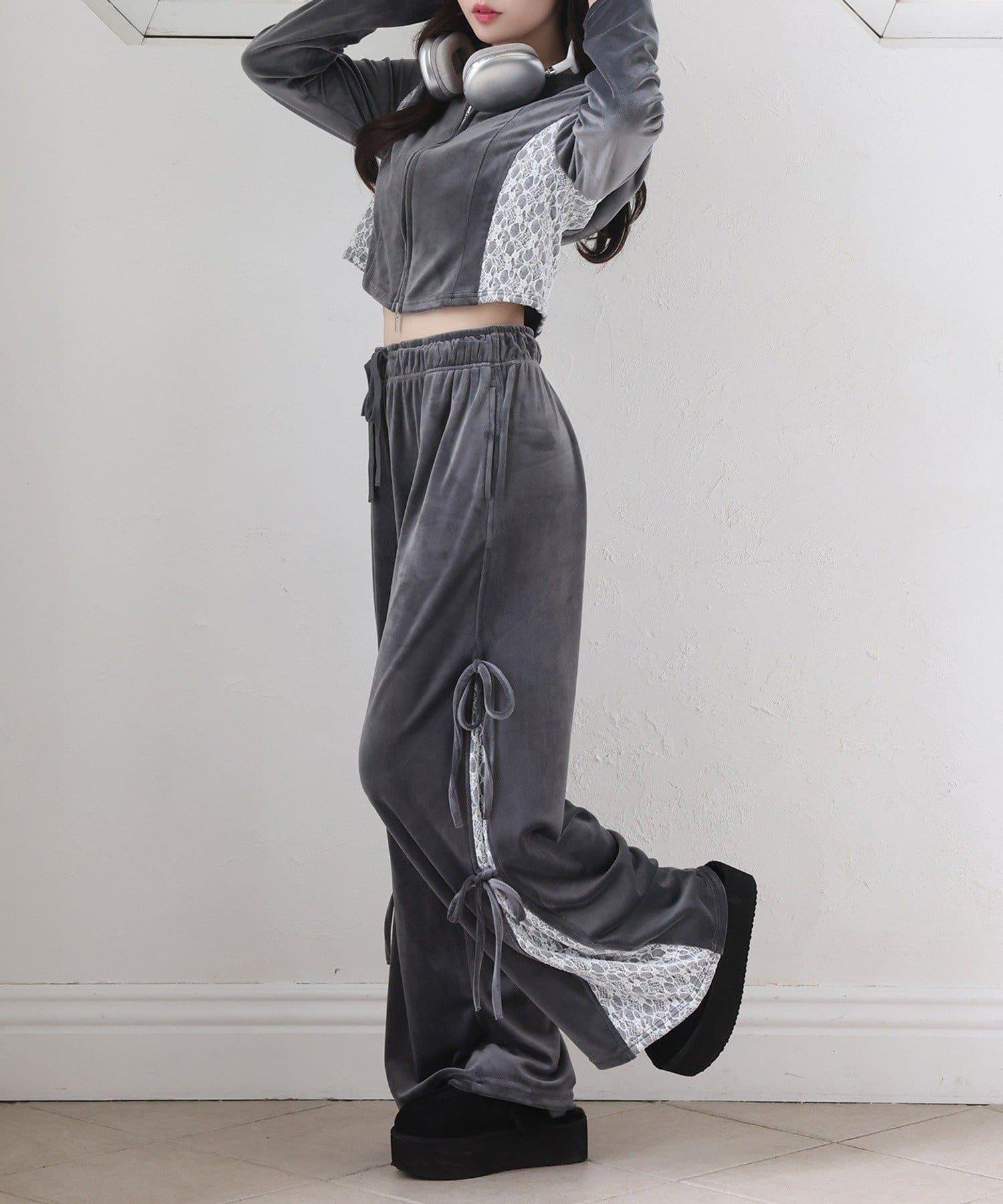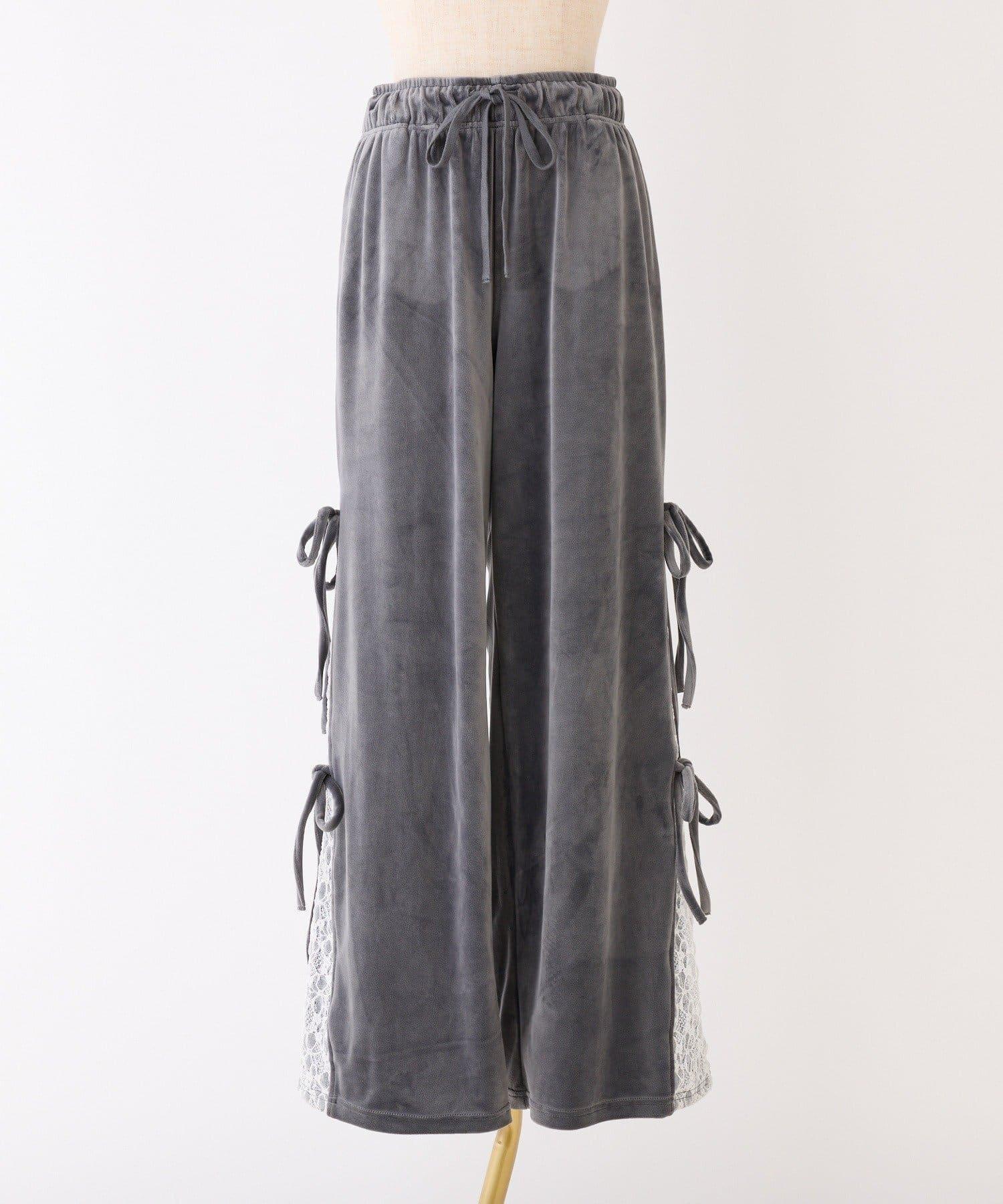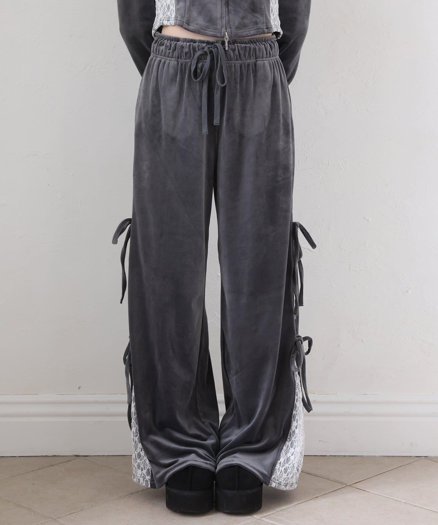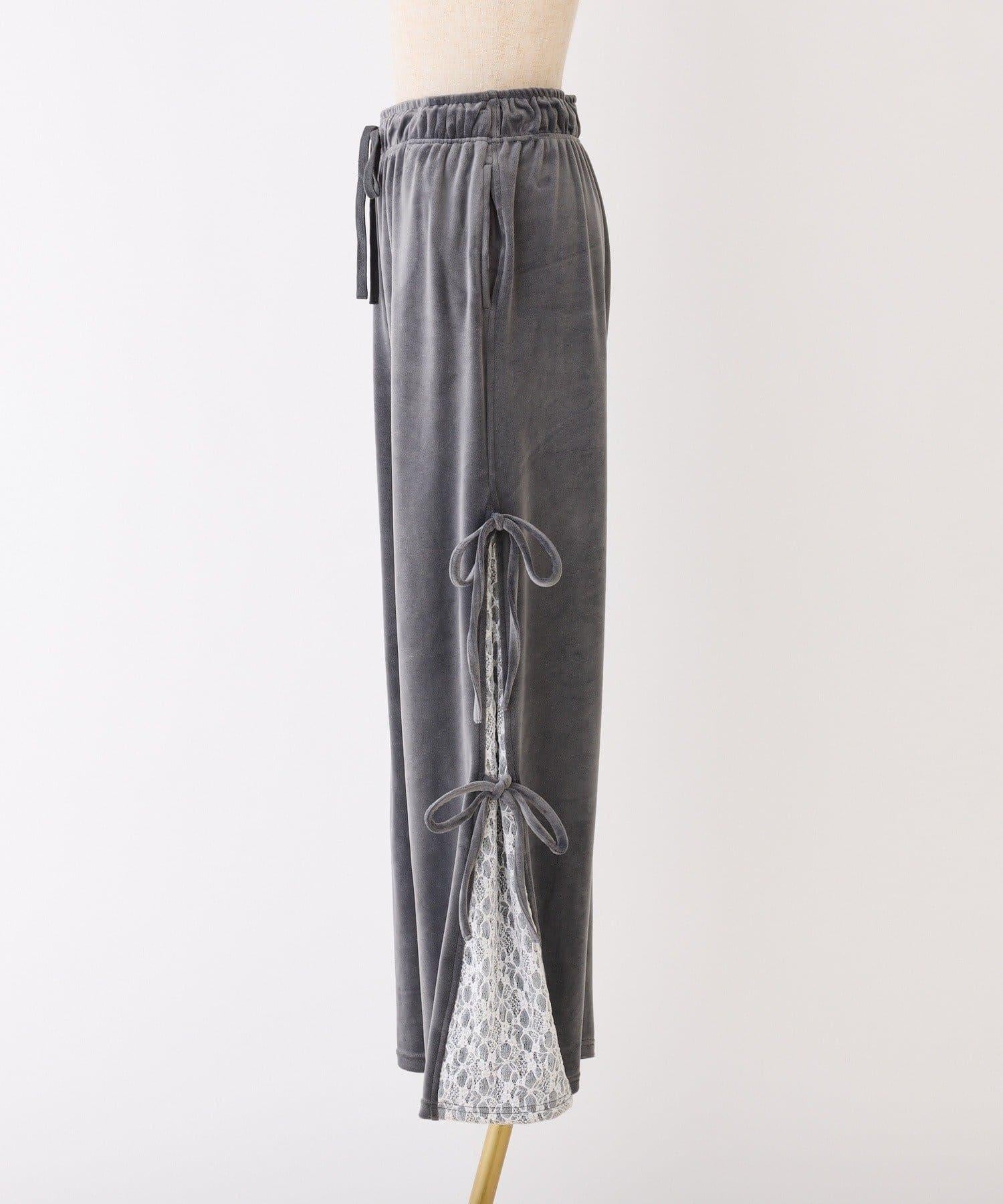 天鵝絨長褲,側面有蕾絲設計和絲帶。