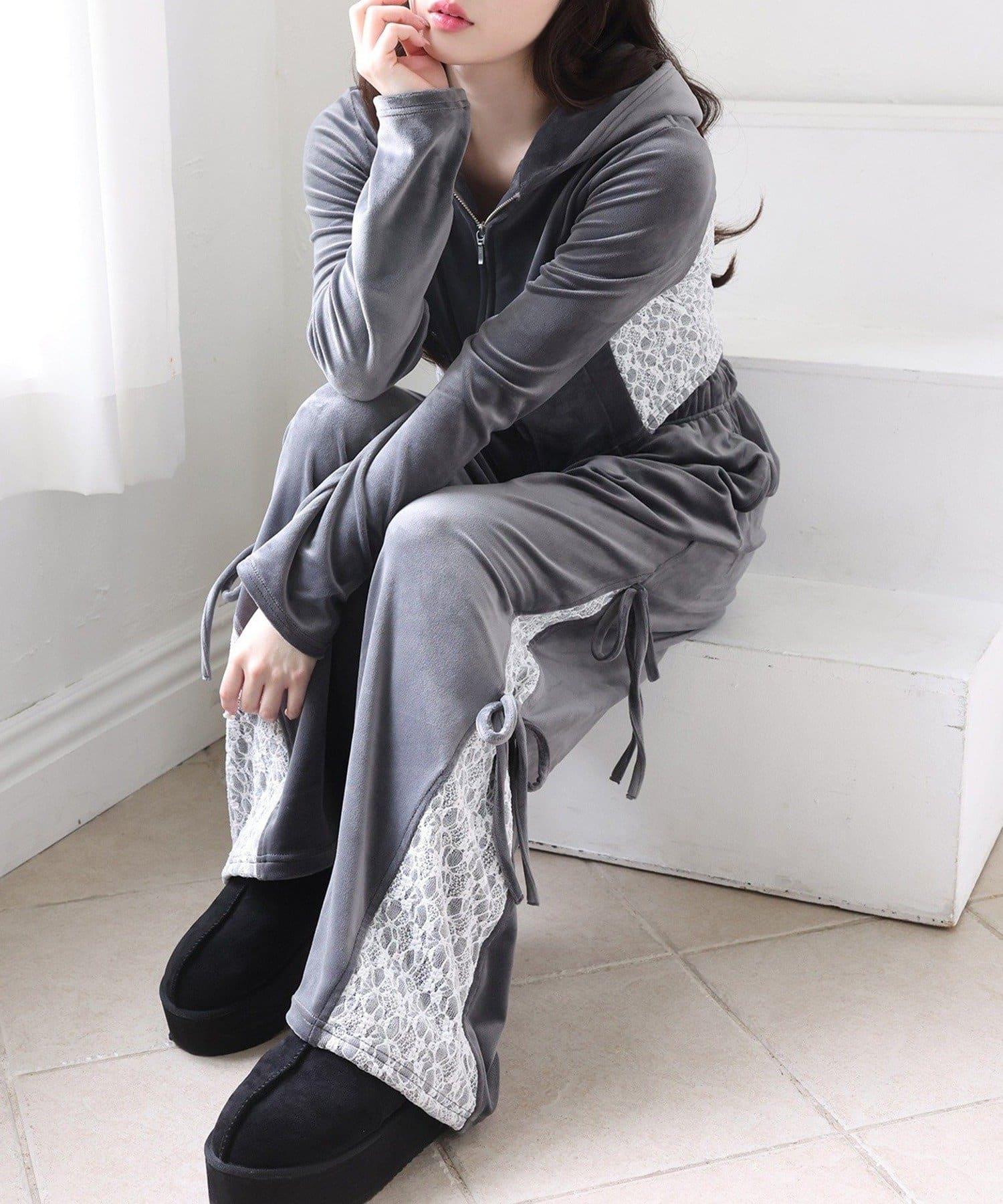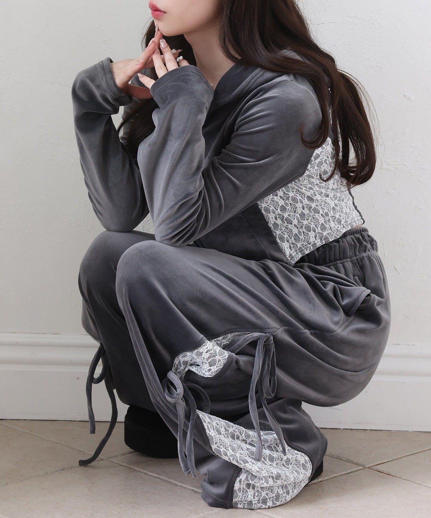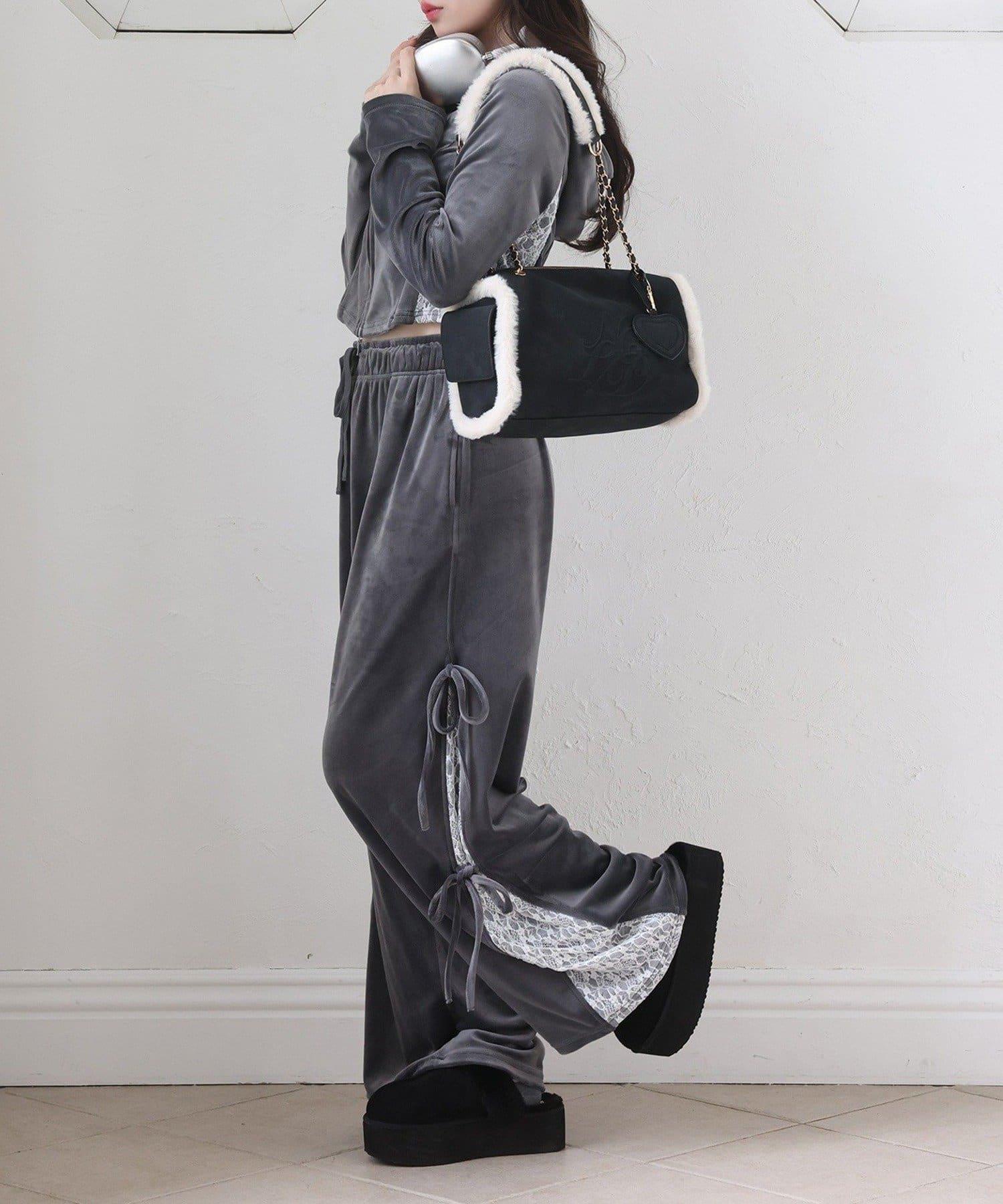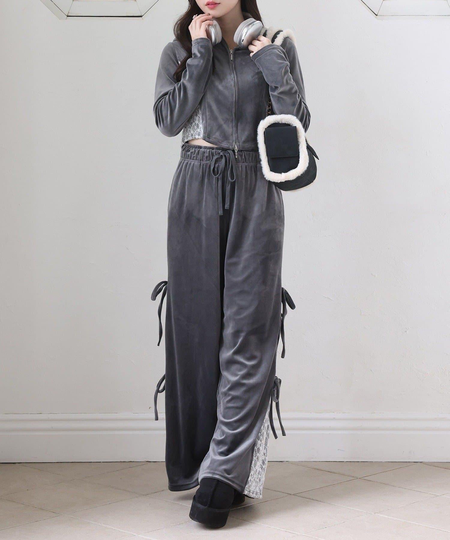 天鵝絨長褲,側面有蕾絲設計和絲帶。