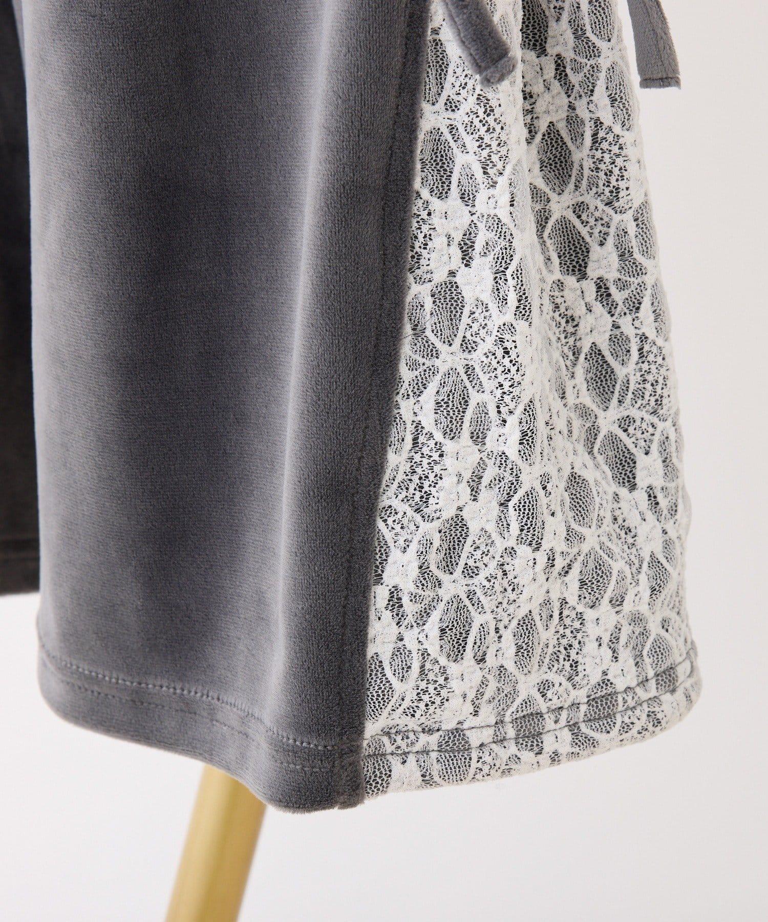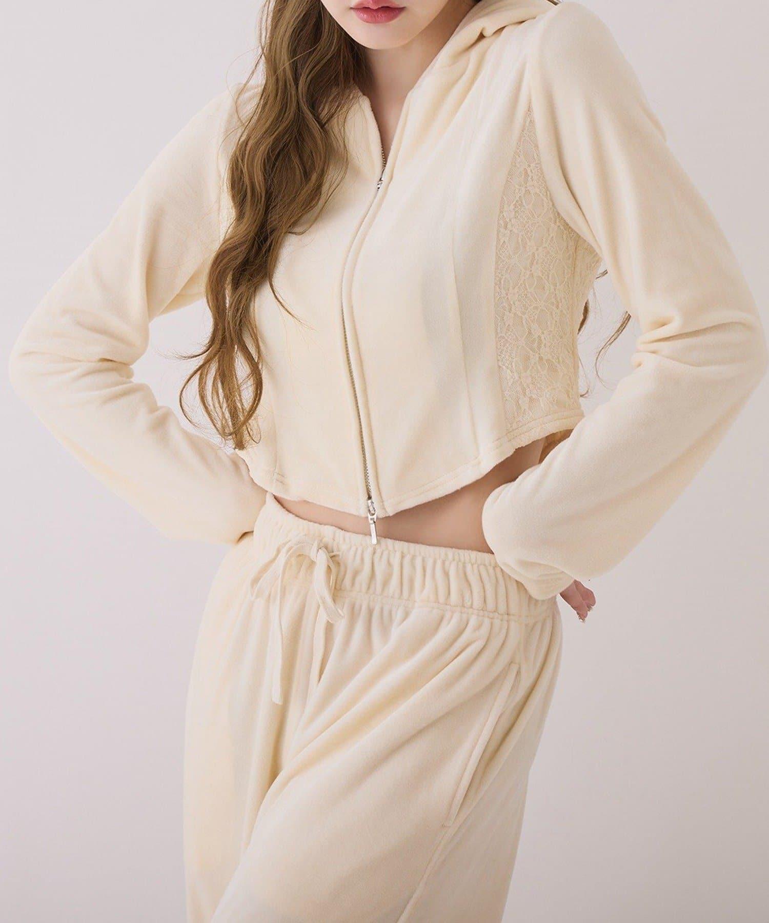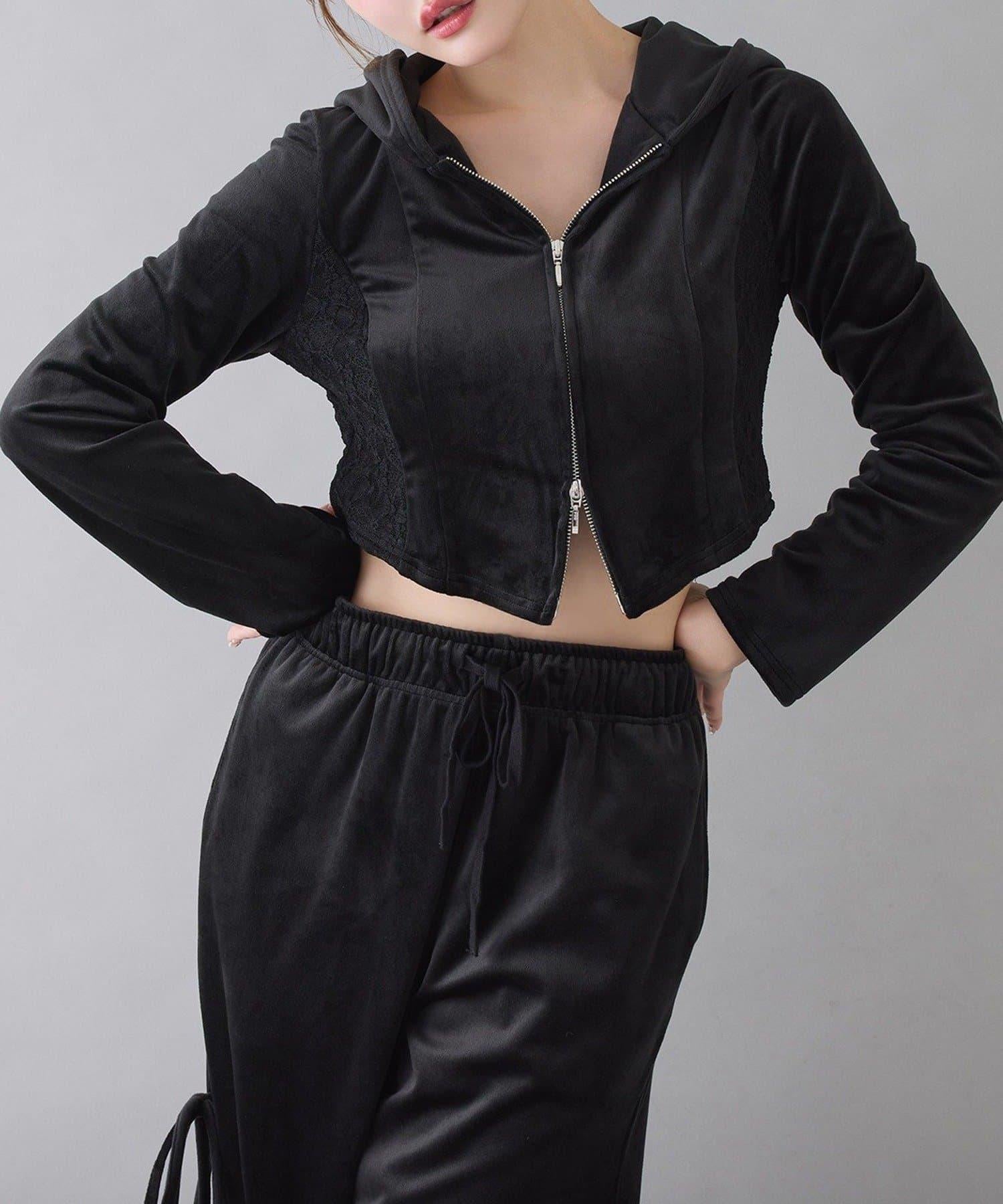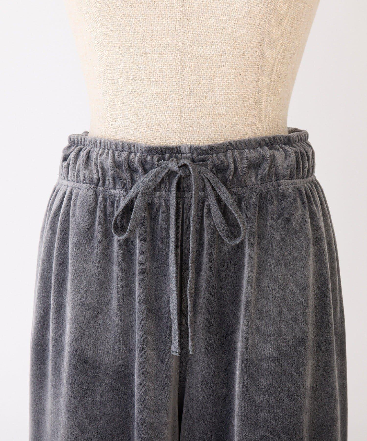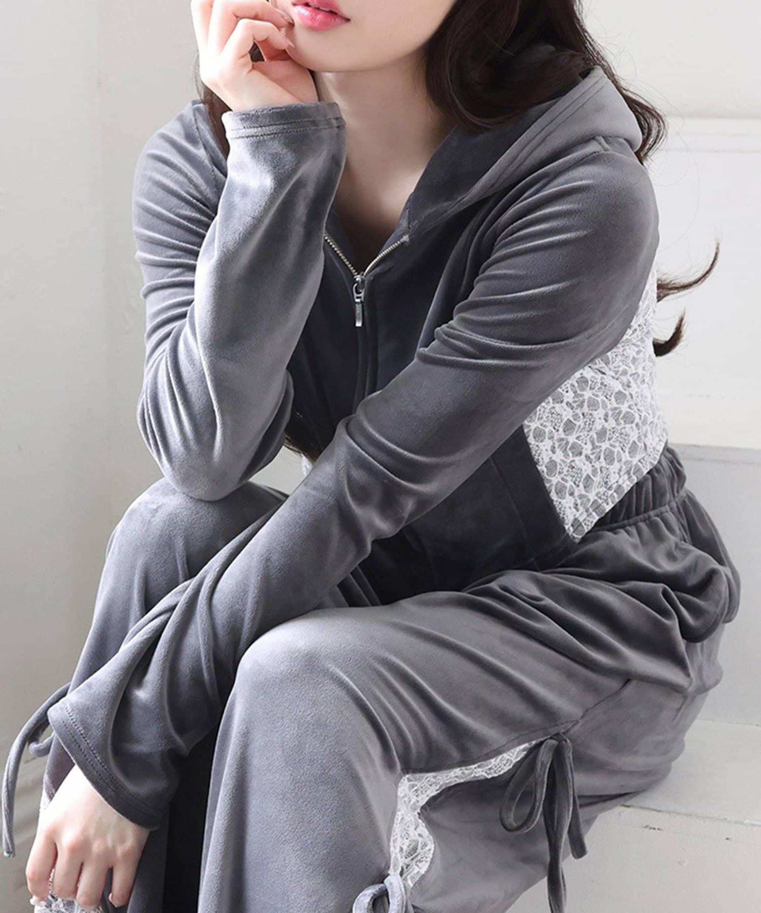 天鵝絨長褲,側面有蕾絲設計和絲帶。