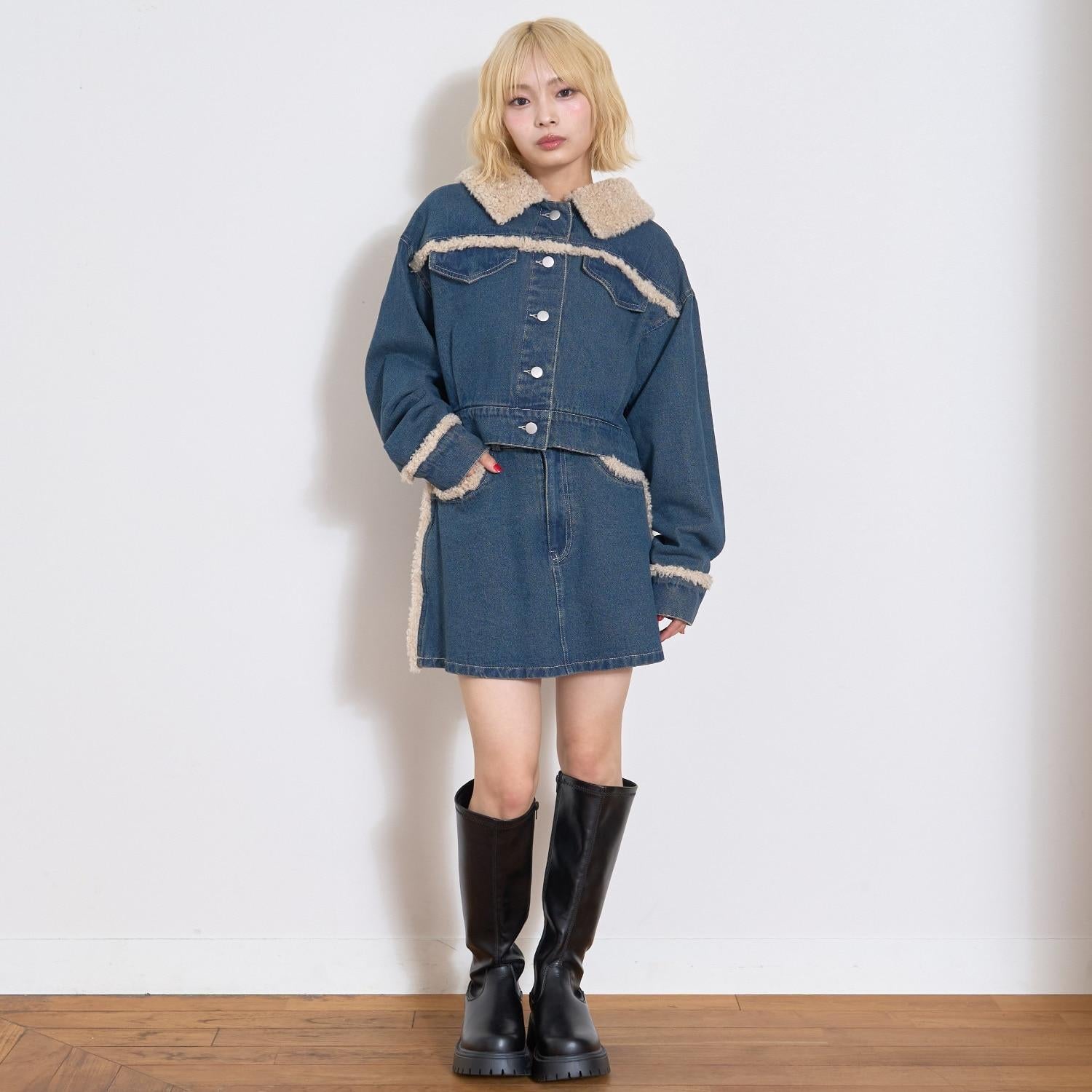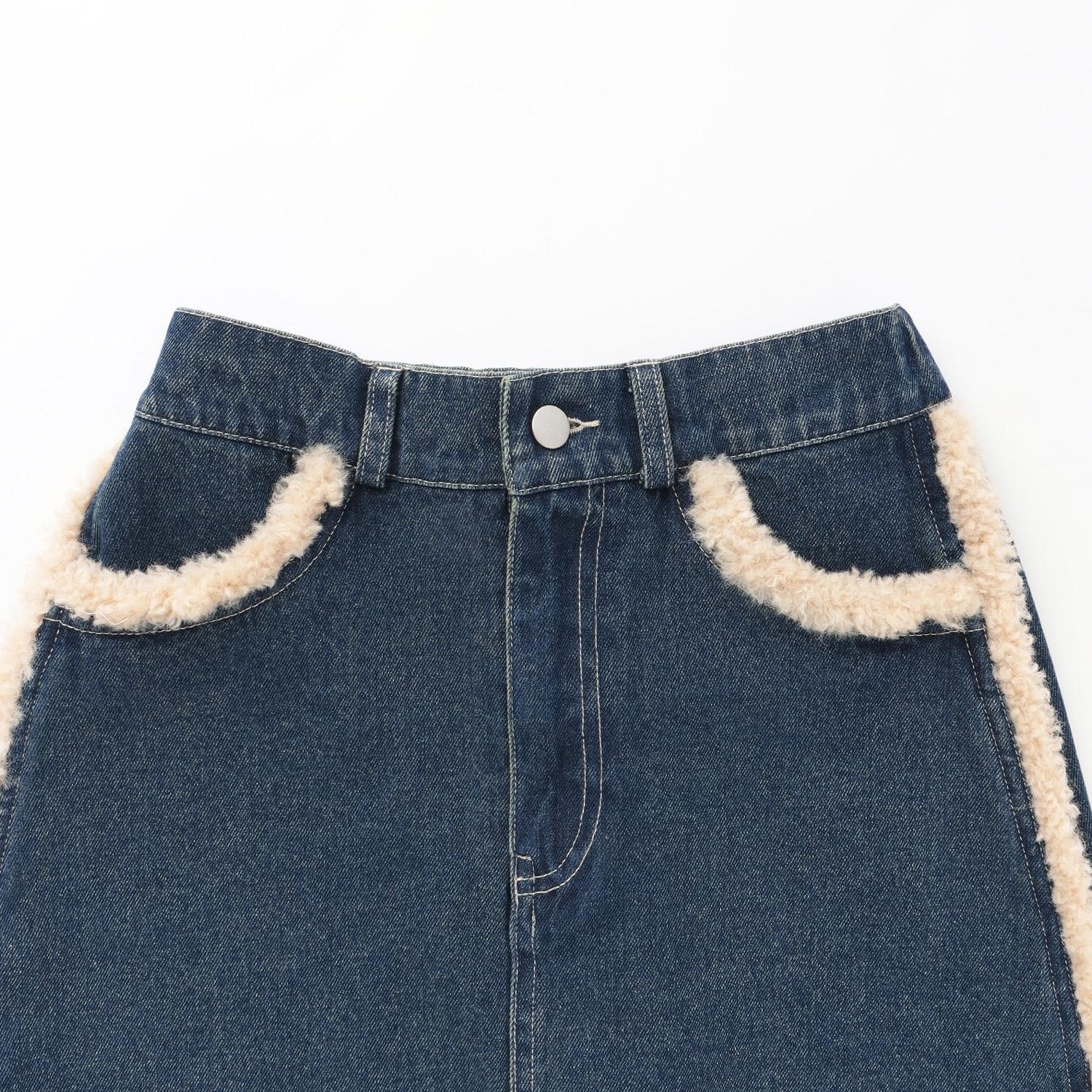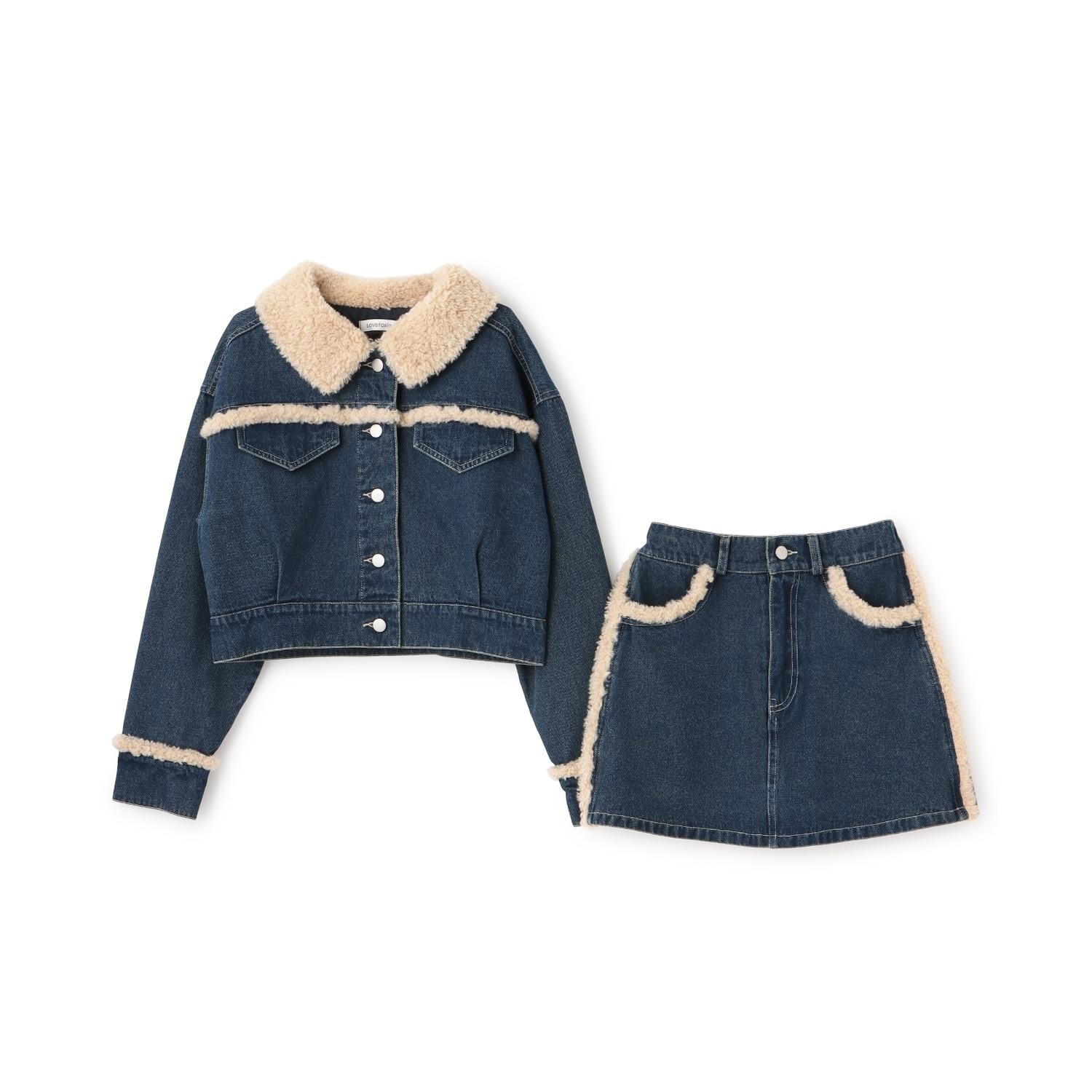 這款 G 字褲和梯形裙套裝採用牛仔面料剪裁而成。