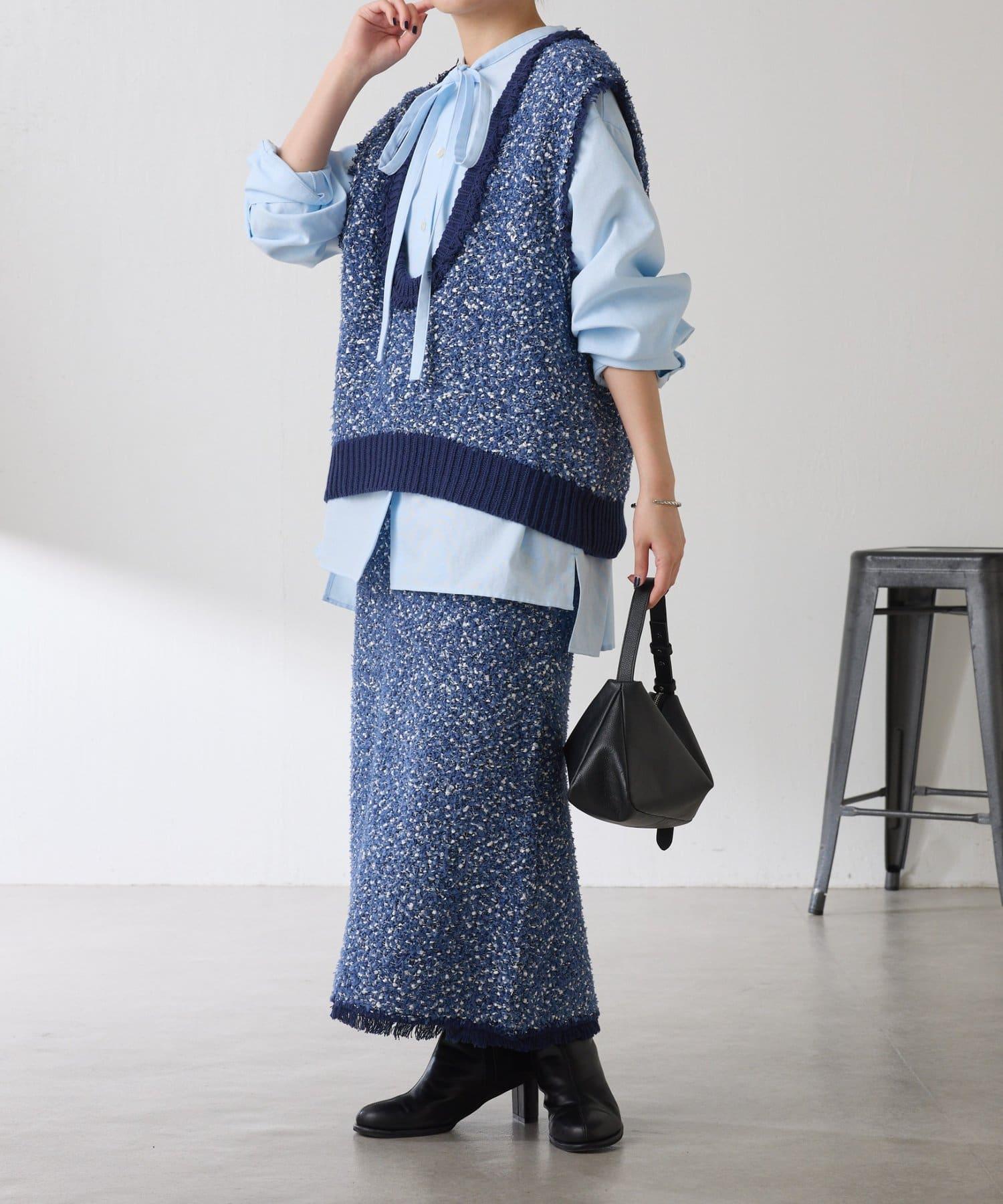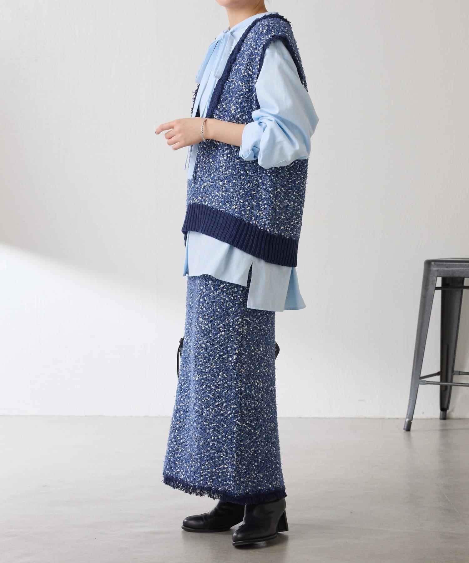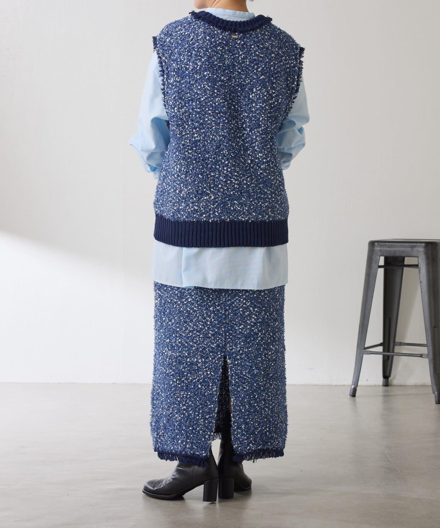 這是一款具有粗花呢外觀的針織裙,通過三種不同的紗線表現出凹凸不平的質感和色彩搭配。