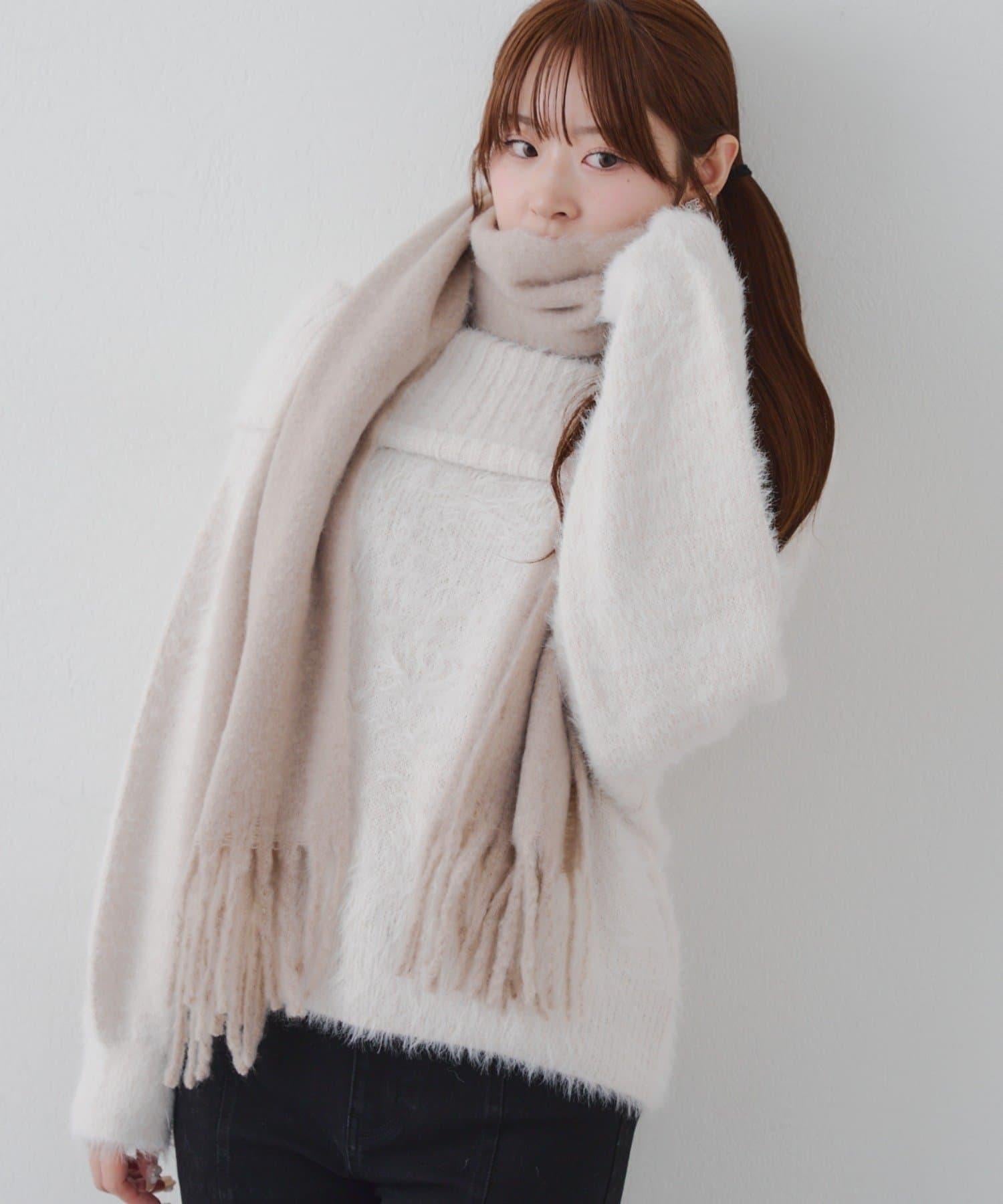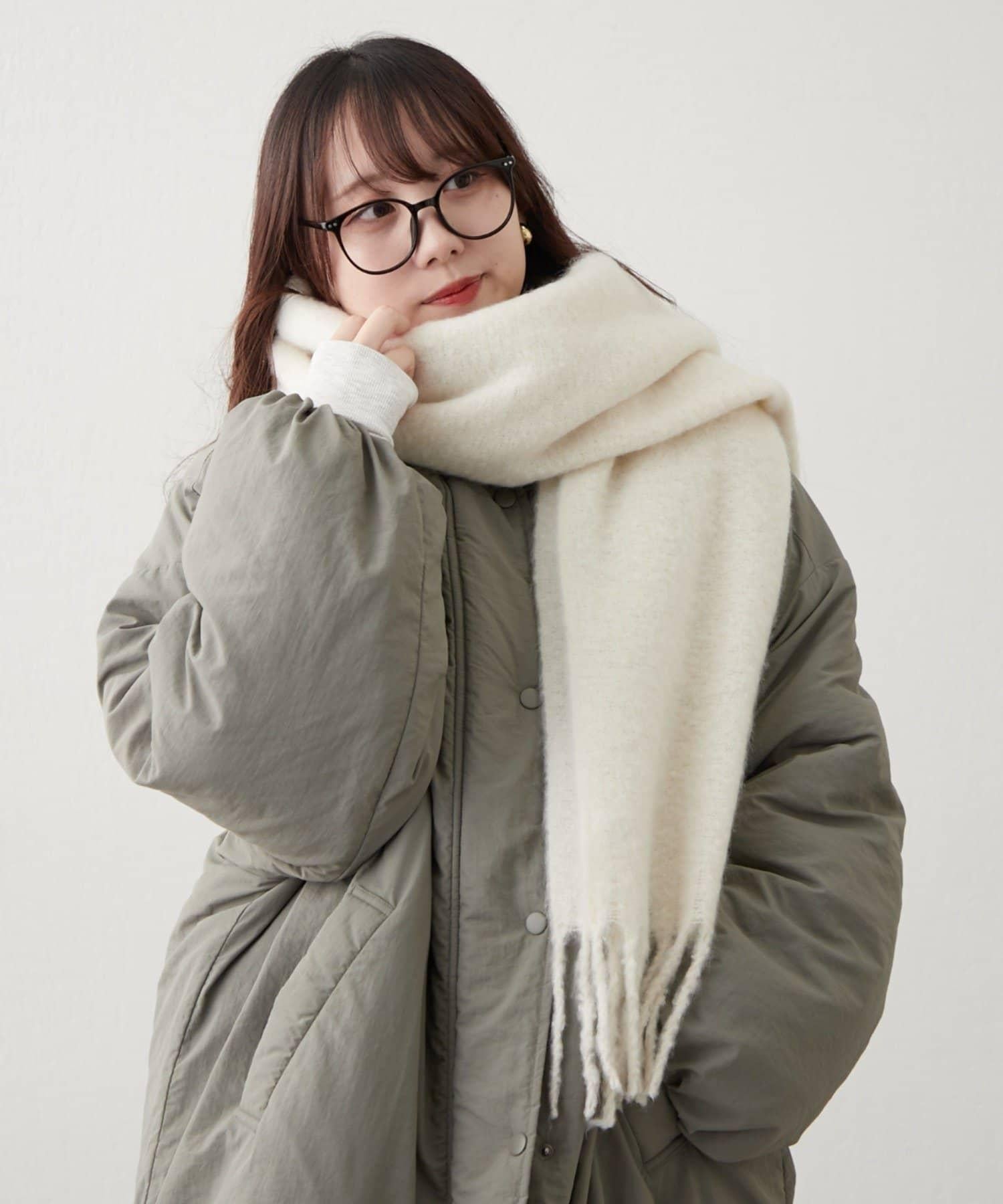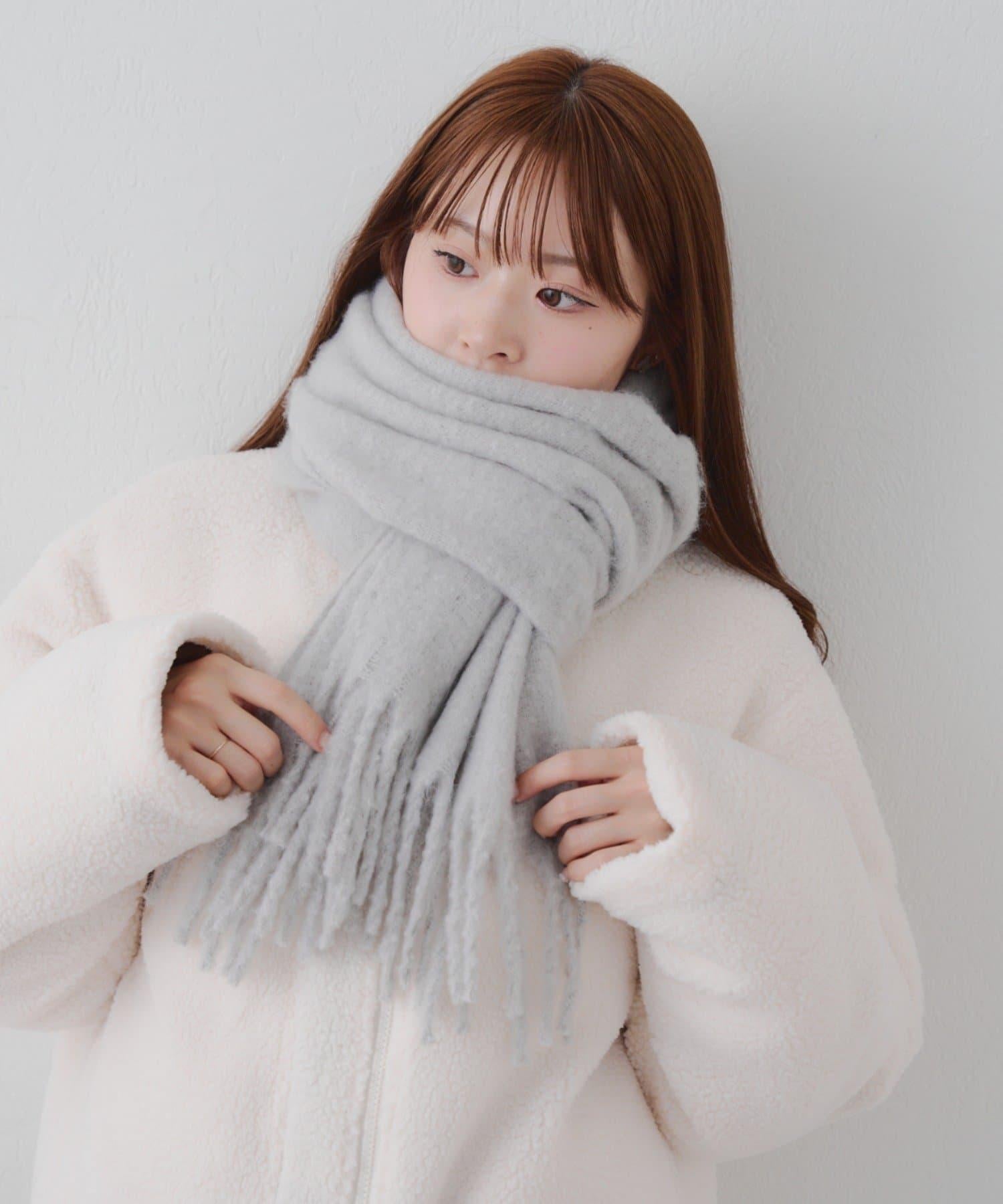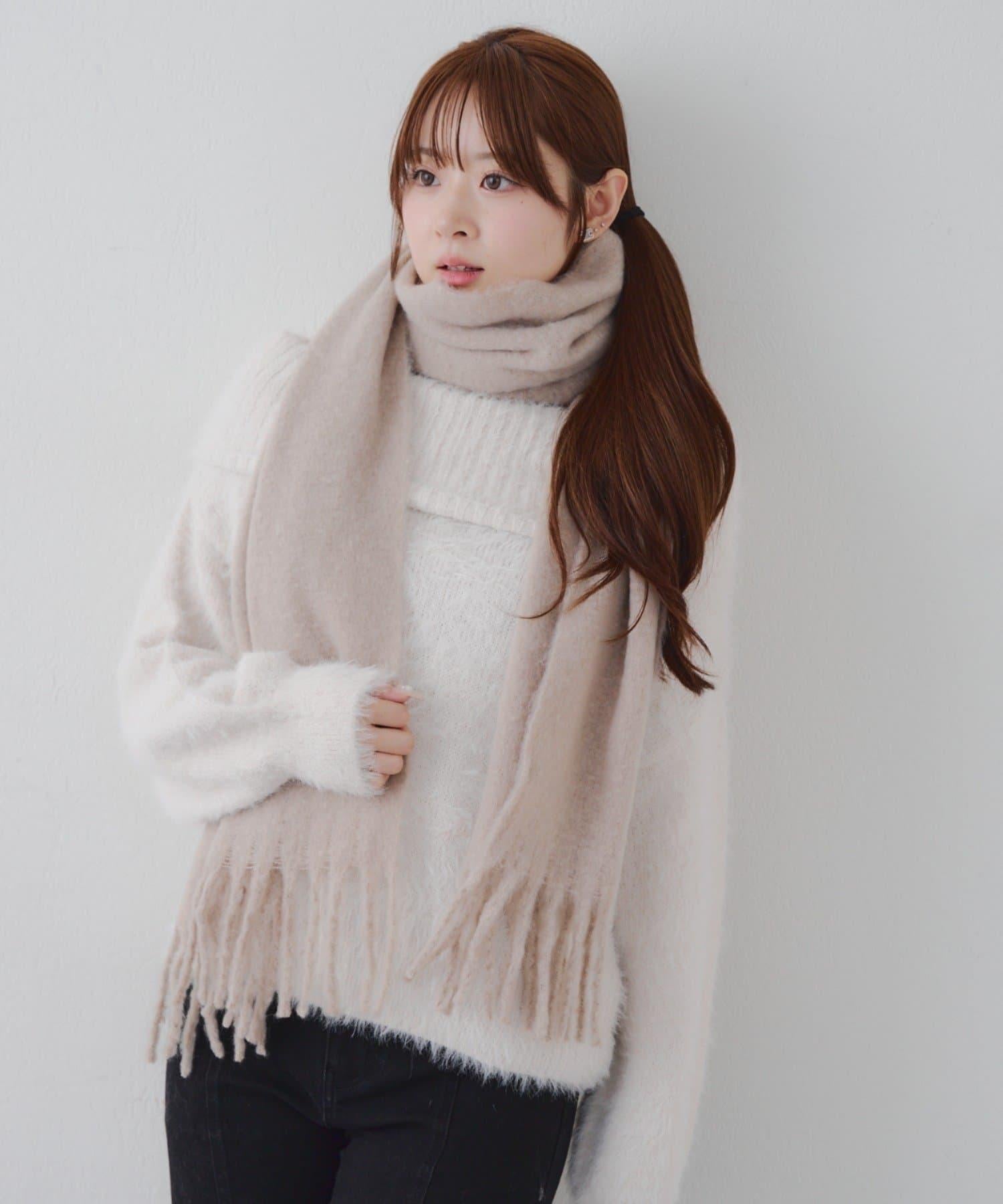 這是一款溫暖而蓬鬆的毛呢圍巾。