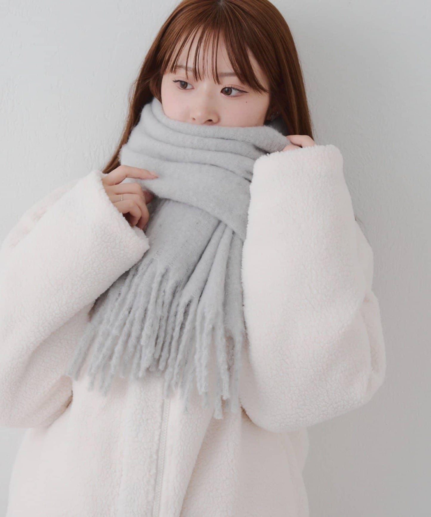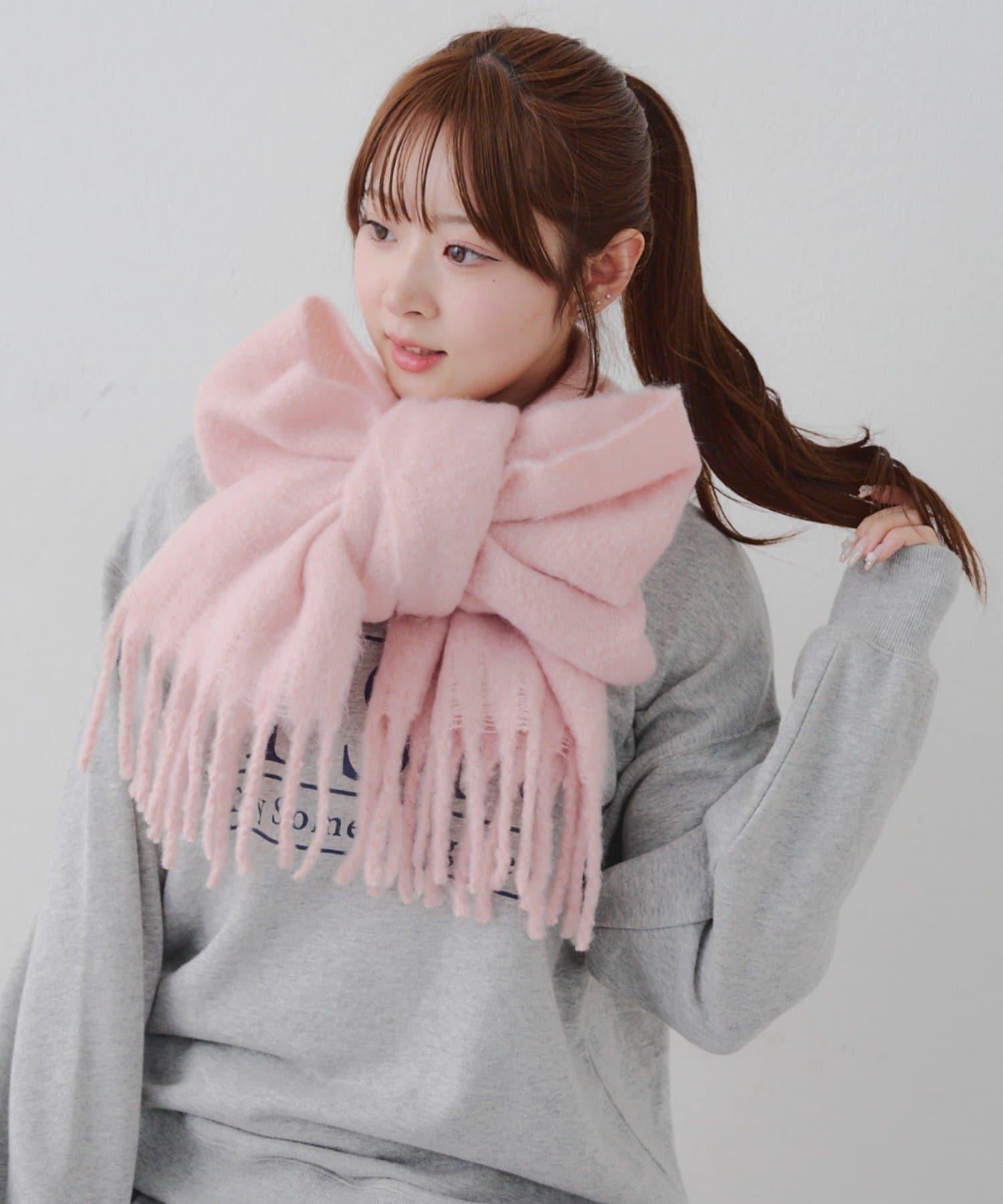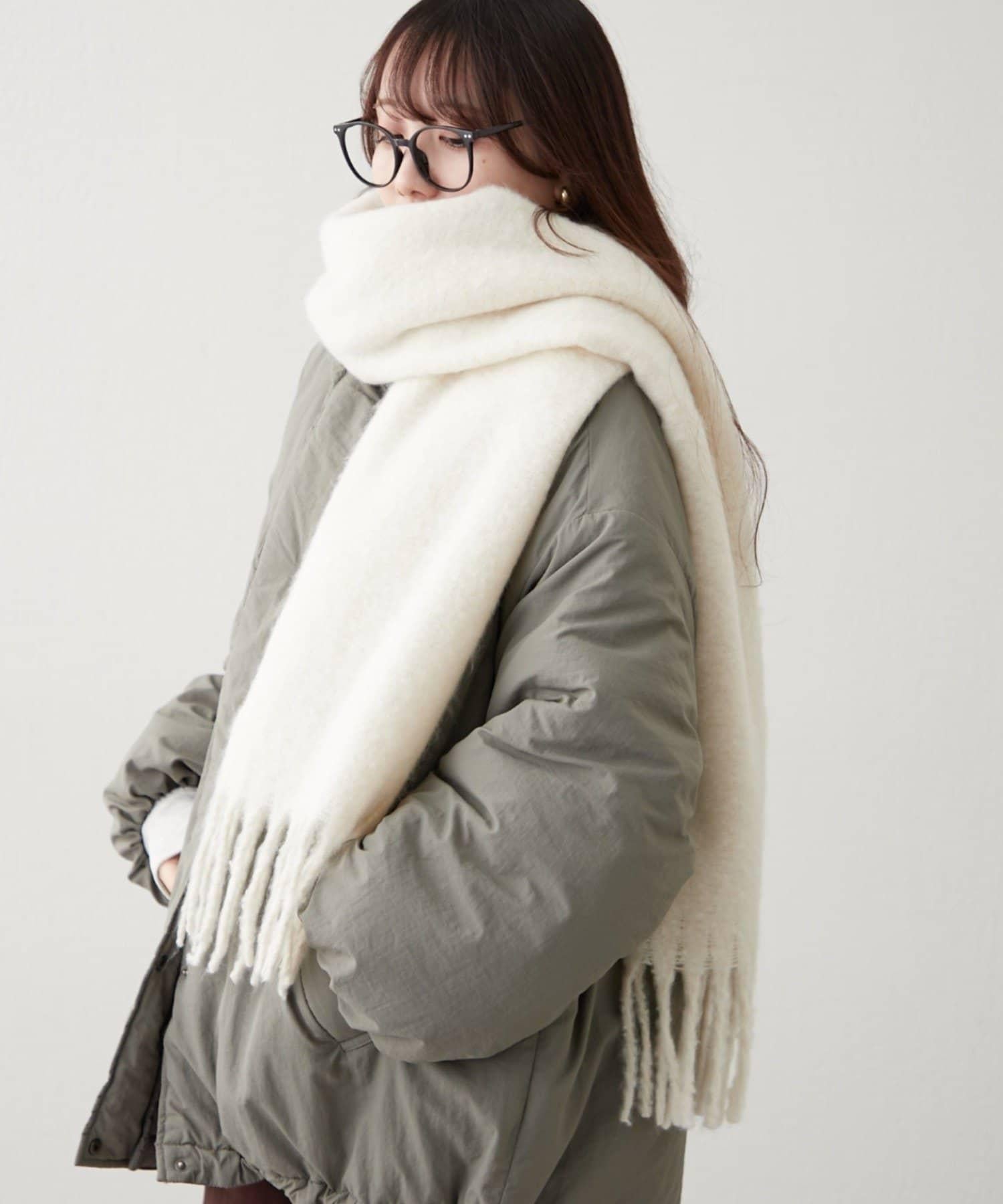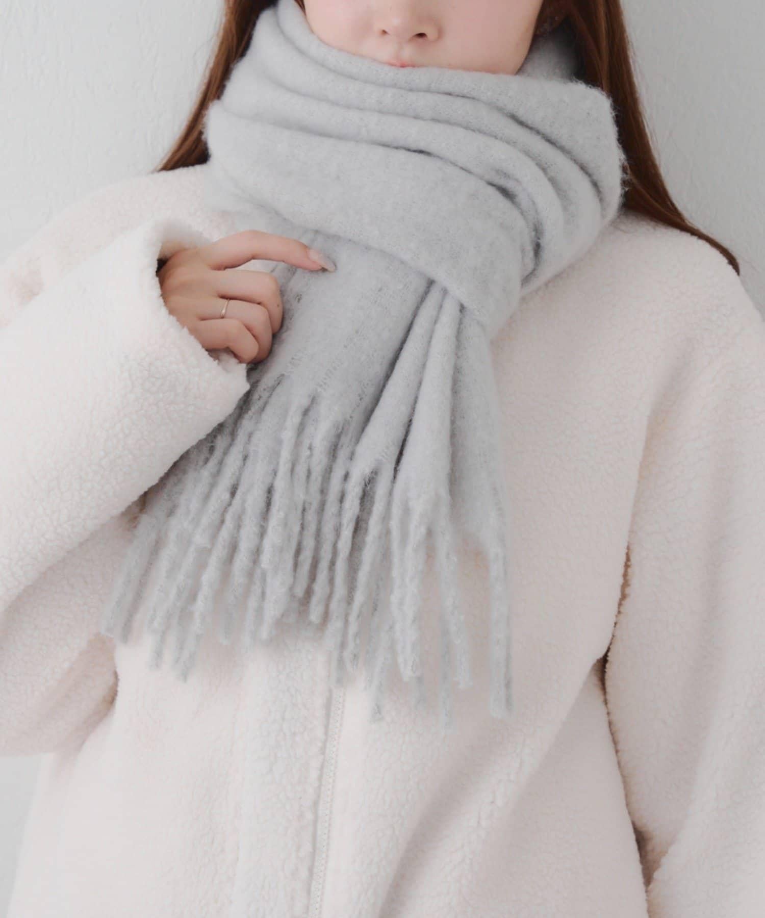這是一款溫暖而蓬鬆的毛呢圍巾。