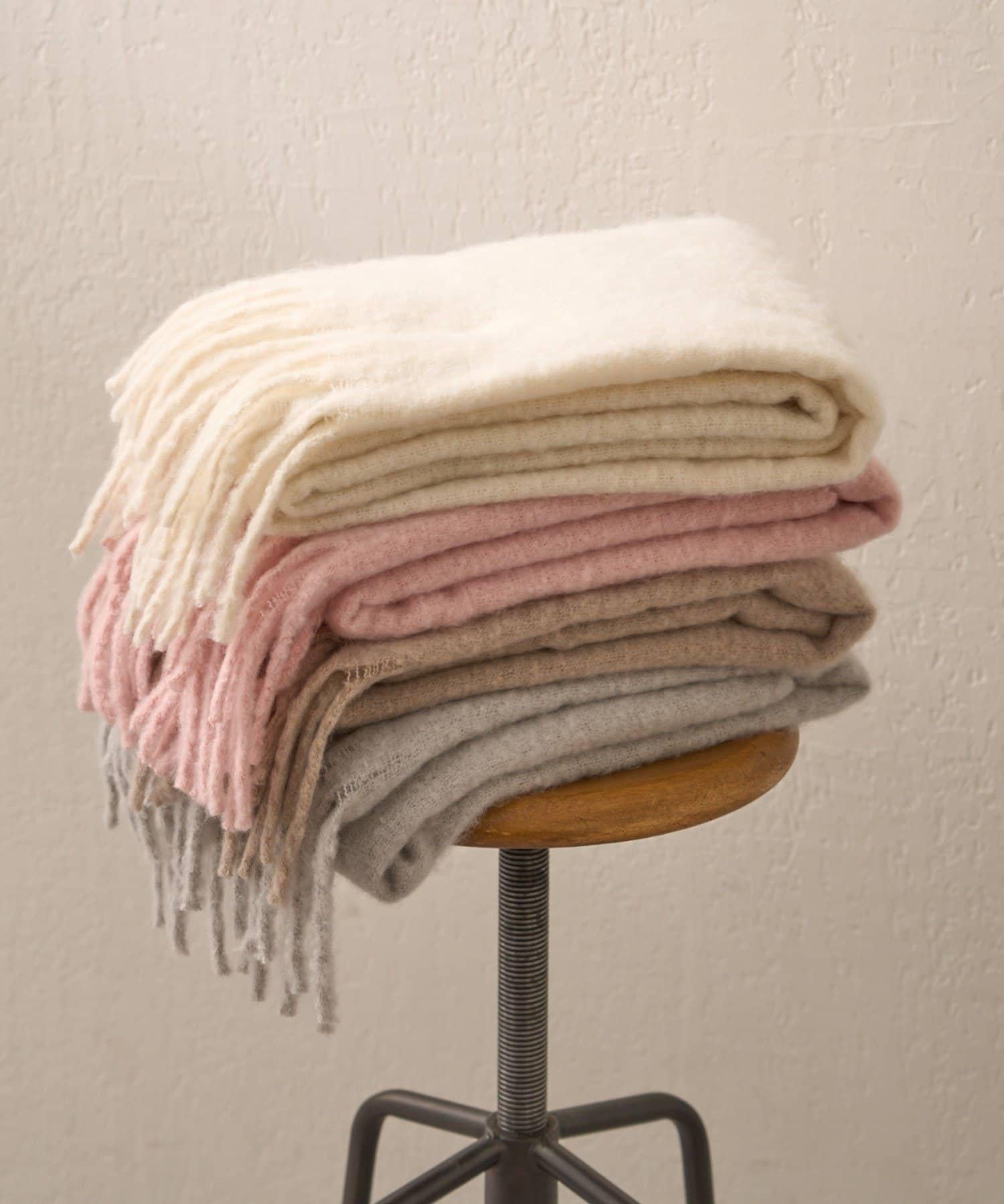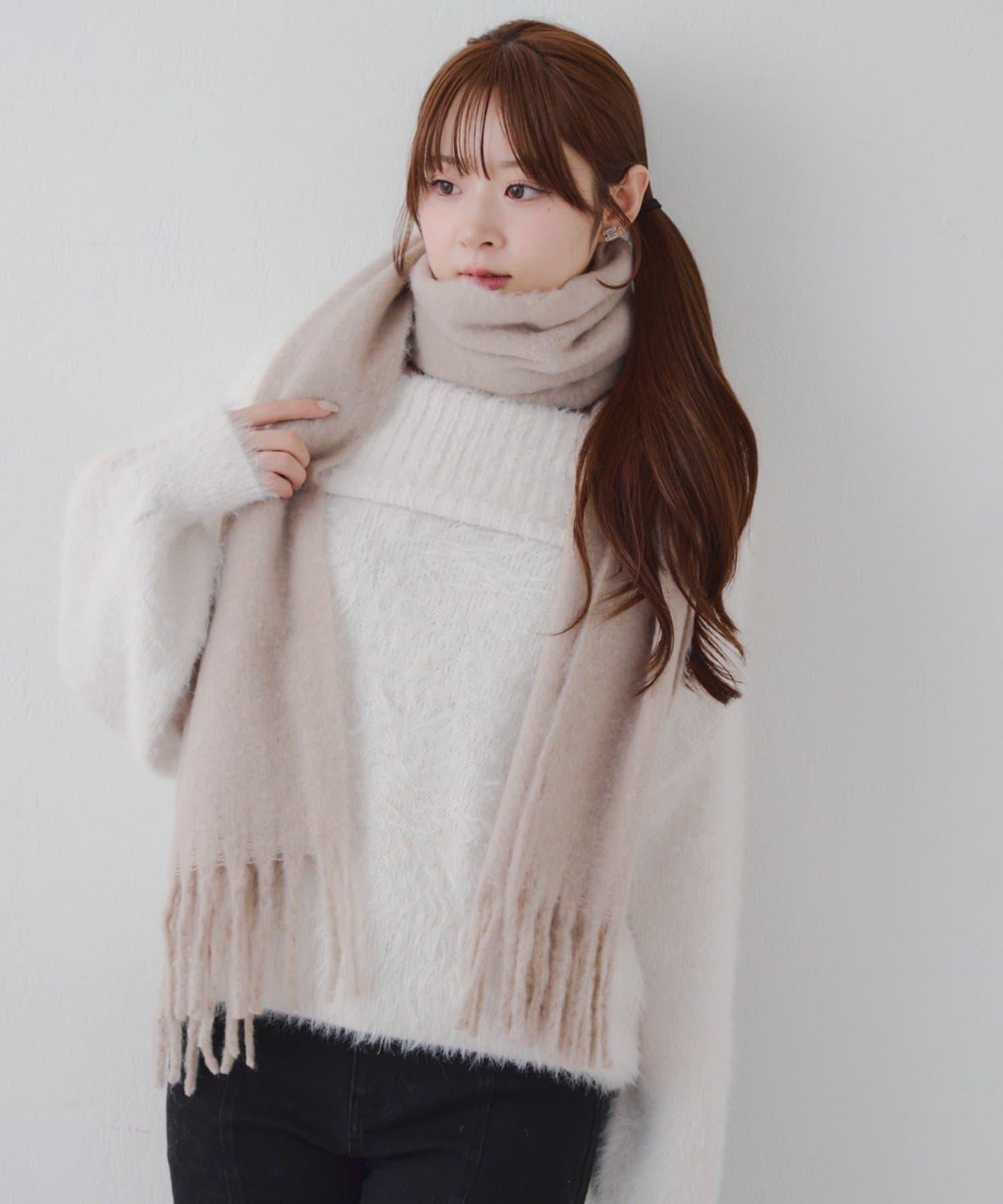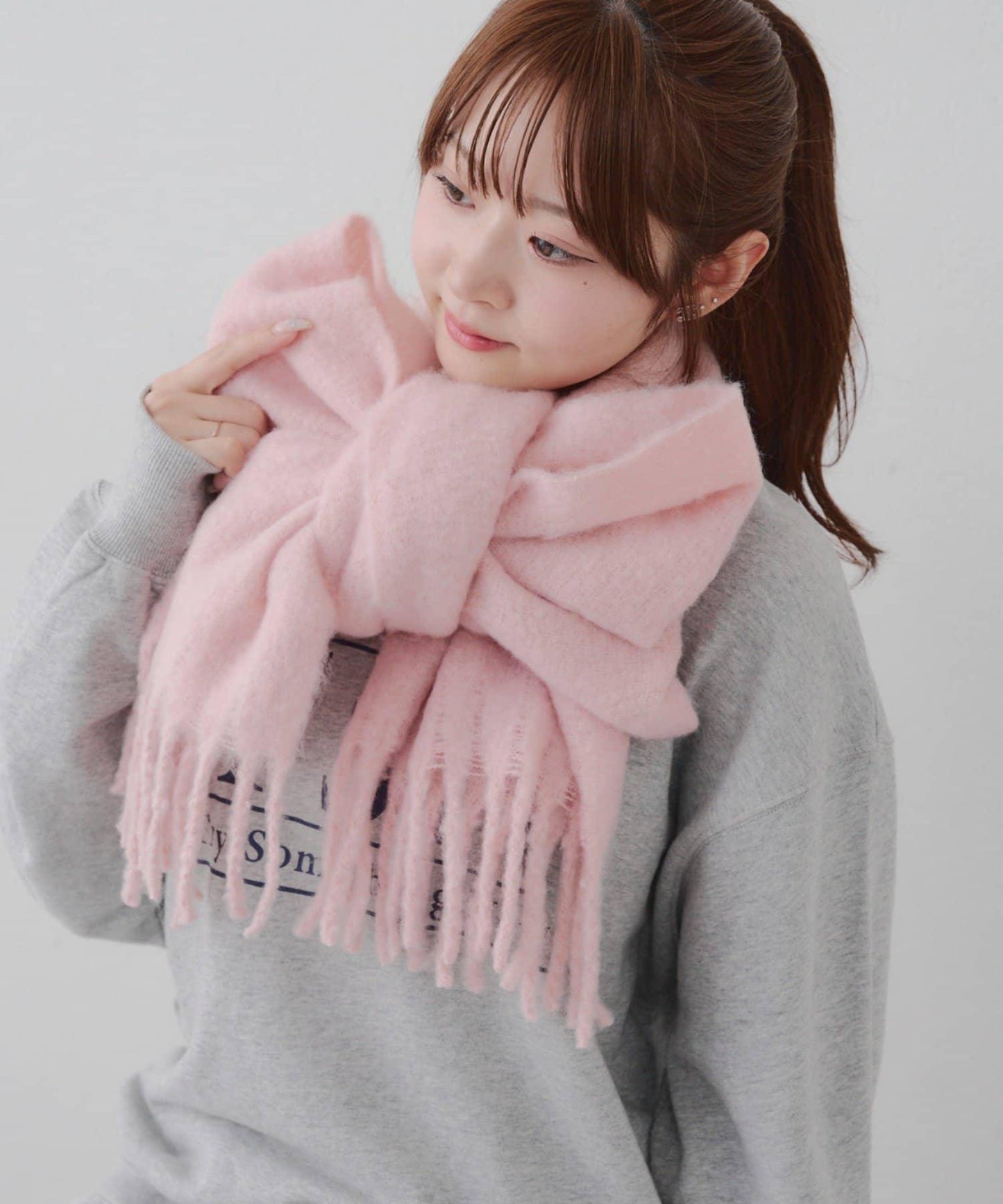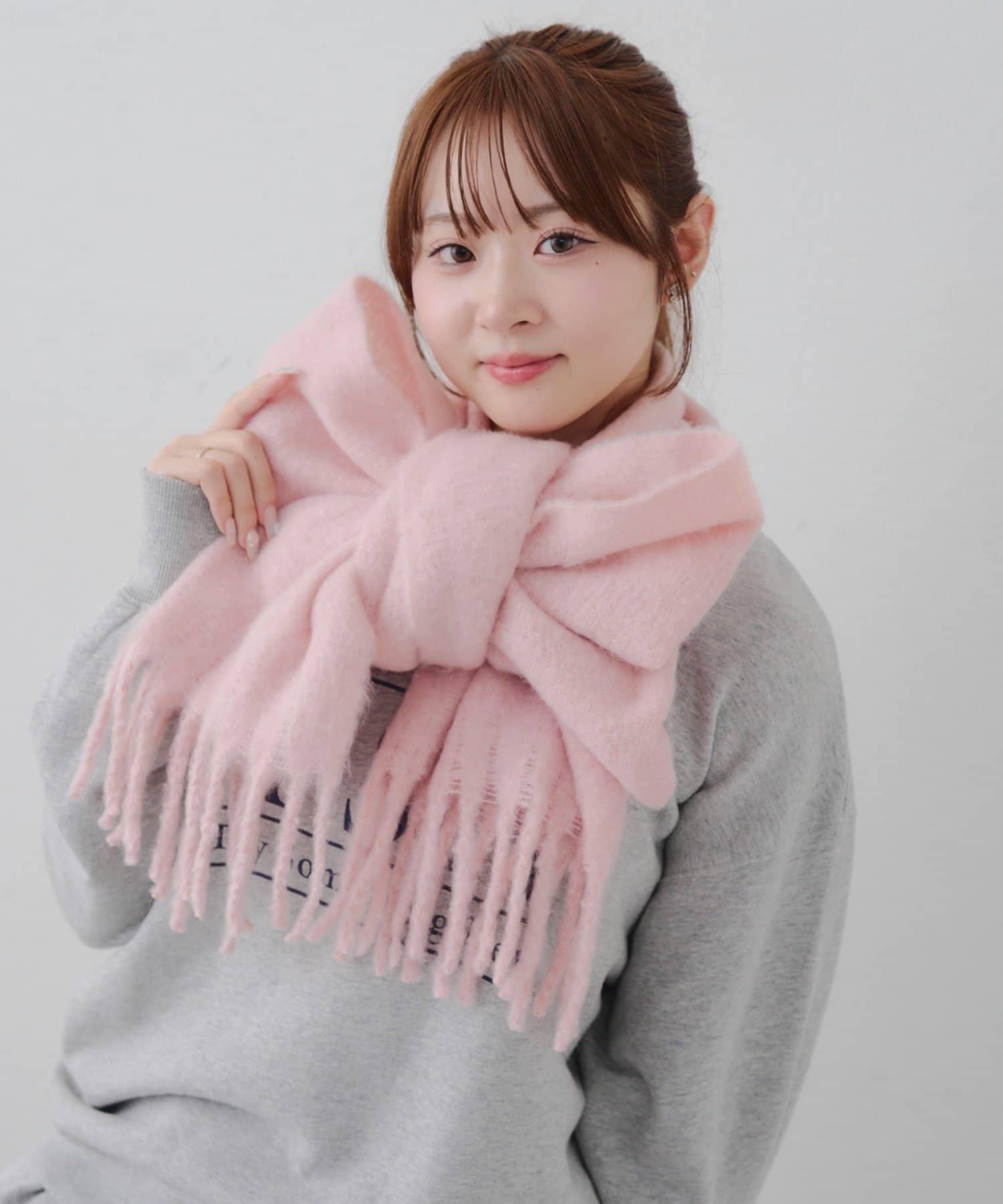 這是一款溫暖而蓬鬆的毛呢圍巾。