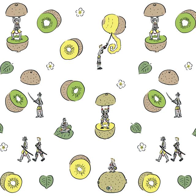 這款紡織品上有許多變成小矮人的劍士的形象,他們隨心所欲地玩弄著水果和其他物品。
