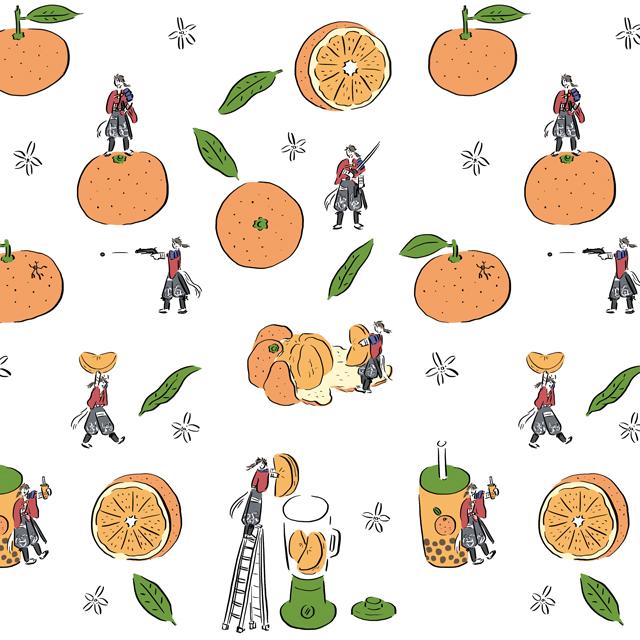 這款紡織品上有許多變成小矮人的劍士的形象,他們隨心所欲地玩弄著水果和其他物品。