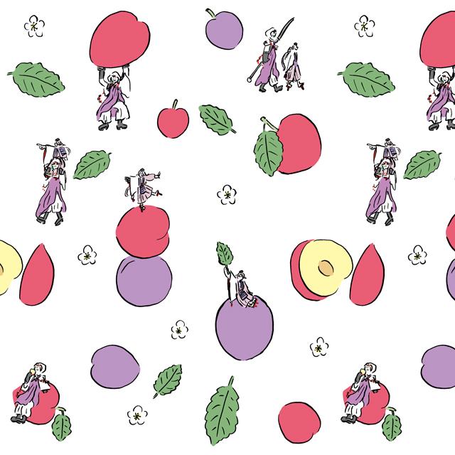這款紡織品上印有變成小矮人的劍客們的形象,他們隨心所欲地玩弄著水果和其他物品。