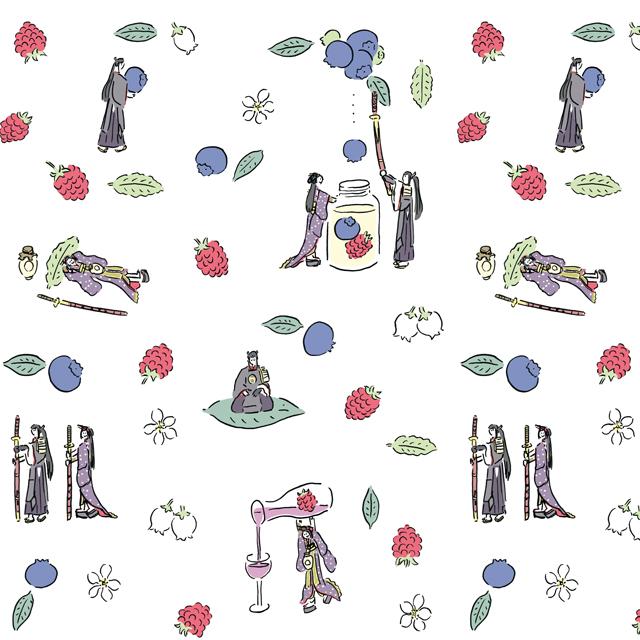 這款紡織品上印有變成小矮人的劍客們的形象,他們隨心所欲地玩弄著水果和其他物品。