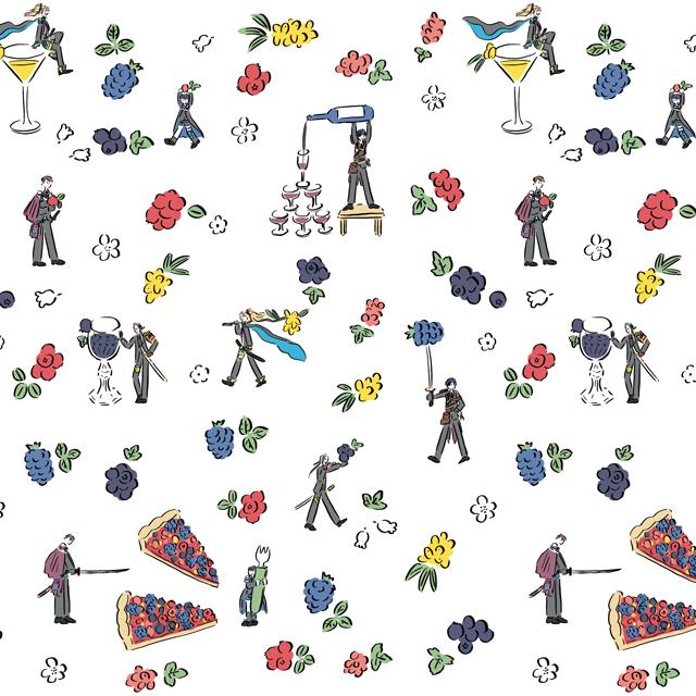 這款紡織品上印有變成小矮人的劍客們的形象,他們隨心所欲地玩弄著水果和其他物品。