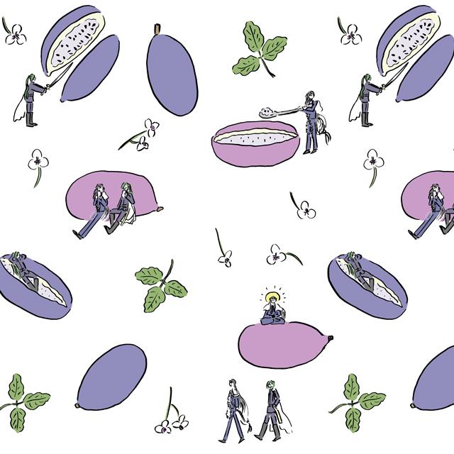 這款紡織品上印有變成小矮人的劍客們的形象,他們隨心所欲地玩弄著水果和其他物品。