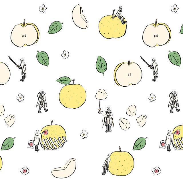 這款紡織品上印有變成小矮人的劍客們的形象,他們隨心所欲地玩弄著水果和其他物品。