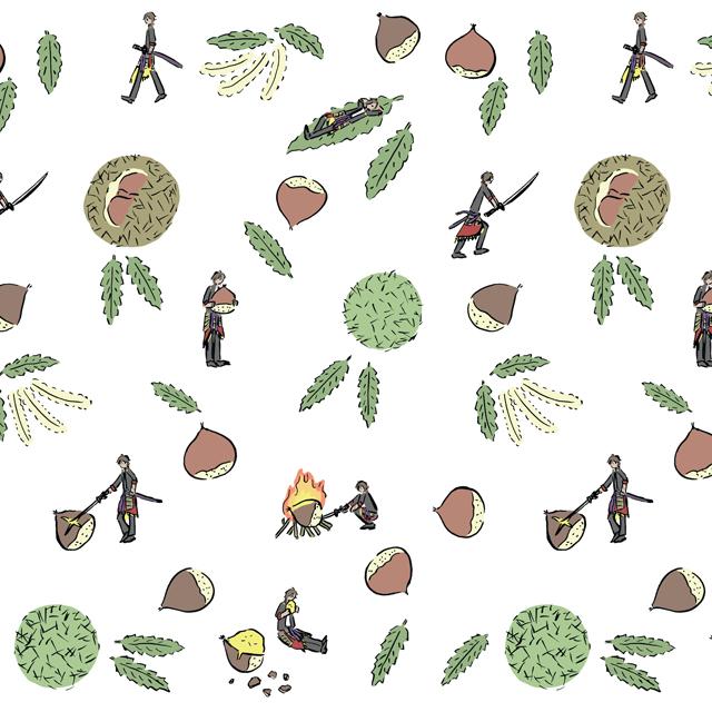 這款紡織品上印有變成小矮人的劍客們的形象,他們隨心所欲地玩弄著水果和其他物品。