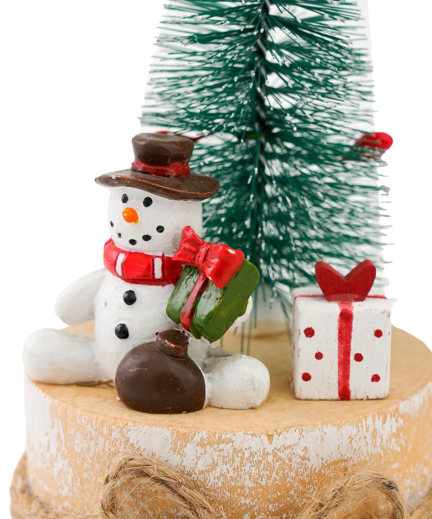 樹樁底座為木質紋理,上面有一個白色雪人和一棵綠色小樹,配以紅色絲帶和禮品盒。